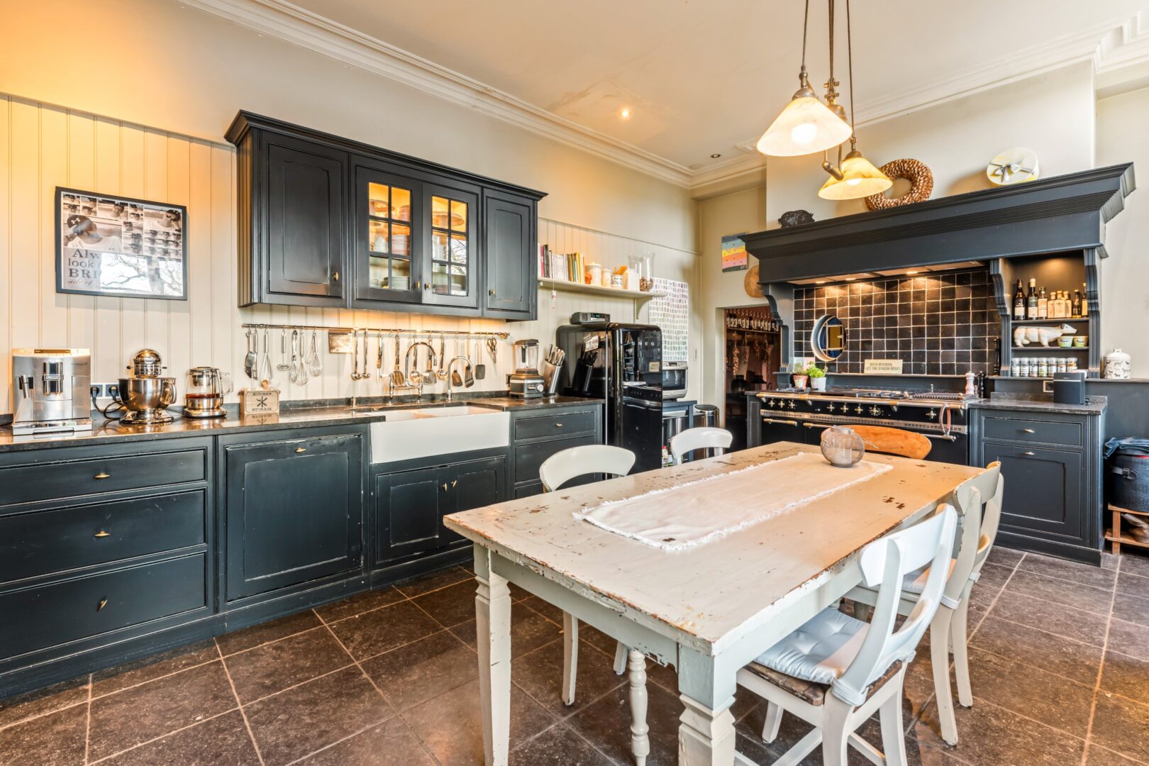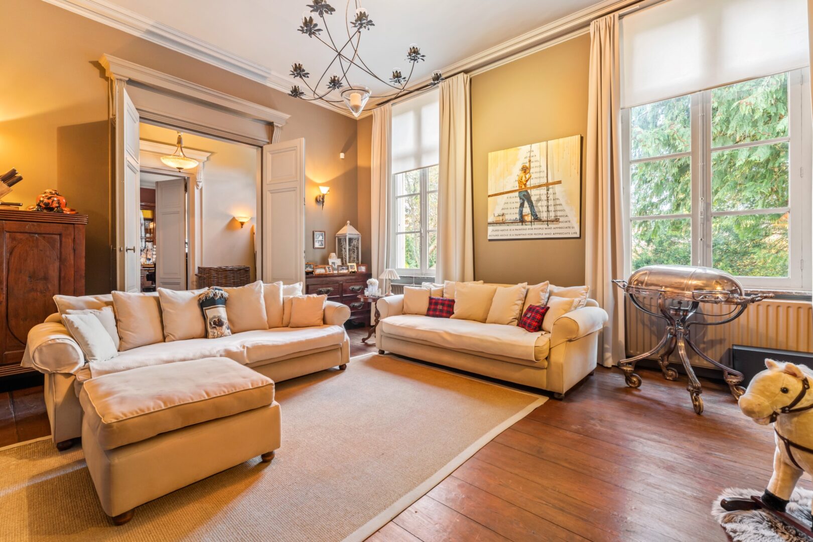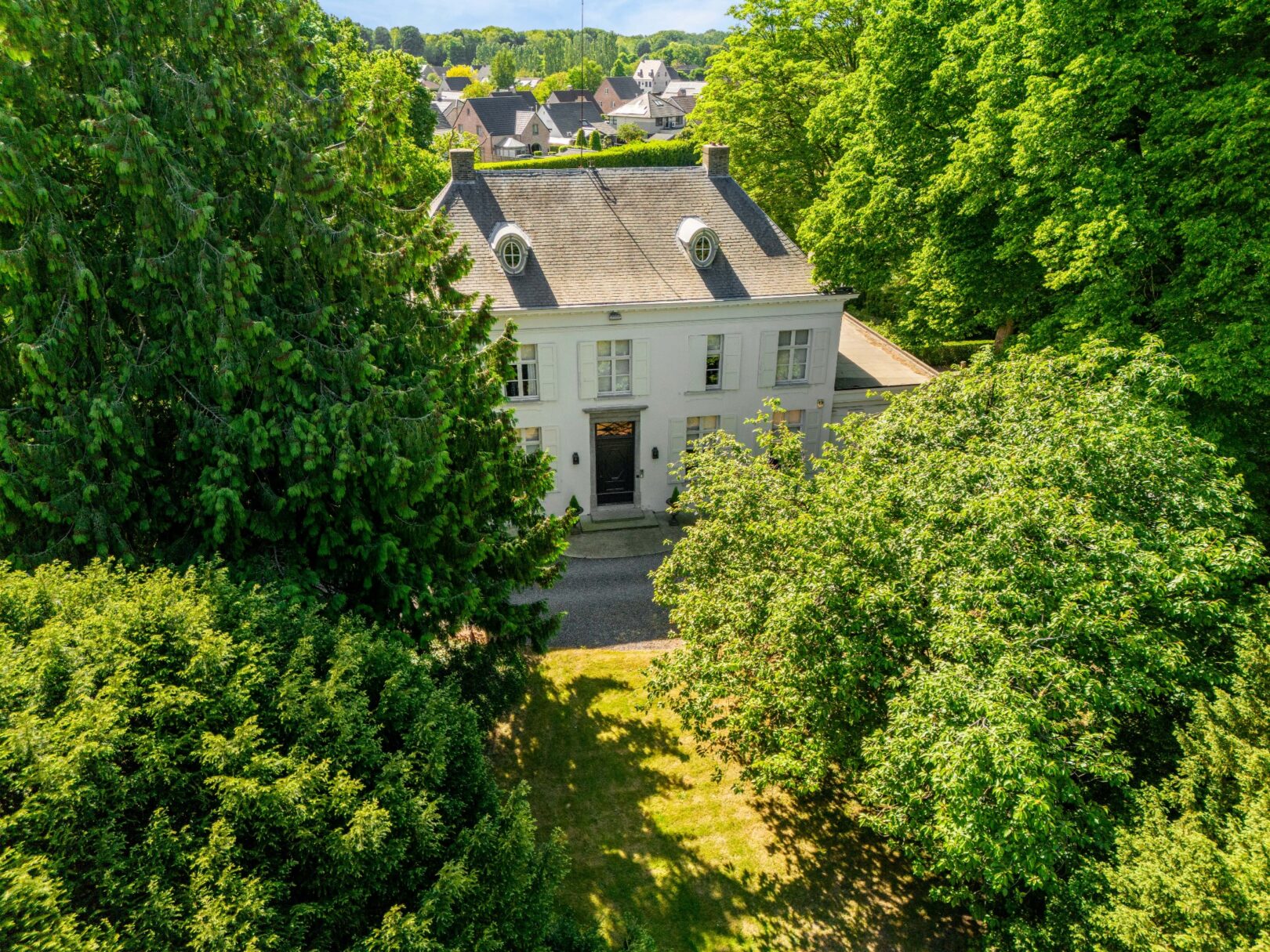 Beautiful Country House from 1812 located on the Bergenhof estate of approximately 2.9 hectares, including a park, a swimming pond, forest, a natural pond, and two meadows.This 19th century mansion is accessible via a wide driveway. The front garden consists of a natural forest, which provides privacy from the street. On the left and right sides of the property, there are 2 carports with ample space for 6 cars. The backyard with a beautiful swimming pond is French-inspired and consists of large lawns, neat hedges, and straight paths.Layout ground floor:The mansion is entered through a central entrance hall where the classic style and authentic interior have been preserved. On the left side of the entrance hall, there is a spacious reception area or office, and on the right side, a beautiful library. From the spacious living room with a fully equipped country-style kitchen, there is a beautiful view of the large swimming pond and its green surroundings. Adjacent to the kitchen, there is a cozy bar that also exudes authenticity and coziness. Additionally, there is a spacious storage room, a garage, and a technical room. On the other side of the living room, there is an additional living room, currently used as an office.First floor:Through the spacious landing, access is gained to the 5 spacious bedrooms. The master suite consists of a spacious bedroom with an adjoining bathroom. This bathroom is equipped with a bathtub and a double sink with a unique view of the garden. Additionally, there is a beautiful dressing room, a second bathroom, and a separate toilet.Attic:The attic provides additional potential for expansion.Special features:- Beautiful and sunny estate- Authentic property- Lovely swimming pond