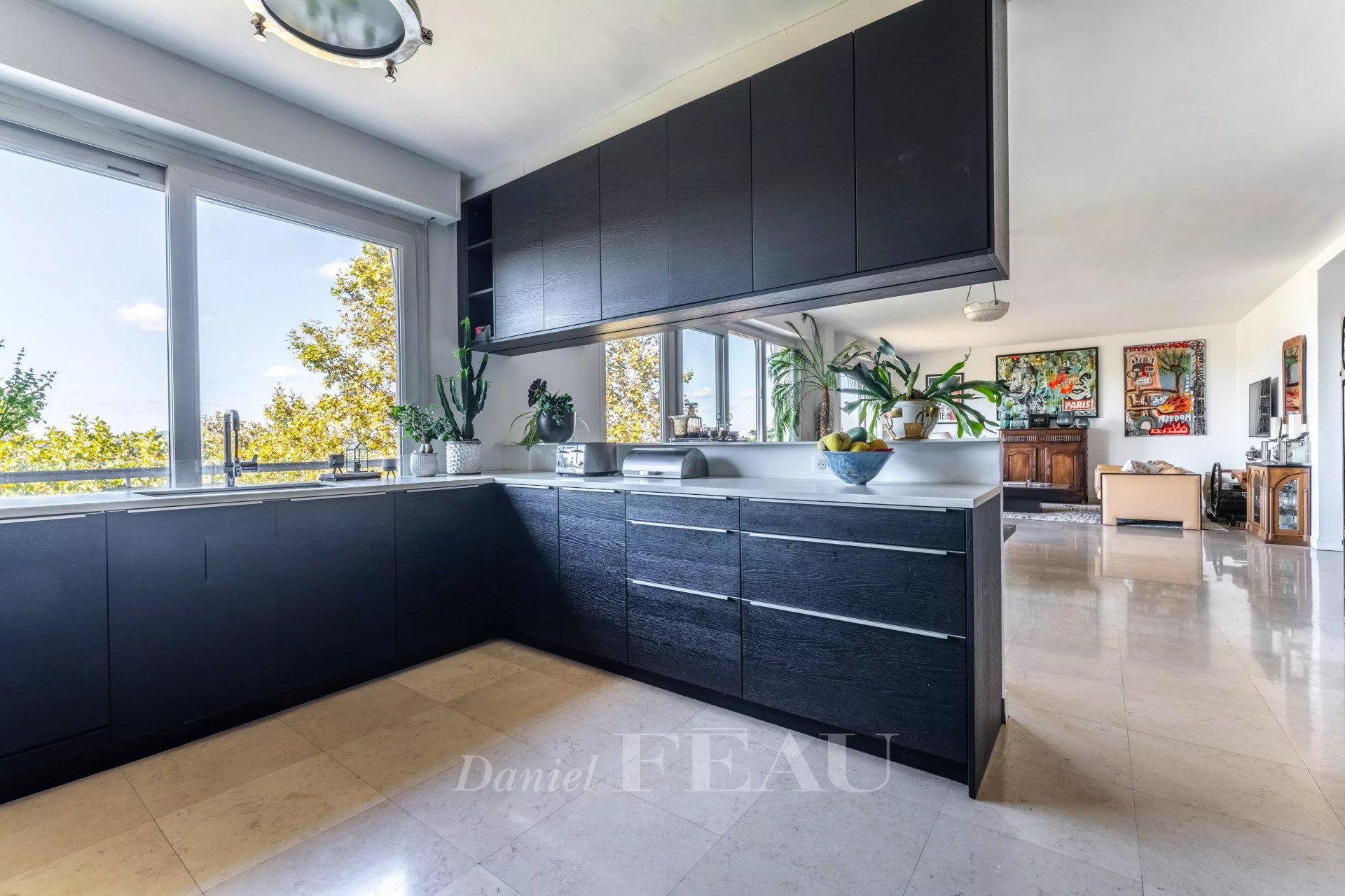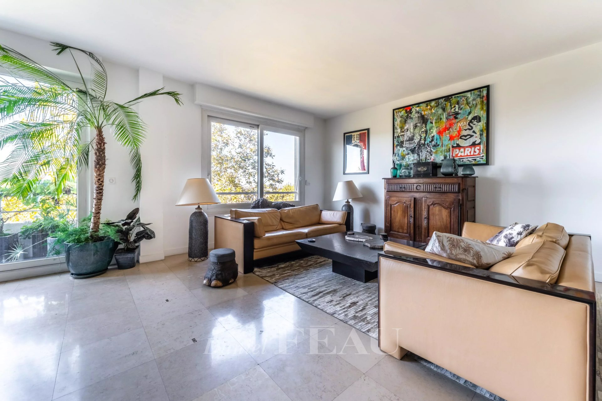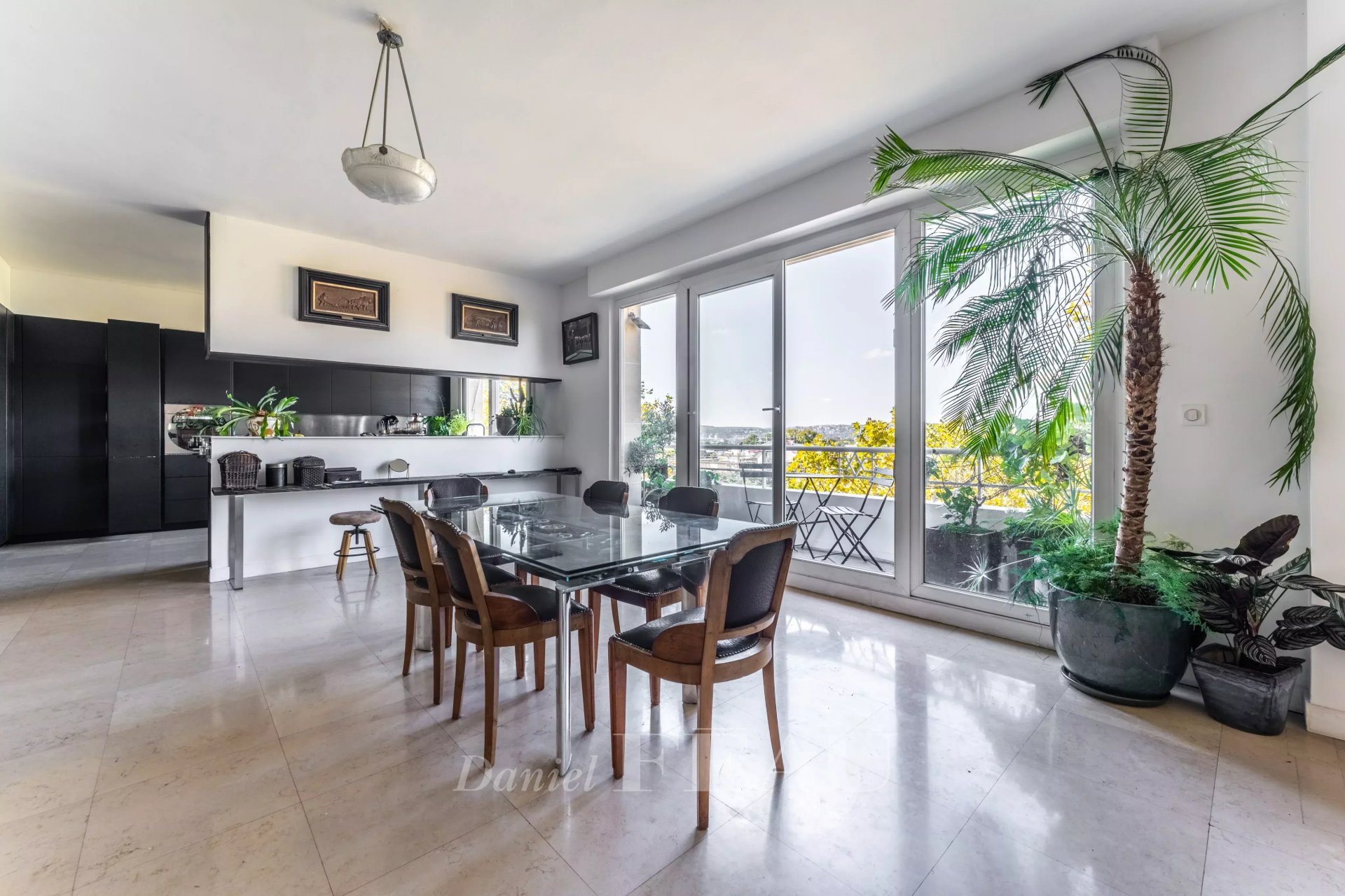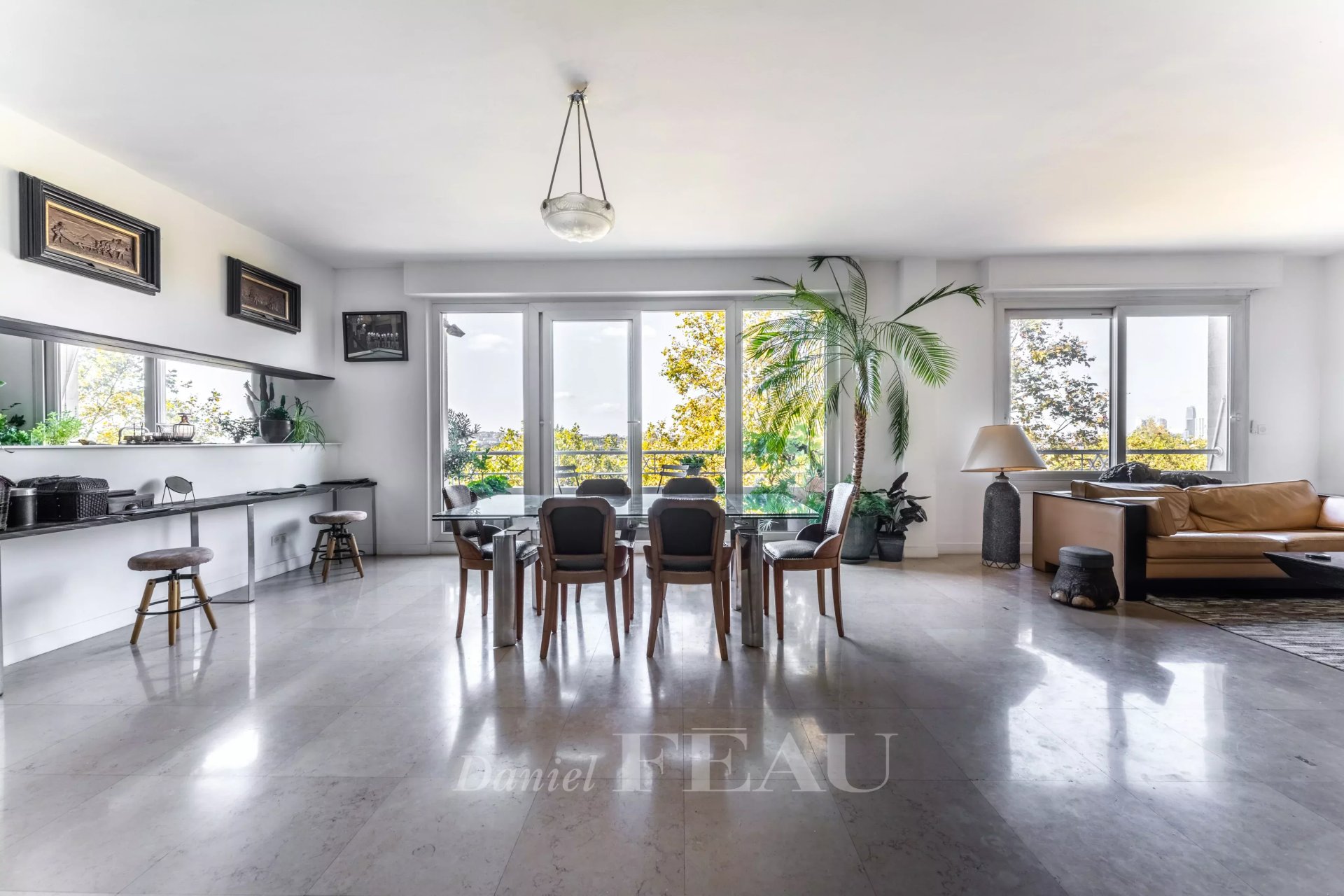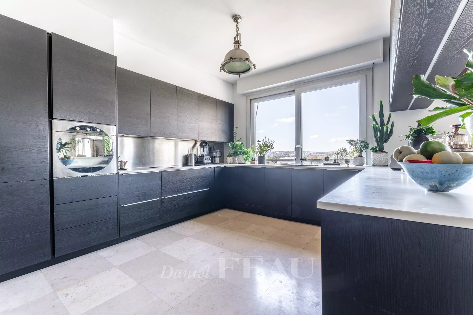 Auteuil neighbourhood. This bright and peaceful 207 sqm apartment benefiting from an excellent floor plan occupies the whole sixth floor of a luxurious mid 20th century freestone building with two lifts. In excellent condition, it includes a double living/reception room opening onto a wide balcony commanding a panoramic open view of Auteuil racecourse, la Defense and the Bois de Boulogne, a spacious open-plan kitchen, a master suite with a study area, a dressing room, a bath/shower room and a wc, and three further bedrooms with a bathroom.