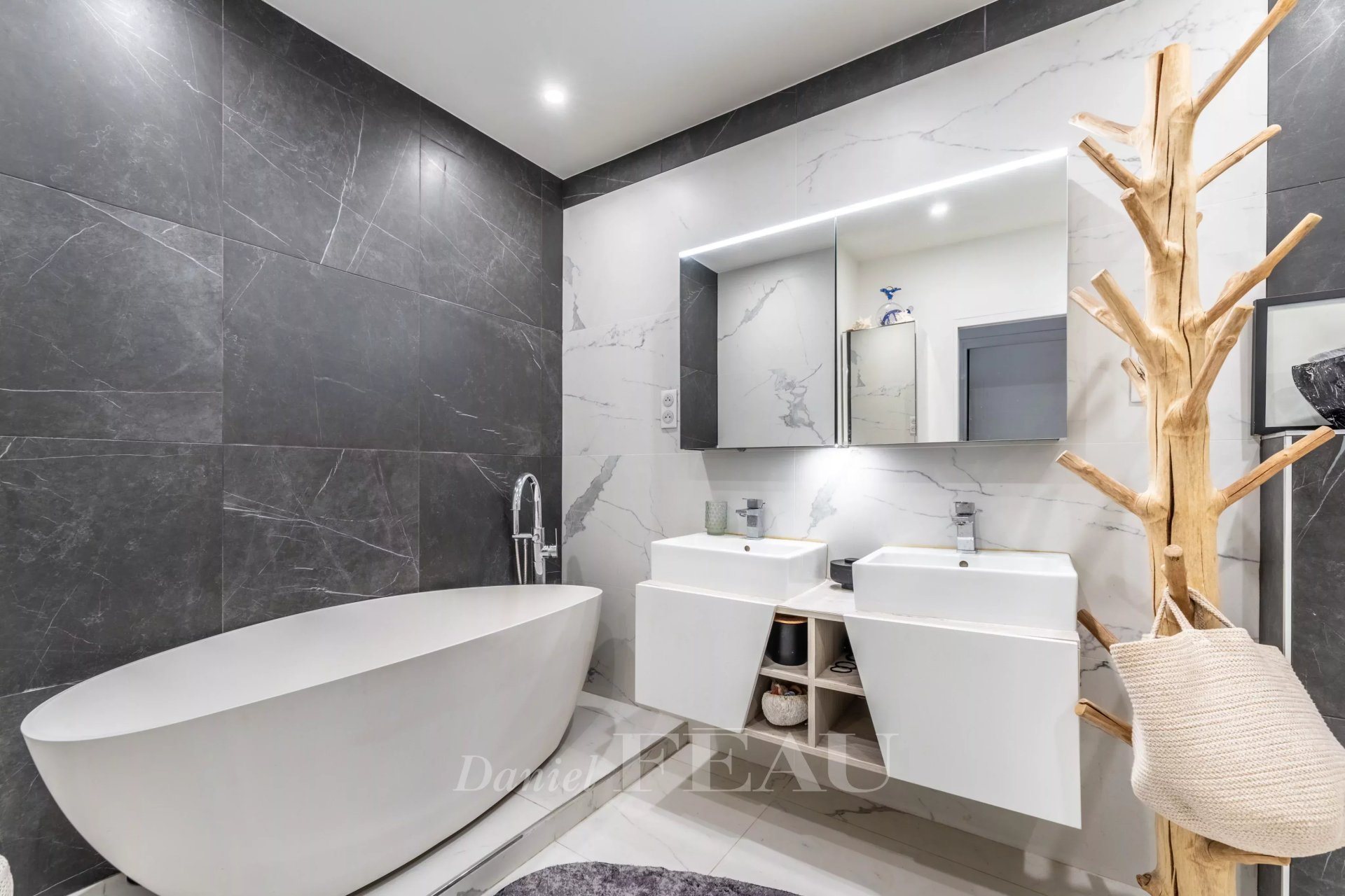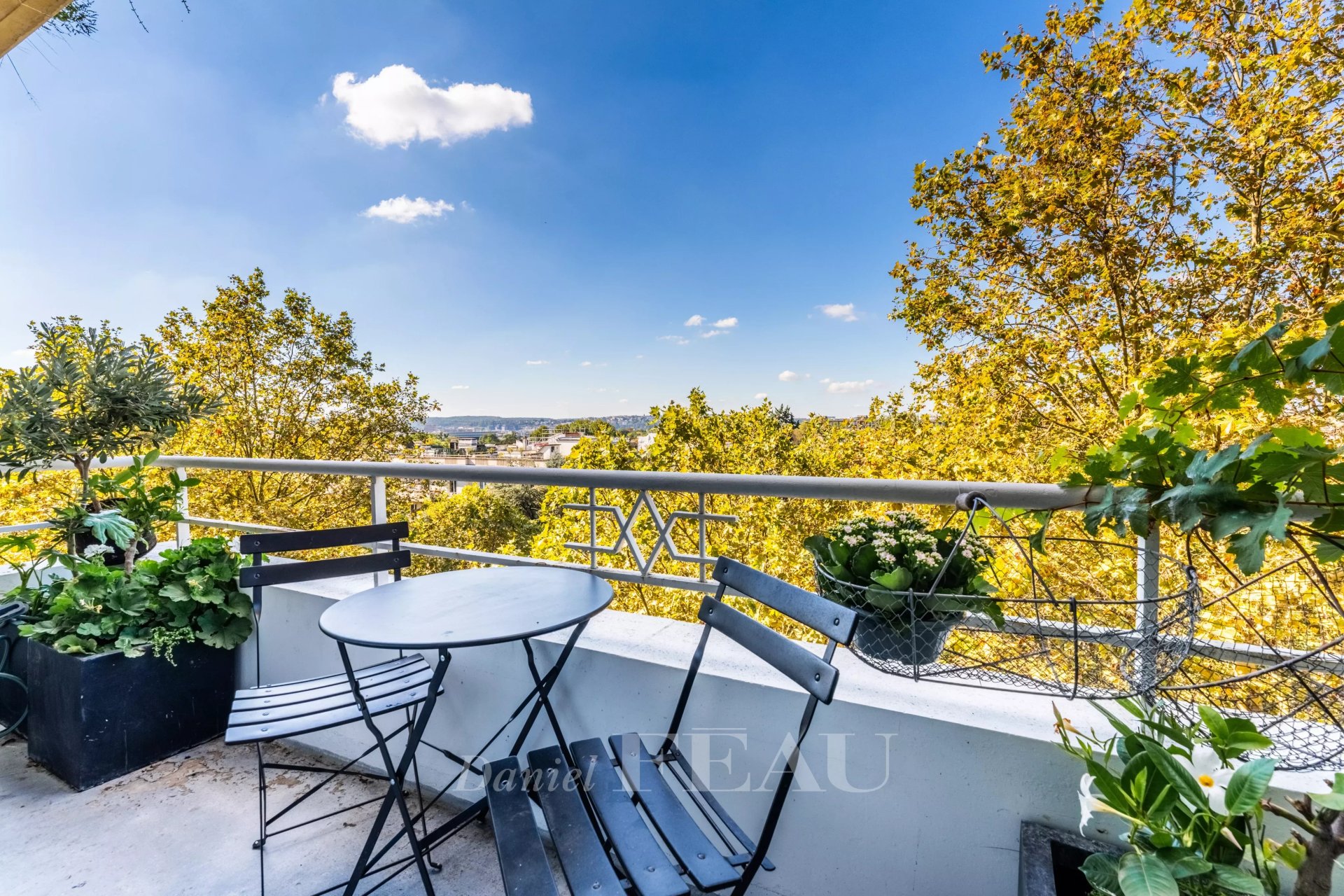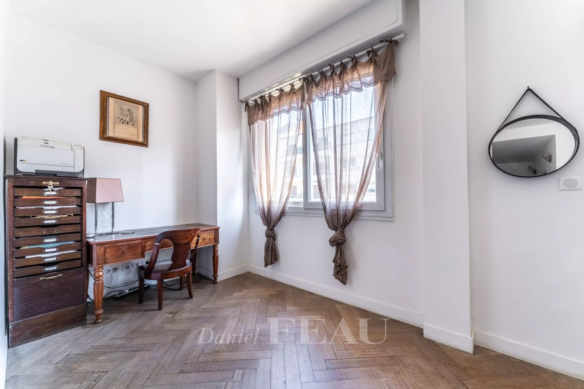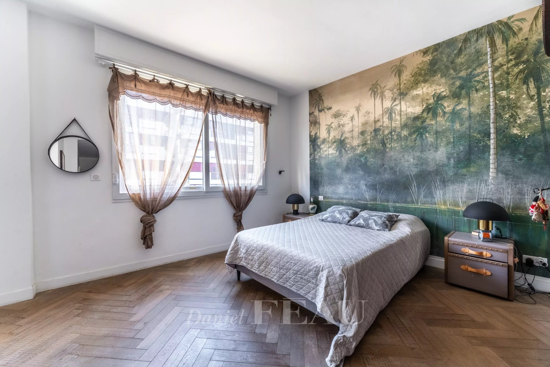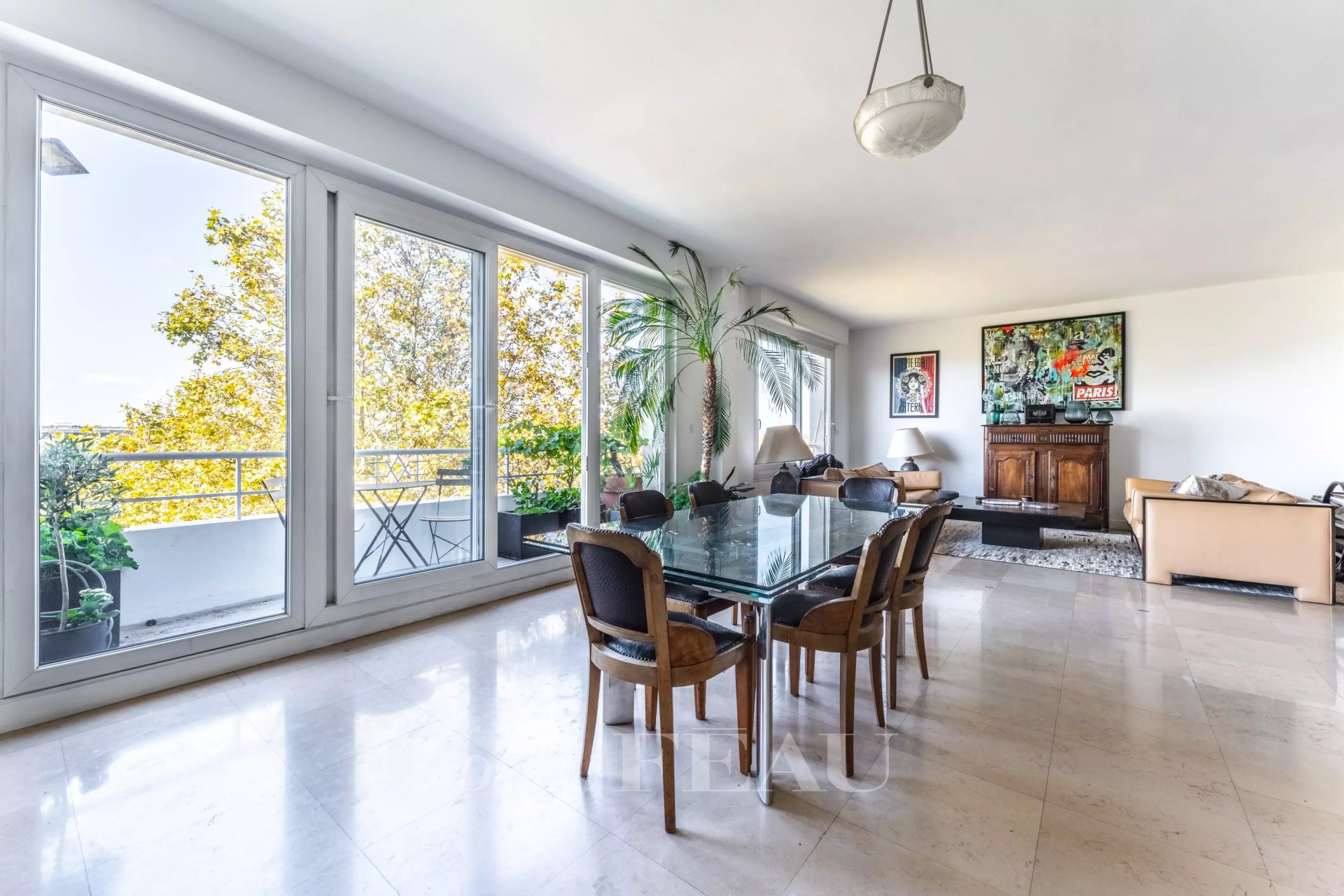 Auteuil neighbourhood. This bright and peaceful 207 sqm apartment benefiting from an excellent floor plan occupies the whole sixth floor of a luxurious mid 20th century freestone building with two lifts. In excellent condition, it includes a double living/reception room opening onto a wide balcony commanding a panoramic open view of Auteuil racecourse, la Defense and the Bois de Boulogne, a spacious open-plan kitchen, a master suite with a study area, a dressing room, a bath/shower room and a wc, and three further bedrooms with a bathroom.