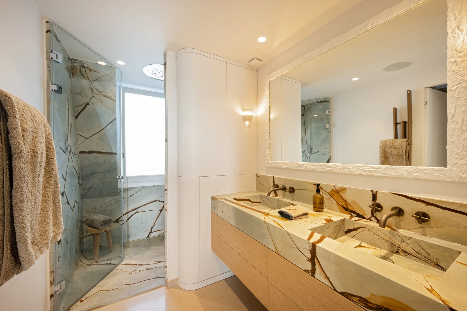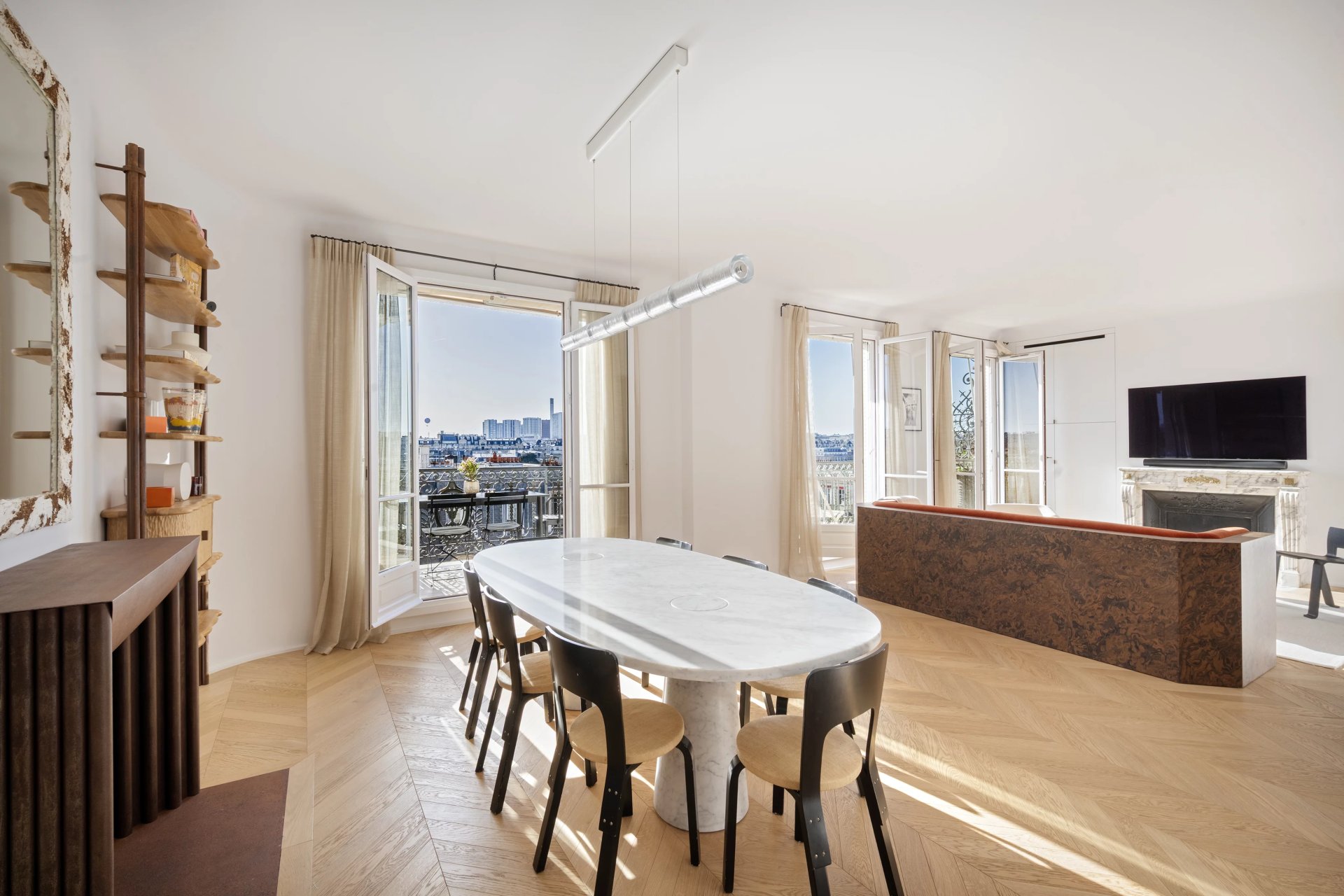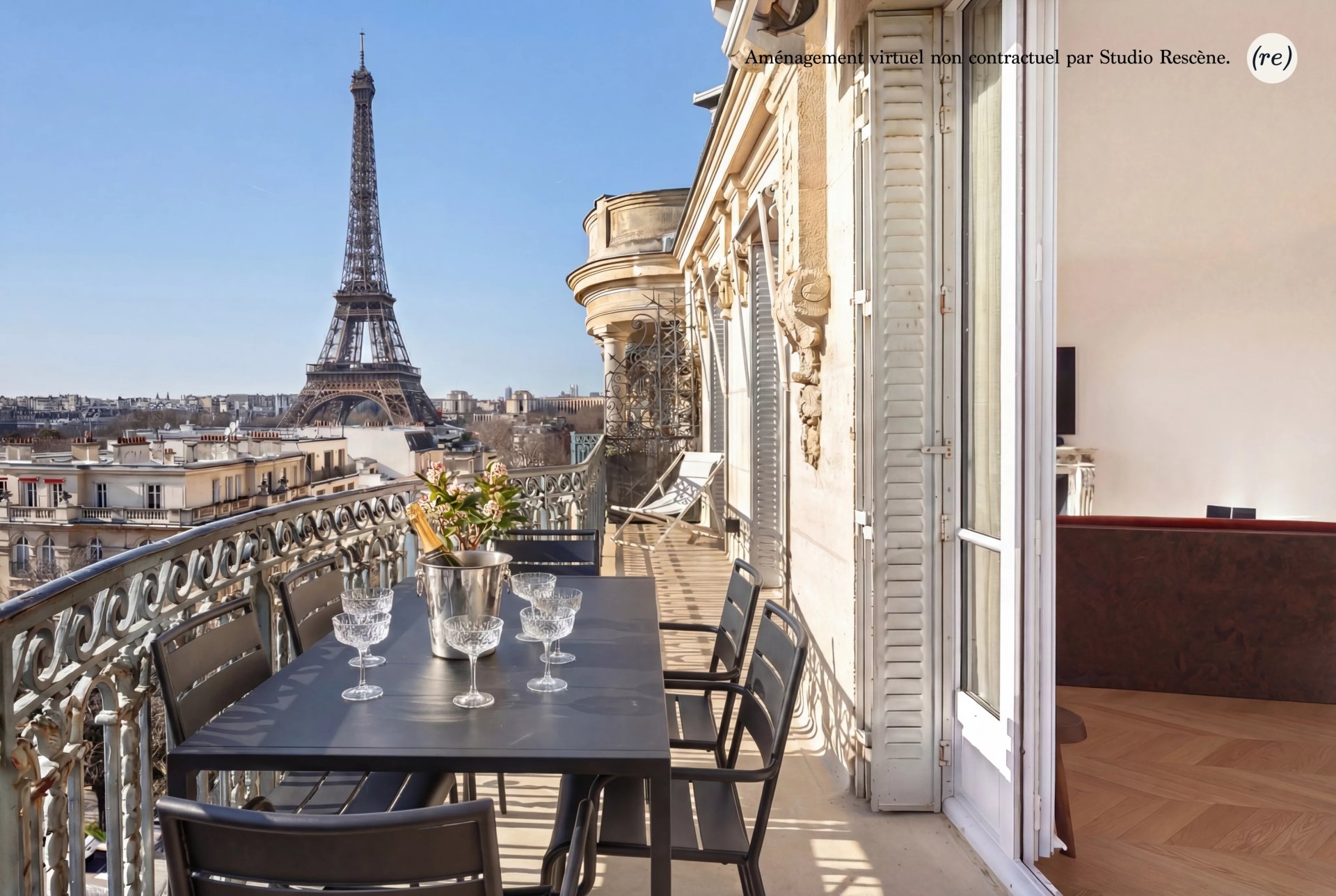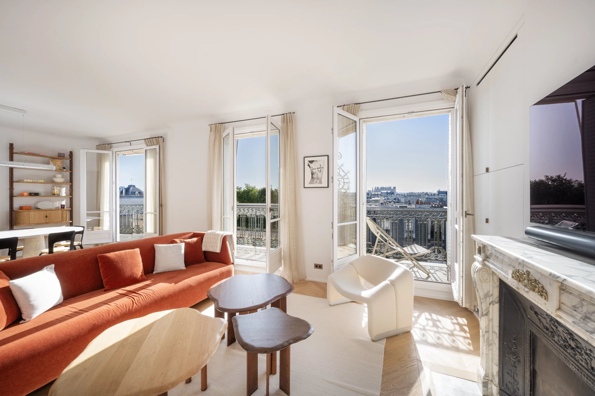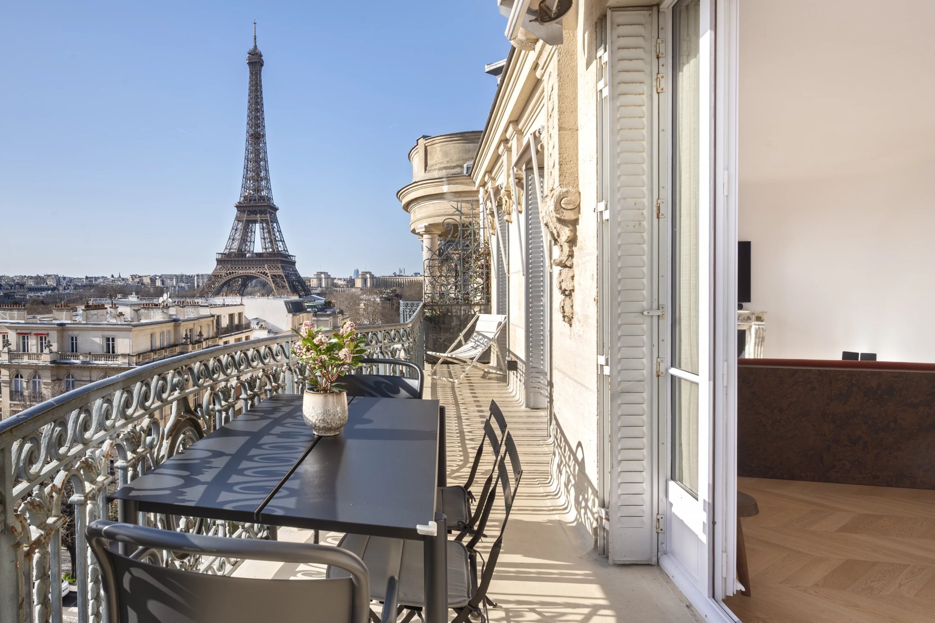 In a side-street bordering the Champ-de-Mars. This exceptional split-level apartment on the sixth, seventh and top floors of a prestigious early 20th century building offers 172 sqm of air-conditioned floor space and 166 sqm of living space as defined by the Carrez Law. Revamped by a renowned interior decorator in a tasteful contemporary style, it includes an elegant entrance hall, a double living/reception room bathed in sunshine thanks to three floor-to-ceiling windows opening onto a wide 18 sqm terrace commanding an open view of the Eiffel Tower, a kitchen with dining facilities, three bedrooms, a bathroom, a shower room/wc, and a superb master suite with a shower room, a separate wc and a dressing room.