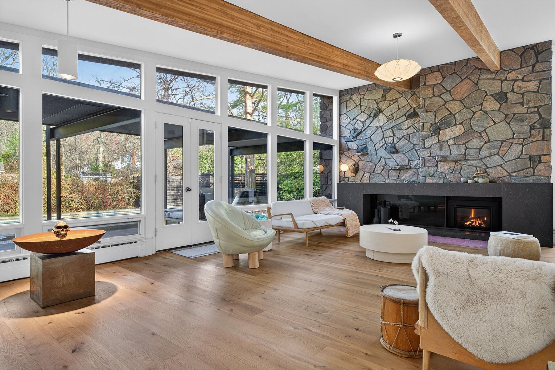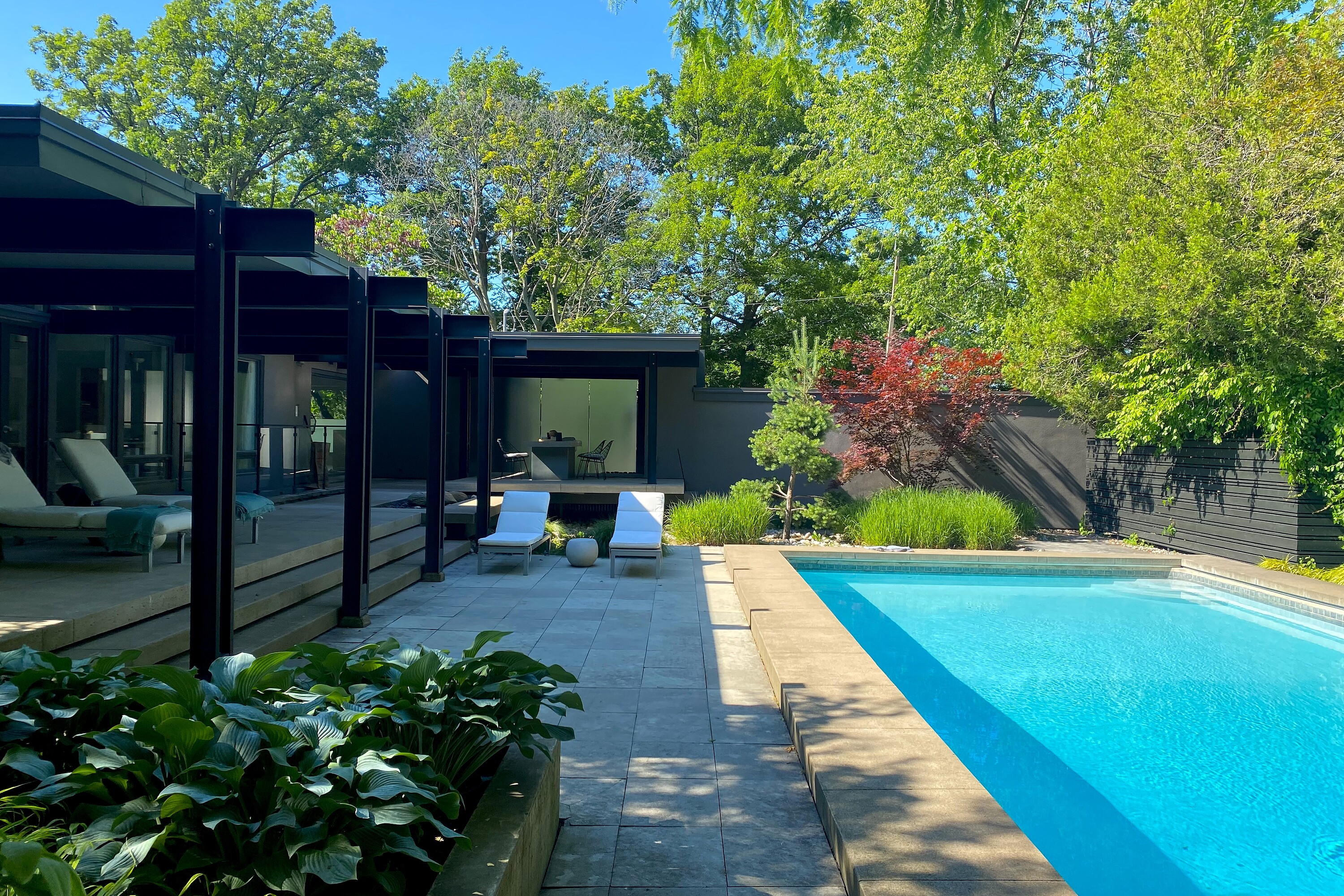 Architecturally relevant and thoughtfully reimagined, 105 Marsdale Drive is an inspiring mid-century modern "Butterfly Roof" bungalow, offering nearly 3,000 square feet of main-level living in one of South St. Catharine's' most highly sought-after neighbourhoods. Originally designed in 1958 by Massey Award-winning architect James E. Secord, with a later addition influenced by renowned architect Ron Thom, this home blends preserved architectural character with modern updates. Features include floor-to-ceiling glass, clean horizontal lines, custom rosewood built-ins, and four fireplaces (3 wood-burning, 1 gas). The open-concept layout flows seamlessly through the living, dining, and kitchen areas, creating an ideal space for both everyday living and entertaining. The private backyard oasis is a standout feature, professionally landscaped and designed for resort-style living. Highlights include a Swenker concrete pool, hot tub, outdoor barbecue kitchen, pool change room, low-voltage landscape lighting, and a programmable in-ground sprinkler system. The fully finished lower level offers a self-contained suite with a separate entrance, two bedrooms, a full kitchen, spacious living areas, and a full bathroom - ideal for multigenerational living, growing teenagers, guests, or a nanny/in-law setup. Additional features include an original indoor cedar-lined sauna with shower, extensive storage, cedar-lined closets, and mature award-winning landscaped gardens providing exceptional privacy. Located just steps from the Niagara Escarpment, Bruce Trail, Ridley College, the Pen Centre, and some of Niagara's top wineries and Michelin star restaurants. A rare opportunity to own an architecturally significant mid-century modern home with exceptional lifestyle flexibility in a prime location.
