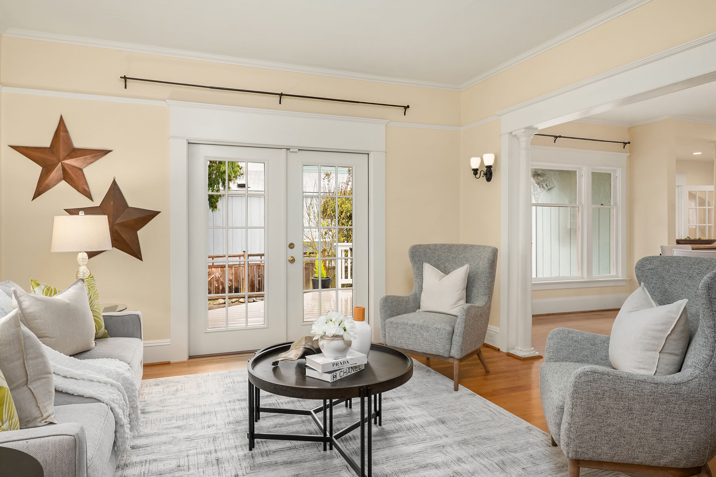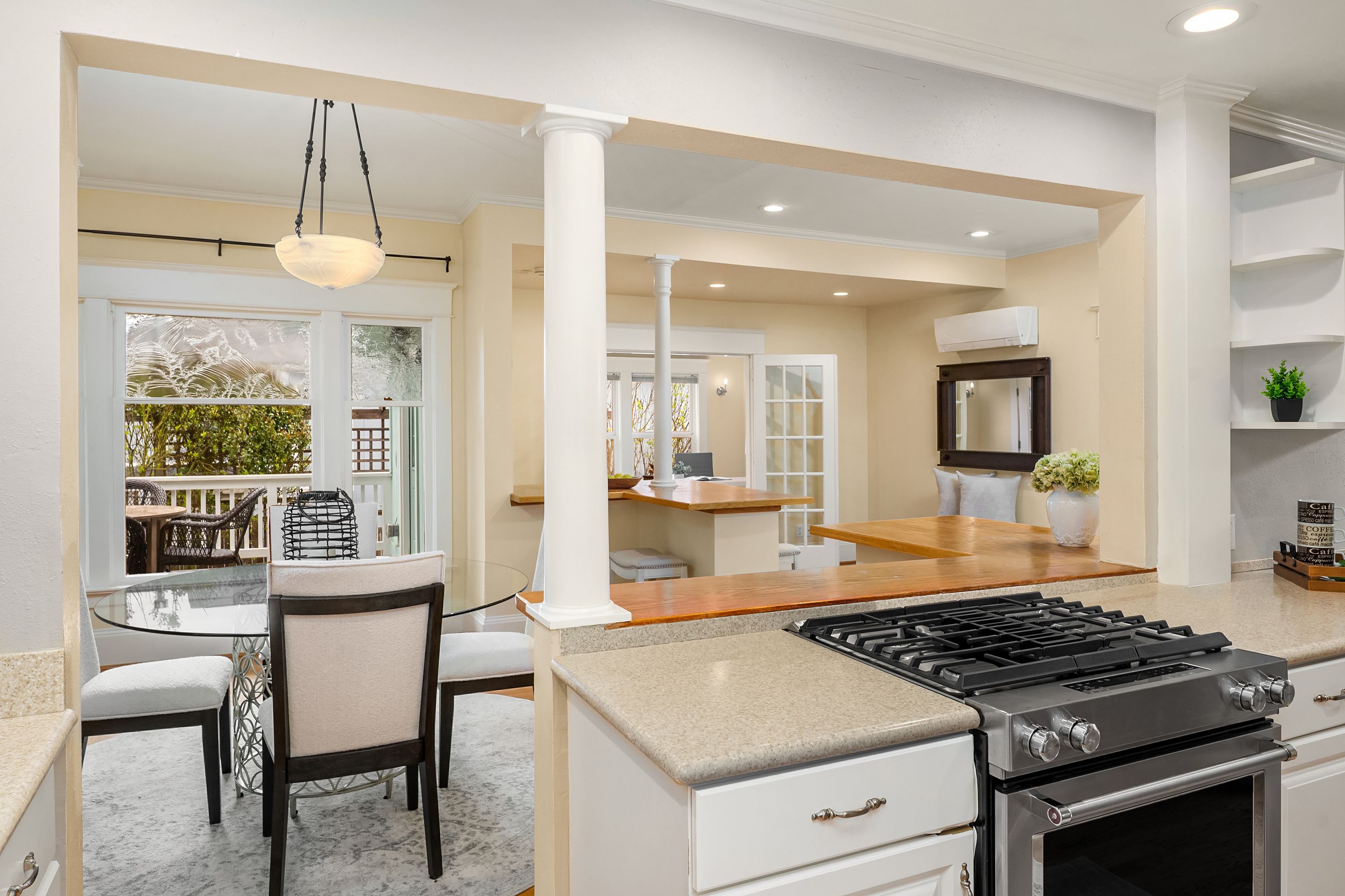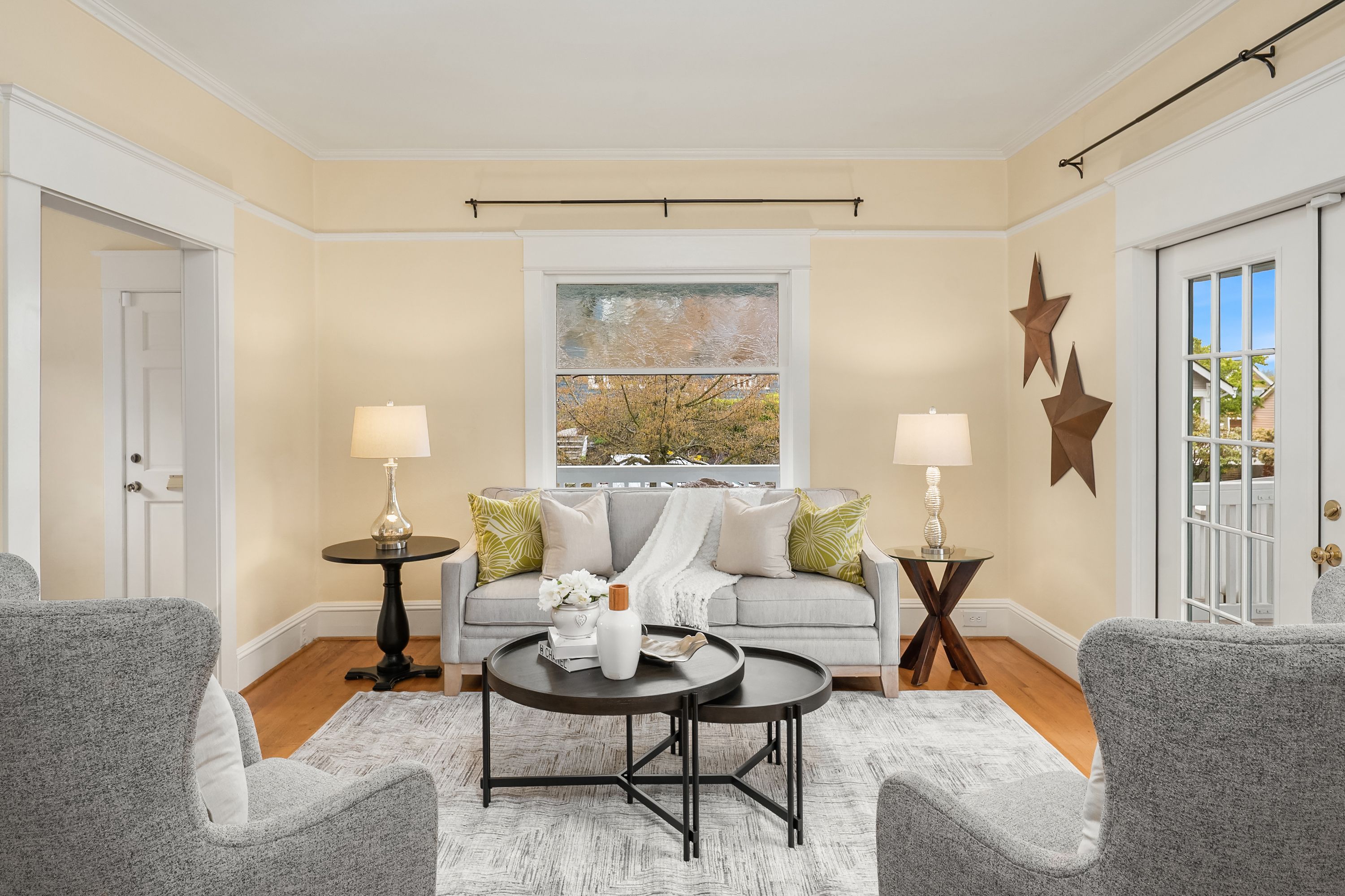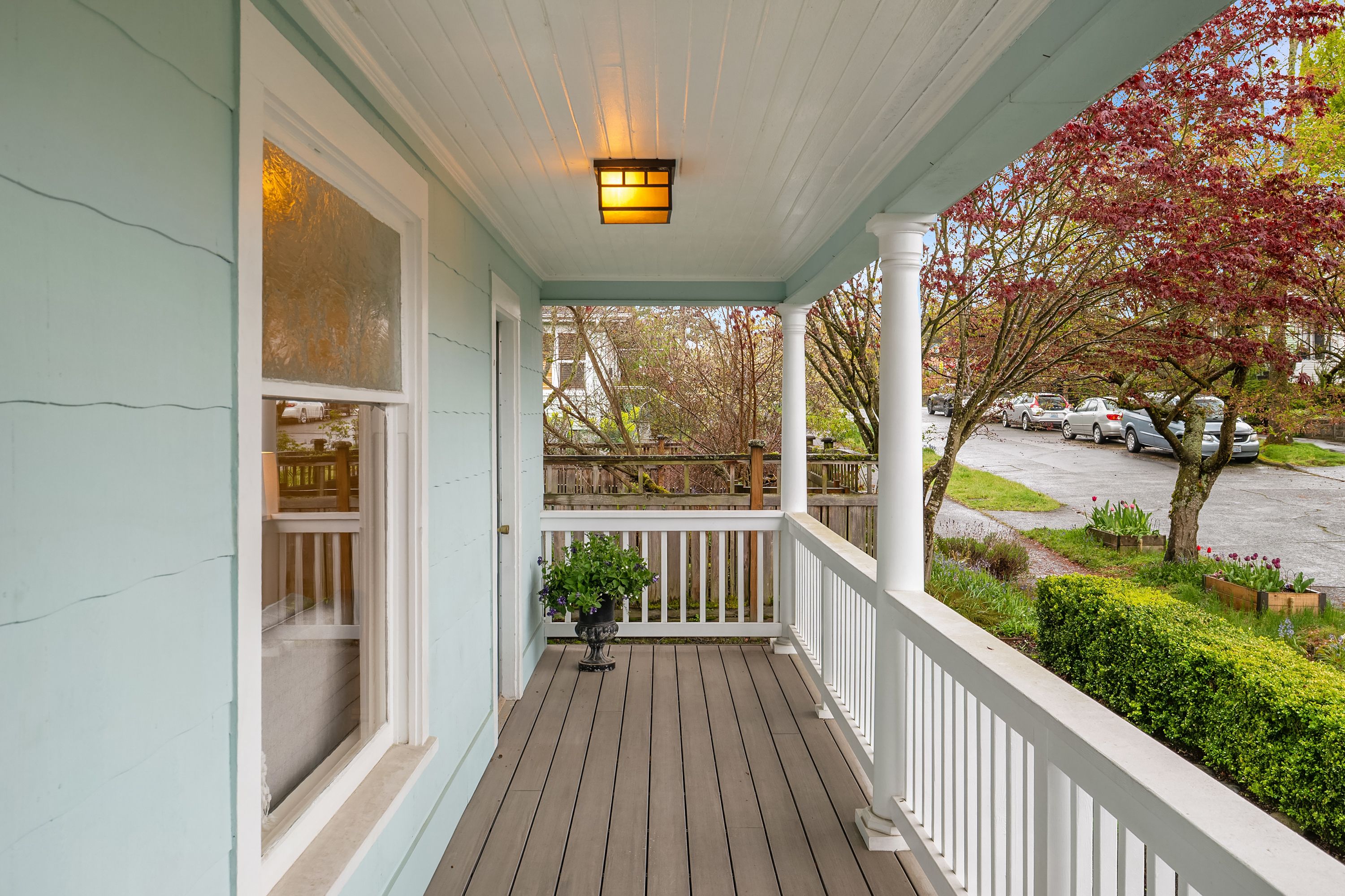 Experience this majestic home perched high above the street, offering panoramic views of Green Lake, Mount Rainier and downtown Seattle, while captivating you with it's timeless elegance and inviting charm. Located on a quiet street just a short stroll from the lake and vibrant neighborhood favorites. Step inside to experience all the character of light filled living spaces with the open floor plan including large living and dining room creating an airy, serene atmosphere. French doors lead to a covered deck and beautifully landscaped patio-ideal for entertaining or relaxing year-round. The spacious kitchen features bar seating and a large pantry, making it as functional as it is stylish. A thoughtfully designed layout includes a main-floor office/den, while upstairs are 3 bedrooms, a convenient laundry room and views of the mountains, city and lake. The fully fenced backyard offers a private sanctuary with raised garden beds. Alley access to a large 2 car garage and rare off street parking for additional vehicles. The lower level provides 646 sq. feet, ready for you to design your perfect dream space. Lovingly maintained and move in ready, this home offers modern comforts including new roof, water heater and energy efficient mini splits. Opportunities like this are rare-views, style, location and lifestyle all in one. Don't miss this chance to own a truly special home in one of the area's most sought after neighborhoods.