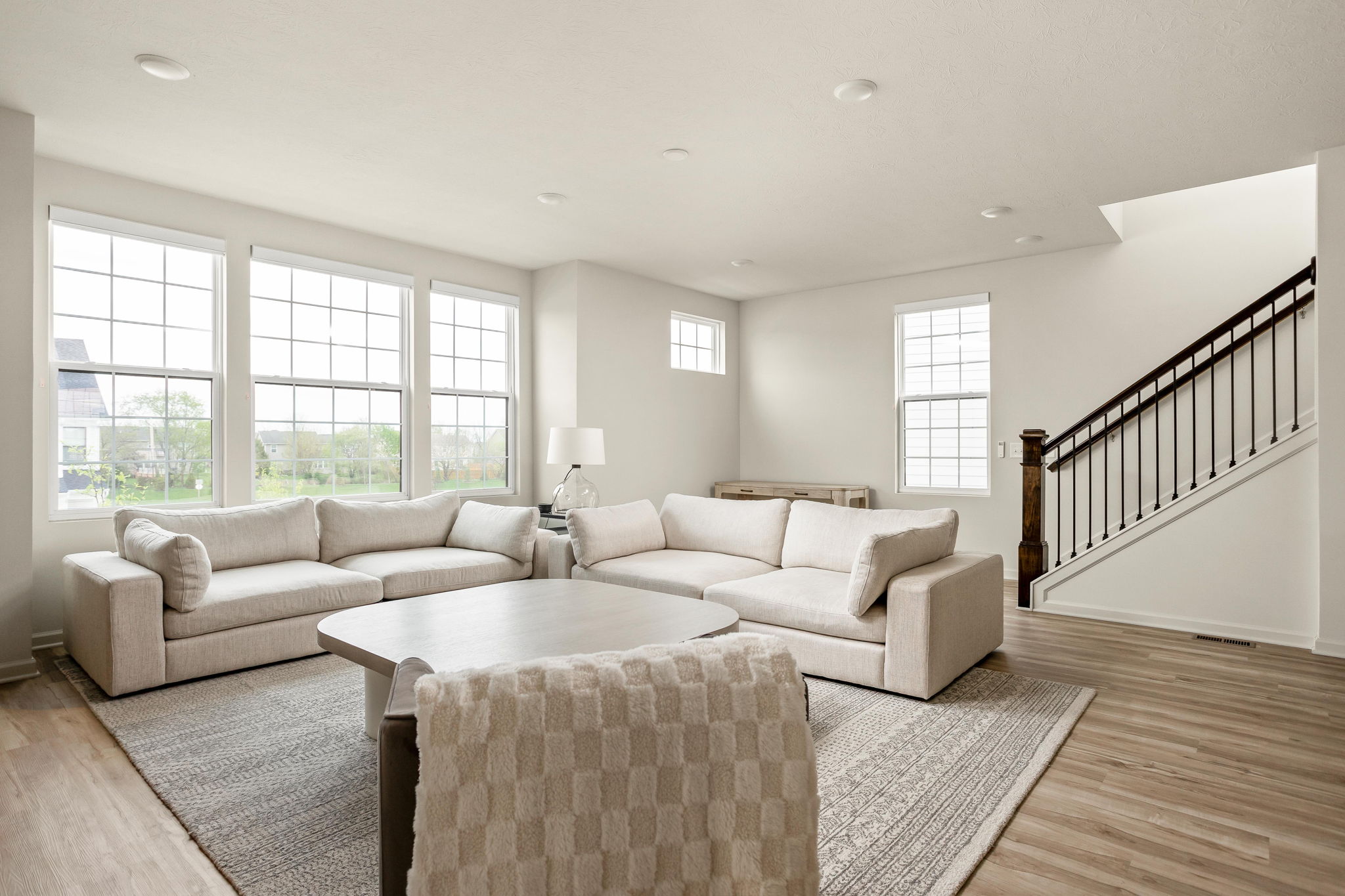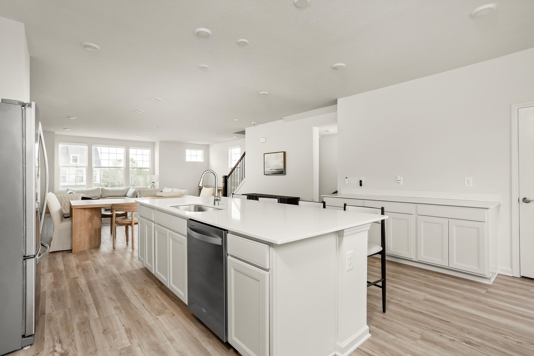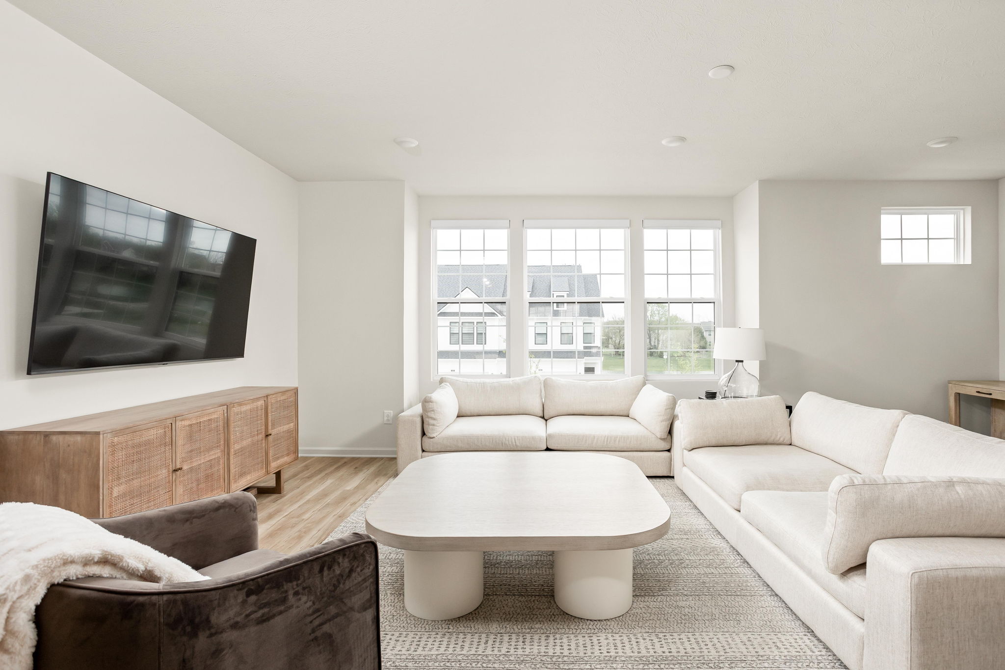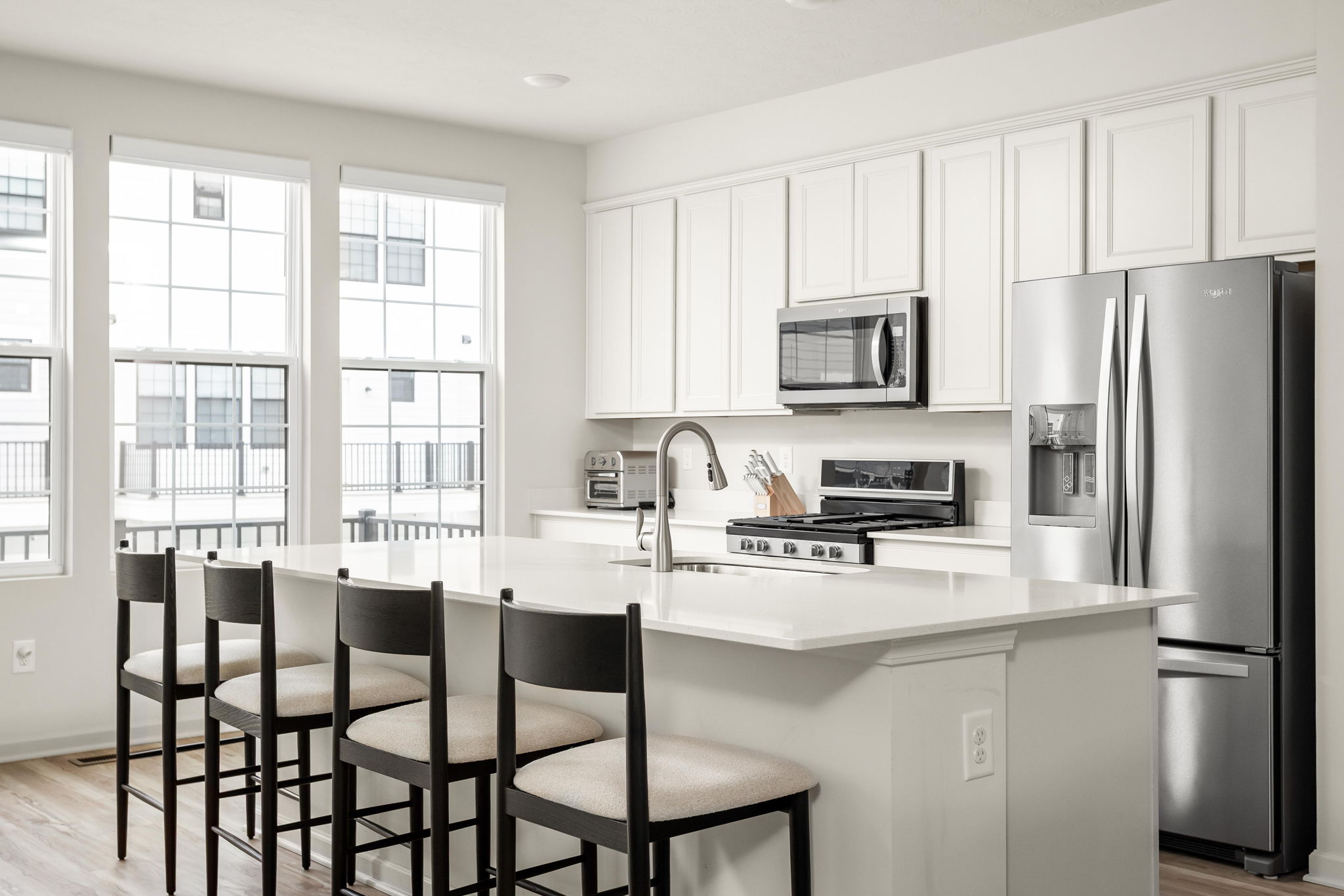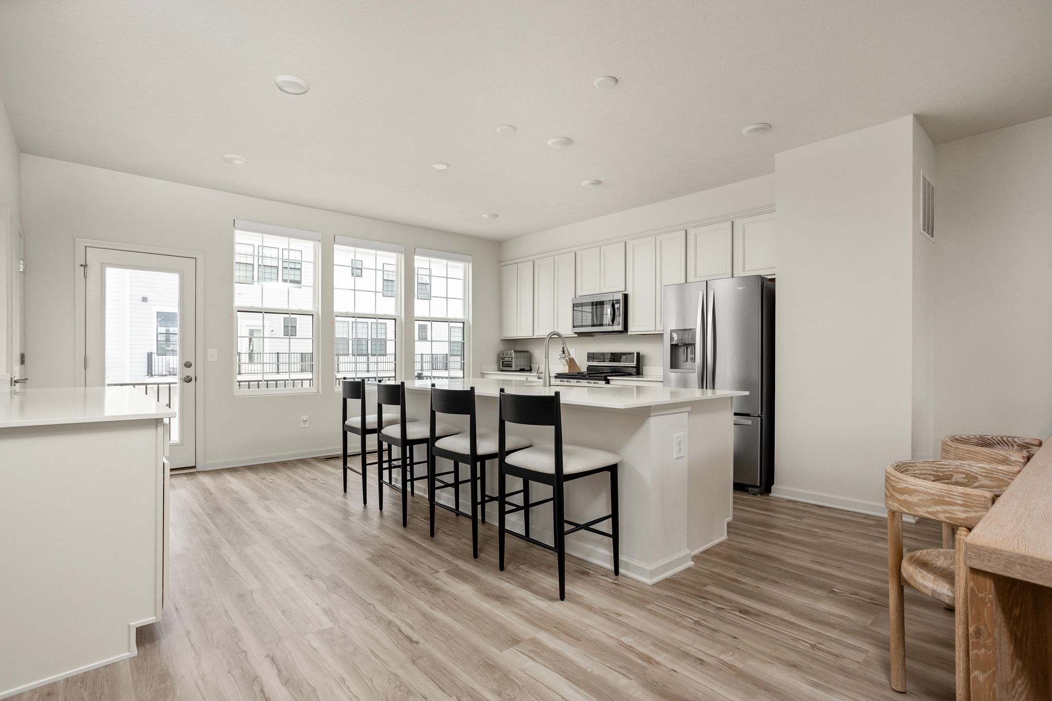 A standout end-unit with a pond view in the Towns at Appaloosa Crossing, this 2024-built townhouse offers the advantage of newer construction, a functional three-level layout, and abundant natural light-all in a highly convenient Zionsville location. The home includes 3 bedrooms, 2 full baths, 2 half baths, and an open main living space that seamlessly connects the kitchen, dining, and family room. The kitchen is well-designed with white cabinetry, a large center island, a gas range, and a walk-in pantry, along with access to a private deck for outdoor living. As a corner unit, the home is filled with natural light thanks to additional windows throughout, all equipped with custom mechanical shades. Upstairs, the primary suite features tray ceilings, a wall of windows, a spacious layout, and a well-appointed bath with a large walk-in shower, double vanities, and a generous walk-in closet. Two additional bedrooms offer flexibility for guests, a home office, or everyday living. The lower level adds valuable flexibility, currently used as an office but easily suited for a workout space, hobby area, playroom, or the option to enclose for a fourth bedroom. The two-car garage is finished with epoxy floors and provides extra storage space. Ideally located with quick access to shopping, dining, and the interstate, this home combines low-maintenance living with everyday convenience.
