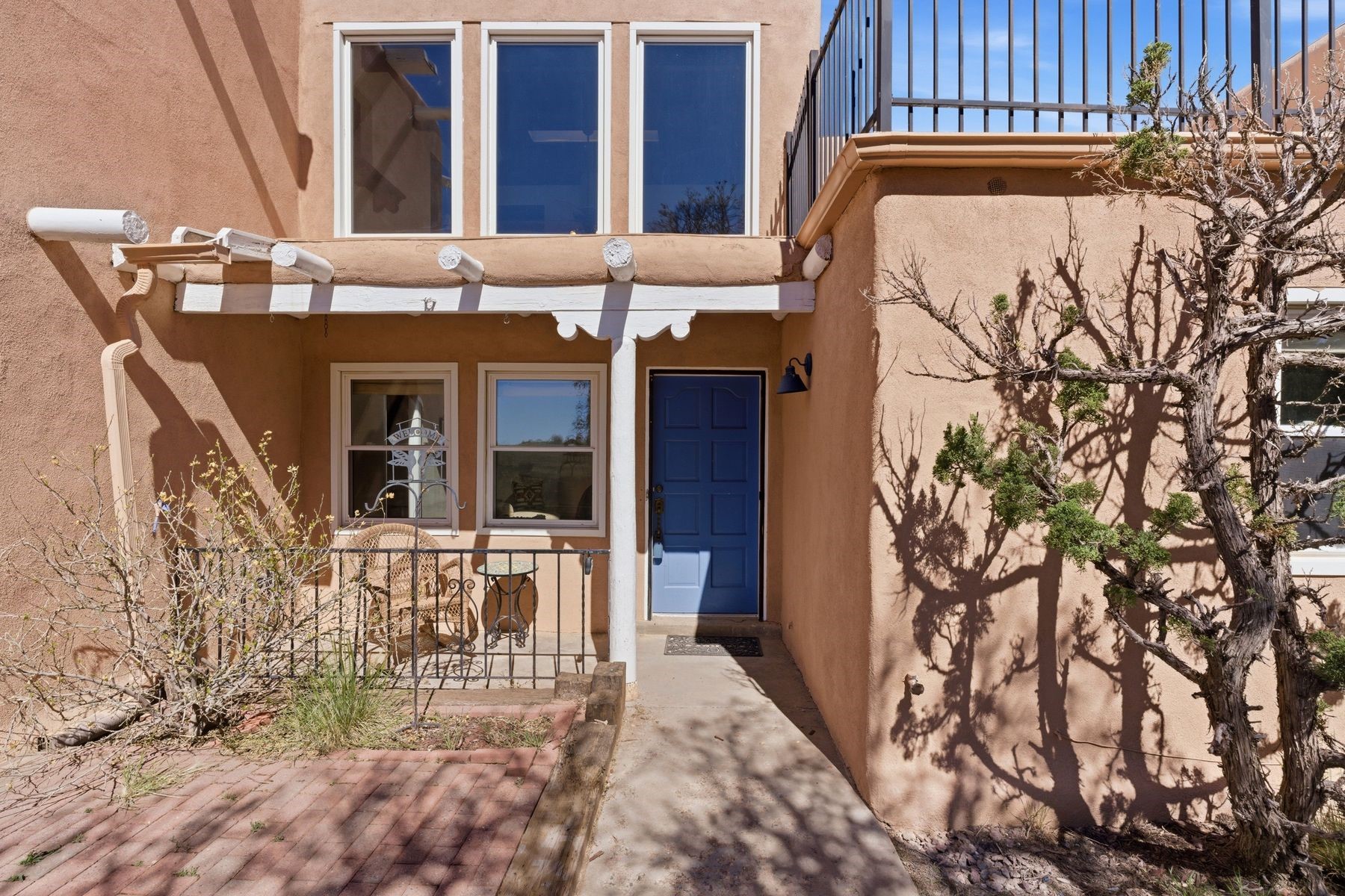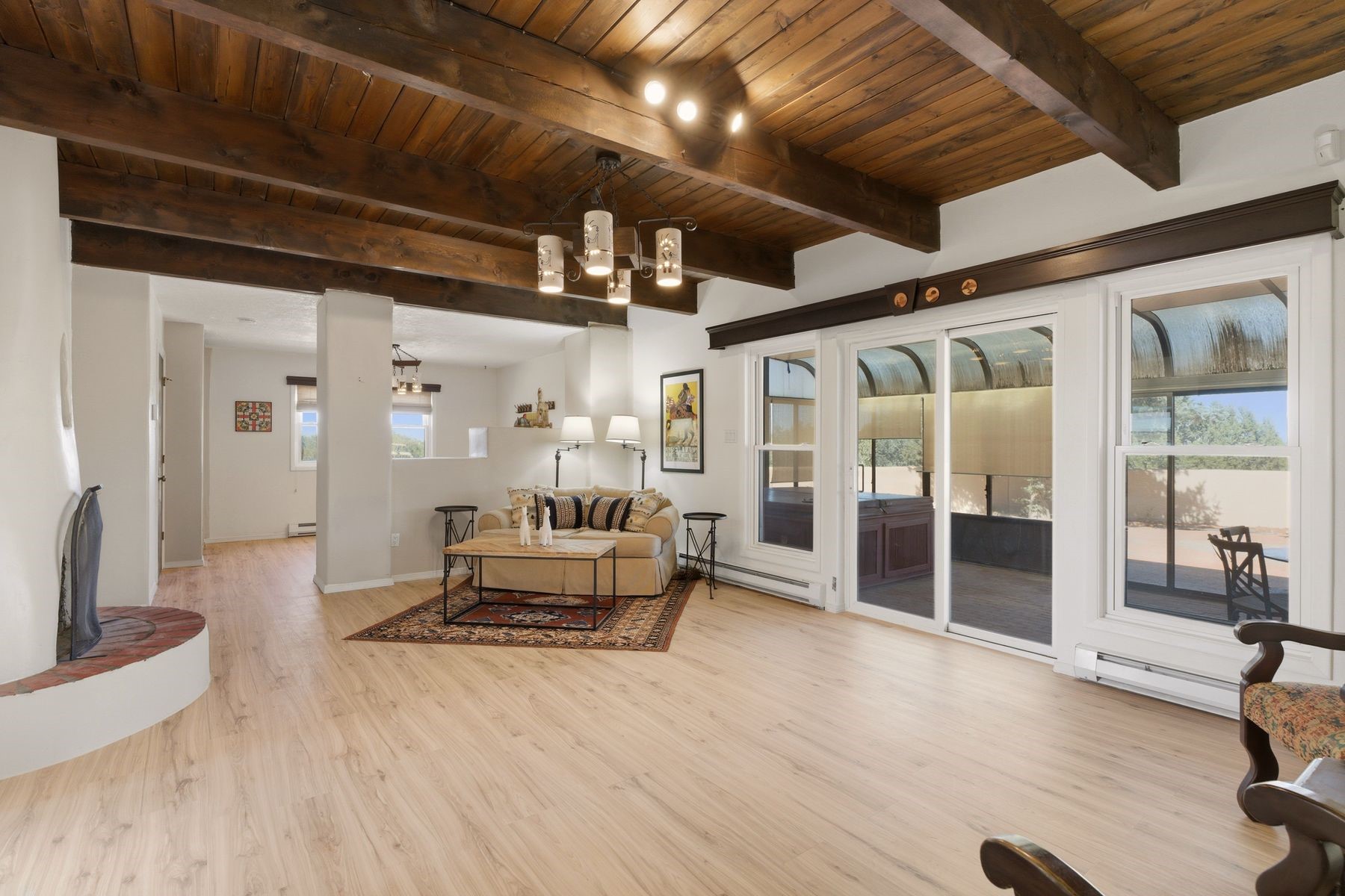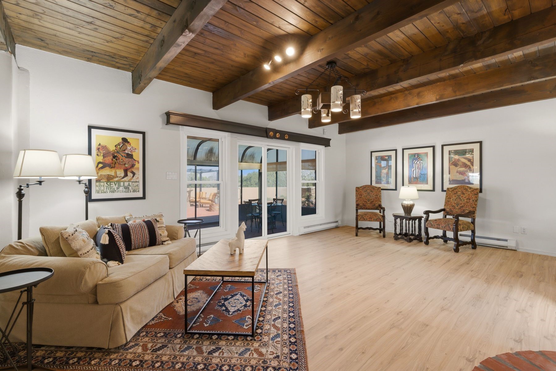 Discover the creative potential of this Pueblo Revival home in Eldorado — a sought-after Santa Fe community known for its trail network, community amenities, and easy access to I-25 and downtown. Set on a flat, private 1.65-acre lot just 15 minutes from Santa Fe’s historic Plaza, this spacious 4-bedroom, 4-bathroom, 3,758 square foot two-story residence blends Southwestern character with abundant flexible space, ideal for artists, hobbyists, or anyone seeking room to live, work, and create. A dramatic entry welcomes you into a spacious living room with dual-sided kiva fireplace that flows into a flex space and sunroom opening to a secluded walled patio with Sangre de Cristo mountain views. The kitchen features quartz countertops, dual ovens, custom cabinetry, and a generous dining area, while brick and tile floors, banco seating, custom kachina-painted doors, and beamed ceilings add timeless style. Upstairs are four bedrooms with walk-in closets, including a large primary suite with two decks, dual baths, bonus room, and a second fireplace. A main-level bonus room off the oversized five-car garage offers additional options for a studio, workshop, or gym. Additional highlights include skylights, a greenhouse with hot tub, storage shed, and private outdoor living spaces ideal for sunrise and sunset views. The level acreage offers space for future gardens, with community trails and Santa Fe Rail Trail access just steps away. Eldorado’s community center with pool, tennis courts, stables, shopping, and Eldorado Community School are minutes from your door, while downtown Santa Fe, medical centers, and galleries are a short drive away. This versatile property offers rare space, privacy, and flexibility in one of Santa Fe’s most desirable communities — a peaceful retreat that can evolve with your lifestyle and fuel your creative pursuits.