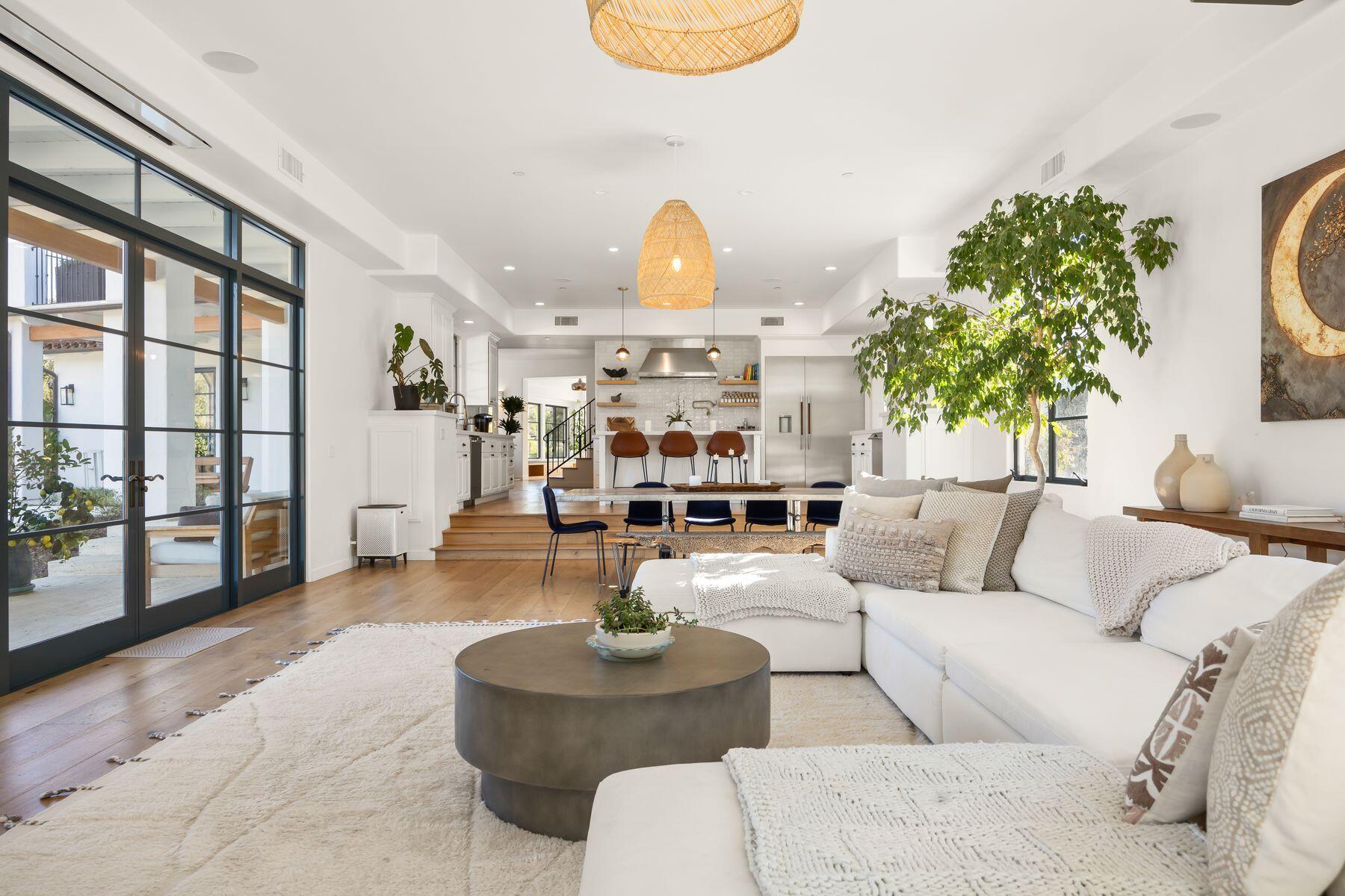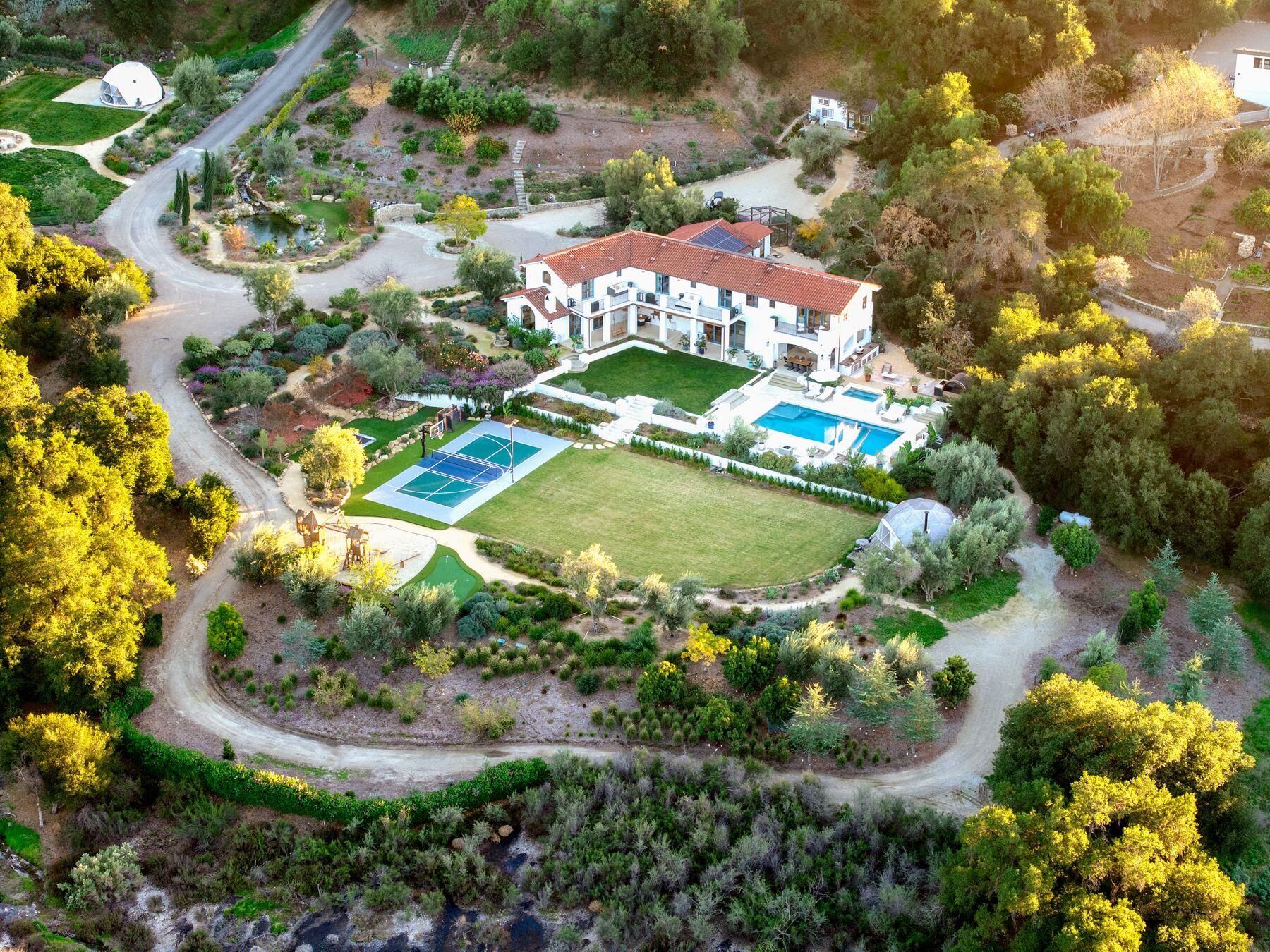 More than a home, this exceptional Ojai estate is a rare retreat-style compound offering privacy, scale, and versatility across more than ten acres, with unobstructed views of the Topa Topa Mountains. Designed as both a luxury residence and a retreat or event venue, the property delivers a lifestyle unlike anything else in the region. The main residence spans over 5,200 square feet, complemented by a custom Tiny House and two imported geodesic domes. Recognized in Architectural Digest, the home reflects impeccable design and craftsmanship throughout. Imported travertine is thoughtfully incorporated across the property--extending from sunlit pool terraces and expansive decks to refined interior accent walls--creating a seamless connection between indoor and outdoor living spaces. The home is carefully oriented to enhance natural light, balance, and flow throughout. Seamless indoor-outdoor living is anchored by a California room with a built-in fireplace, opening directly to an outdoor kitchen designed for year-round entertaining. Health and wellness are central to the design, with a state-of-the-art, medical-grade air filtration system on both floors utilizing multi-stage HEPA filtration and dehumidification. The primary bedroom suite is fully EMF-shielded, creating a Faraday-protected environment designed for rest and restoration. Outdoor amenities create a private resort experience, including a saltwater pool and elevated spa, fully lit pickleball and basketball courts, an in-ground LED-lit trampoline, putting green, expansive grass sports field, koi pond with waterfall, fire pit for gatherings, and DG walking paths throughout the property. A yoga dome and guest dome, both imported from Poland, further support retreat use and flexible living. The property is supported by a private well shared with only one neighboring property and includes a regenerative orchard with fruit and avocado trees. Additional features include full solar power with Tesla backup batteries, EV charging stations, Starlink Wi-Fi with property-wide connectivity, gated access along a private road ensuring privacy and controlled entry, perimeter security cameras, landscaping and site design configured for fire mitigation and defensible space, and a 5,000-gallon backup water tank. The garage has been converted into a fully equipped gym. A truly rare offering, this estate is ideally suited as a primary residence, second home, or retreat embodying the very best of Ojai's luxury lifestyle.