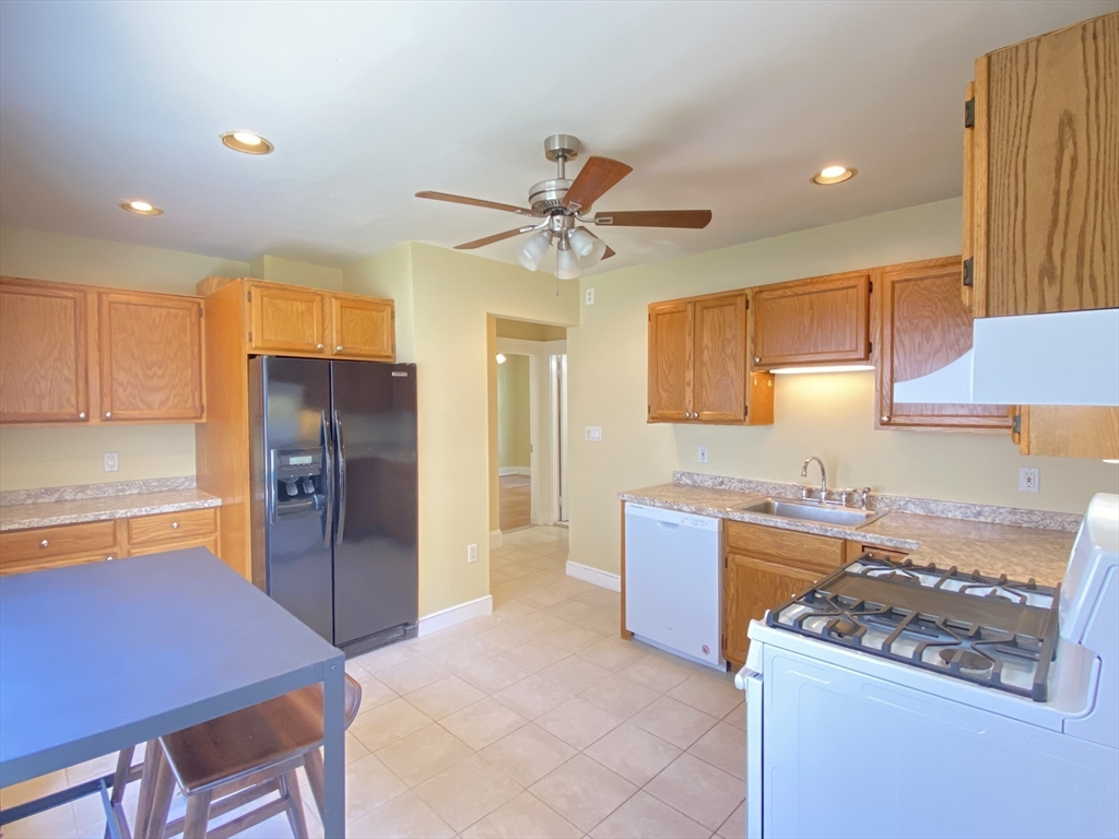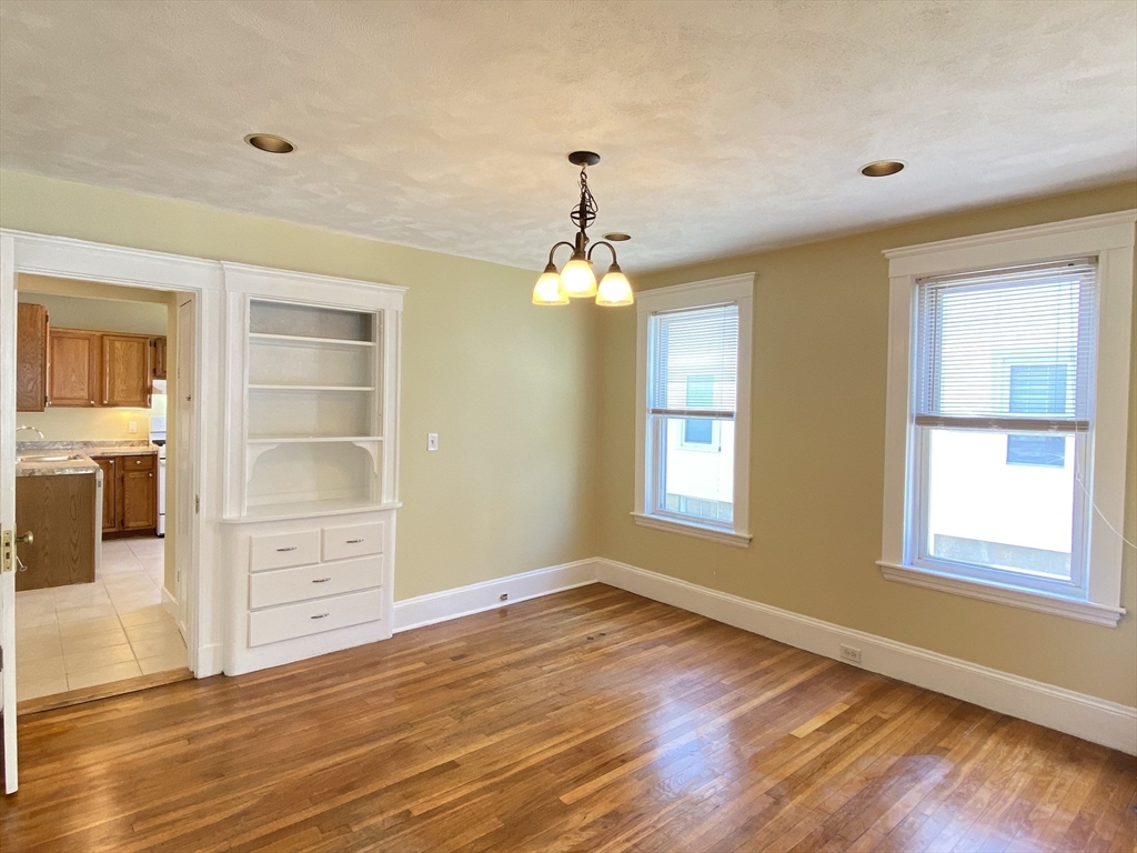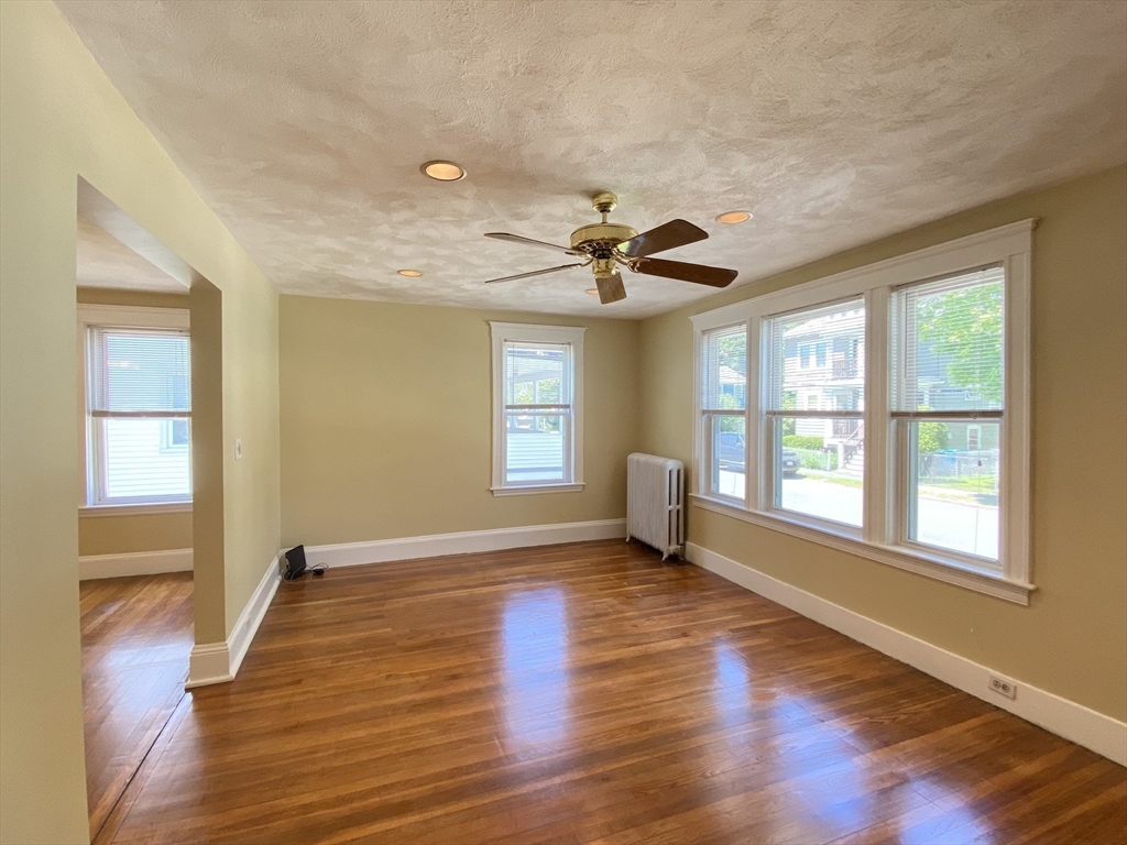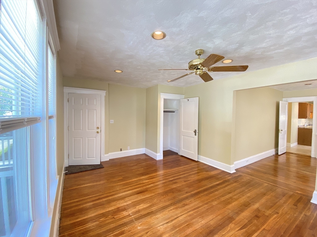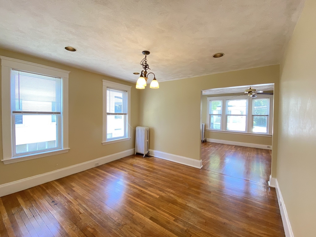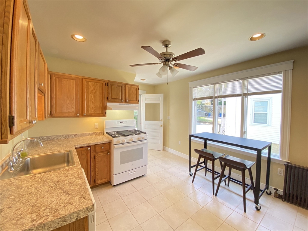 1st Floor, 2 bedroom unit on nice street between Waverley Square & Belmont Center. Living room, with recessed lights & ceiling fan, opens to the dining room with built-in cabinet. The eat-in kitchen is off the dining room and includes: recessed lights, under counter lighting, ceiling fan, tile floor, plenty of cabinet storage, dishwasher, gas range and access to rear porch, yard & parking. Full bath with tub/shower and 2 bedrooms, both with ceiling fans, are also on this level. Replacement windows throughout. Exclusive clothes washer & dryer in the basement along with bonus room. The home has a grassy side yard and is close to Town Field, Commuter Rail, bus to Harvard Square, shopping and restaurants. Available July 1st, 1 car parking