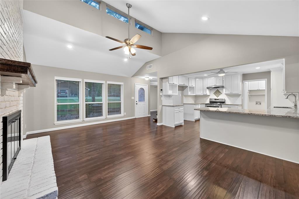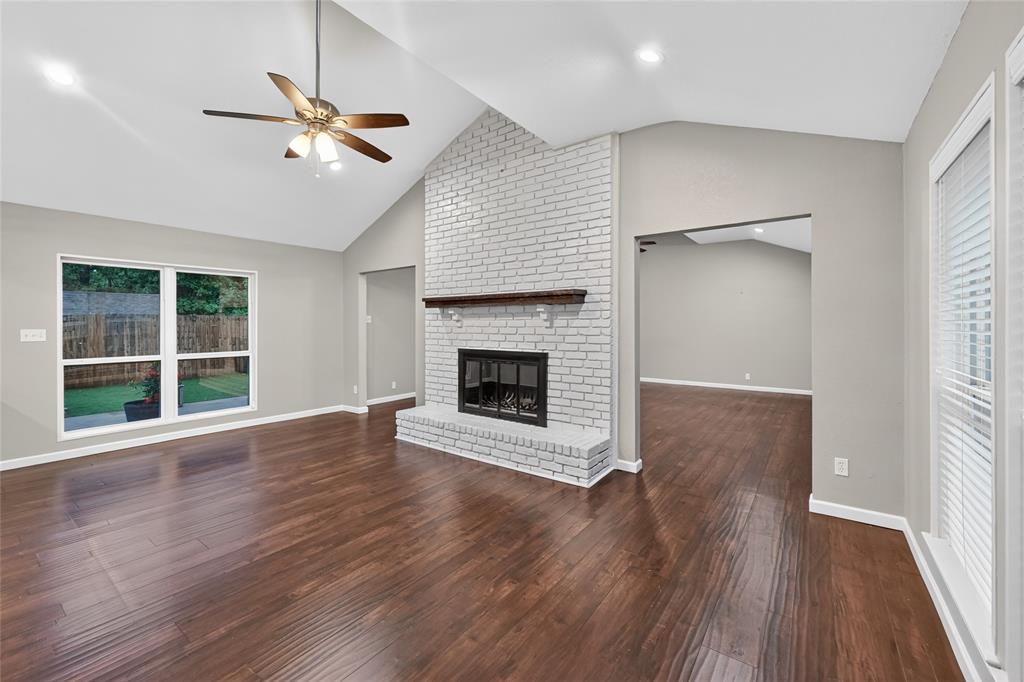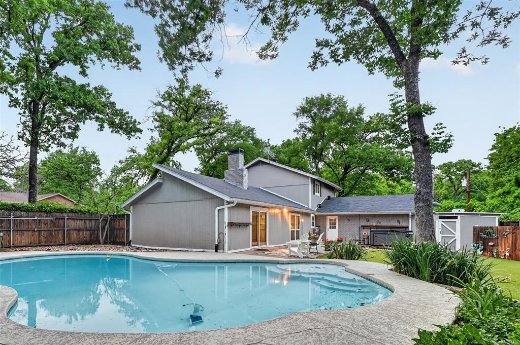 Escape to your own private treed sanctuary in this beautifully remodeled 2-story retreat, perfectly situated on nearly a third of an acre corner lot near the shores of Lake Lewisville. Entertain in your backyard paradise designed for year-round enjoyment, featuring a remodeled pool with a recent LED light, and a massive patio with an XL hot tub. This home makes a stunning first impression with a freshly stained front walkway, mature trees, lush landscaping, and gorgeous zoysia grass. The open-concept layout is bathed in natural light through abundant windows designed for energy efficiency, highlighting the extensive luxury plank flooring that flows throughout the main living areas. The modern kitchen featuring crisp white cabinetry, granite countertops, stainless steel appliances, a recently replaced dishwasher, and a breakfast bar for effortless morning routines. Host unforgettable gatherings in the dining room, where a magnificent floor-to-ceiling brick fireplace creates an intimate hearthside dining atmosphere. Unwind in the first-floor primary suite boasting a decorative accent wall, recessed lighting, and a spa-like ensuite with a semi-frameless shower and granite vanity. A versatile flex space provides the perfect footprint for a dedicated home office or playroom. The low-maintenance artificial turf grass ensures a lush landscape, while the storage buildings and 2-car garage provide ample room for hobbies. XL driveway plus a carport ideal for boat parking and a location less than five minutes from Copperas Branch Park, this home offers the ultimate lifestyle for lake enthusiasts. THe quiet neighborhood has access to an extensive trail sytem. Close proximity to the 36-acre Doubletree Ranch Park, perfect for outdoor enthusiasts who enjoy miles of walking trails, a playground, soccer fields, a splash pad, and opportunities for fishing, paddleboarding, kayaking, and canoeing on the 4- and 60-acre lakes. Click the Virtual Tour link to see the 3D Tour!
