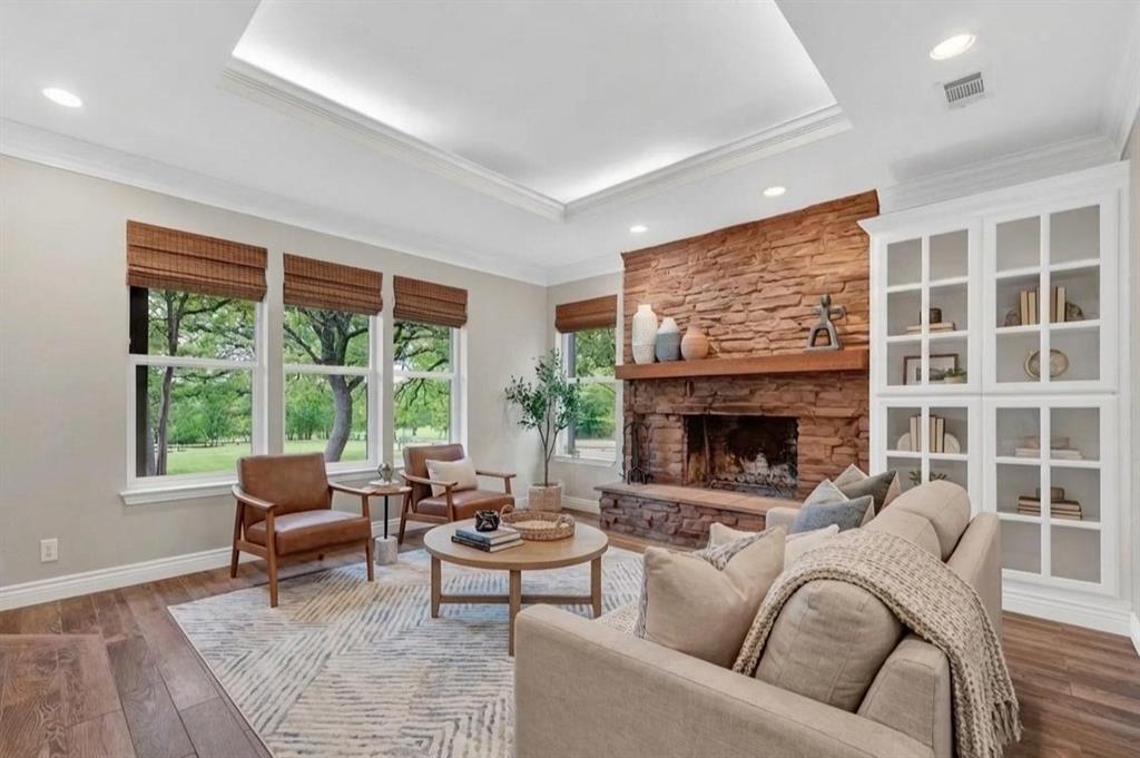 Escape to a secluded nearly three-acre sanctuary where a canopy of ancient oak trees and a winding drive lead to your private year-round vacation retreat. This sprawling single-story estate offers an ideal flow for both entertaining and quiet moments, anchored by a private well-fed pond where wild turkeys and deer frequently visit. Beyond the foyer, the home opens into an impressive living room featuring an up-lit tray ceiling and a floor-to-ceiling stone fireplace. A true chef's kitchen serves as the hub for hosting, boasting white cabinetry, granite counters, a five-burner gas cooktop, a swing-out pantry, and a breakfast nook with bay windows offering stunning pond views. Head to a primary suite designed for relaxation with its own sitting area, freestanding tub, and dual walk-in closets. The flexible floor plan includes a game room with French doors and an office that doubles as a craft room or home gym. Outdoors, the property transforms into the ultimate party destination with a massive ten-foot deep gunite pool, a private cabana, and a huge covered patio with fans overlooking the water. Hobbyists will marvel at the massive four-car garage with open rafters, a handy workshop, and a wrap-around porch that catches every summer breeze. From egg hunts in the well-groomed fields to quiet nights by the pond, this oasis offers a scenic country feel just minutes from Kroger, the Highland Village shops, and top-tier schools like Liberty Christian and Guyer High. With no HOA and a focus on pure privacy, this is more than just a home; it is a lifestyle of total serenity. Take a first-person look at this gorgeous home! Click the Virtual Tour link to see the 3D Tour!