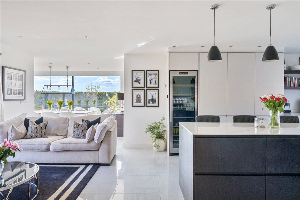 Opposite being a more informal family area, in turn leading through to a dining room with floor to ceiling glass panels overlooking the garden. Off the dining room is a fitted utility room and a downstairs W.C. This side of the house forms an excellent entertaining space, overlooking and opening onto the garden, creating a superb summer party area.