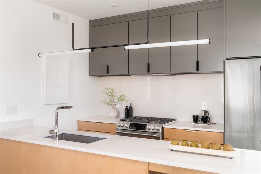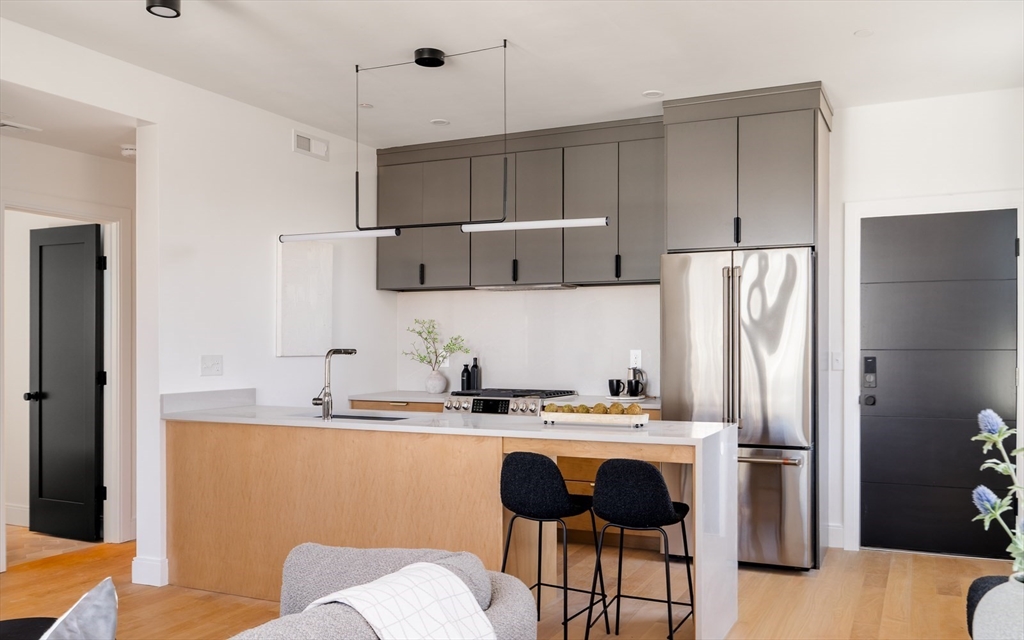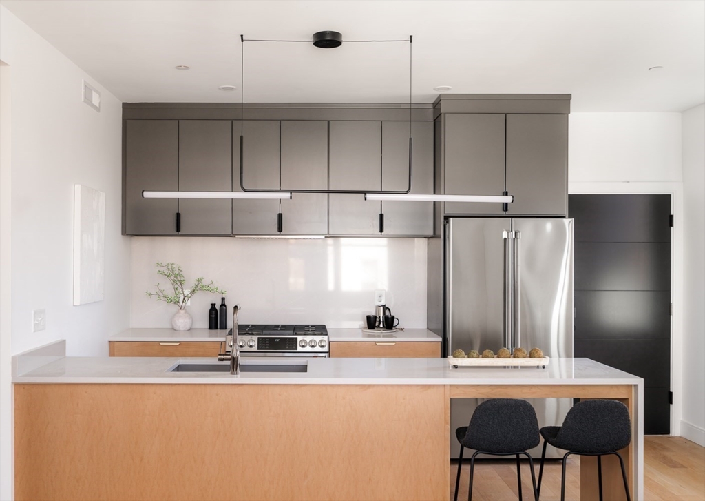 Experience elevated city living in this meticulously designed top-floor new construction 2-bed, 1-bath home in the heart of Somerville. A sun-filled open layout flows into a designer kitchen with GE Caf appliances, gas range with double oven and air fryer, built-in microwave, and custom cabinetry. High-end finishes include Grohe fixtures and curated materials throughout. Spacious bedrooms offer comfort and flexibility. Mitsubishi Hyper Heat ensures year-round efficiency. Enjoy a private roof deck with sweeping Boston skyline views, perfect for entertaining or relaxing. Smart features include face and palm recognition entry. Ideally located near Union and Inman Squares, transit, and top dining, this turnkey home offers modern luxury in a vibrant neighborhood. Bike storage also available.