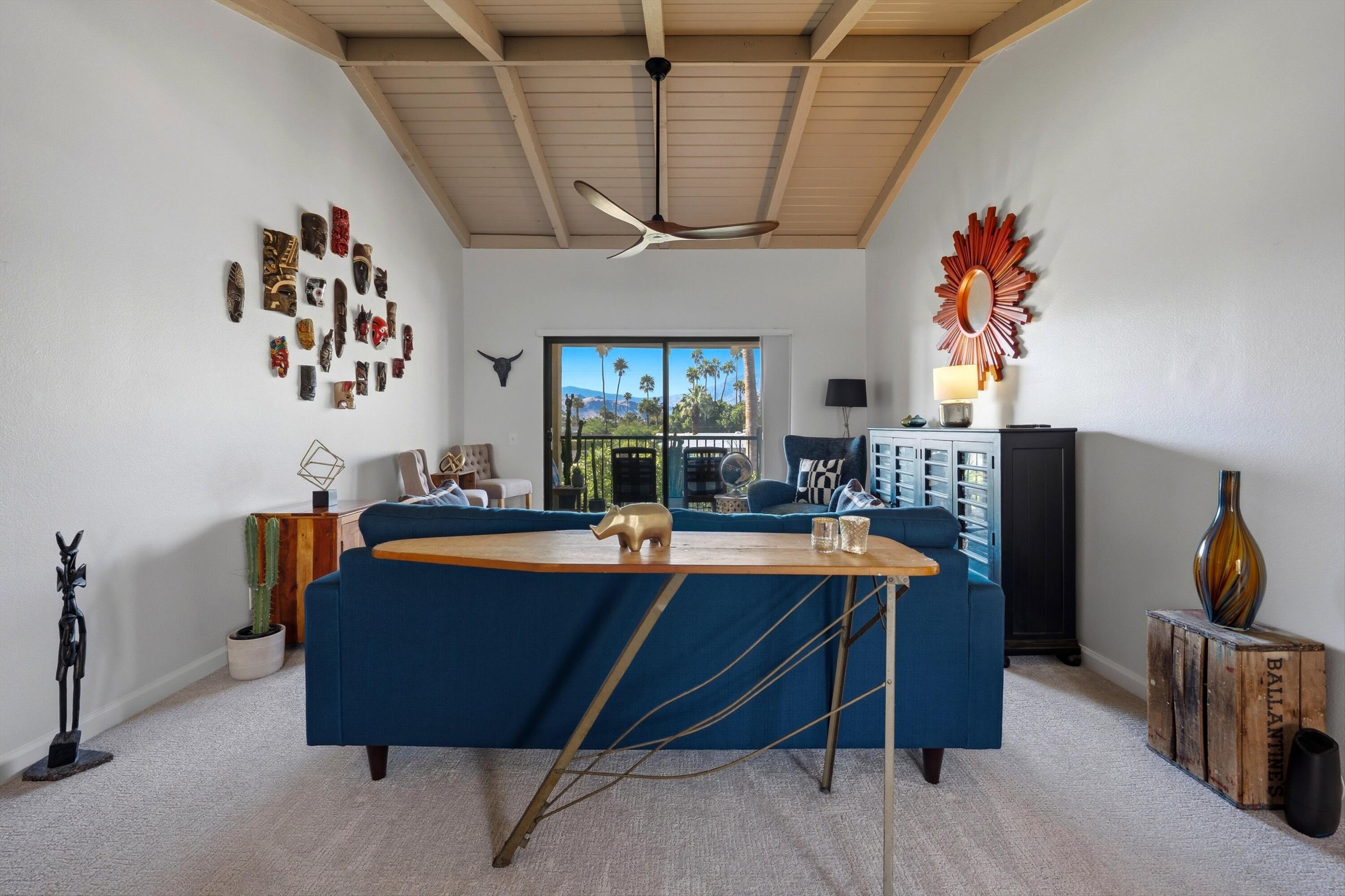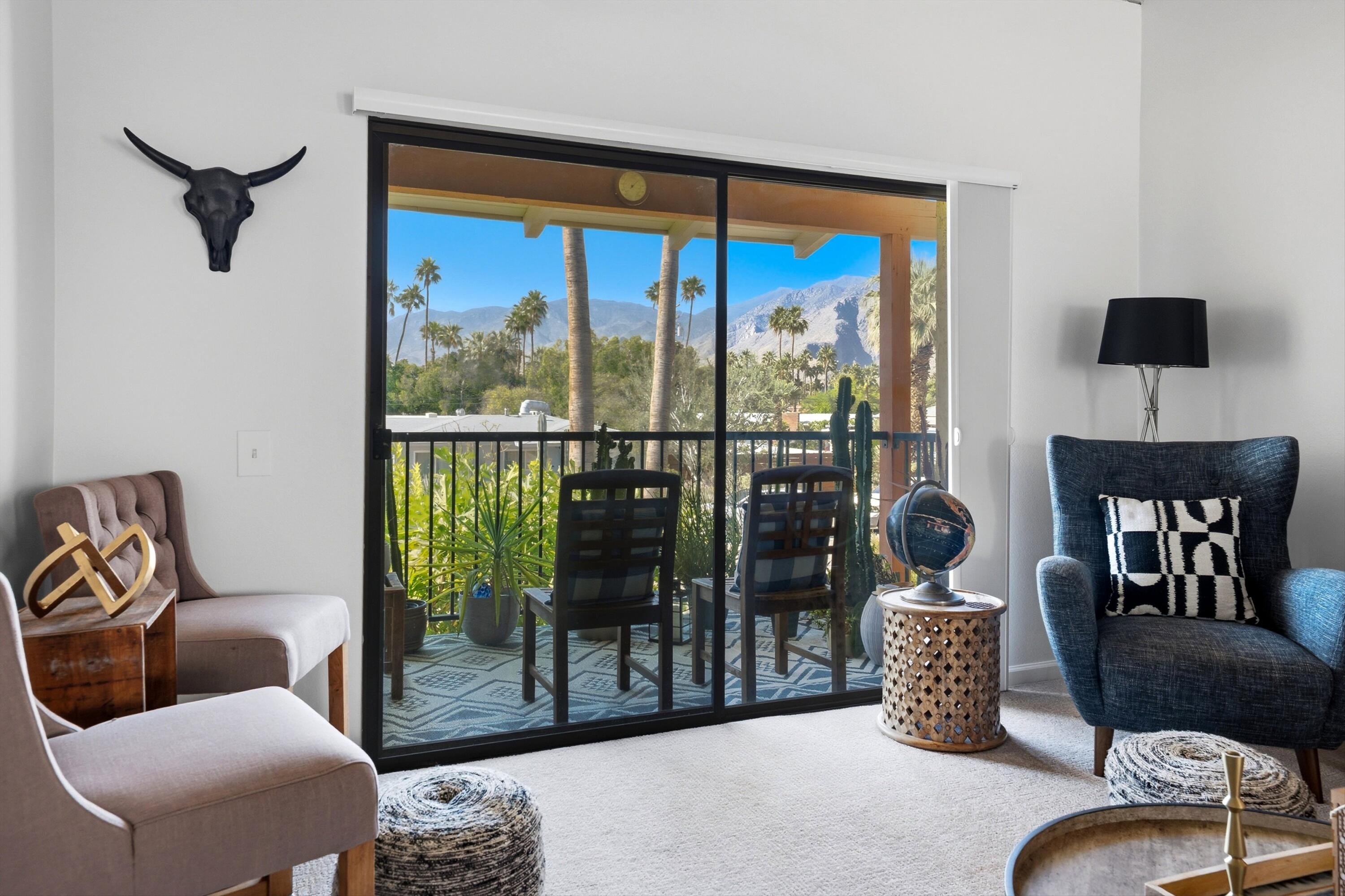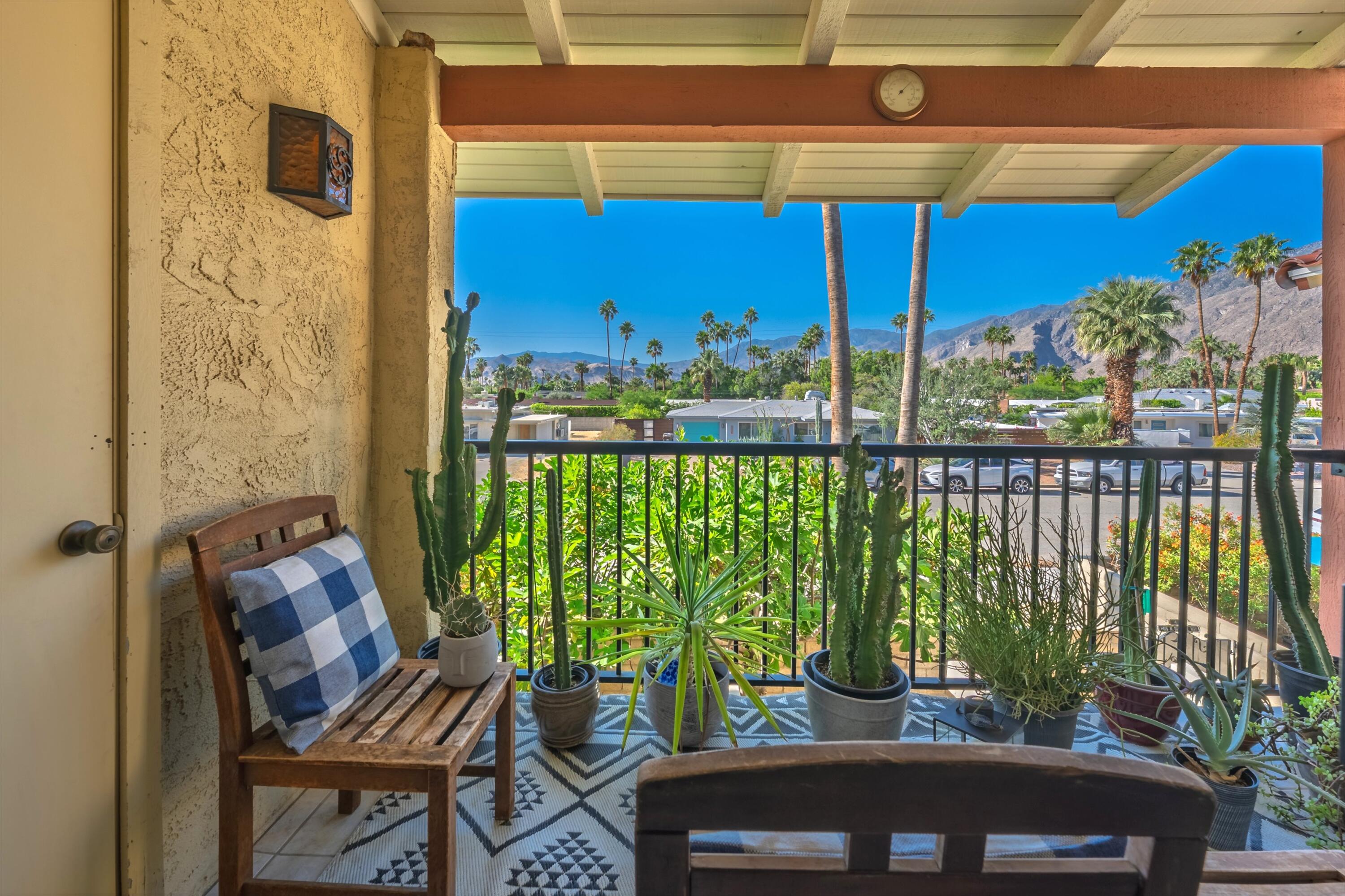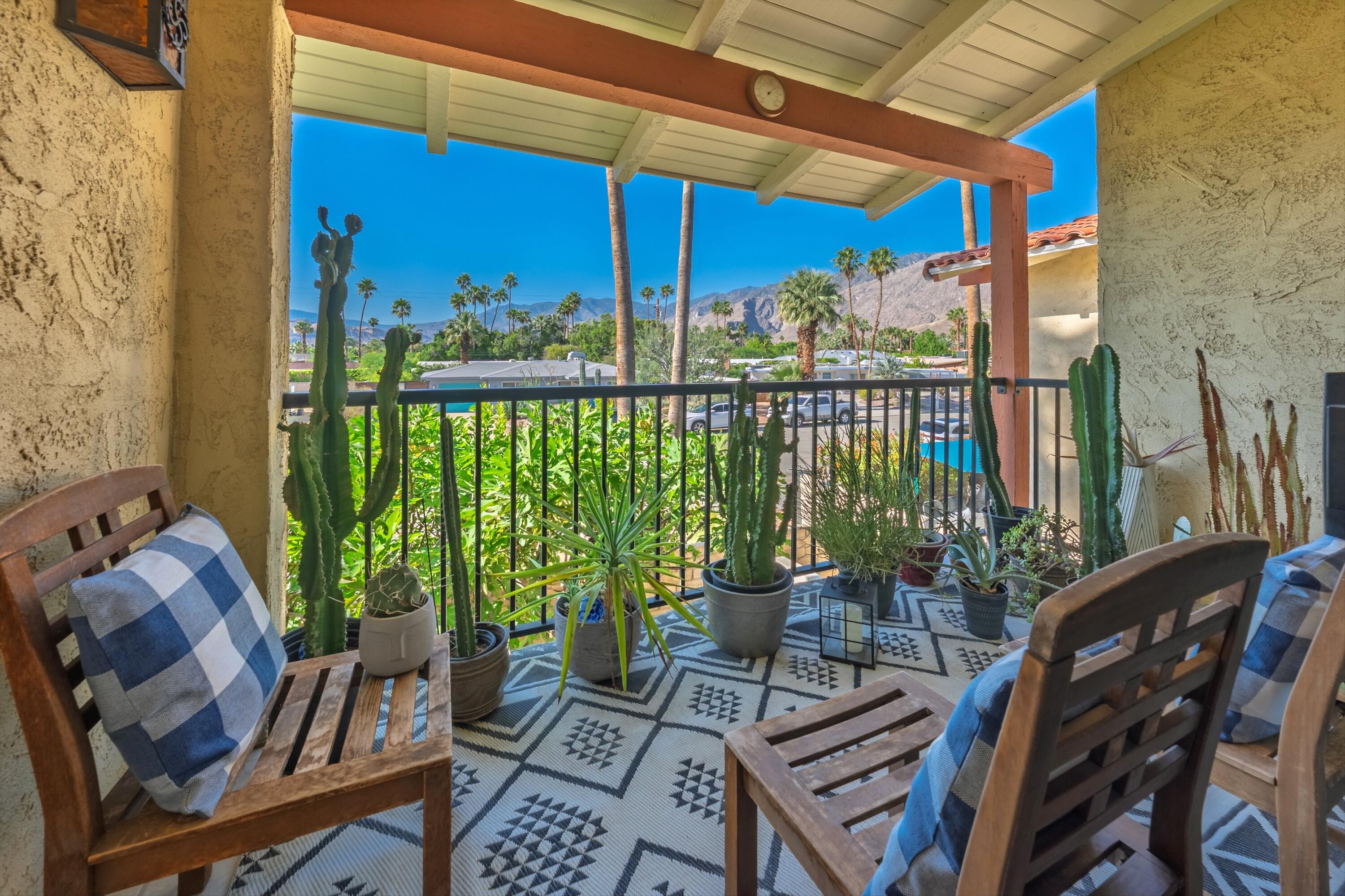 Views, location, and you own the land! Welcome to this beautifully updated upper level residence in the highly desirable and short term rental friendly gated community of Ranch Club Estados. Though the address is on Sunrise, this home is thoughtfully situated to face Chia Road, a peaceful and private street that provides a quiet, low traffic setting, in a highly sought after location. This charming one bedroom, one bath condo lives larger than expected. The light filled living room features vaulted ceilings with exposed wood beams, enhancing the space and architectural character. Enjoy unobstructed breathtaking180 degree mountain views of Mt. San Jacinto and the Santa Rosa Mountains from most windows. With south facing windows and doors, the home is bathed in natural light, while the large covered patio provides shade and protection, creating a seamless indoor/ outdoor flow without direct sun exposure. The interior has been thoughtfully upgraded with a cohesive, neutral palette, for timeless appeal. Recent improvements include quartz countertops throughout, premium flooring, updated stainless steel appliances, and elegant subway tile backsplashes in both the kitchen and bath. Additional enhancements include a newer HVAC system (2024) with duct cleaning, freshly painted interior, upgraded dimmable lighting, designer ceiling fans, modern fixtures, and energy efficient blackout window coverings. Ranch Club Estados offers true resort style living, with multiple pools and spas, tennis and pickleball courts, a clubhouse, fitness center, shuffleboard, bocce ball, and beautifully manicured grounds. This unit includes gated, covered garage parking with storage, along with ample guest parking. Centrally located on the edge of the iconic Movie Colony, you'll enjoy convenient access to nearby grocery stores, shopping, and dining, with Downtown Palm Springs just minutes away. Whether you're seeking a full time residence, weekend retreat, or investment opportunity, this is a rare opportunity to own a move in ready home with exceptional views, in one of Palm Springs' most desirable locations.
