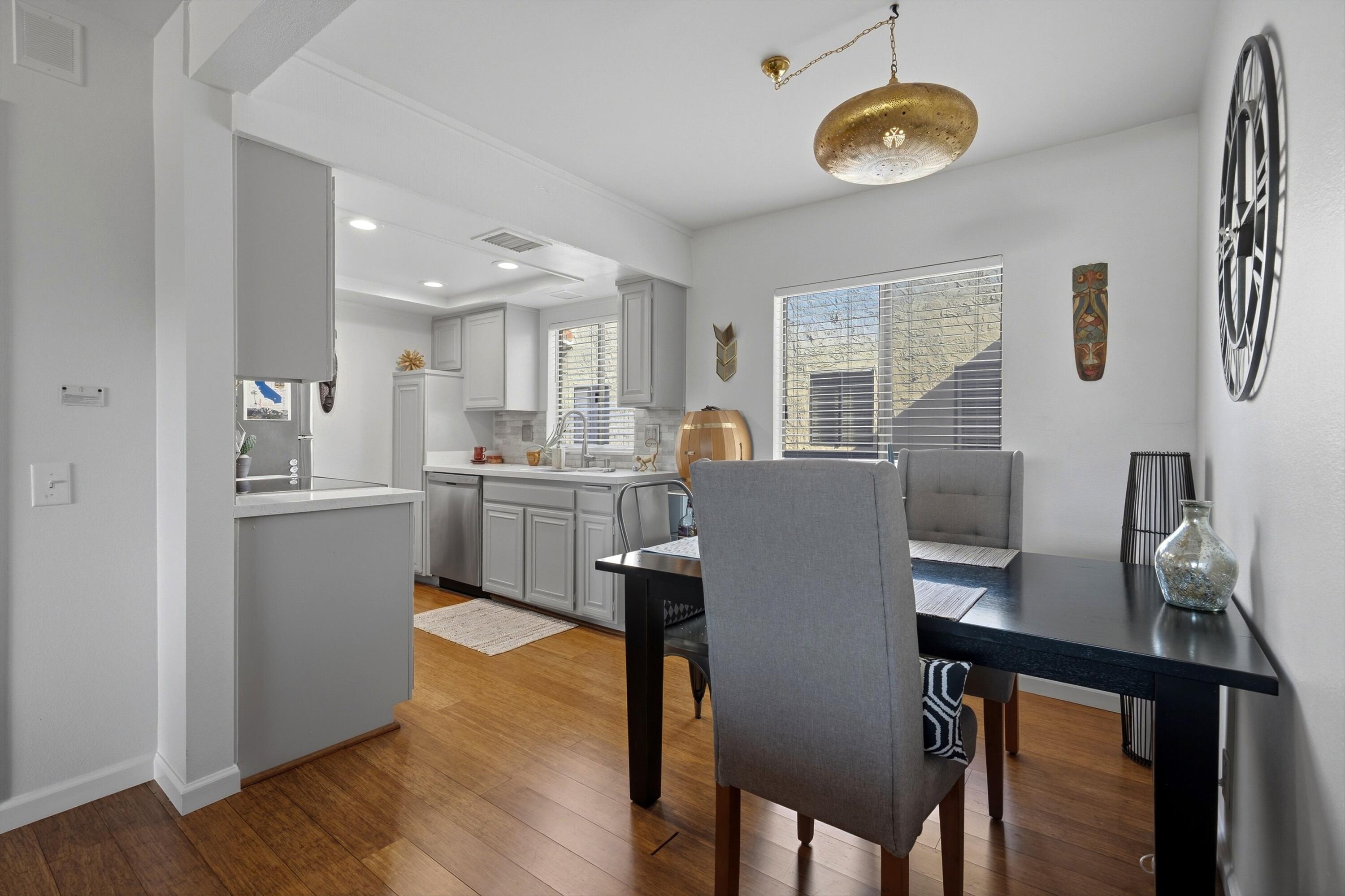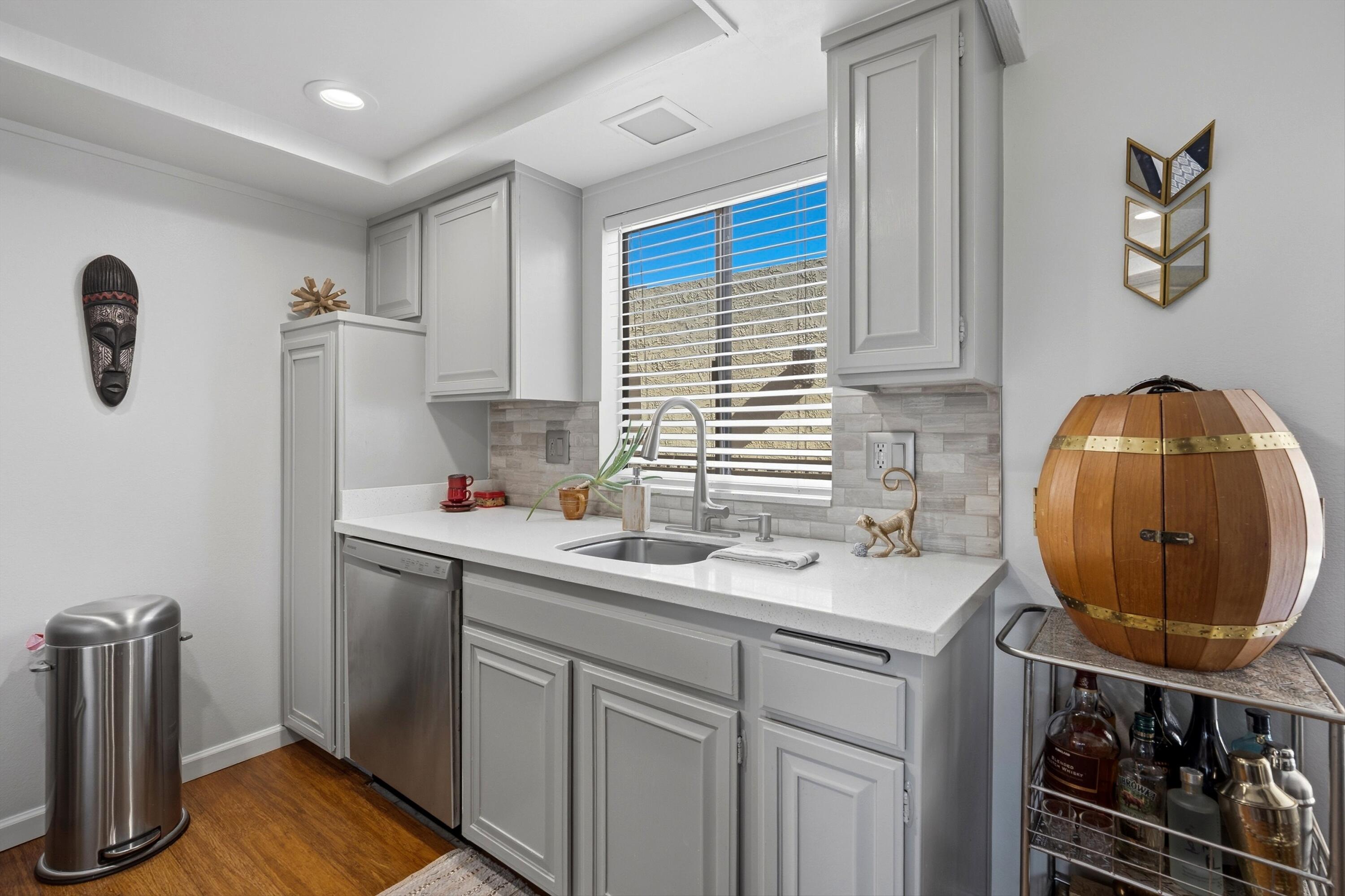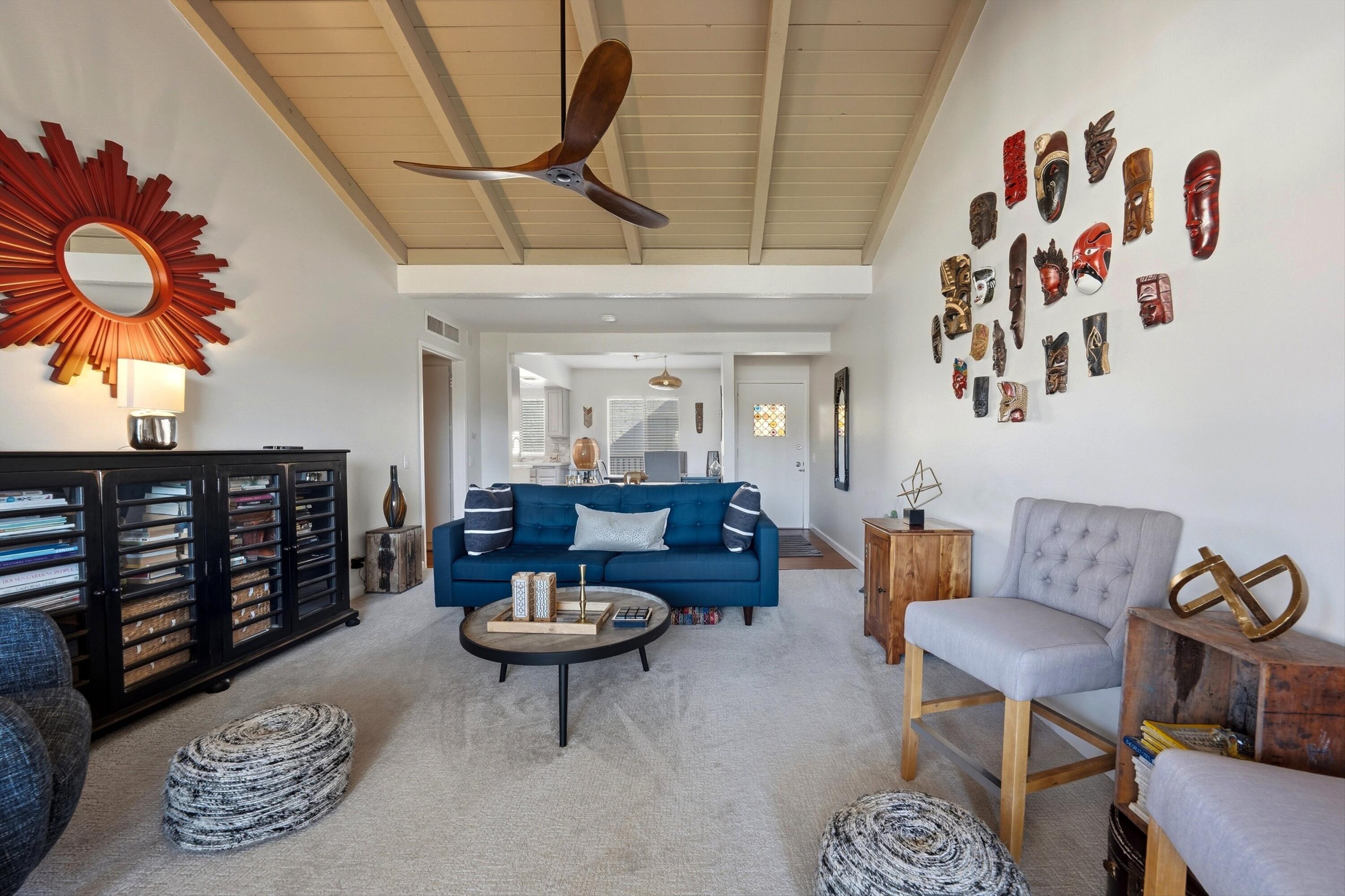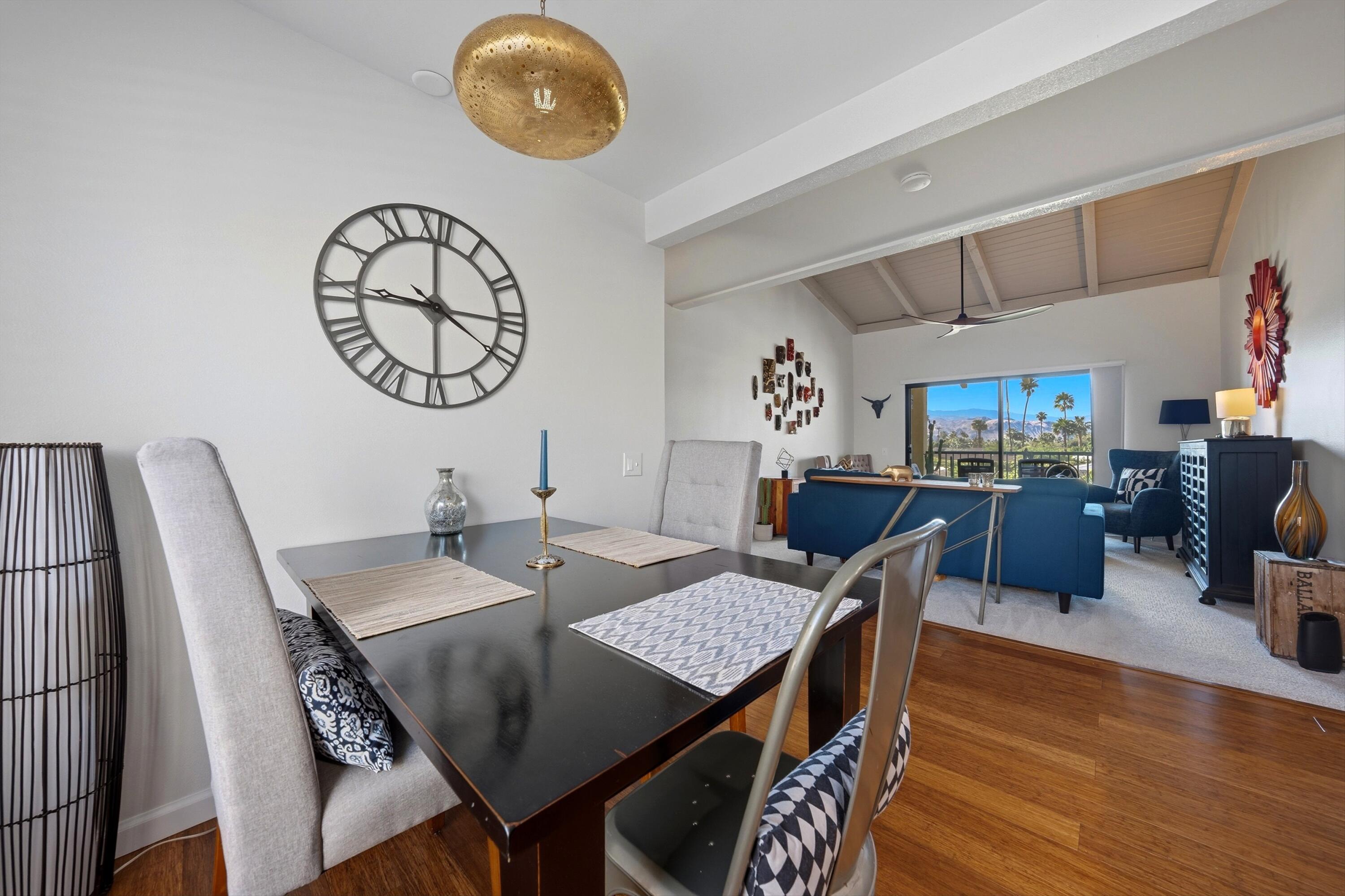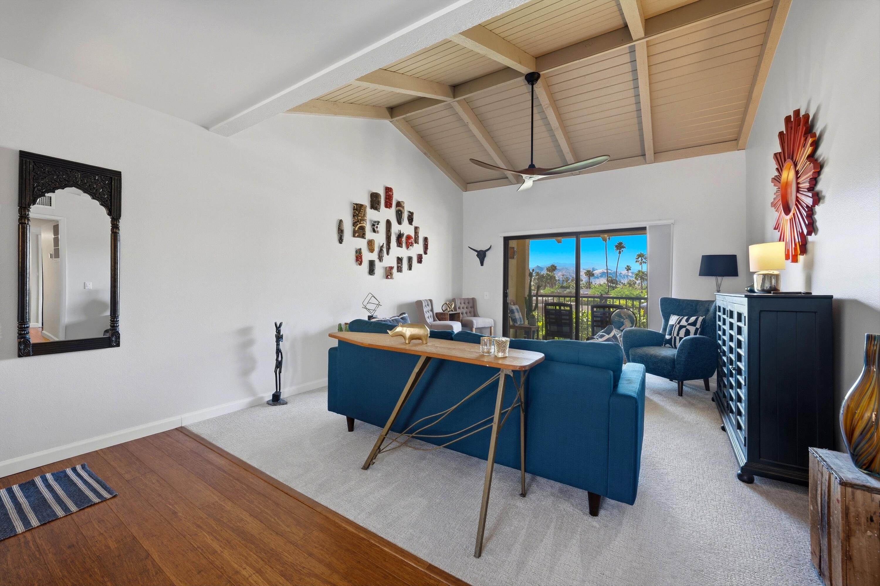 Views, location, and you own the land! Welcome to this beautifully updated upper level residence in the highly desirable and short term rental friendly gated community of Ranch Club Estados. Though the address is on Sunrise, this home is thoughtfully situated to face Chia Road, a peaceful and private street that provides a quiet, low traffic setting, in a highly sought after location. This charming one bedroom, one bath condo lives larger than expected. The light filled living room features vaulted ceilings with exposed wood beams, enhancing the space and architectural character. Enjoy unobstructed breathtaking180 degree mountain views of Mt. San Jacinto and the Santa Rosa Mountains from most windows. With south facing windows and doors, the home is bathed in natural light, while the large covered patio provides shade and protection, creating a seamless indoor/ outdoor flow without direct sun exposure. The interior has been thoughtfully upgraded with a cohesive, neutral palette, for timeless appeal. Recent improvements include quartz countertops throughout, premium flooring, updated stainless steel appliances, and elegant subway tile backsplashes in both the kitchen and bath. Additional enhancements include a newer HVAC system (2024) with duct cleaning, freshly painted interior, upgraded dimmable lighting, designer ceiling fans, modern fixtures, and energy efficient blackout window coverings. Ranch Club Estados offers true resort style living, with multiple pools and spas, tennis and pickleball courts, a clubhouse, fitness center, shuffleboard, bocce ball, and beautifully manicured grounds. This unit includes gated, covered garage parking with storage, along with ample guest parking. Centrally located on the edge of the iconic Movie Colony, you'll enjoy convenient access to nearby grocery stores, shopping, and dining, with Downtown Palm Springs just minutes away. Whether you're seeking a full time residence, weekend retreat, or investment opportunity, this is a rare opportunity to own a move in ready home with exceptional views, in one of Palm Springs' most desirable locations.