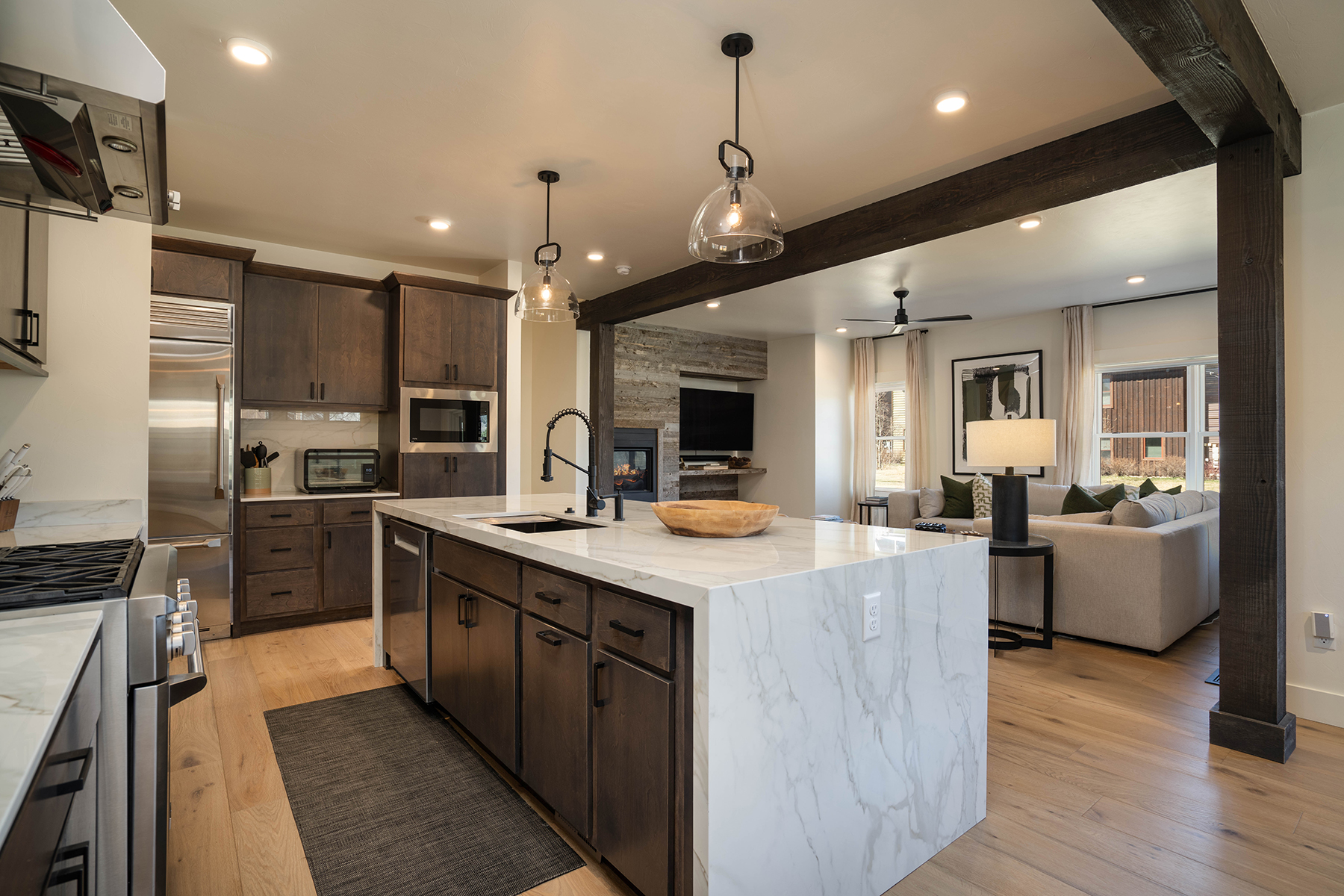 The main level welcomes with an open-concept chef's kitchen, dining area, and living room anchored by a gas fireplace. Covered outdoor patios extend the living space into the mountain air, where views of the surrounding peaks provide a constant and breathtaking backdrop. A well-appointed mudroom off the two-car garage ensures that the transition from the outdoors in is seamless.