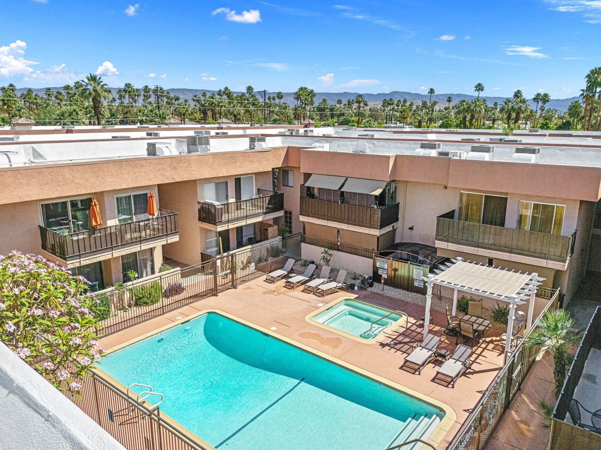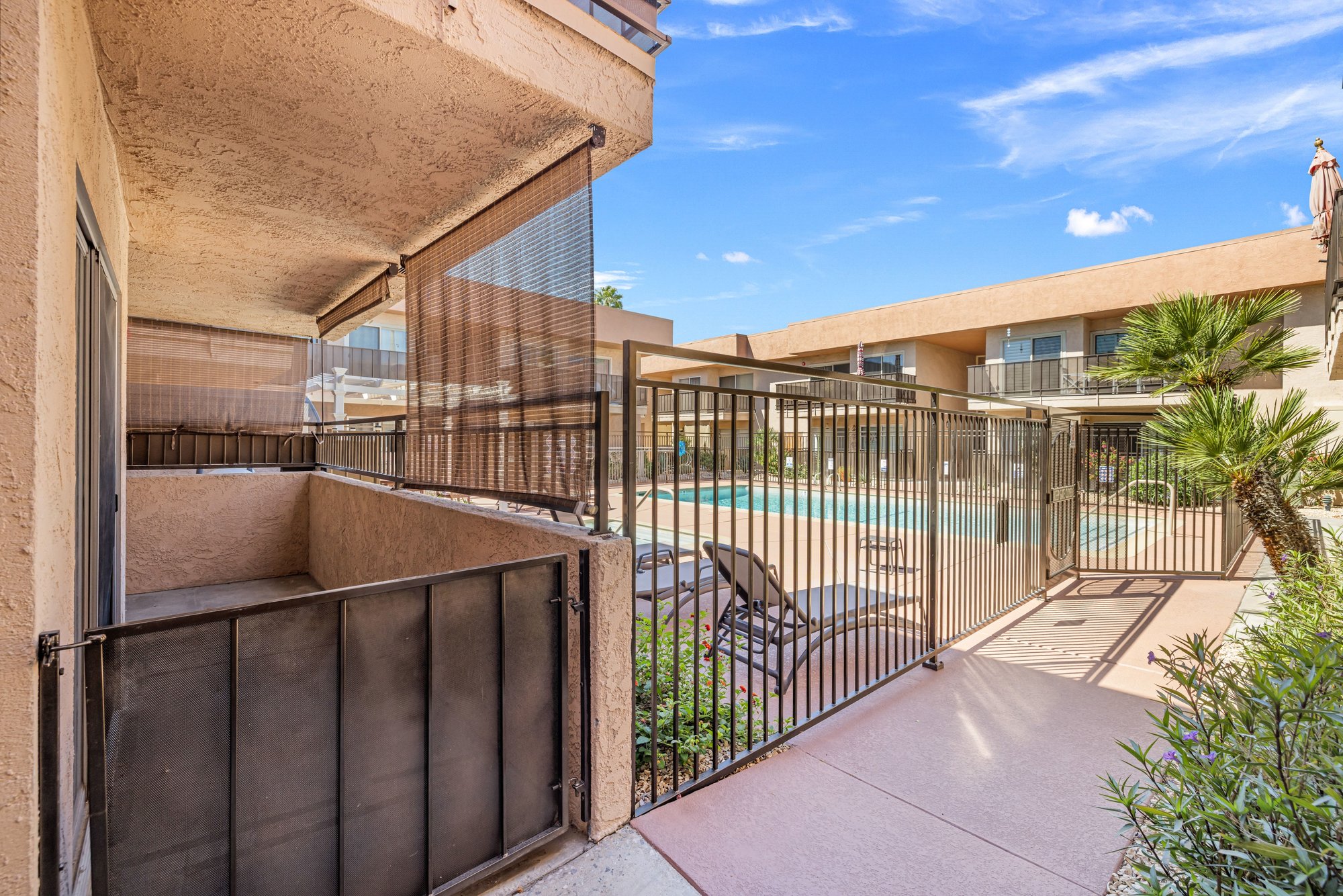 Step into your Palm Springs escape at 400 N Sunrise Way, Unit 136. This bright, ground-floor unit features sleek stone floors, in-unit laundry, and a private patio with direct, steps-away access to the community pool -- perfect for instant resort-style living. Compact and low-maintenance, it's ideally located in central Palm Springs close to dining, shopping, and iconic mid-century attractions. Enjoy shared common areas including landscaped courtyards, outdoor seating and entertaining spaces, and convenient pathways to the pool. Ready to enjoy as a vacation retreat or full-time home.