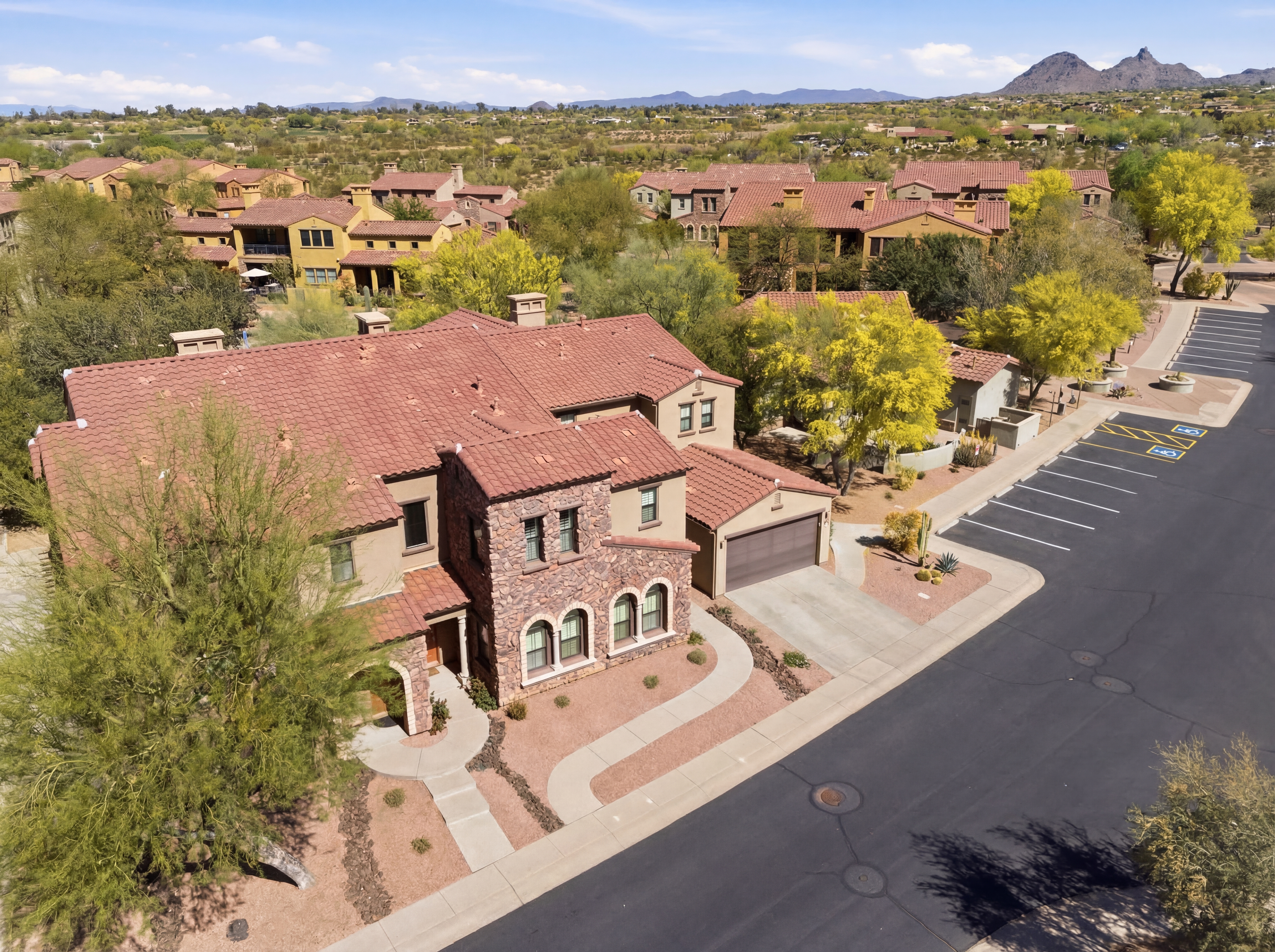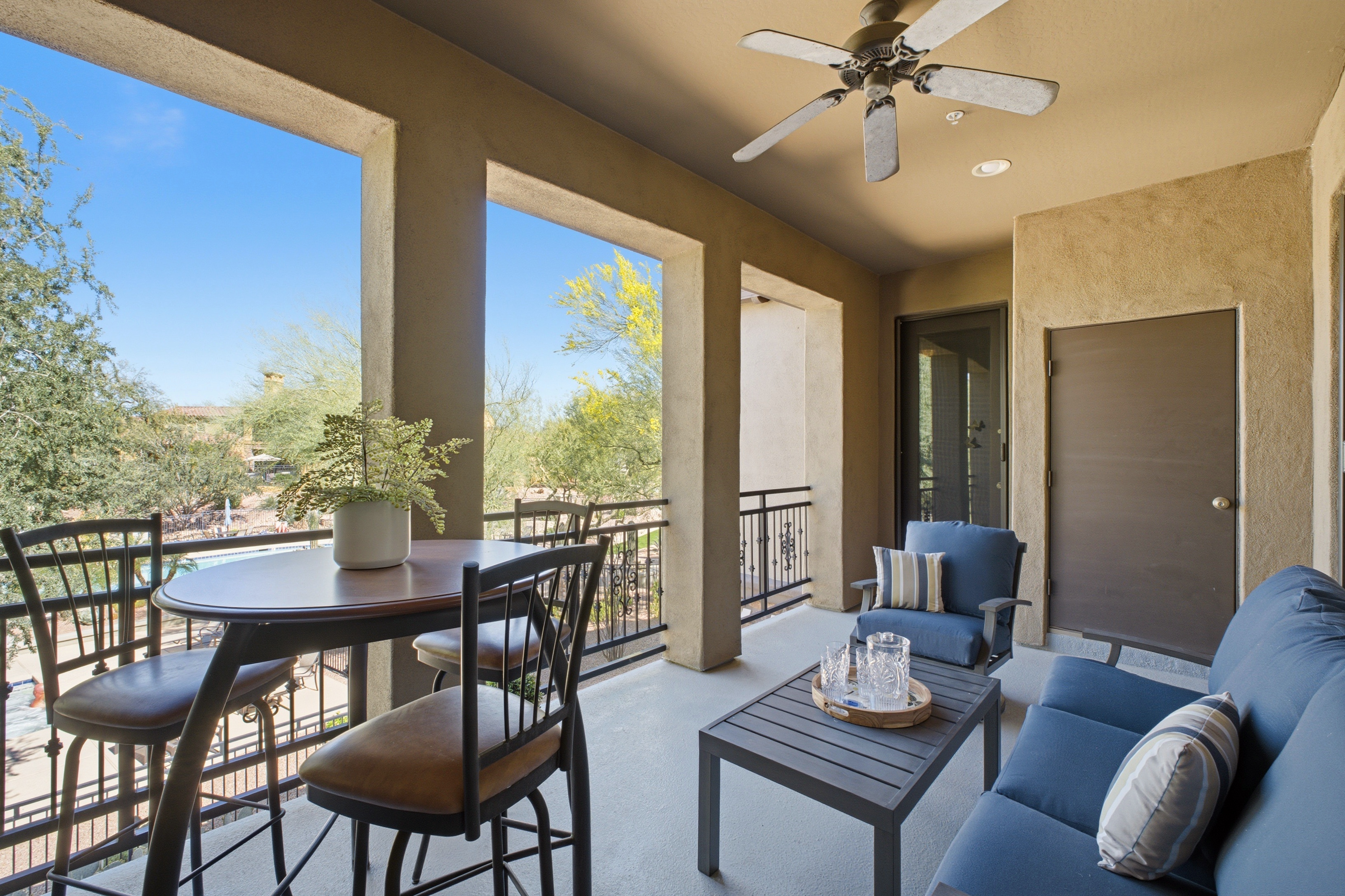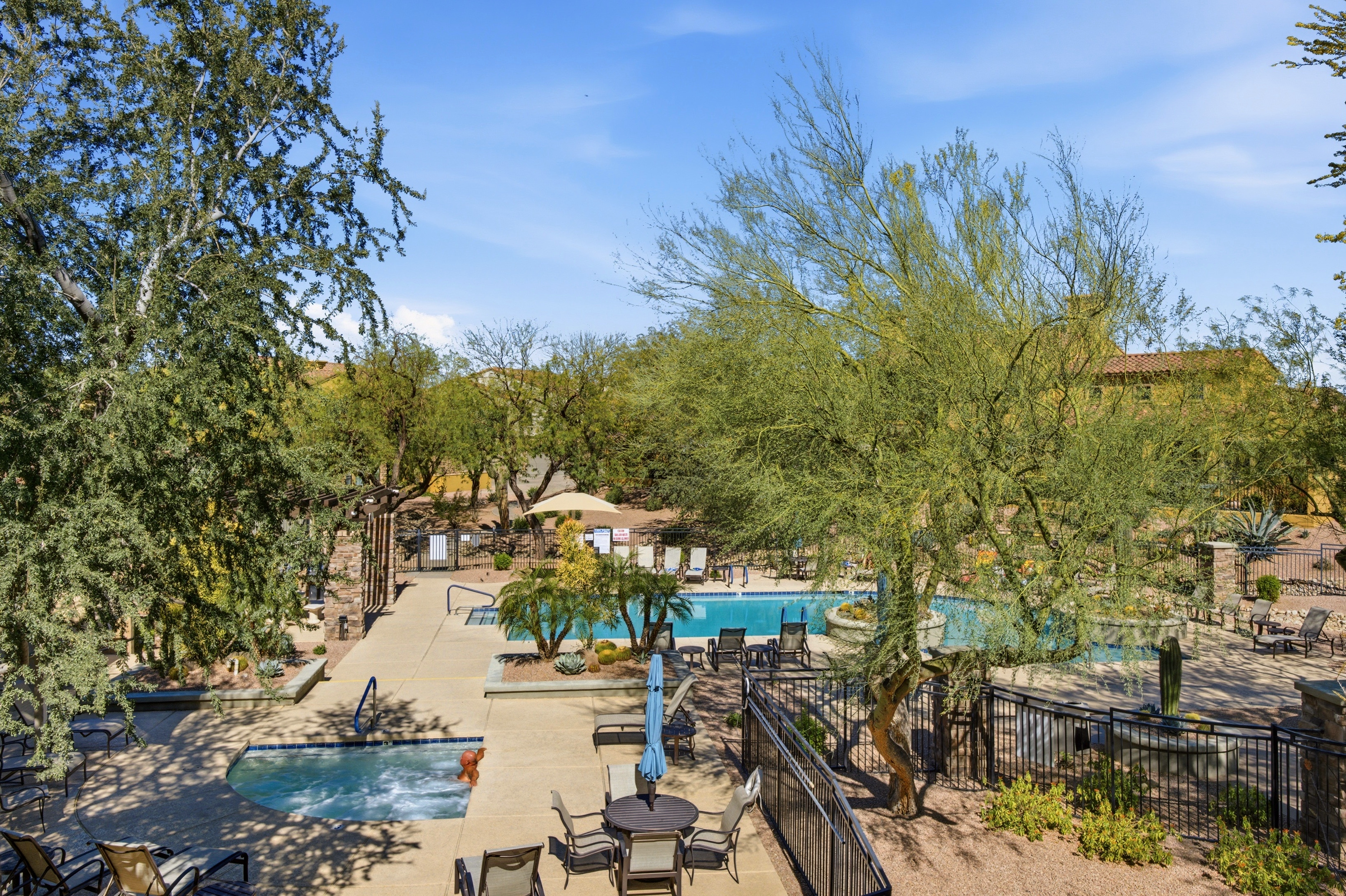 Nestled comfortably within the gated Encore community, this townhome is a showcase of views: enjoy the full expanse of the resort-style pool oasis from the private covered patio and primary suite, while guest rooms and dining area frame the majestic McDowell Mountains. The light-filled, open layout flows perfectly for entertaining or simple enjoyment of the leisurely vibe afforded by a fun and fresh interior and scenic beauty from every window. Easy walk to upscale boutiques at Market Street at DC Ranch or enjoy local favorites like Isabella's or MoJo's Coffee across the street. Perfectly suited as a primary residence, lock-and-leave, or high-end investment, this North Scottsdale home blends leisure and comfort with easy proximity to Loop 101, Mayo Clinic, and abundant outdoor activities.