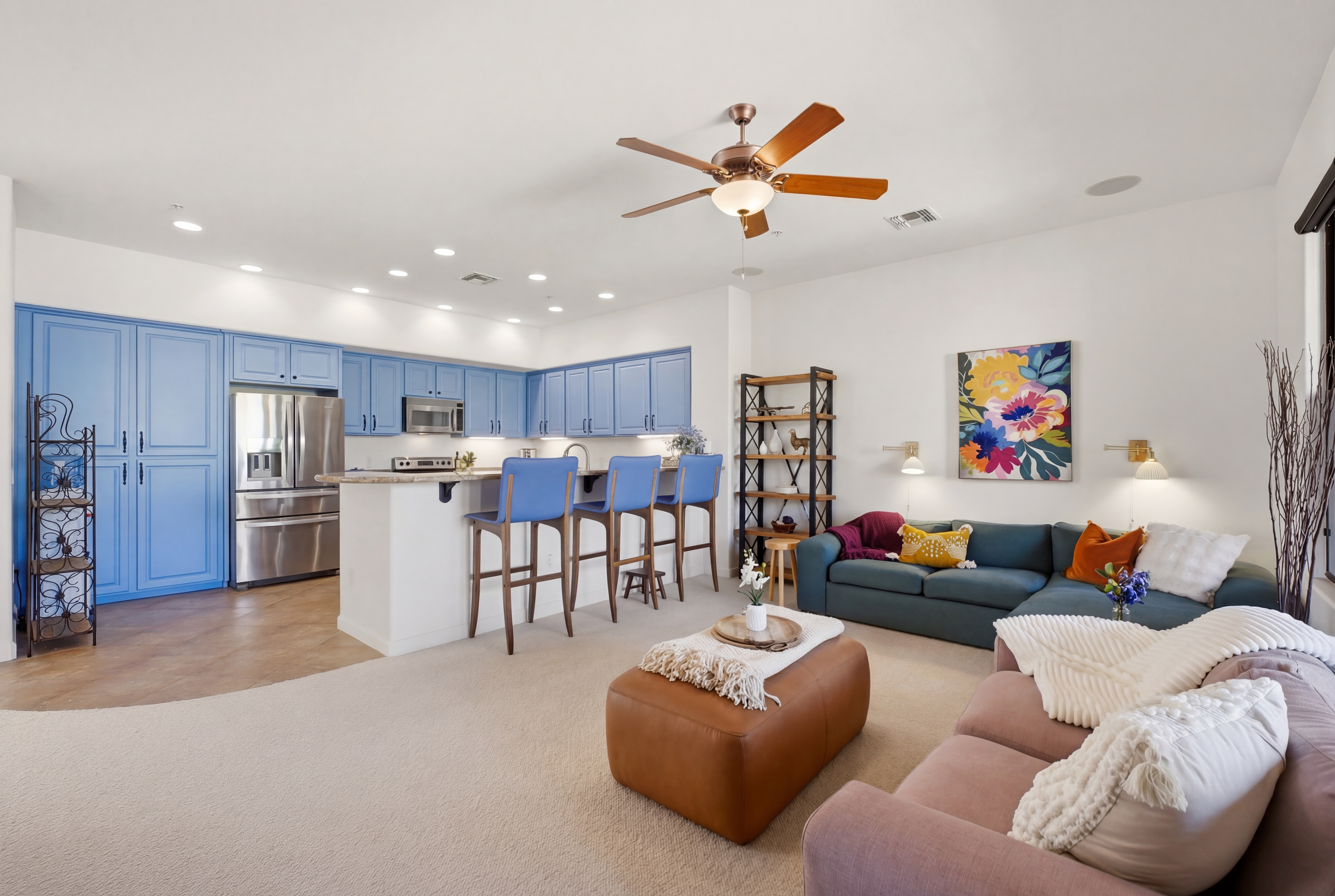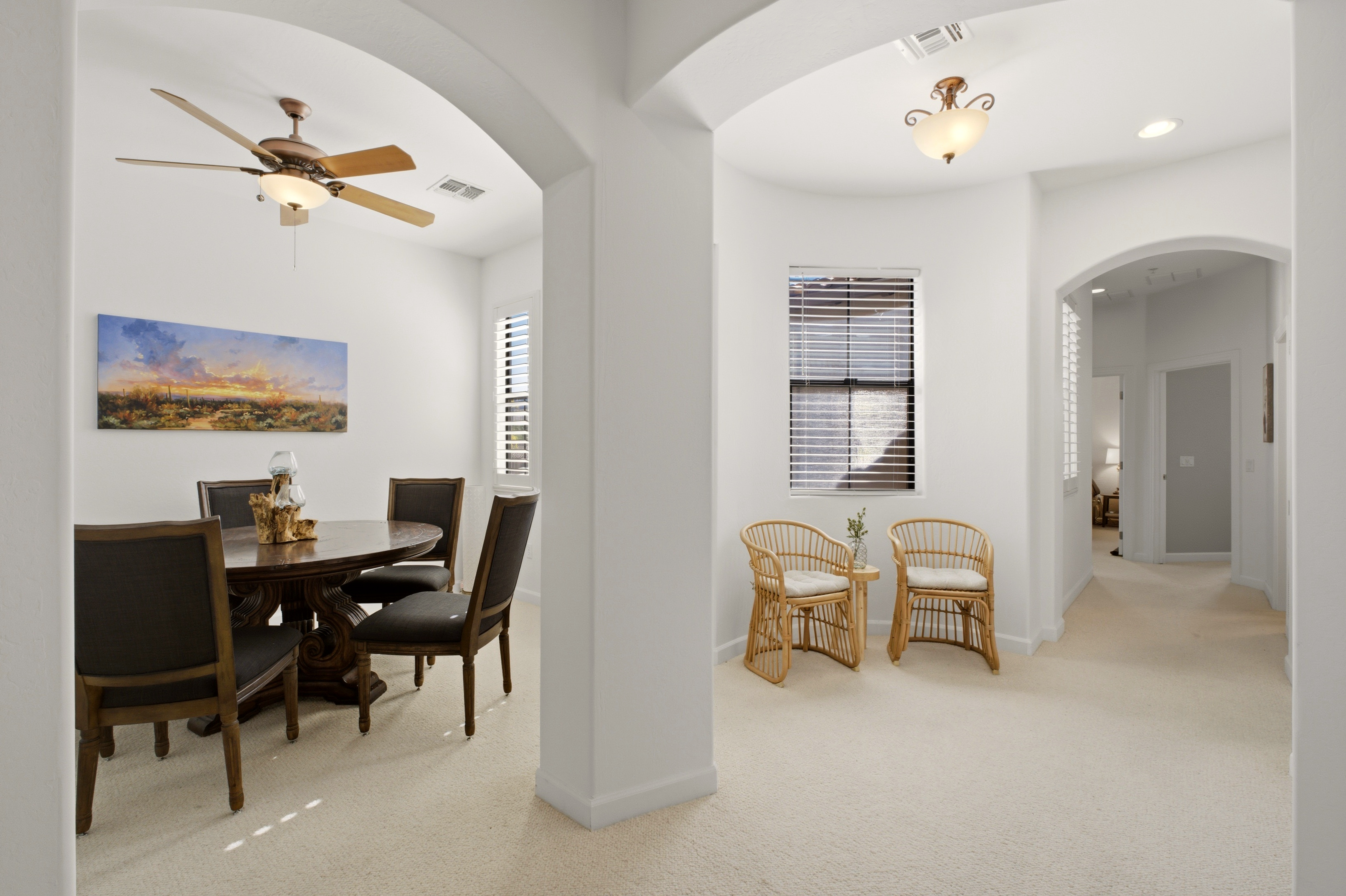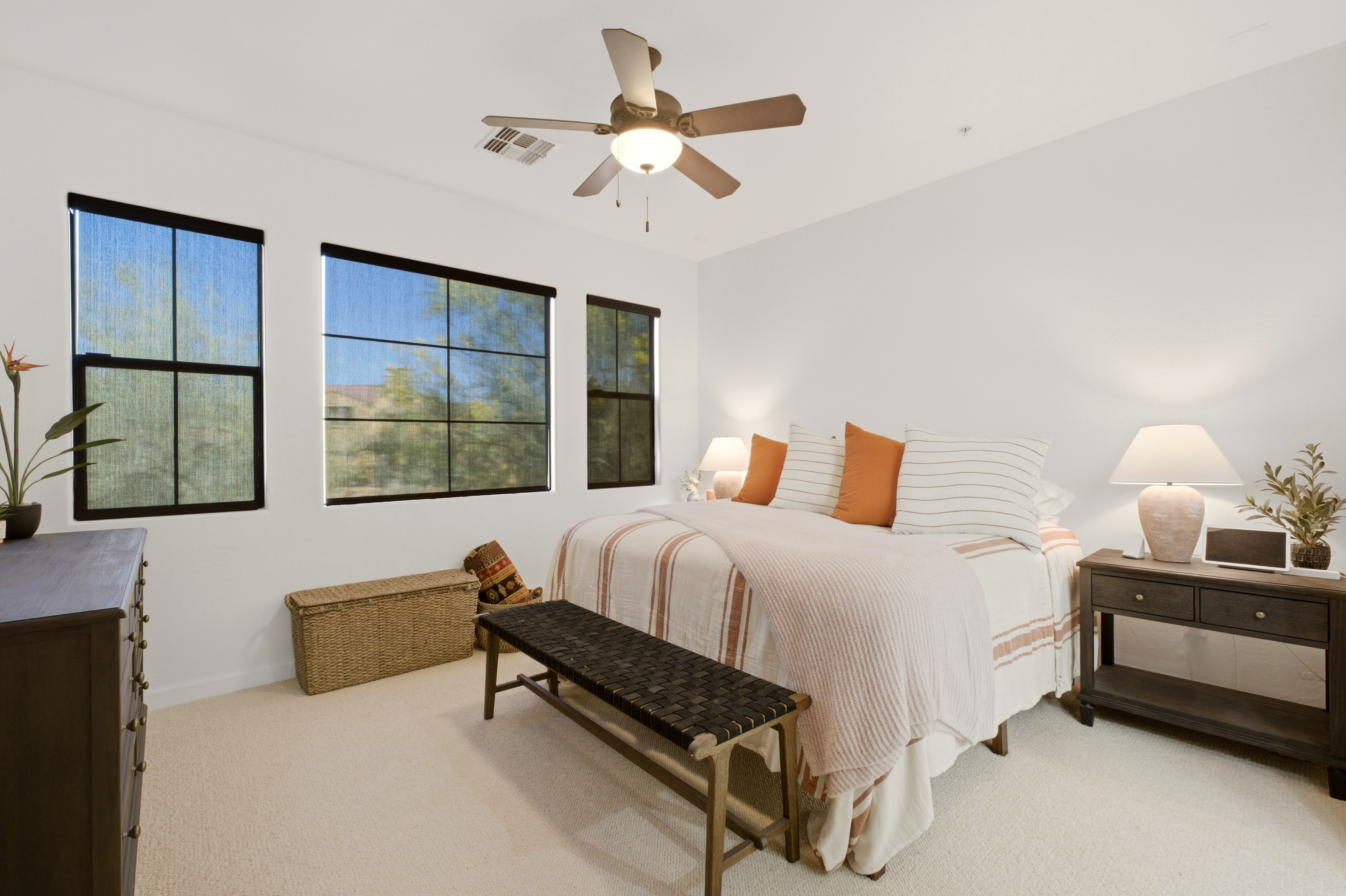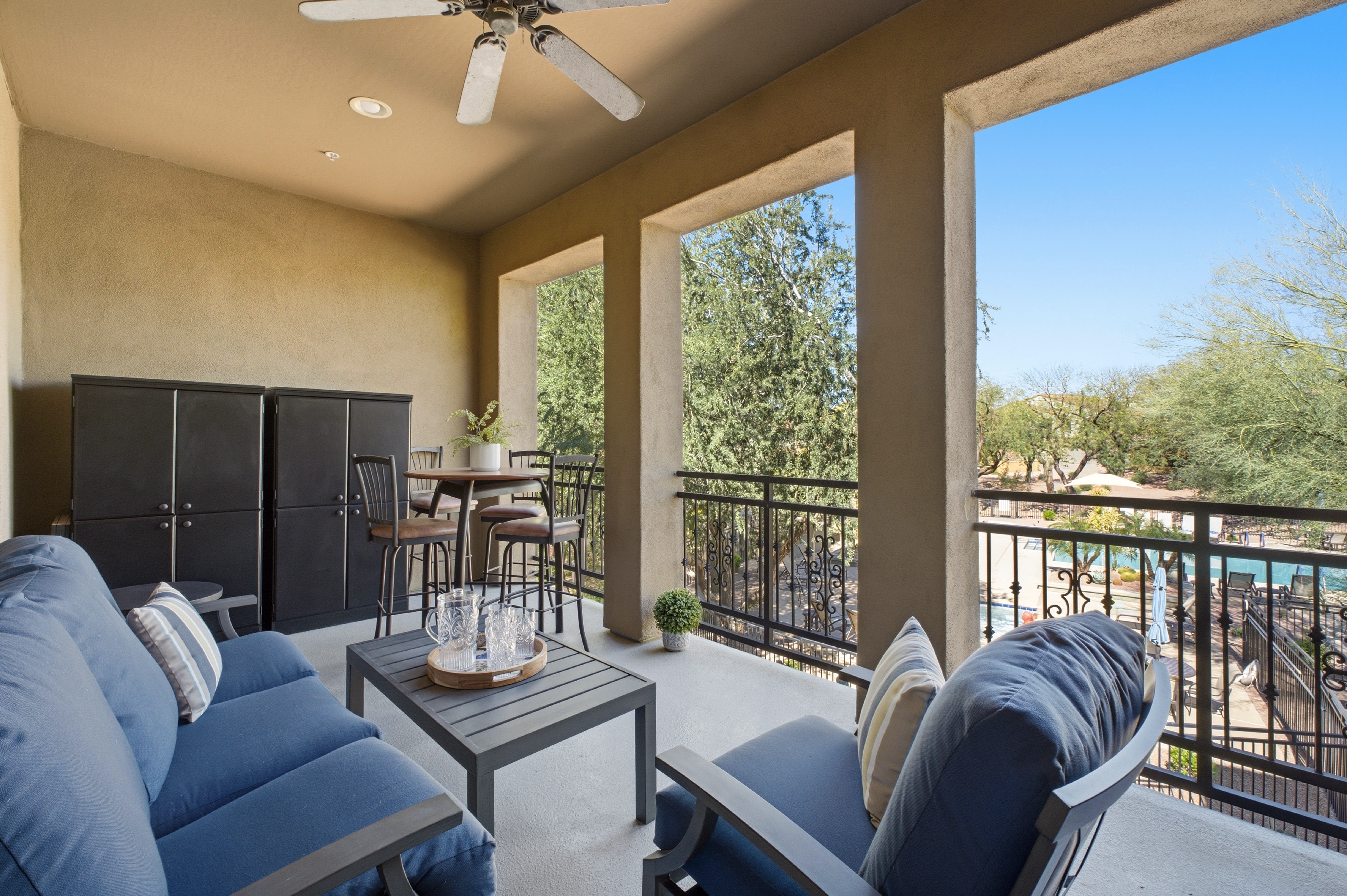 Nestled comfortably within the gated Encore community, this townhome is a showcase of views: enjoy the full expanse of the resort-style pool oasis from the private covered patio and primary suite, while guest rooms and dining area frame the majestic McDowell Mountains. The light-filled, open layout flows perfectly for entertaining or simple enjoyment of the leisurely vibe afforded by a fun and fresh interior and scenic beauty from every window. Easy walk to upscale boutiques at Market Street at DC Ranch or enjoy local favorites like Isabella's or MoJo's Coffee across the street. Perfectly suited as a primary residence, lock-and-leave, or high-end investment, this North Scottsdale home blends leisure and comfort with easy proximity to Loop 101, Mayo Clinic, and abundant outdoor activities.