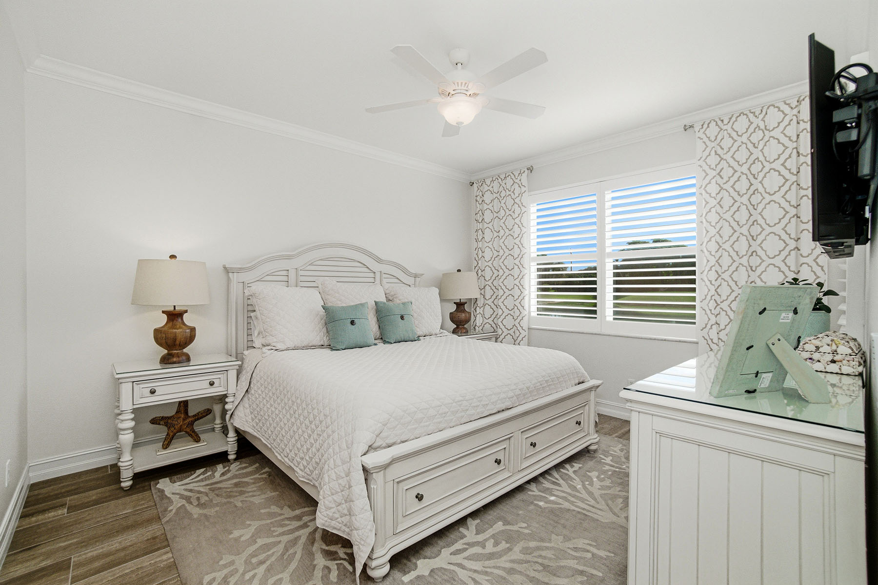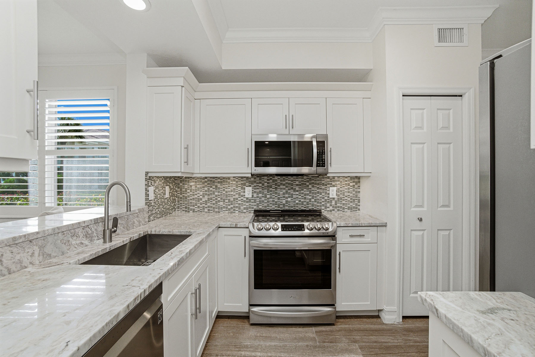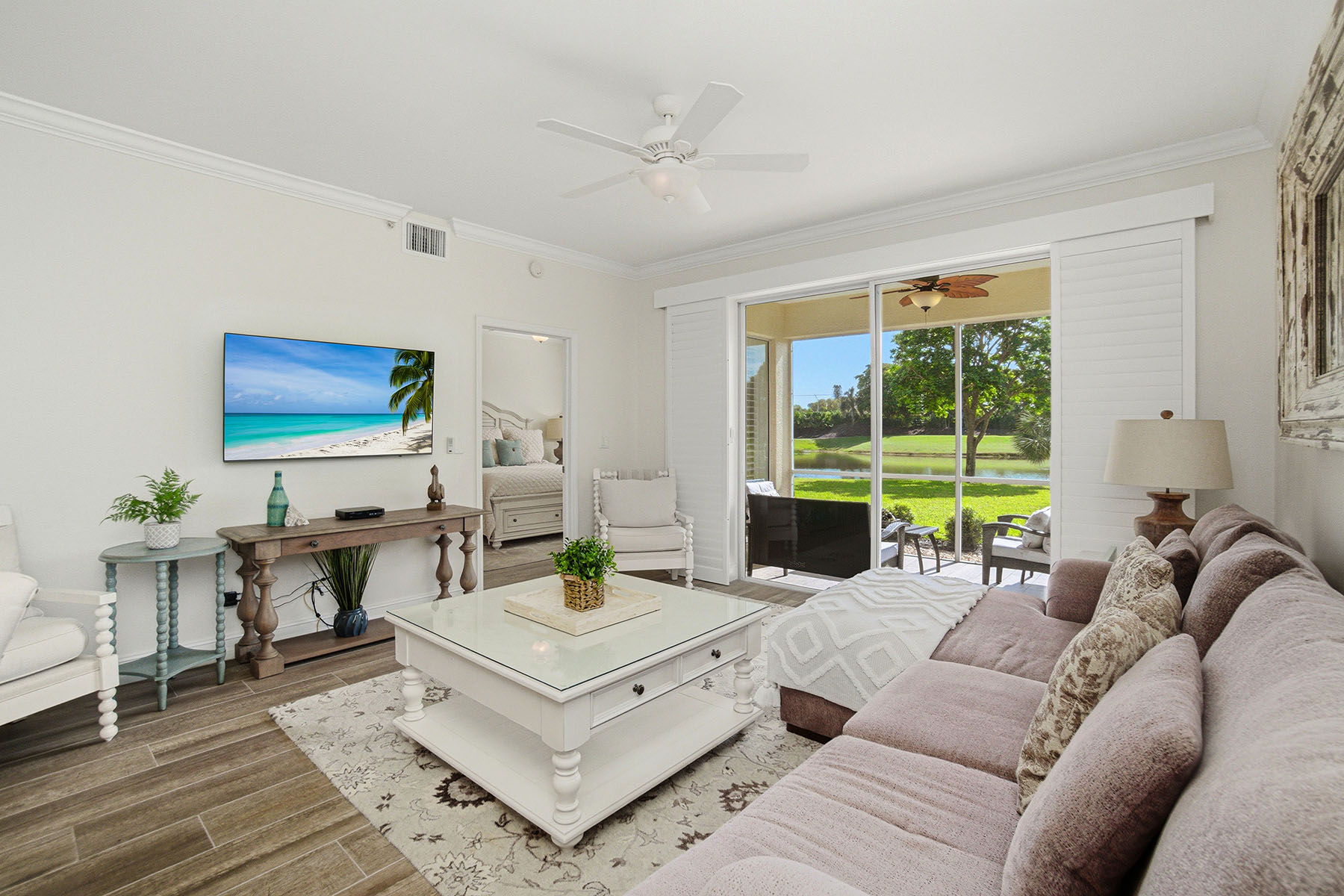 First-floor end unit offered turnkey with gorgeous golf course views and a thoughtfully updated interior throughout. The thoughtful layout features wood-look tile flooring, plantation shutters and crown molding, creating a clean, cohesive feel. The updated kitchen includes quartz countertops, soft-close cabinetry, stainless steel appliances, a large farmhouse sink and a functional bar-top opening to the main living area. A separate breakfast nook with bay windows and plantation shutters adds additional dining space. The primary suite is spacious and bright, with a large window overlooking the golf course and private access to the lanai. It includes dual walk-in closets with built-in cabinetry and an updated bath featuring quartz countertops, dual sinks, soft-close cabinets, a walk-in shower with bench and multiple shower heads, and a separate water closet. The secondary bedroom is privately positioned and offers a large walk-in closet with built-ins and plantation shutters. The adjacent bath is updated with quartz countertops, soft-close drawers, a bathtub and a walk-in shower with multiple shower heads. The lanai provides a private outdoor setting with tile flooring carried through from the interior, large screens for unobstructed views, updated lighting, and a door for added access and airflow. Additional features include a private carport space, laundry closet with built-in cabinetry and updated washer/dryer. Stonebridge is a bundled golf community where ownership includes immediate golf access with no waitlist or additional membership required. Residents enjoy a recently updated clubhouse with indoor and outdoor dining, a resort-style pool and spa, fitness center, tennis courts, and an active calendar of social events and seasonal programming.