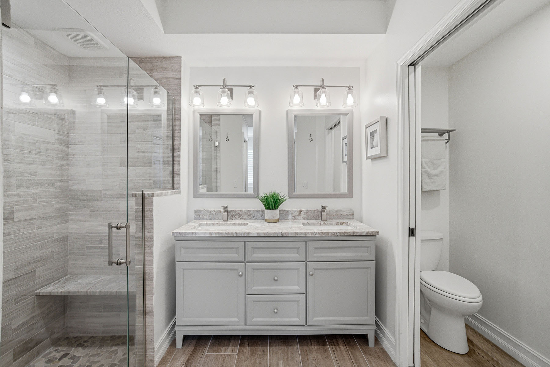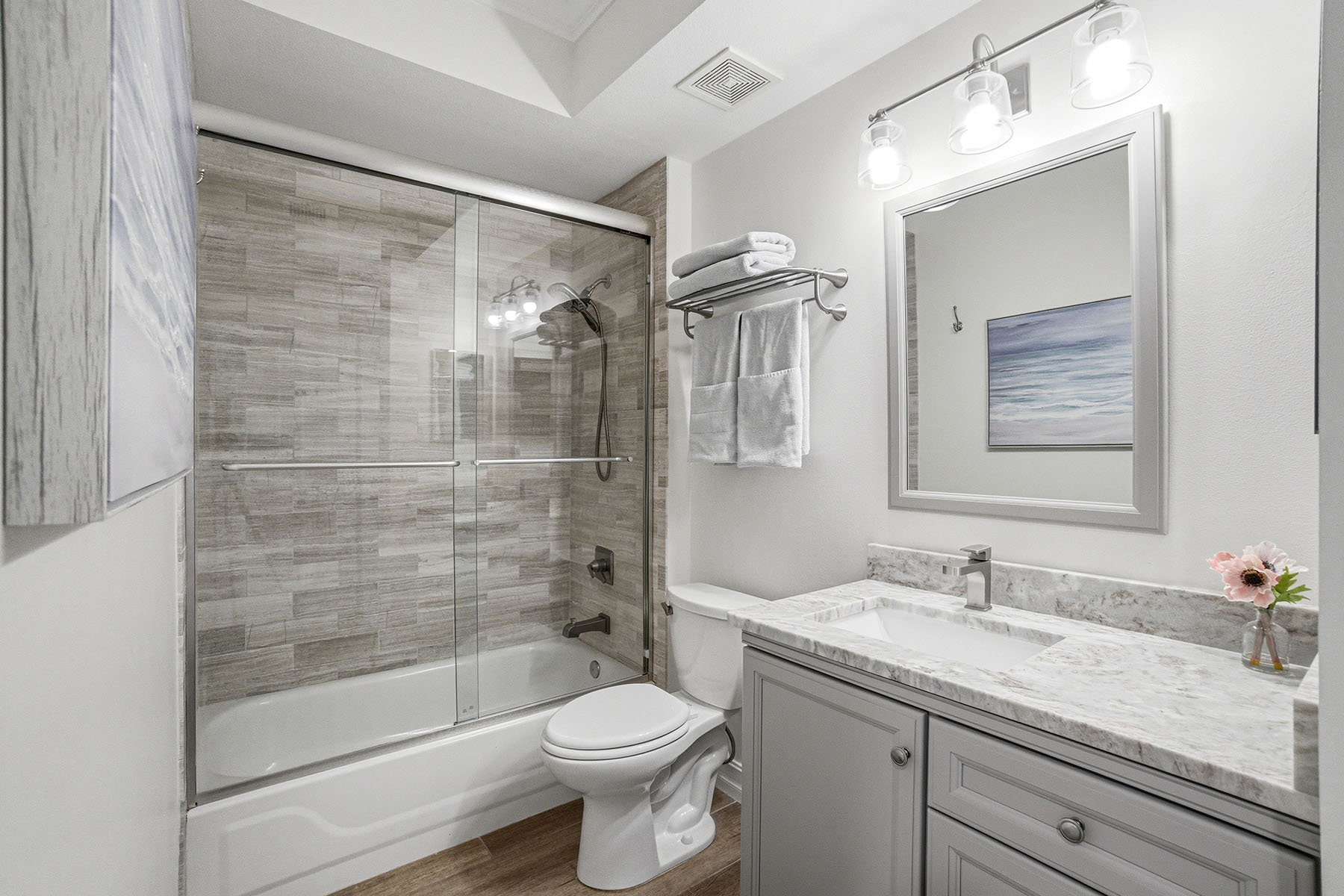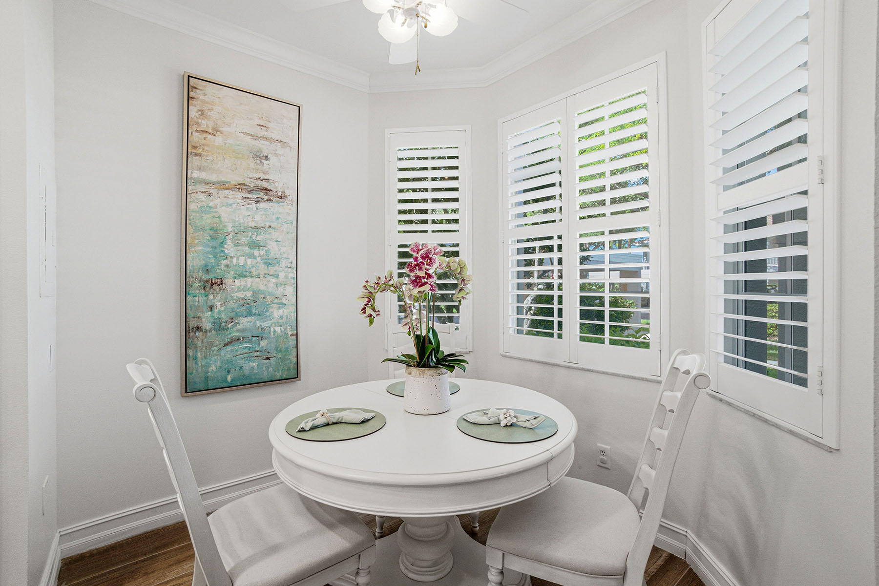 First-floor end unit offered turnkey with gorgeous golf course views and a thoughtfully updated interior throughout. The thoughtful layout features wood-look tile flooring, plantation shutters and crown molding, creating a clean, cohesive feel. The updated kitchen includes quartz countertops, soft-close cabinetry, stainless steel appliances, a large farmhouse sink and a functional bar-top opening to the main living area. A separate breakfast nook with bay windows and plantation shutters adds additional dining space. The primary suite is spacious and bright, with a large window overlooking the golf course and private access to the lanai. It includes dual walk-in closets with built-in cabinetry and an updated bath featuring quartz countertops, dual sinks, soft-close cabinets, a walk-in shower with bench and multiple shower heads, and a separate water closet. The secondary bedroom is privately positioned and offers a large walk-in closet with built-ins and plantation shutters. The adjacent bath is updated with quartz countertops, soft-close drawers, a bathtub and a walk-in shower with multiple shower heads. The lanai provides a private outdoor setting with tile flooring carried through from the interior, large screens for unobstructed views, updated lighting, and a door for added access and airflow. Additional features include a private carport space, laundry closet with built-in cabinetry and updated washer/dryer. Stonebridge is a bundled golf community where ownership includes immediate golf access with no waitlist or additional membership required. Residents enjoy a recently updated clubhouse with indoor and outdoor dining, a resort-style pool and spa, fitness center, tennis courts, and an active calendar of social events and seasonal programming.