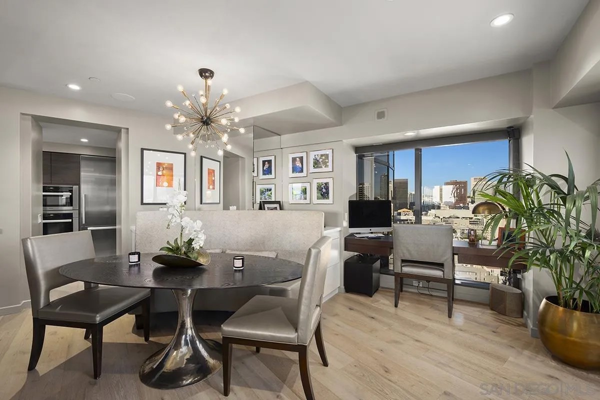 This is the finest 1-bedroom "re-imagined" condo ever seen in the Harbor Club; fully remodeled practically down to the studs! This beautifully curated residence offers a rare blend of luxury, privacy, and prime Marina District living plus one of the few with 1.5 bathrooms to boot. Positioned high enough to rise above neighboring buildings, the home captures sweeping views of the San Diego Bay and the iconic Coronado Bridge through walls of windows flooding the residence with natural light. The professionally decorated interior shows a sleek, modern kitchen appointed with high-end appliances, European-style cabinetry, mirrored backsplash, slab porcelain island, beverage chiller, and an eat-at bar accented by elegant drop lighting making it perfect for both everyday living and entertaining. The primary suite is a serene retreat featuring balcony access, a custom wall treatment, a new built-in closet, and a spa-inspired ensuite bathroom with dual vanity and a step-in rain shower with an additional handheld shower head. Rare for a one-bedroom residence, this home also offers a separate powder room, adding both convenience and sophistication for guests. Additional highlights include a French Oak hardwood flooring, Smart-controlled lighting, built-in sound system throughout, and a secure parking space with EV charger. This is truly a standout opportunity in the heart of the Marina District and luxury urban living at its finest. Residents of the Harbor Club are treated to an array of lavish, resort-inspired amenities that encompass a round-the-clock front desk service, a state-of-the-art gymnasium, an exquisite pool deck, a sociable club room, and a versatile library/business center, among numerous other perks. Nestled in the much-coveted Marina District, the Harbor Club boasts unparalleled ease in traversing the neighborhood on foot, granting effortless access to an array of transportation options, delectable dining establishments, retail therapy, the iconic ballpark, the pulsating Gaslamp Quarter, the artsy East Village, and the scenic Embarcadero - an idyllic setting for serene walks alongside the bay