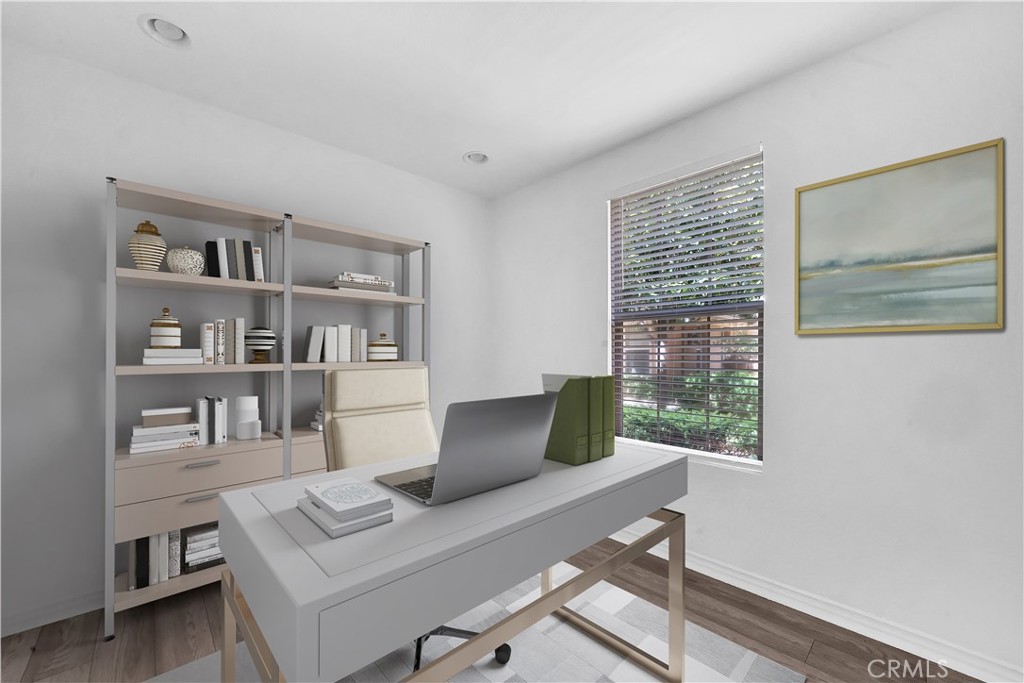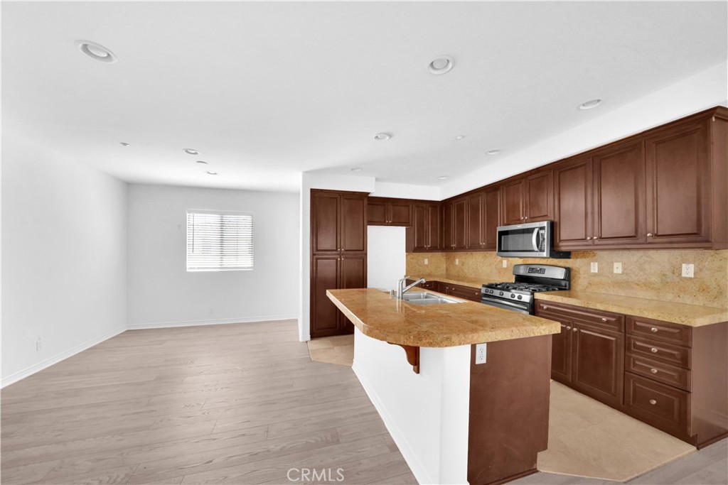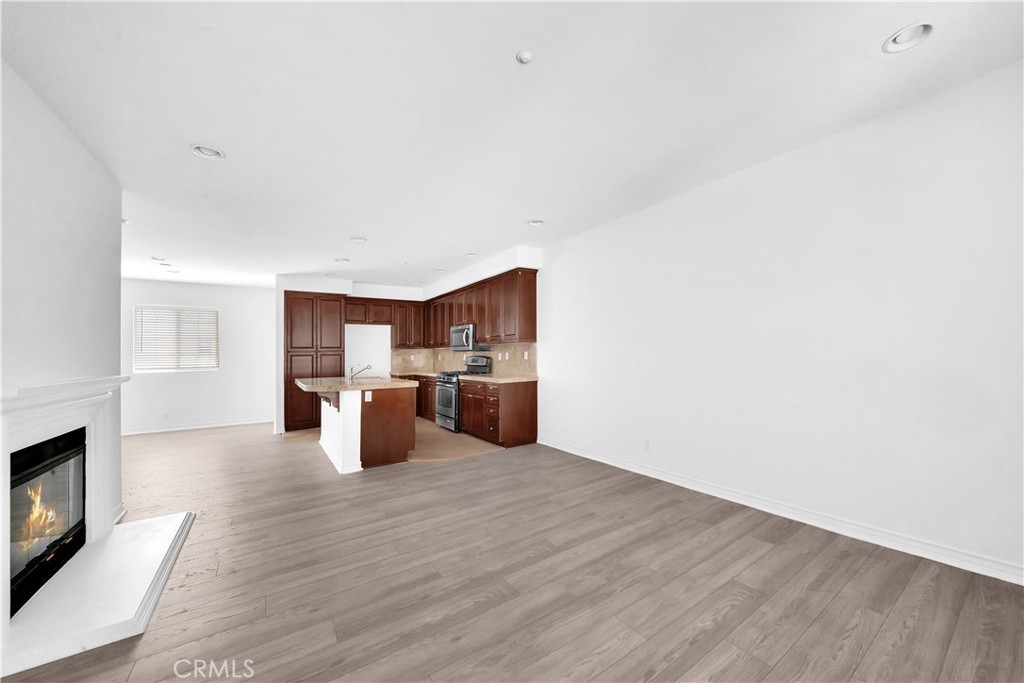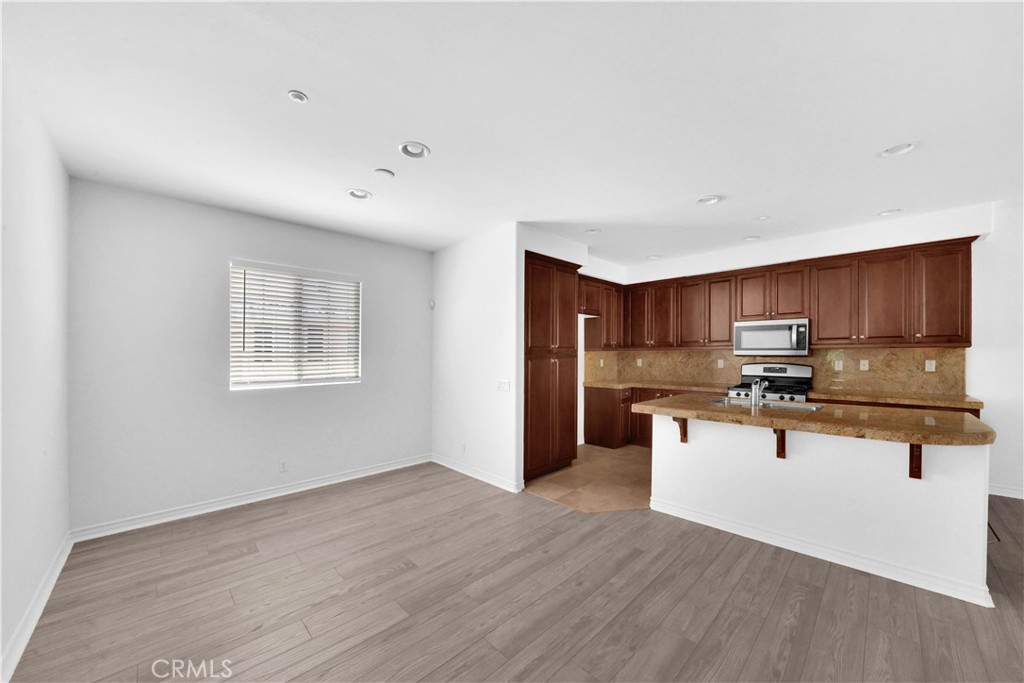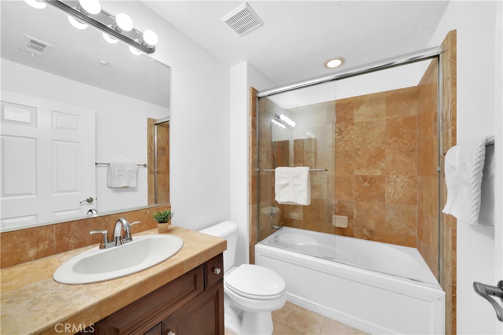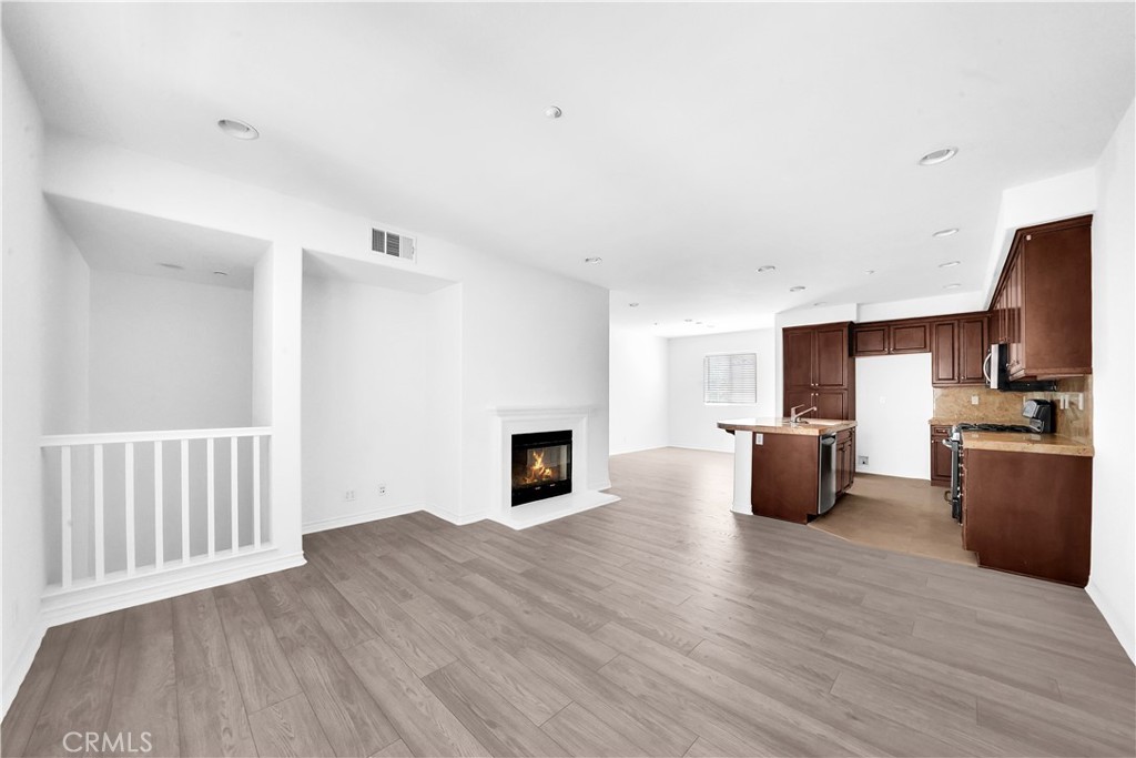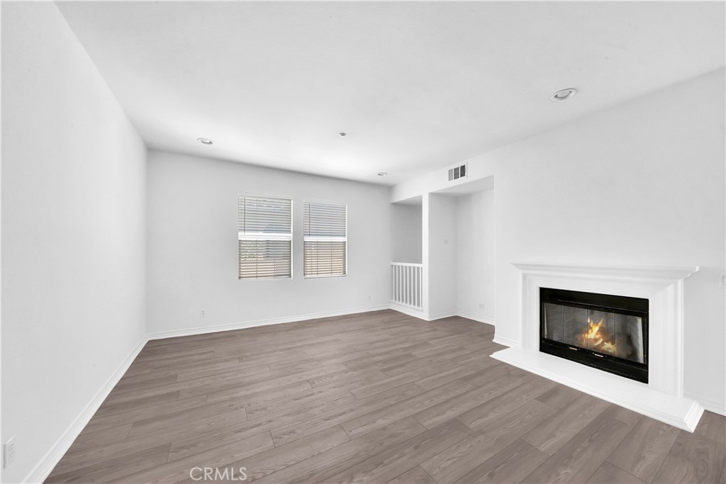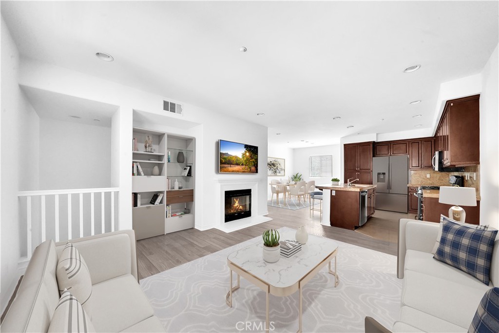 This beautifully upgraded corner-unit condominium offers 3 bedrooms and 3 bathrooms in the highly sought-after Woodbury community. Thoughtfully designed with neutral tones and newer laminate flooring throughout, the home exudes warmth and modern elegance. On the first level, a private bedroom with a full bathroom provides the perfect space for guests, a home office, or multigenerational living. Upstairs, the expansive main living area showcases an open-concept layout featuring a spacious living room with a cozy fireplace, a dining area, and a generously sized kitchen. The kitchen is appointed with rich stone countertops and a large center island - ideal for entertaining and everyday living. The primary suite is a relaxing retreat, complete with a walk-in closet and a well-appointed bathroom featuring dual vanities, a soaking tub, and a separate shower. An additional upstairs bedroom is light-filled and conveniently located near a secondary bathroom. Additional highlights include a first-level laundry area and an attached two-car garage equipped with an EV outlet. Ideally situated near Woodbury Town Center, residents enjoy access to numerous parks, award-winning schools, and convenient proximity to the 5 Freeway and toll road.