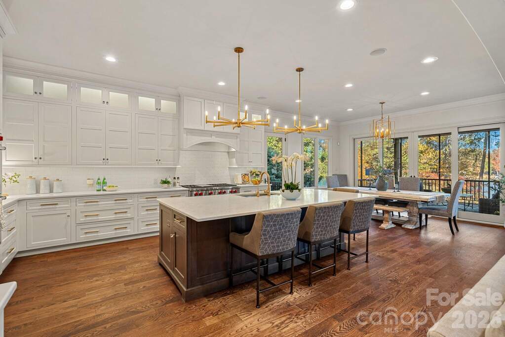 Spectacular waterfront living in The Point on Lake Norman, where refined design meets effortless comfort across more than 9,000 square feet of newly renovated luxury. Thoughtfully reimagined with impeccable style, this residence offers an elevated yet inviting atmosphere, designed for both intimate living and grand-scale entertaining. At the heart of the home, a chef's kitchen with an open-concept layout flows seamlessly into a warm, inviting hearth room, creating the perfect setting for gathering. Expansive windows frame long-range lake views, while multiple outdoor living spaces-including a screened porch, covered veranda, grilling terrace, and an expansive terrace for alfresco dining-extend the living experience outdoors. The main-level primary suite is a private retreat, featuring a completely renovated spa-inspired ensuite (2026) with elevated finishes and serene water views. Upstairs, three generously sized bedrooms each offer private ensuites, complemented by a dedicated office and a spacious game room. Designed for elevated living and unforgettable entertaining, the lower level is a destination of its own-featuring a full bar and entertainment space, private theater room, additional game room, fitness center, and a full bath serving as a convenient pool bath. A beautifully designed wine room evokes the experience of a private vineyard, introduced by a stone-lined hallway that sets the tone before opening into the cellar itself. An additional bonus room/bedroom offers flexibility for guests or extended stays. Outdoors, the newly redone saltwater pool is perfectly positioned to capture the beauty of the lake, while the private dock with boat lift and dual PWC lifts completes the waterfront experience. Additional features include laundry on all three levels, a whole-home generator, and sweeping lake views throughout. An exceptional offering in one of Lake Norman's most prestigious communities, this home captures the essence of luxury waterfront living at its finest.