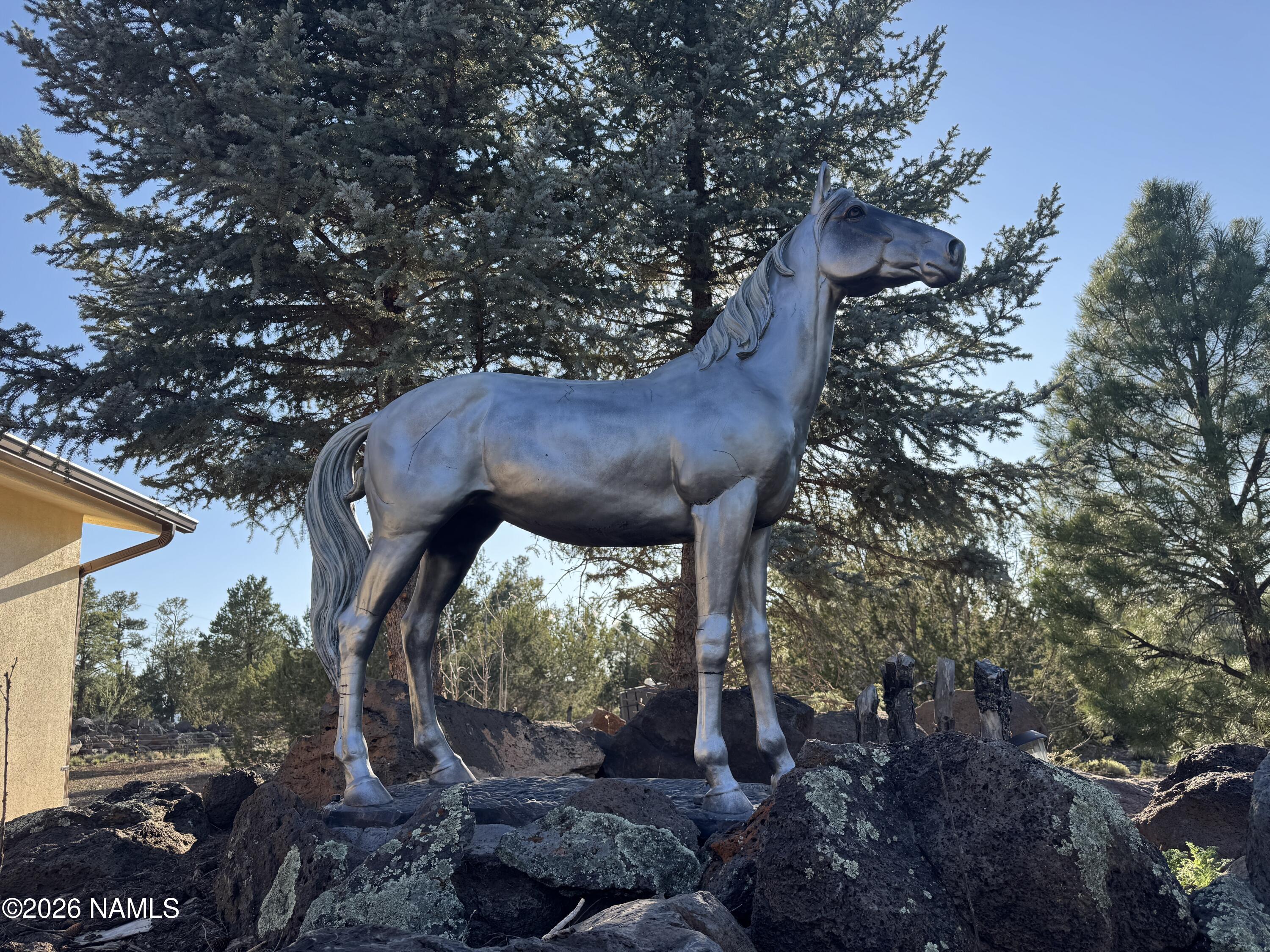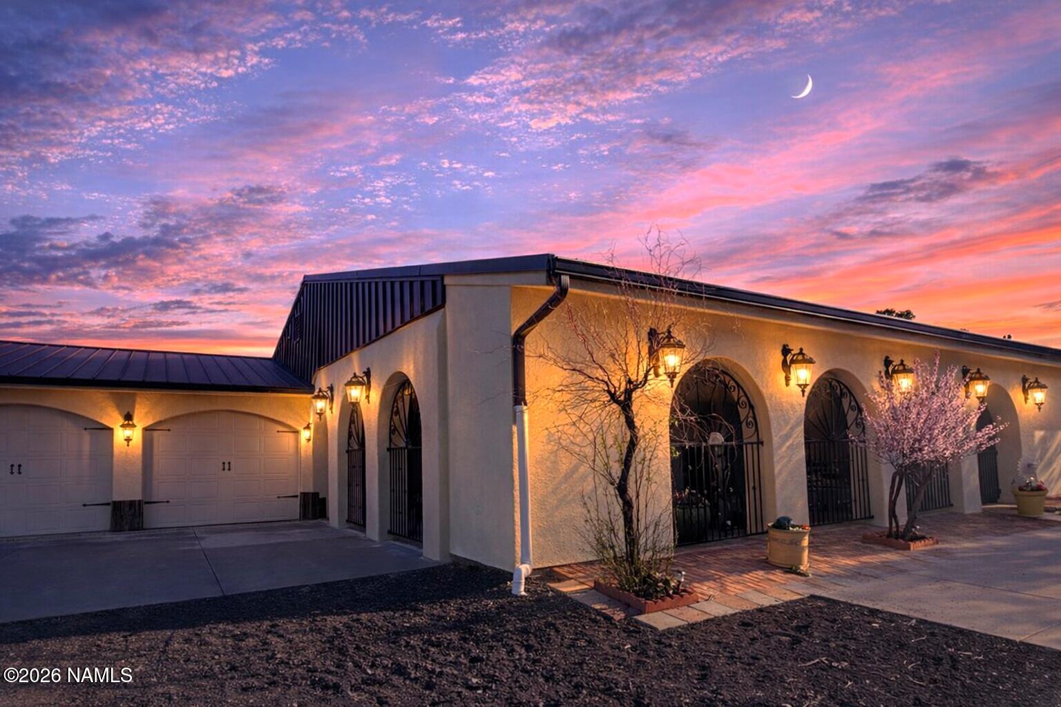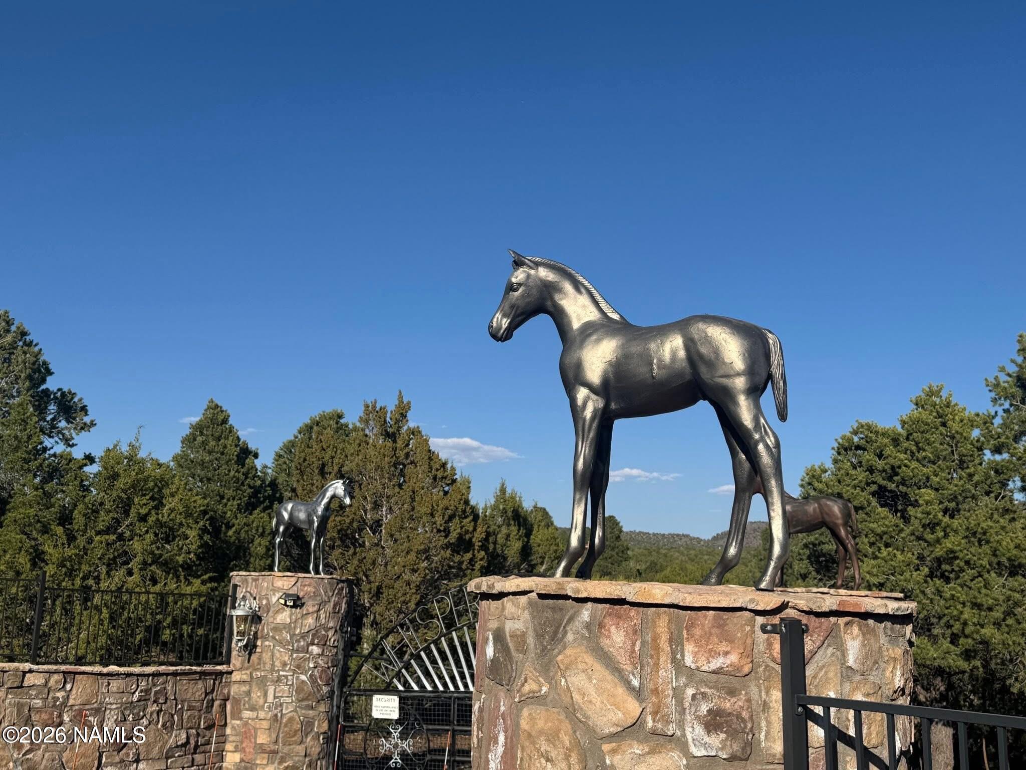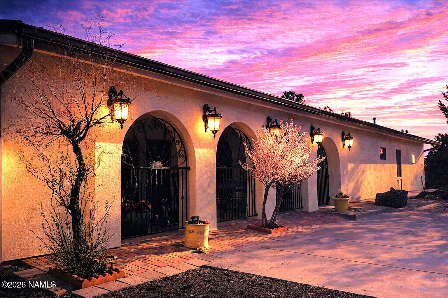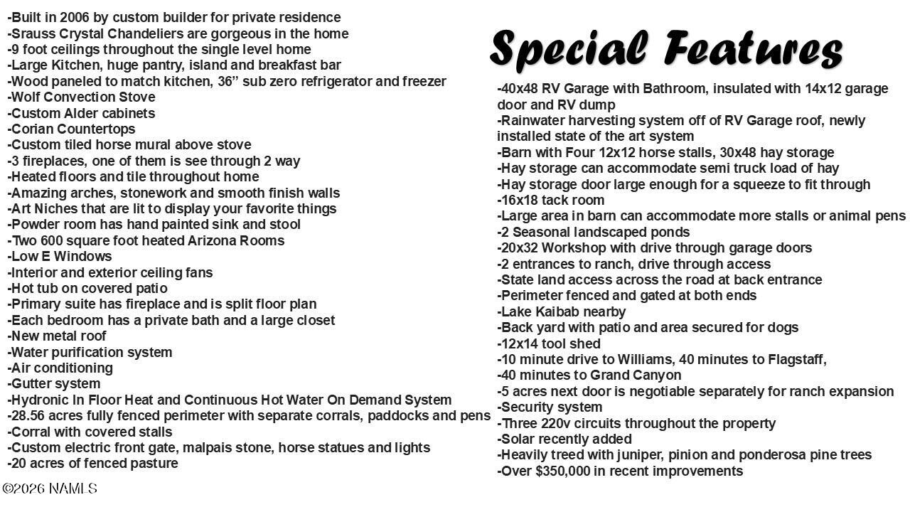 Whispering Winds Ranch in beautiful Williams AZ, located at 9665 Stagecoach Dr, is tucked in the wooded hills in a private gated community. 28.5 acres fenced with separate arenas/pens. The entrance is amazing with malpais stone, electronic gate and beautiful horse statues. The stylish home is a 4,526 square foot single level Spanish Colonial built in 2006 with heated floors, a/c, three suites with their own private baths, split floor plan, formal living room, family room and Arizona Rooms. 3 fireplaces, chandeliers, smooth textured walls, 9 foot ceilings throughout and a custom front door imported from Italy! 4 outbuildings including RV garage, workshop, barn and stalls. Fits 12+ cars total garage space. Property has natural ponds and rooftop collection. New metal roof, solar. Call today!