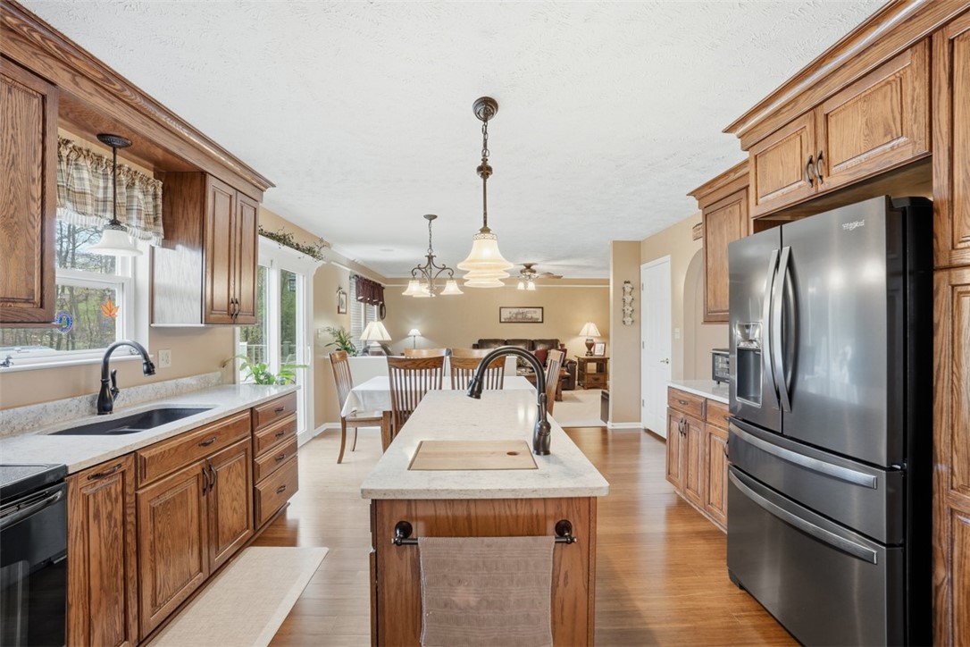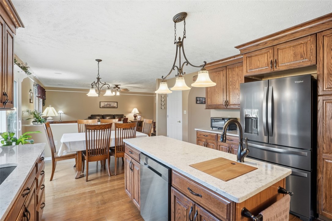 Welcome to this stunning 4-bedroom, 2 full and 2 half bath home nestled in the heart of Cranberry Township - where style, space, and thoughtful updates come together beautifully. From the moment you step into the spacious foyer, you'll feel right at home. A private home office sits just off to the right, while a formal living room welcomes you on the left. Designed with both everyday living and entertaining in mind, the open-concept layout seamlessly connects the updated kitchen and inviting family room, creating the perfect gathering space filled with natural light and warmth from the gas fireplace. The fully renovated kitchen is sure to impress, featuring quartz countertops, dual sinks, stainless steel appliances, and upgraded cabinetry, all thoughtfully designed for both function and style. A spacious formal dining room with elegant chair rail detailing provides the perfect setting for hosting dinners and special occasions. First-floor laundry adds an extra layer of convenience. Upstairs, retreat to the enormous primary suite with vaulted ceilings and detailed dental crown molding. The en suite bath offers a true spa-like experience with dual vanities, a soaking tub, walk-in shower, and two generous walk-in closets. Three additional spacious bedrooms and a full bath complete the second level. The finished lower level expands your living space with a kitchenette and half bath - ideal for entertaining, hosting overnight guests, or creating the ultimate game room. Step outside from the kitchen onto a low-maintenance composite deck, perfect for outdoor dining or relaxing evenings. The lower-level concrete patio offers a private oasis already prepped for a future hot tub. A storage shed, mature landscaping, and a level backyard that backs to HOA common space provide both beauty and privacy. Conveniently located near major highways, shopping, dining, and all that Cranberry Township has to offer, this move-in ready home truly checks every box.