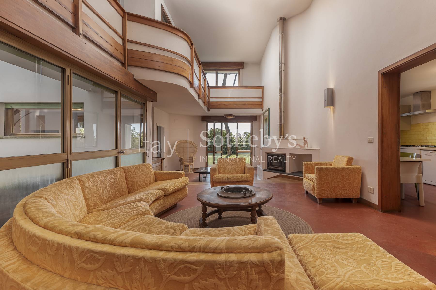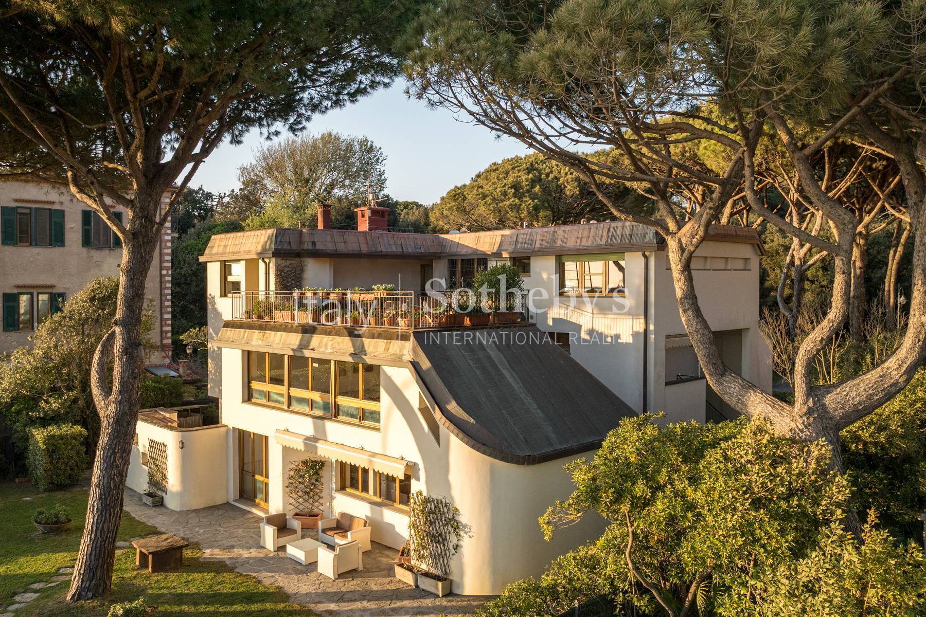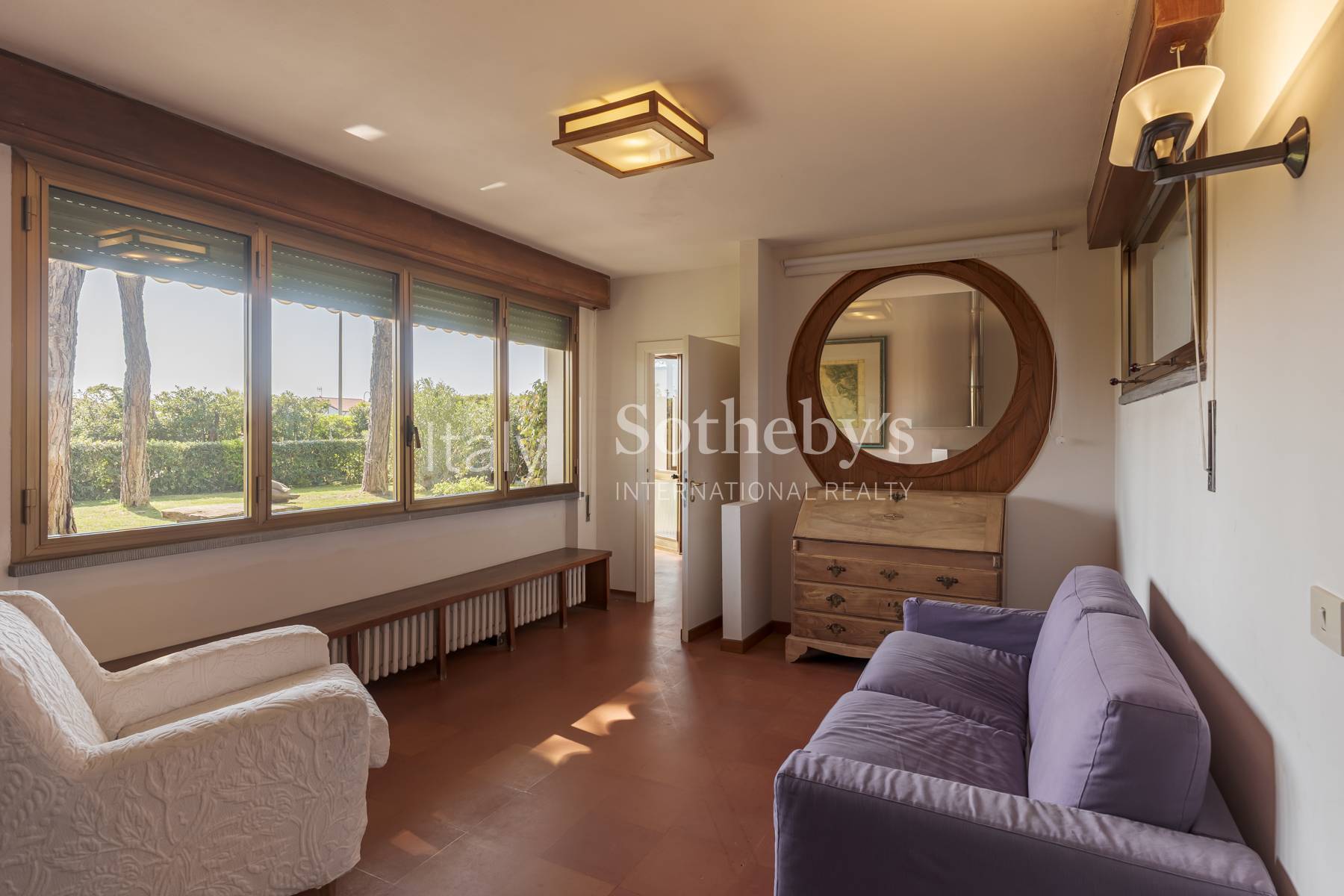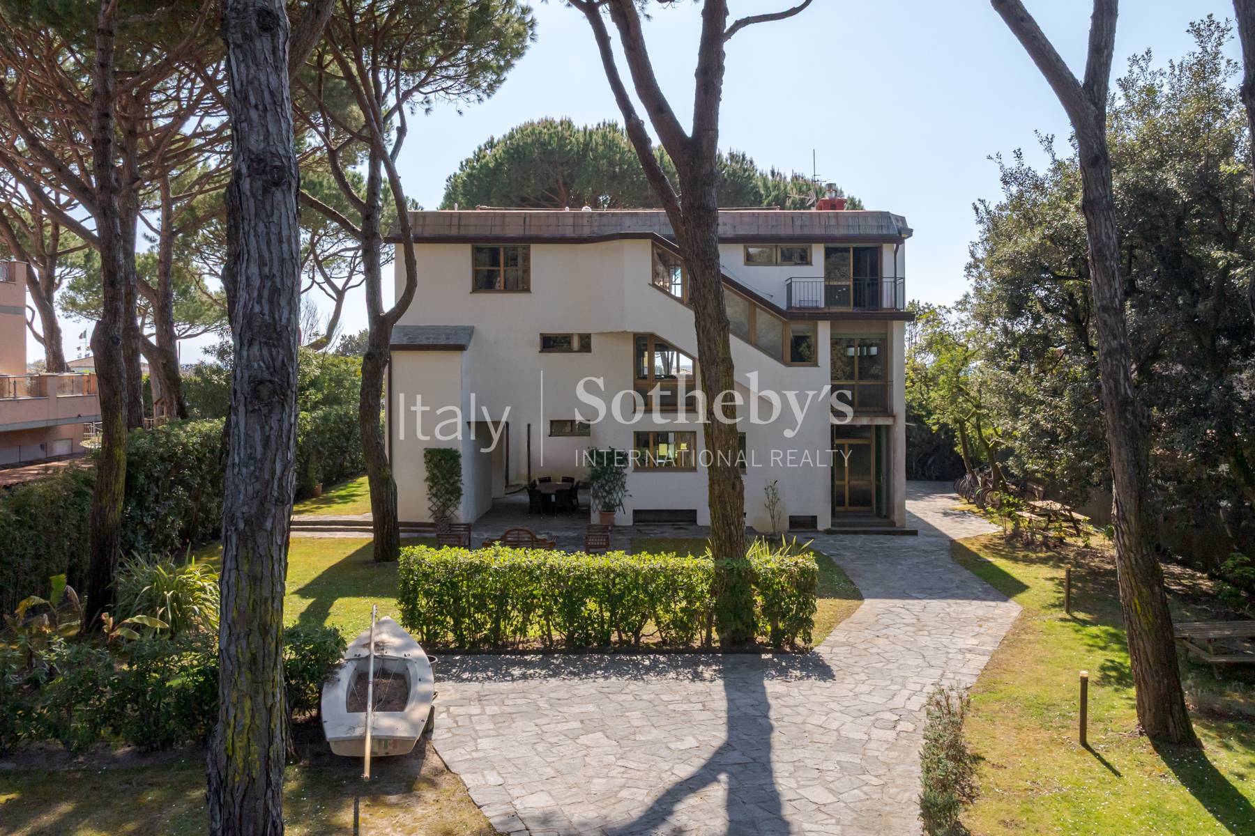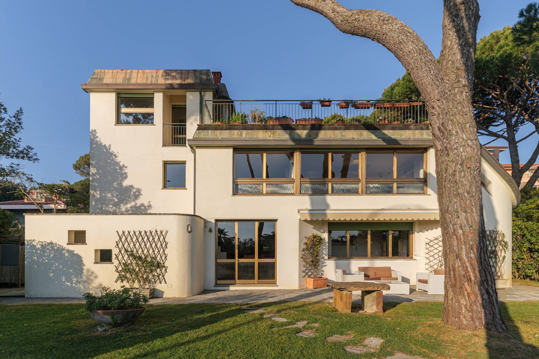 This seafront villa, set in a rare and highly sought-after location on the border between Forte dei Marmi and Marina di Pietrasanta, was designed by Giovanni Michelucci. It stands out for its architectural language of extraordinary refinement, where form and function merge into a harmonious and deeply human balance. The property's defining feature is the striking double-height dining and living area, the true heart of domestic life, along with the distinctive organization of the interior spaces.The architect moves beyond conventional layouts through a fluid and dynamic sequence of rooms, designed around family living and enhancing the quality of everyday life within a setting of exceptional natural beauty.The villa offers a total gross surface area of 511 sqm, divided into 21 rooms, while the garden extends over 1,200 sqm, allowing for the construction of a swimming pool.