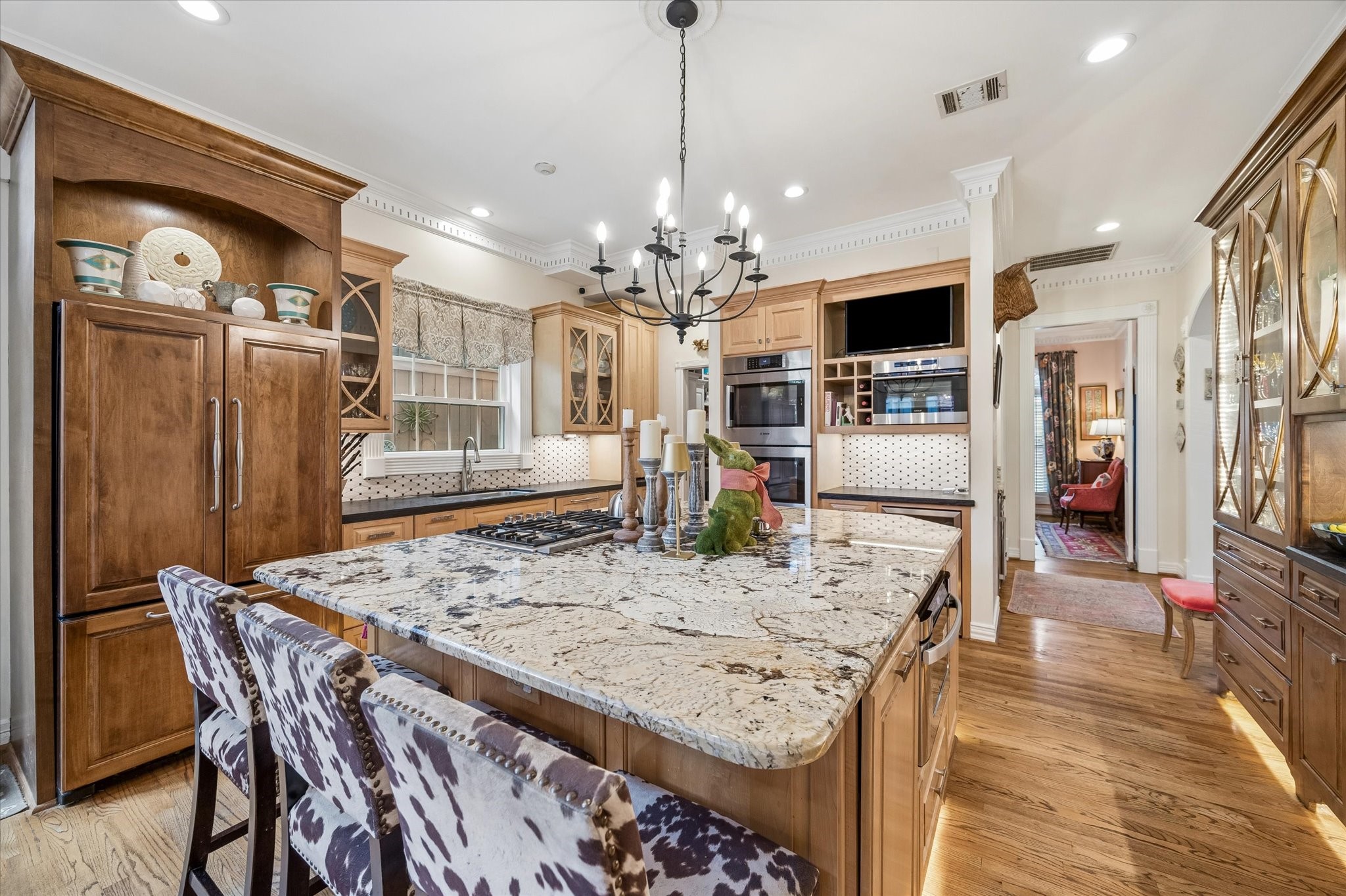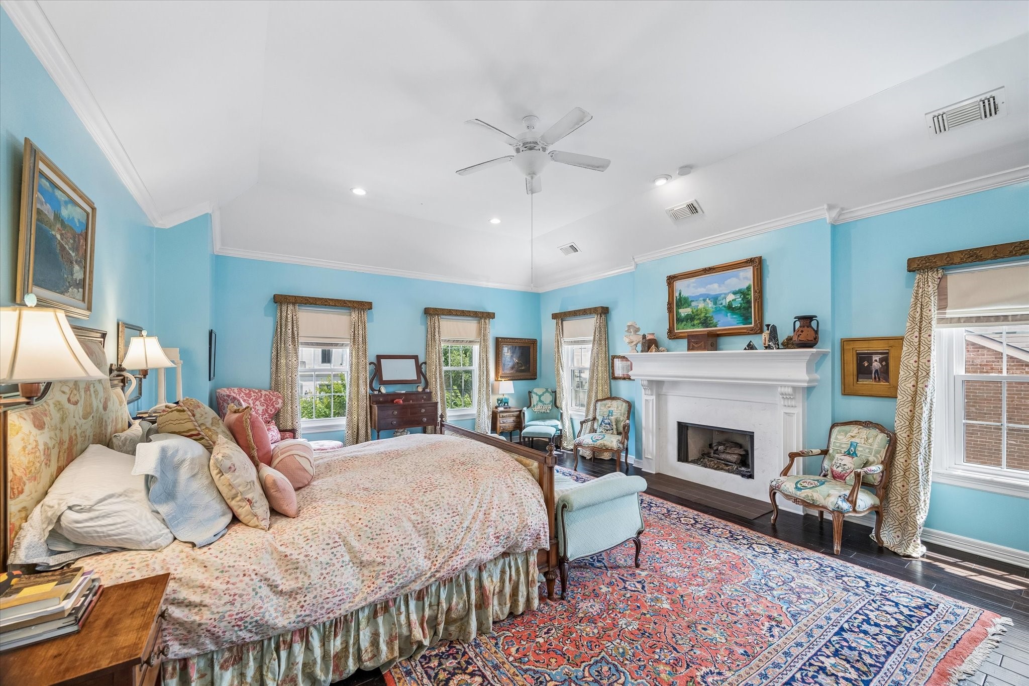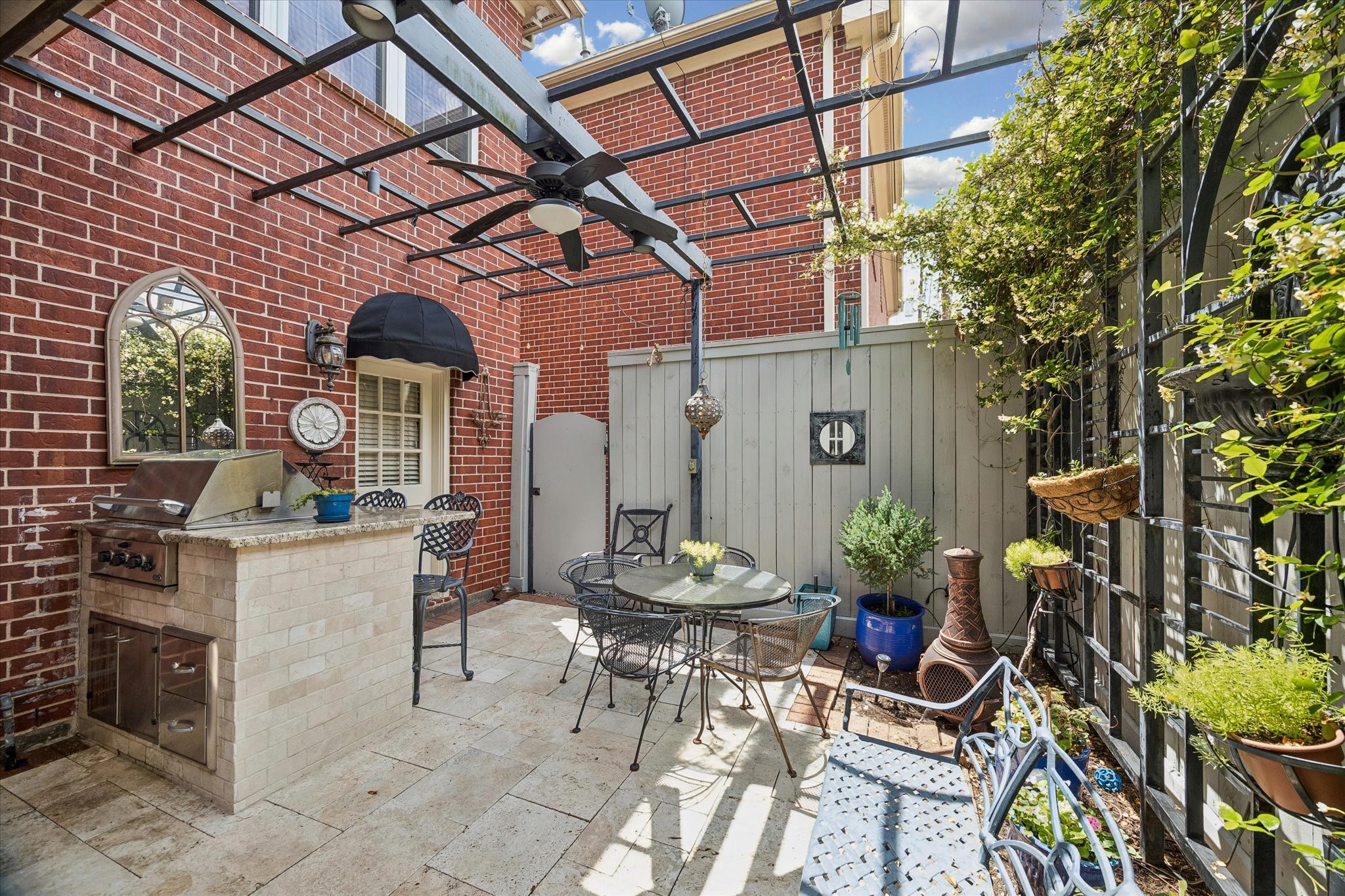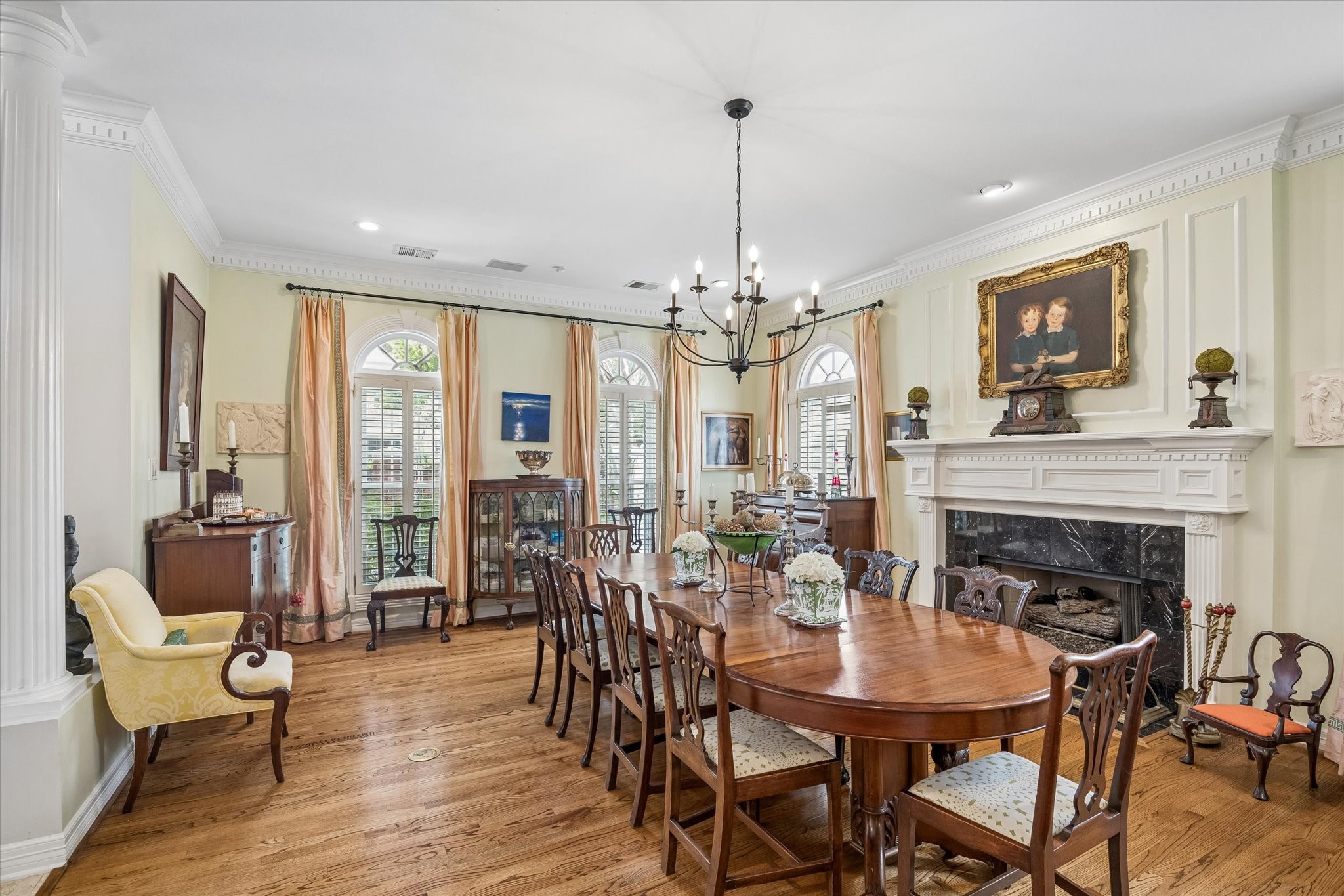Stunning 4/5 bed 4.5 bath w/ private front oasis featuring sparkling pool/spa, courtyard, and lush landscaping! The dramatic two-story entry sets the tone for the elegant interiors, featuring a formal living room, large formal dining room with fireplace, and a cozy den. The chef's kitchen impresses with a massive island, gas cooktop, high end Stainless Steel appliances, and abundant storage space, complemented by a stylish dry bar—perfect for entertaining. Additional back patio offers outdoor grilling and entertaining space. The oversized primary suite is a peaceful escape featuring hardwood floors, a fireplace, and plenty of natural light. The primary bathroom features dual sinks, soaking tub, separate shower, and walk in closets. 3 additional bedrooms on 2nd floor+laundry room. 3rd floor private suite with office/living space, bathroom, and tons of storage! Attached 2 car garage built in cabinets. Great location and close to shopping, grocery stores, and plenty of restaurants!
