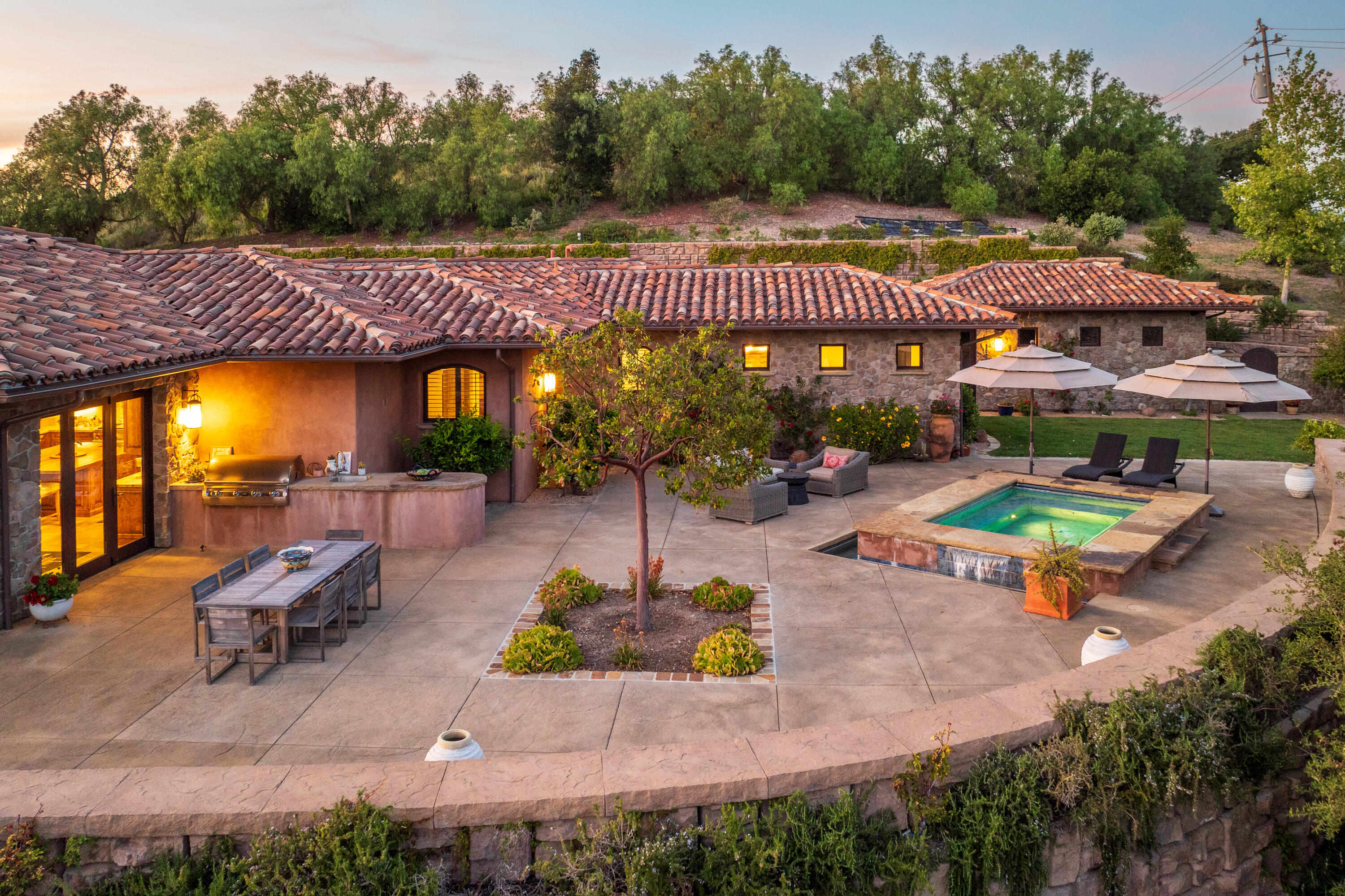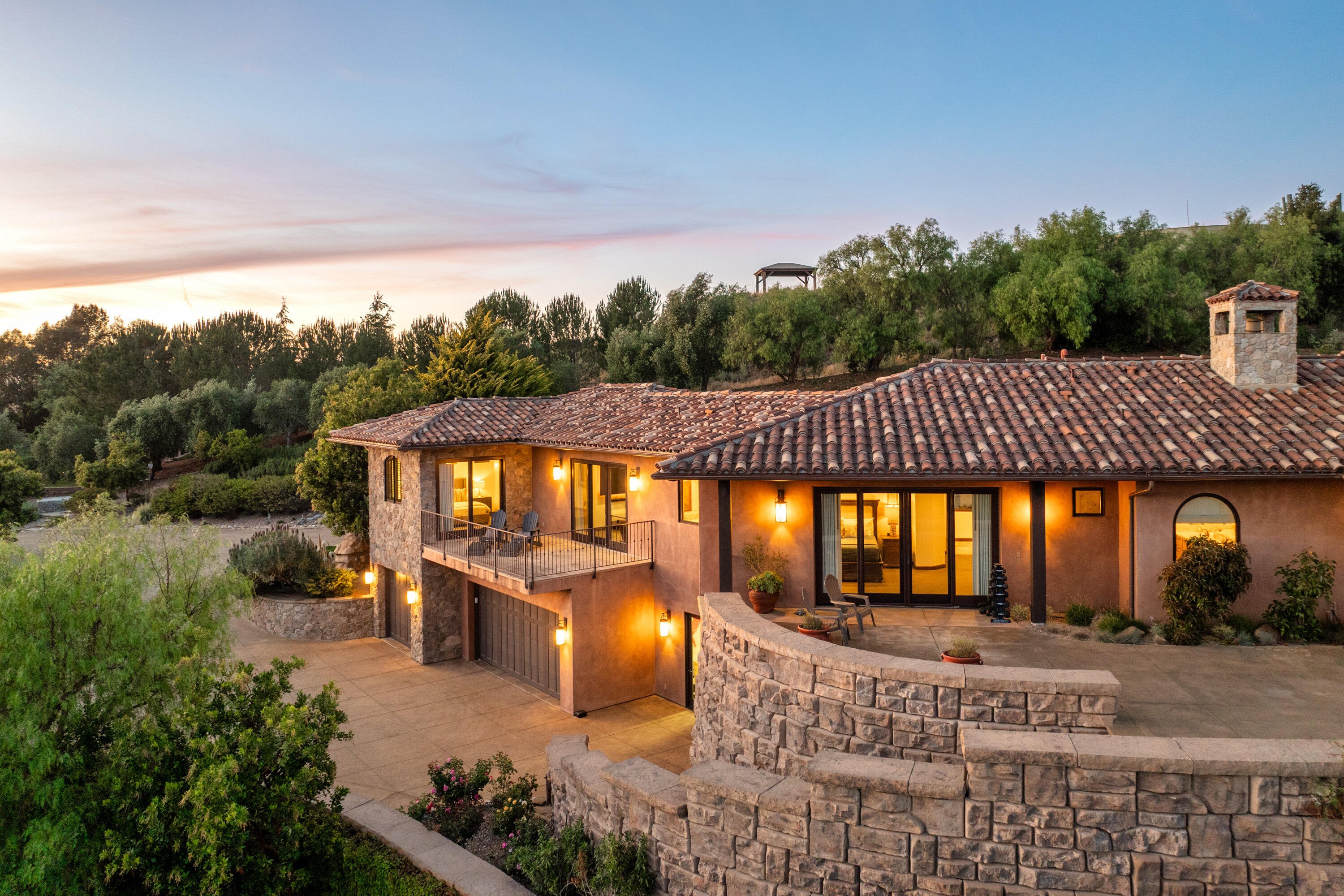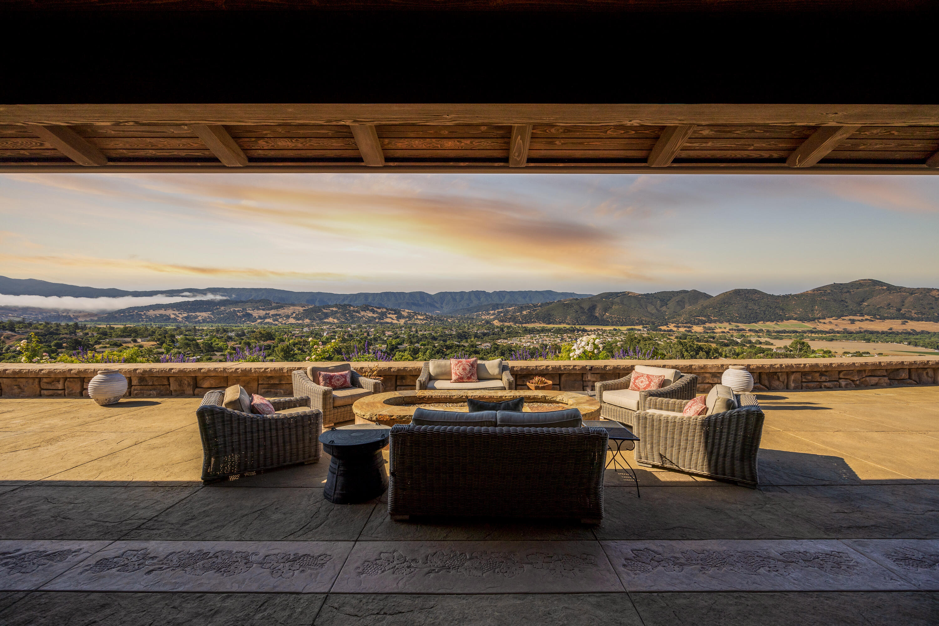 Be the first to watch as the fog slowly rolls in and cradles the Valley. Welcome to ''First Fog Ranch'', with breathtaking views and incredible sunsets! Relaxed country elegance, a stunning estate of the highest quality constructions and craftsmanship, with high end finishes that perfectly blend elegance with serene ranch living. 6.27 acres, offering both privacy and versatility, boutique Syrah vineyard, 5,456 sq. ft. of refined living space, featuring 4 spacious bedrooms and 4.5 luxurious bathrooms. The heart of the home is the impressive living room with grand stone fireplace and a wall of folding glass bi-fold doors that open entirely to the outdoor patios with umbrellas, a cozy fire pit and a splash pool. The gourmet kitchen is a chef's dream, equipped with an expansive island.. breakfast bar, walk-in pantry, wine refrigerator, and a high-end Wolf range. For wine enthusiasts, the temperature-controlled wine cellar provides ample space for your collection, accommodating up to 780 bottles. Wander the many pathways that lead to magical landscaped destinations, to the charming art studio with half bath, and to the entertainment/media studio with covered porch, lawns and beautiful views. Additional amenities include an attached 3-car garage and a detached 1-car garage. Designed and originally built for a celebrity artist, come and experience the epitome of luxury and tranquility at First Fog Ranch, where every detail has been thoughtfully designed to create an unparalleled living experience.