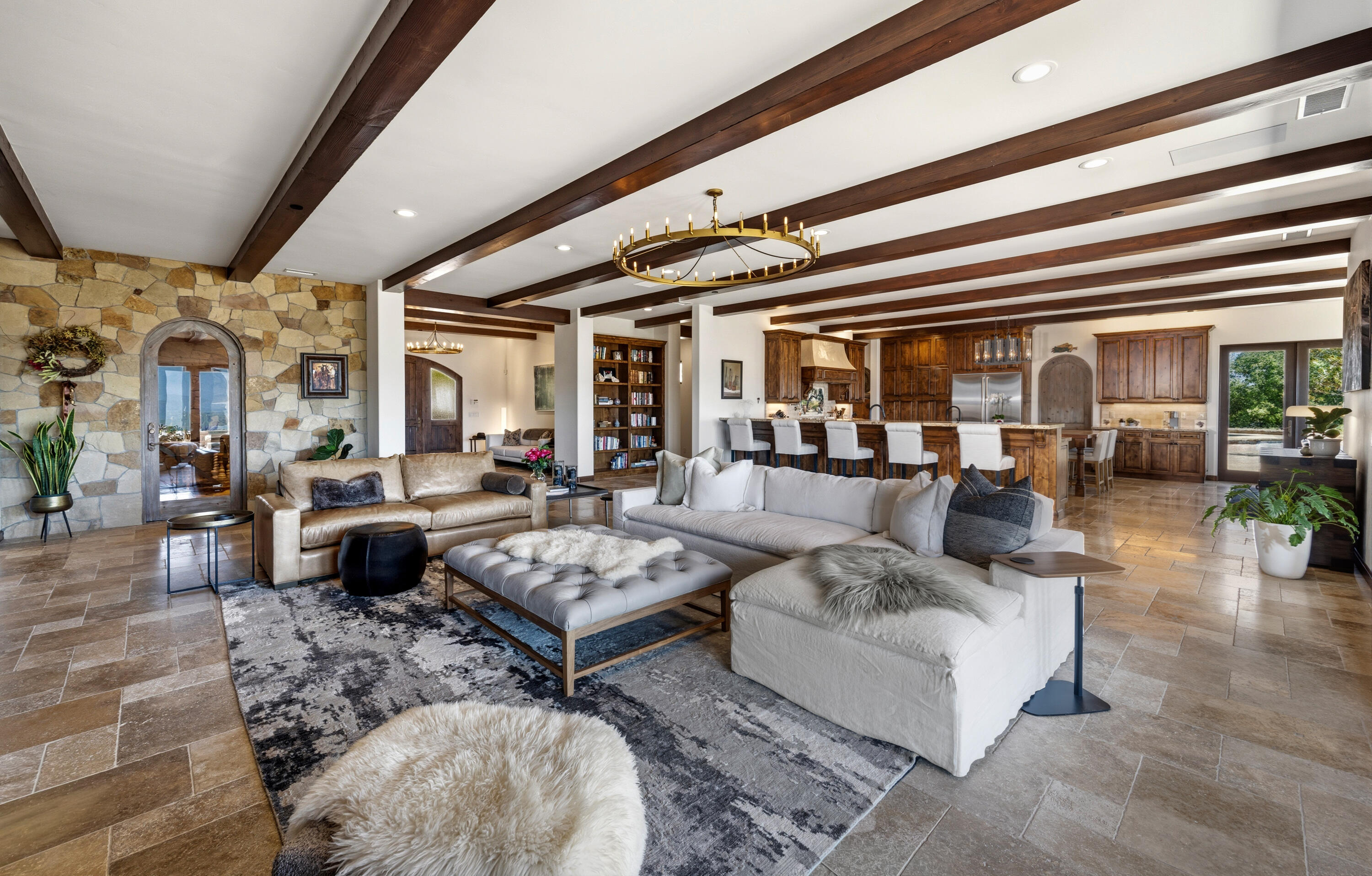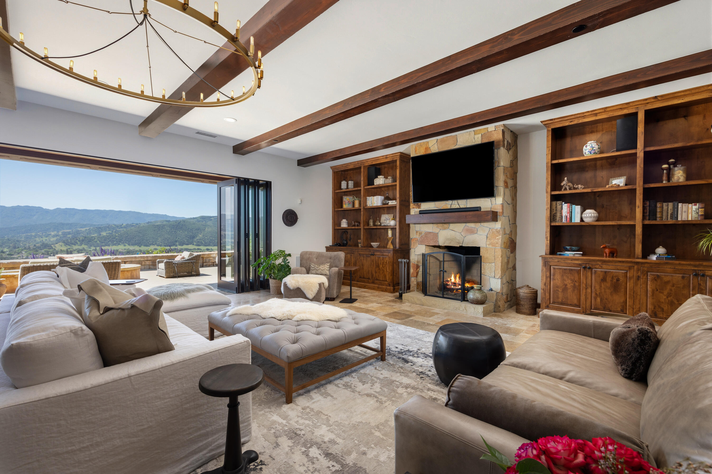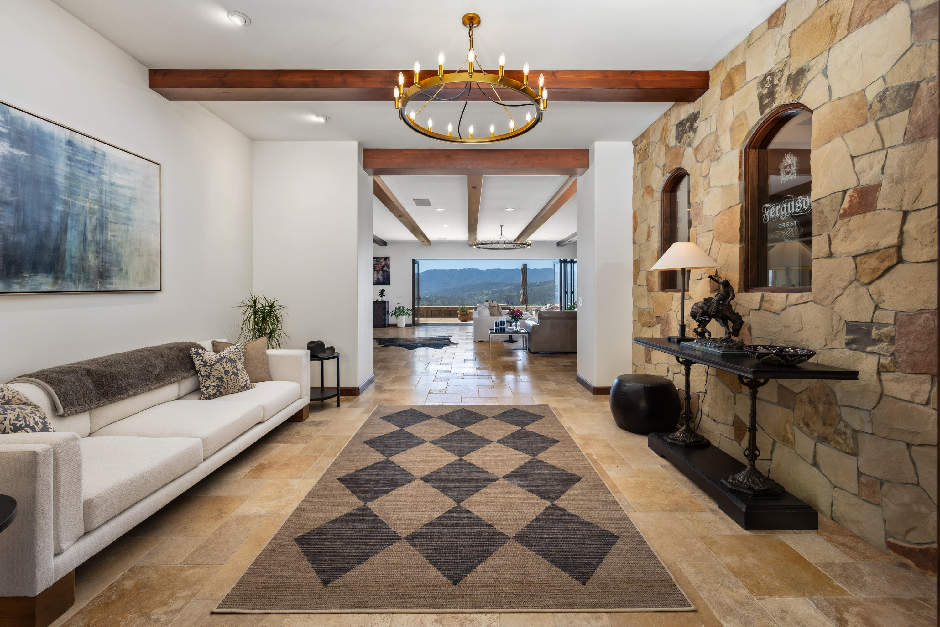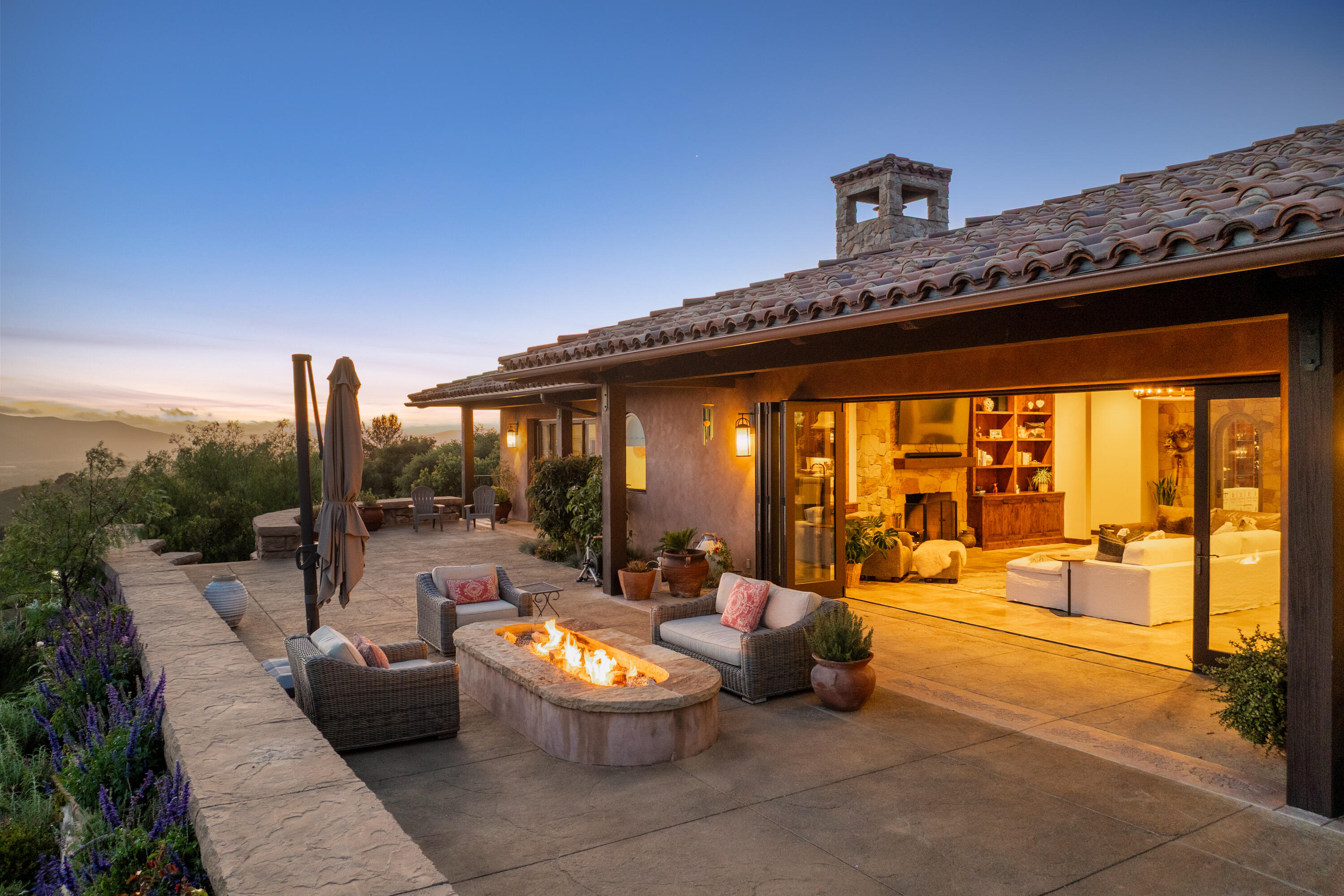 Be the first to watch as the fog slowly rolls in and cradles the Valley. Welcome to ''First Fog Ranch'', with breathtaking views and incredible sunsets! Relaxed country elegance, a stunning estate of the highest quality constructions and craftsmanship, with high end finishes that perfectly blend elegance with serene ranch living. 6.27 acres, offering both privacy and versatility, boutique Syrah vineyard, 5,456 sq. ft. of refined living space, featuring 4 spacious bedrooms and 4.5 luxurious bathrooms. The heart of the home is the impressive living room with grand stone fireplace and a wall of folding glass bi-fold doors that open entirely to the outdoor patios with umbrellas, a cozy fire pit and a splash pool. The gourmet kitchen is a chef's dream, equipped with an expansive island.. breakfast bar, walk-in pantry, wine refrigerator, and a high-end Wolf range. For wine enthusiasts, the temperature-controlled wine cellar provides ample space for your collection, accommodating up to 780 bottles. Wander the many pathways that lead to magical landscaped destinations, to the charming art studio with half bath, and to the entertainment/media studio with covered porch, lawns and beautiful views. Additional amenities include an attached 3-car garage and a detached 1-car garage. Designed and originally built for a celebrity artist, come and experience the epitome of luxury and tranquility at First Fog Ranch, where every detail has been thoughtfully designed to create an unparalleled living experience.