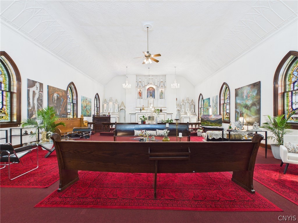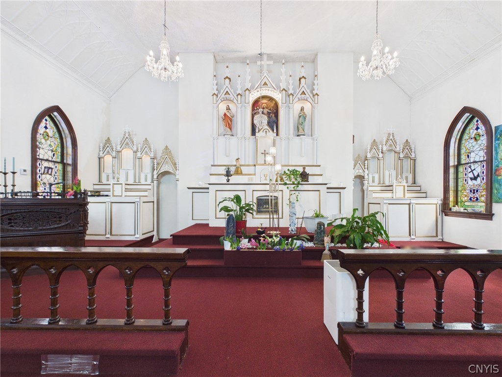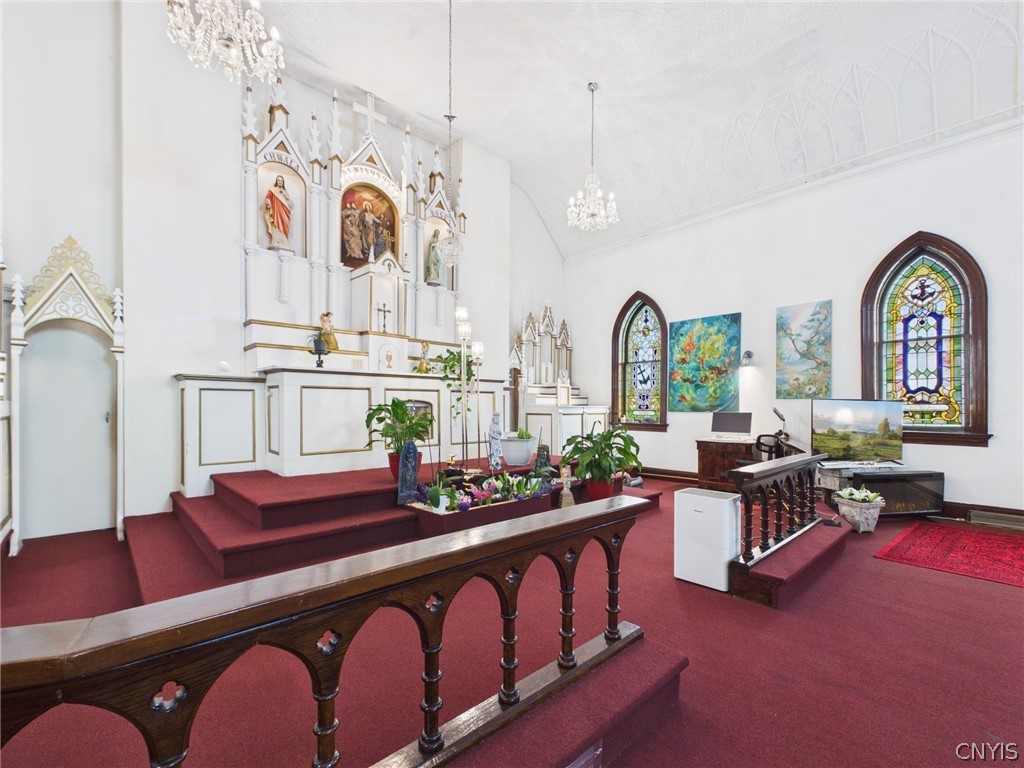 Step into a rare piece of history with this remarkable circa-1900 former Polish National Church, a truly one-of-a-kind property where timeless craftsmanship meets thoughtful restoration. Rich in character and architectural beauty, this historic landmark has been carefully preserved to maintain its original charm while benefiting from important modern updates. Inside the sanctuary, breathtaking original stained glass windows cast vibrant streams of sunlight across the interior, creating an atmosphere that is both peaceful and unforgettable. Stunning original woodwork showcases the craftsmanship of a bygone era, while the complete altar remains intact, offering a striking centerpiece and honoring the building's heritage. The church loft has been creatively repurposed as a unique bedroom retreat, featuring a large stained glass window directly above the bed - an extraordinary place to wake each morning as the sunlight pours through the colored glass. Recent improvements include a new partial metal roof, updated electrical systems, and plumbing enhancements, allowing the next owner to enjoy both character and functionality. Every effort has been made to restore the property while respecting its historical significance. Also included is a spacious 2,672 square foot parish house featuring 3 bedrooms and 1.5 bathrooms, offering comfortable living quarters, guest accommodations, rental potential, or additional flexible space to complement the church building. Whether envisioned as a residence, event venue, studio, retreat space, or investment opportunity, this extraordinary property offers endless possibilities. Own a distinctive and inspiring piece of history unlike anything else on the market.