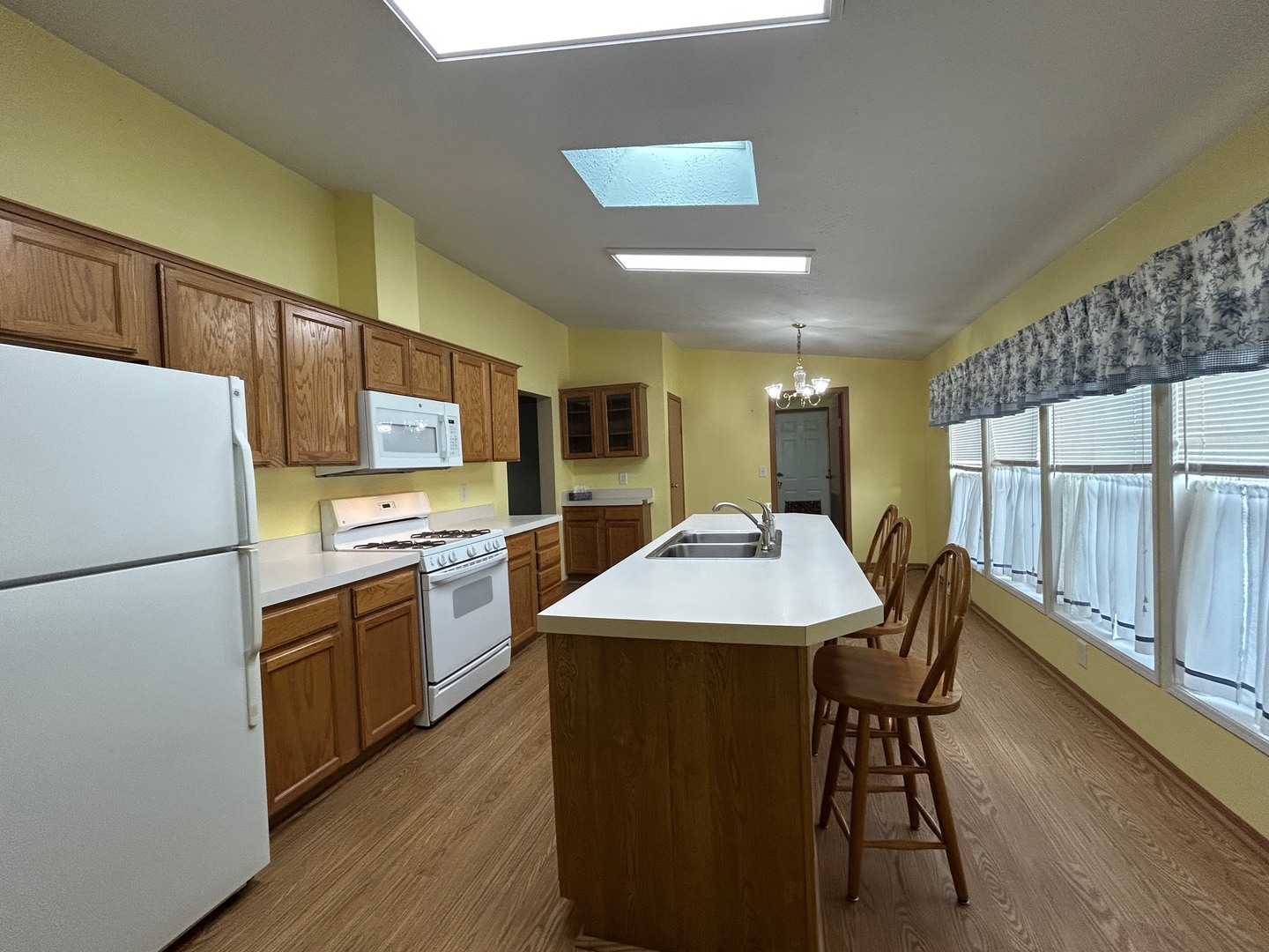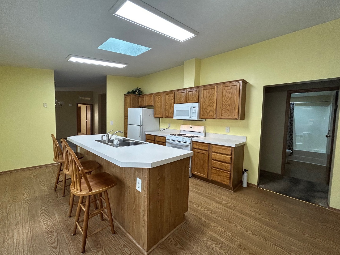 Spacious 1,680 sq. ft. home with an attached oversized garage located in desirable Four Seasons Park, offered as-is and priced accordingly. This home features a great split-bedroom floor plan and a large eat-in kitchen with a center island, abundant oak cabinetry, a walk-in pantry, and space for a table. The open layout includes a combination dining room flowing into the great room, creating a bright living area with vaulted/cathedral ceilings and skylights. The primary suite offers a private retreat with a walk-through closet, dual sinks, and a whirlpool/Jacuzzi tub with a separate shower. Additional highlights include an enclosed screened porch, nicely landscaped yard, and a new roof in 2022. Conveniently located close to shopping with easy access to main roads. Great opportunity to add your own updates and make it your own.