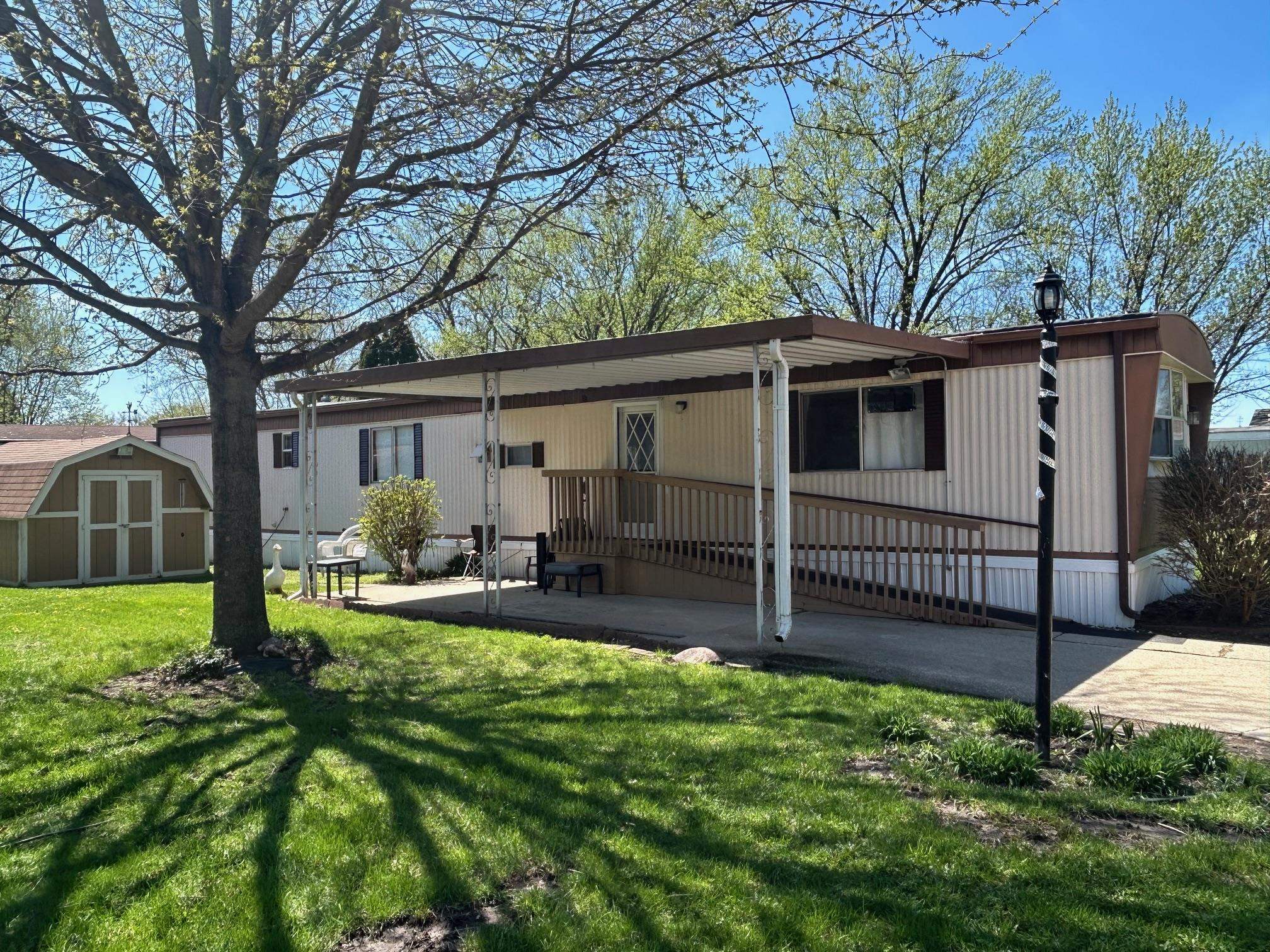 Affordable living in a great location between Belvidere and Rockford in Greenview Estate Mobile Home Park. Pets are allowed, and the park offers amenities including a playground and is adjacent to the Kishwaukee River, plus more. This home features a large kitchen with an eat-in area open to the living room, filled with natural light. Main floor laundry adds convenience, along with an easy step-in shower. Outside you'll find a carport, a super nice shed with lighting and ample storage, and a great-sized lot with plenty of space. Recent updates include a newer furnace and water heater. A comfortable home in a peaceful setting.