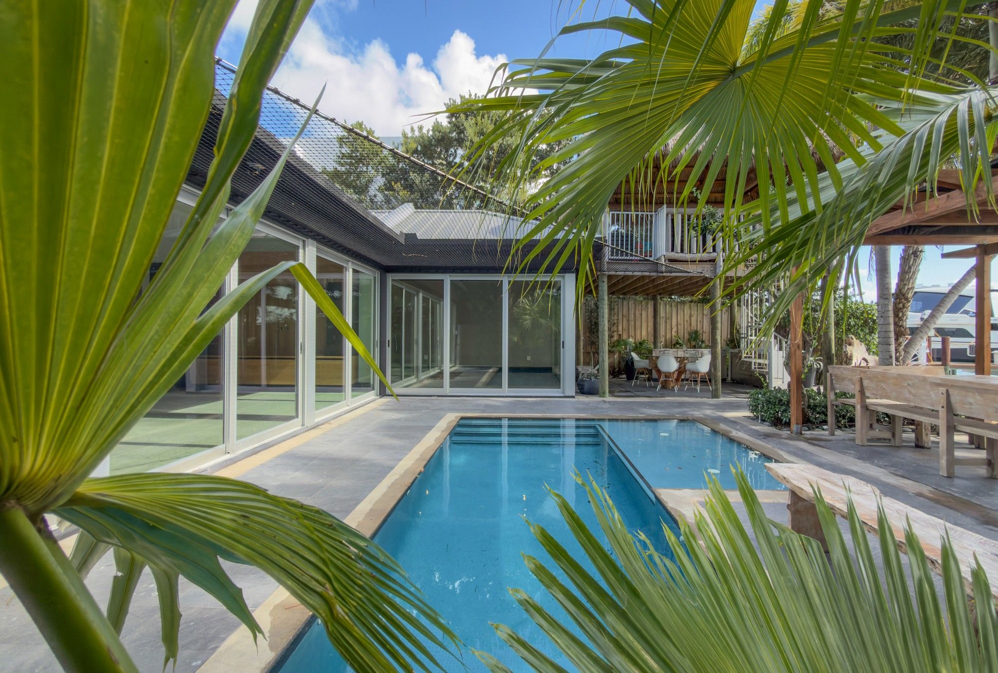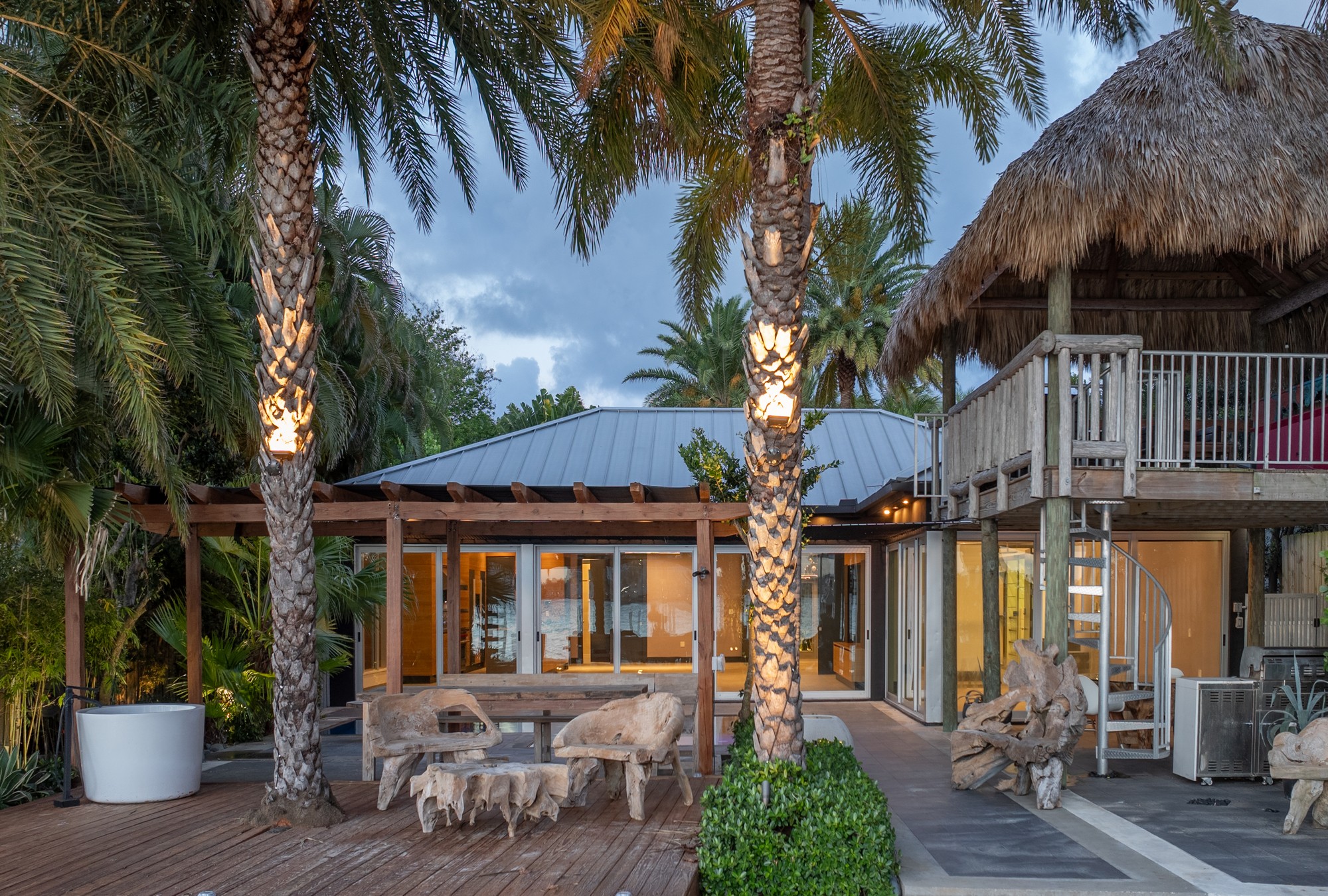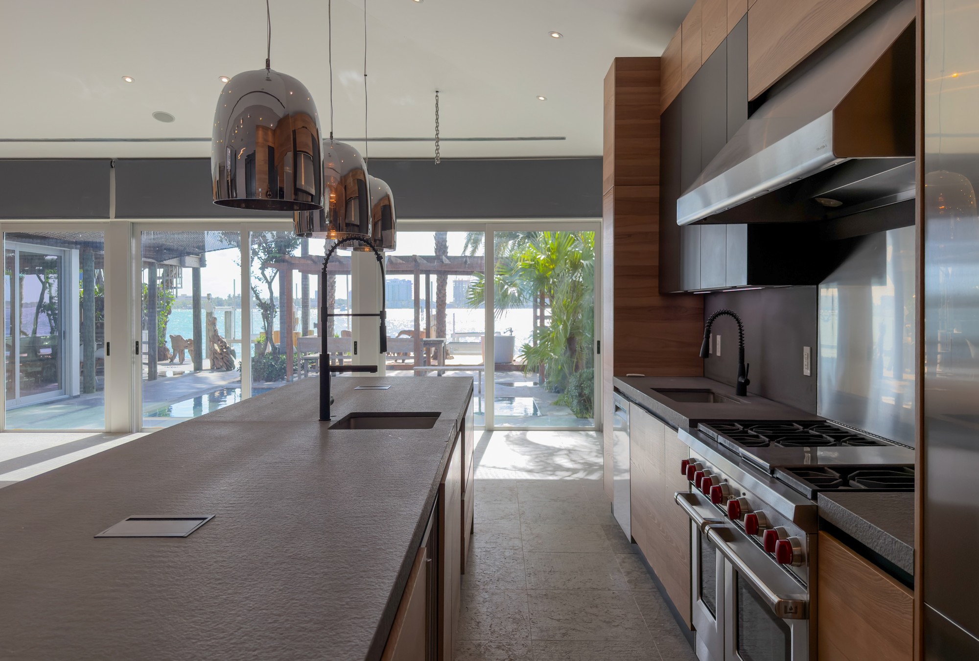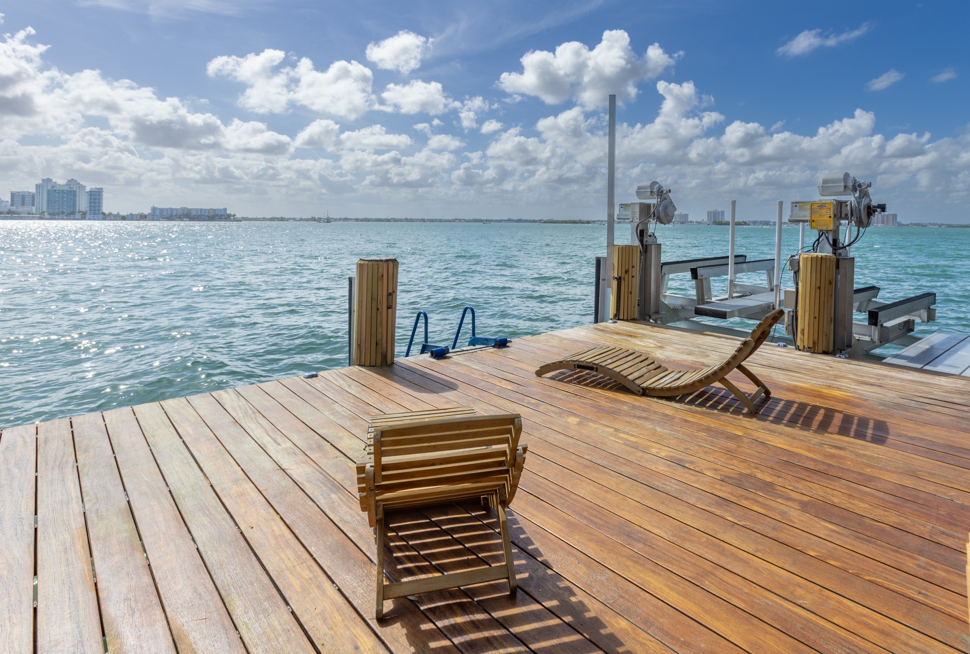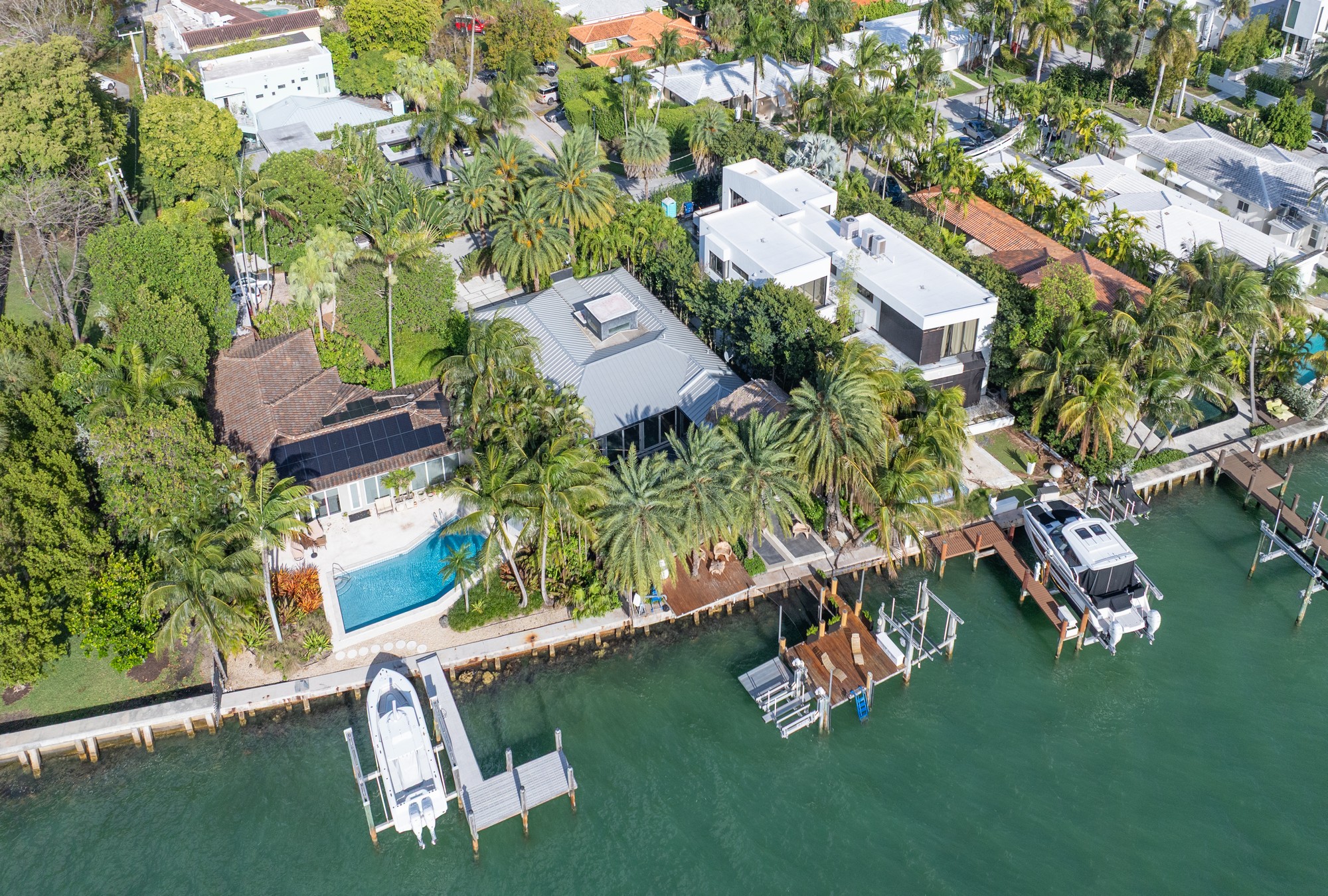 A rare waterfront home with a design you will not find again. Located on a quiet cul-de-sac inside the gated community of Normandy Shores, this property offers access to golf, tennis, basketball courts, and parks. Set on the island’s Terrace and shared with only a few homes, it captures wide open bay views and stunning sunsets.Built in 2015, the home offers approx. 3,442 SF with 4 bedrooms and 4 bathrooms. The layout flows through open living and dining areas into a modern kitchen designed for both function and entertaining. From the moment you arrive, the home creates a calm feel. A bamboo garden welcomes you, leading to a striking 30 ft interior waterfall that sets the tone throughout. The outdoor space is built to enjoy. Lush landscaping surrounds a pool, outdoor kitchen, and multiple terraces. Relax in the outdoor soaking tub, host gatherings under the two story tiki hut, or enjoy quiet evenings by the water. The private dock allows you to take in the bay at sunset.The property also includes boat and jet ski lifts, a davit, and plans for a future two car garage. A true opportunity for someone looking for a different kind of waterfront living experience.
