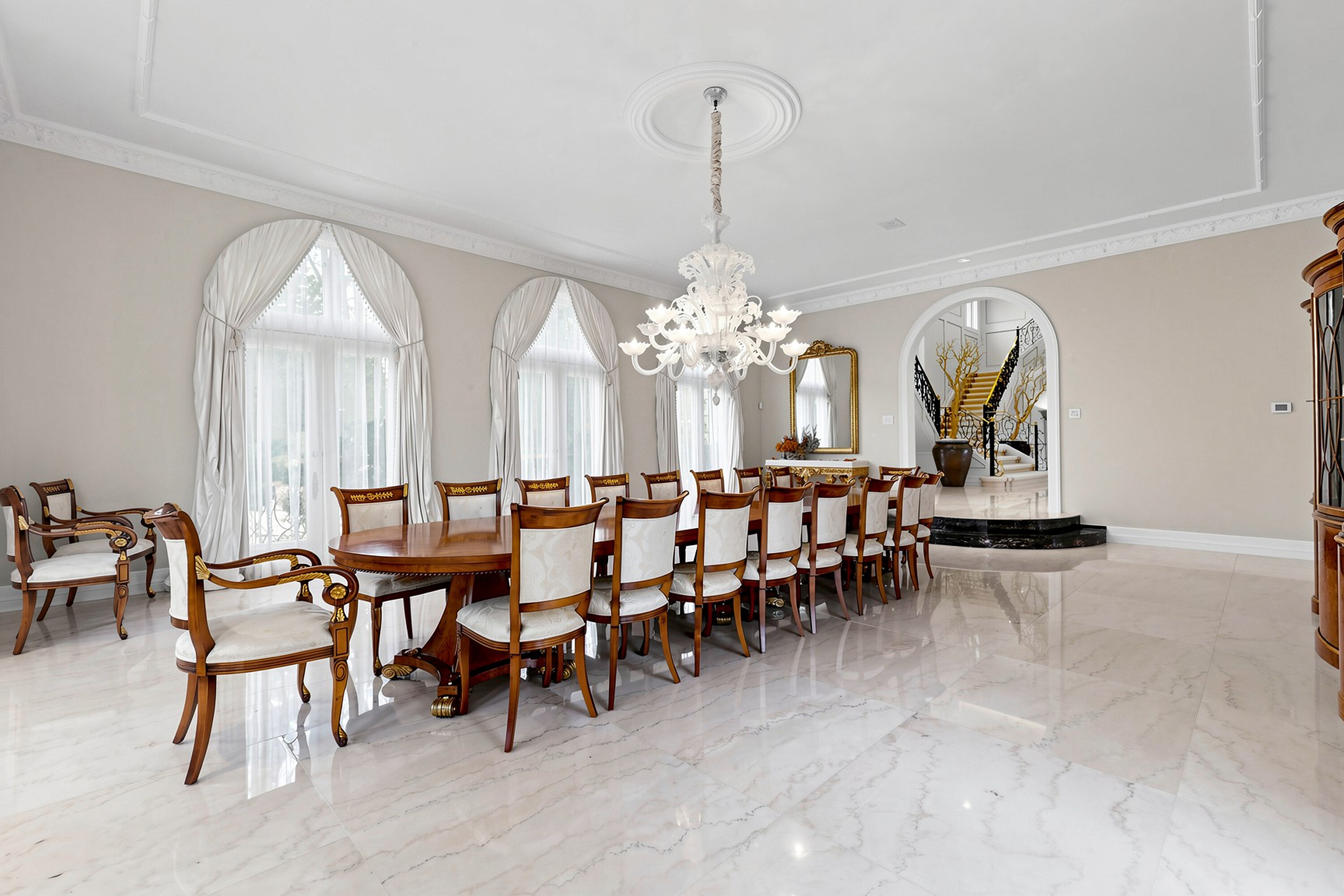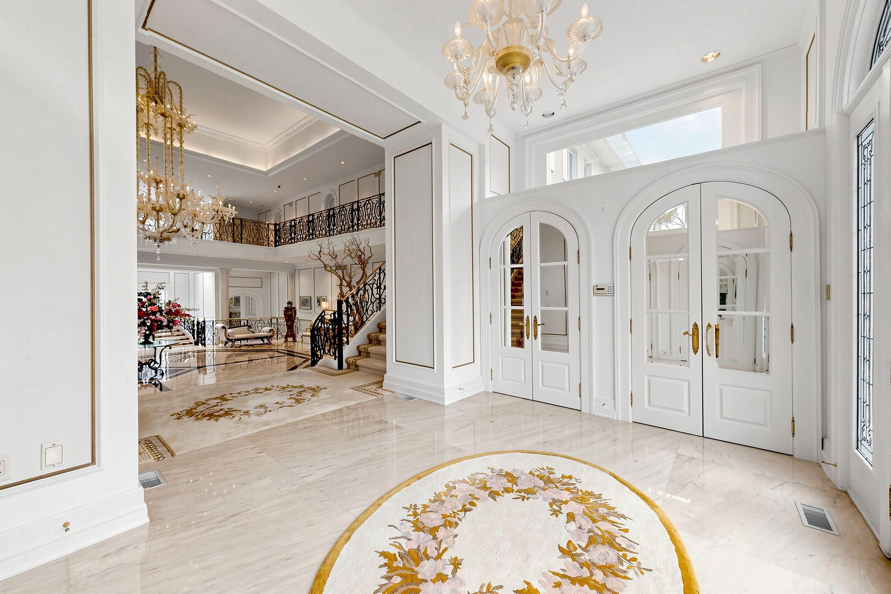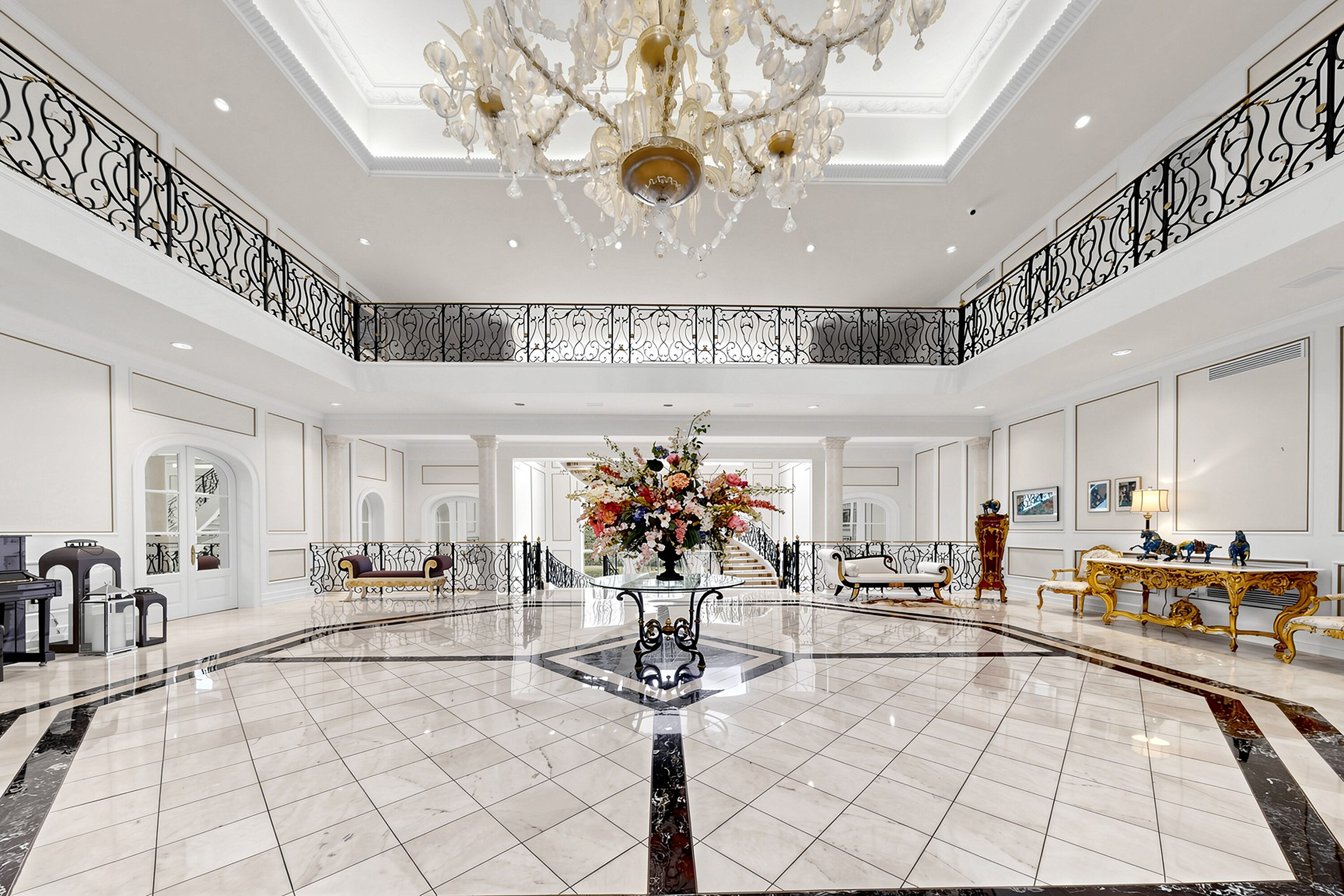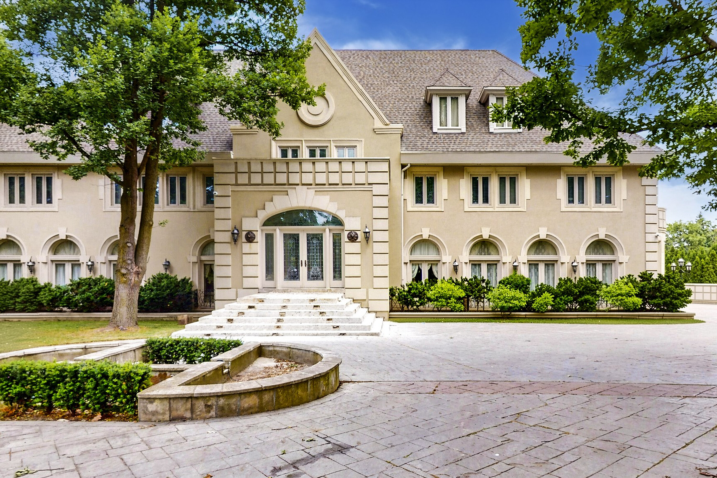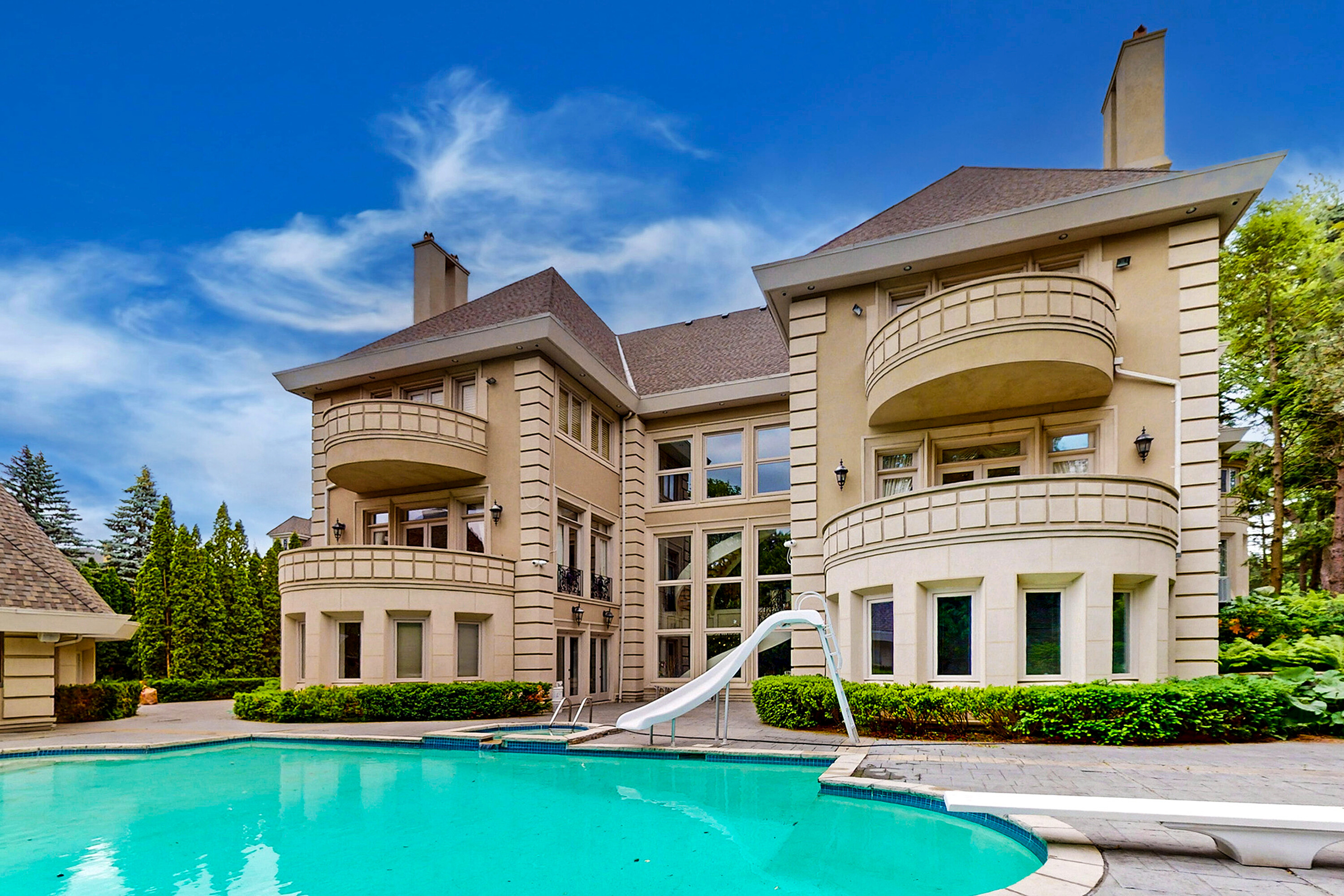 52 Post Road stands as one of the most distinguished European Neoclassical architectural masterpieces in the Bridle Path, Canada’s most prestigious residential enclave. Spanning over 25,000 square feet, this gated estate is widely regarded as a "Modern Grand Mansion'' of remarkable scale and presence, seamlessly blending classical symmetry with refined contemporary elegance. Grand high arched doorways, intricately patterned marble floors and millwork, sweeping staircases with ornate wrought iron railings, and monumental architectural proportions establish enduring sophistication and a regal arrival experience. Evoking a Versailles inspired grandeur, the interiors showcase 14 foot and 23 foot soaring ceilings, dramatic stair halls and windows, and dazzling chandeliers that cast a warm, luminous glow throughout. Approximately 15,000 square feet above grade includes an unparalleled 300 guest ballroom, 5 + 2 generously appointed bedrooms, 13 bathrooms, and three kitchens. The approximately 7,500 square foot lower level is thoughtfully designed for comprehensive leisure and entertaining amenities, featuring a wellness spa, sauna and hot tub, fitness centre, wine cellar, and an extensive billiard room hosting multiple games. A tunnel connected coach house offers approximately 2,500 square feet of interior space and a five car garage. Sculptural three dimensional walls gracefully wrap around a private courtyard, creating a striking focal point. Dramatic three-storey floor to ceiling windows frame serene garden and pool views, cultivating an intimate dialogue between interior and nature. The resort inspired backyard features an outdoor pool with a pool house, a private tennis court, and a children’s playground set along an expansive lawn and tree lined tranquil pathway. Set among an extraordinary collection of luxury estates in the Bridle Path, this exceptional location is surrounded by elite public and private schools, the renowned Granite Club, and Sunnybrook Health Sciences Centre. A rare offering defined by prestige, privacy, and an elevated lifestyle in the heart of the city.