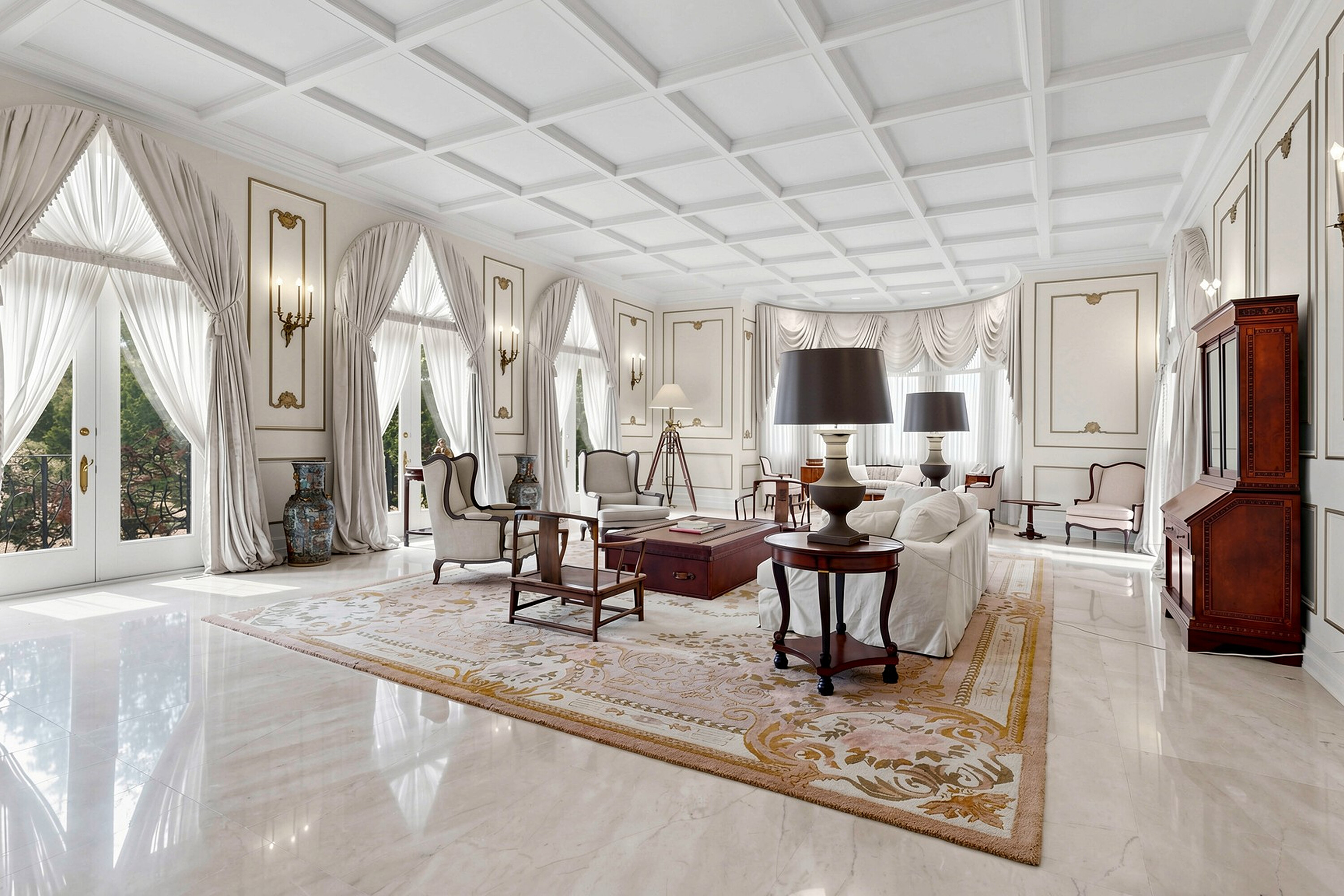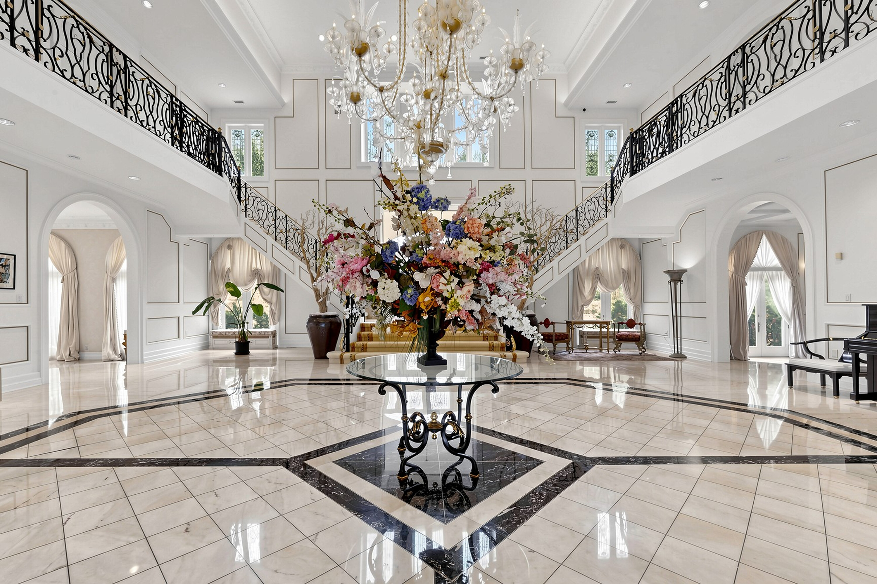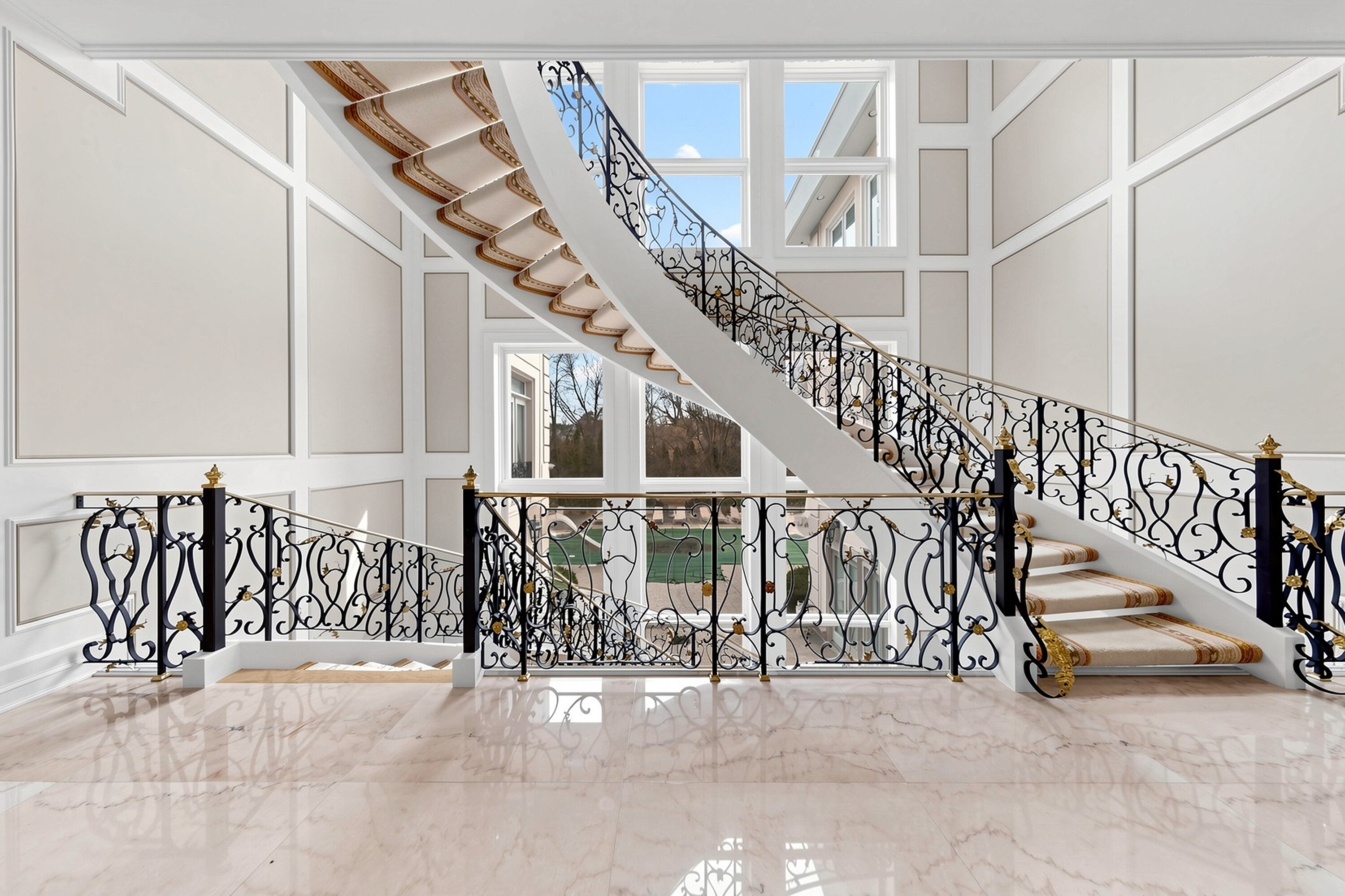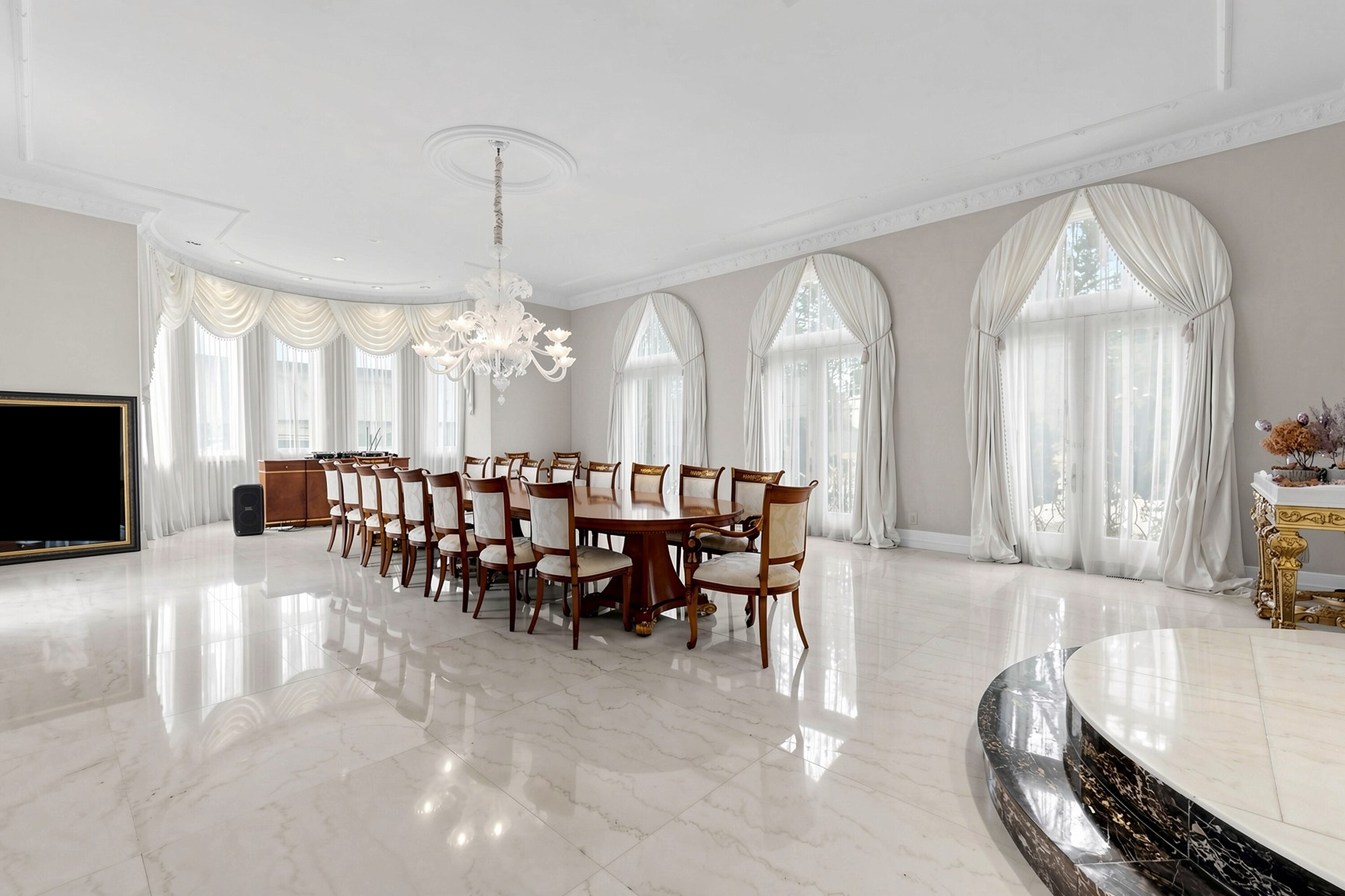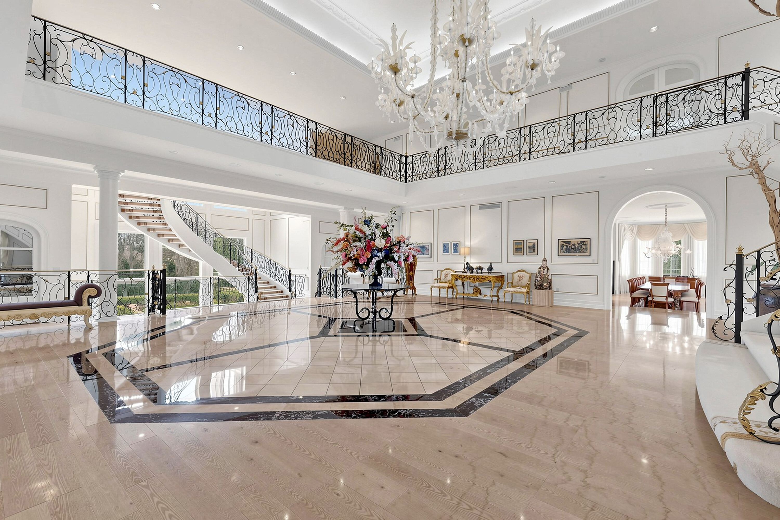 52 Post Road stands as one of the most distinguished European Neoclassical architectural masterpieces in the Bridle Path, Canada’s most prestigious residential enclave. Spanning over 25,000 square feet, this gated estate is widely regarded as a "Modern Grand Mansion'' of remarkable scale and presence, seamlessly blending classical symmetry with refined contemporary elegance. Grand high arched doorways, intricately patterned marble floors and millwork, sweeping staircases with ornate wrought iron railings, and monumental architectural proportions establish enduring sophistication and a regal arrival experience. Evoking a Versailles inspired grandeur, the interiors showcase 14 foot and 23 foot soaring ceilings, dramatic stair halls and windows, and dazzling chandeliers that cast a warm, luminous glow throughout. Approximately 15,000 square feet above grade includes an unparalleled 300 guest ballroom, 5 + 2 generously appointed bedrooms, 13 bathrooms, and three kitchens. The approximately 7,500 square foot lower level is thoughtfully designed for comprehensive leisure and entertaining amenities, featuring a wellness spa, sauna and hot tub, fitness centre, wine cellar, and an extensive billiard room hosting multiple games. A tunnel connected coach house offers approximately 2,500 square feet of interior space and a five car garage. Sculptural three dimensional walls gracefully wrap around a private courtyard, creating a striking focal point. Dramatic three-storey floor to ceiling windows frame serene garden and pool views, cultivating an intimate dialogue between interior and nature. The resort inspired backyard features an outdoor pool with a pool house, a private tennis court, and a children’s playground set along an expansive lawn and tree lined tranquil pathway. Set among an extraordinary collection of luxury estates in the Bridle Path, this exceptional location is surrounded by elite public and private schools, the renowned Granite Club, and Sunnybrook Health Sciences Centre. A rare offering defined by prestige, privacy, and an elevated lifestyle in the heart of the city.