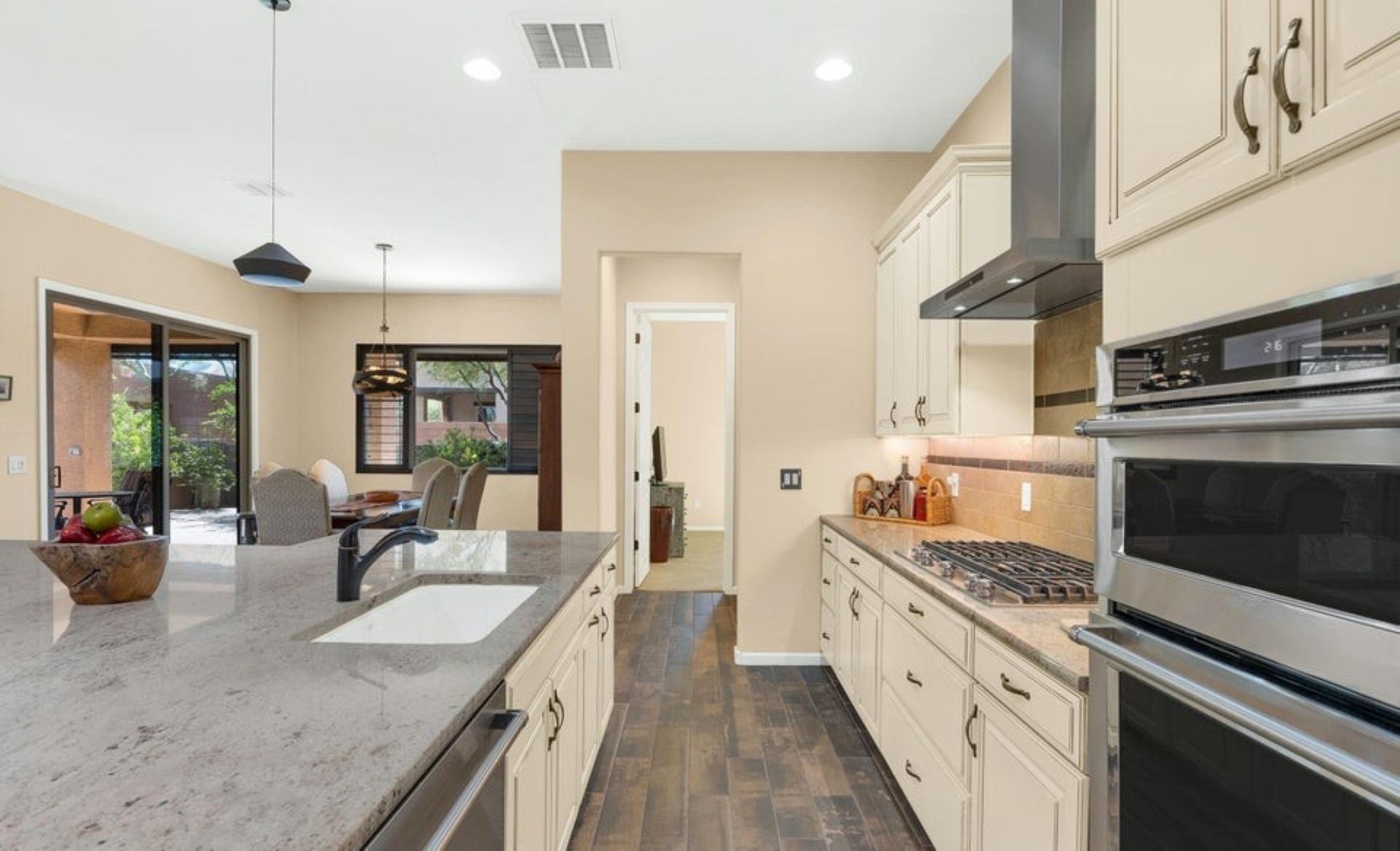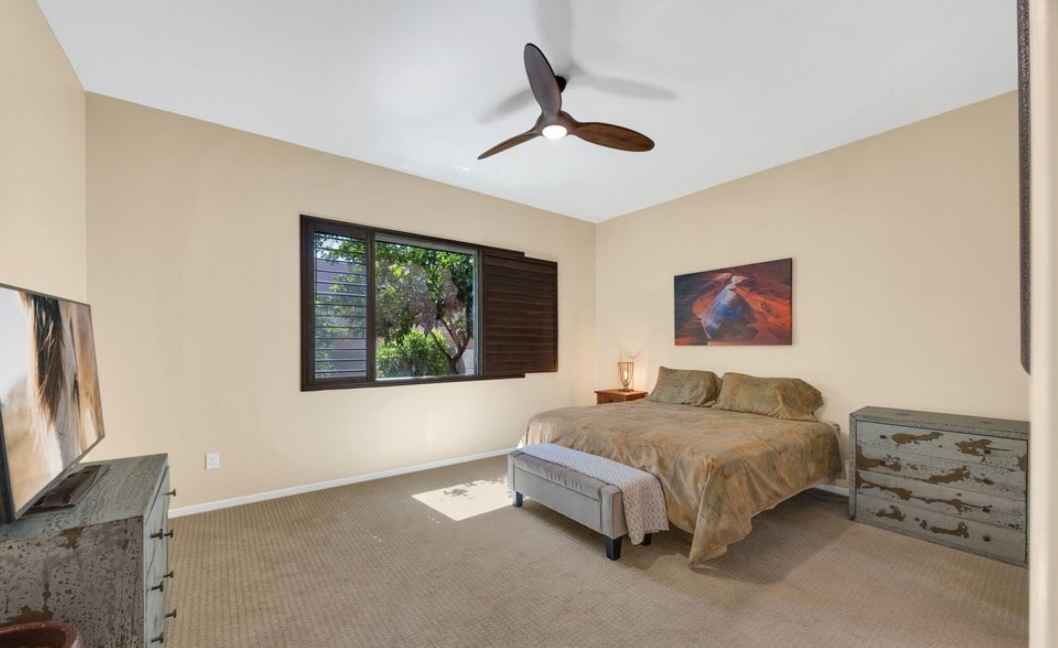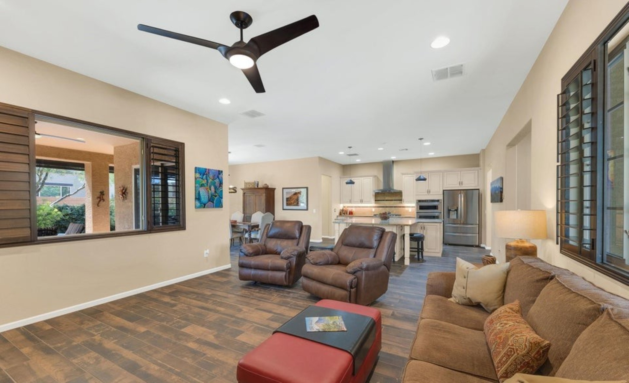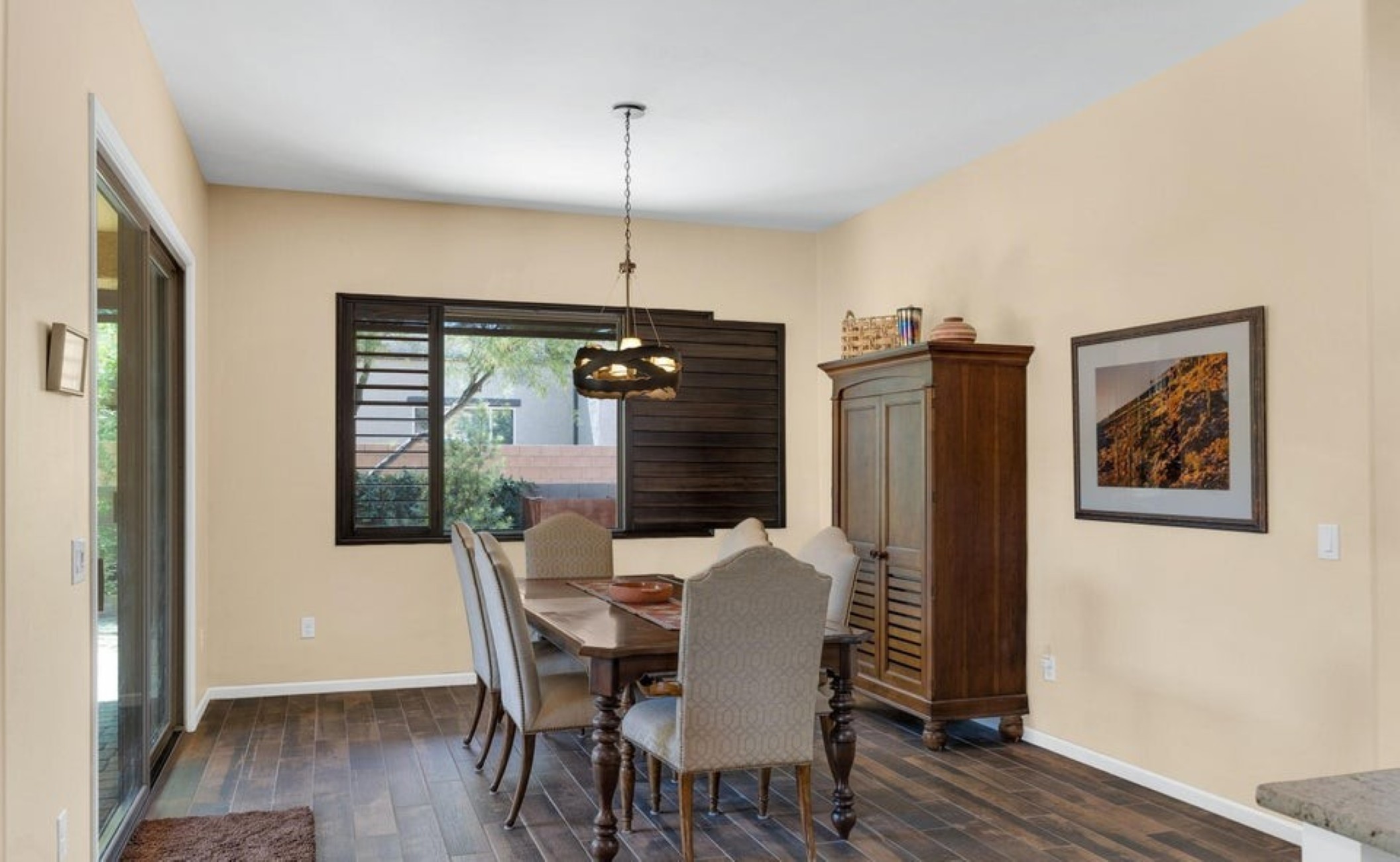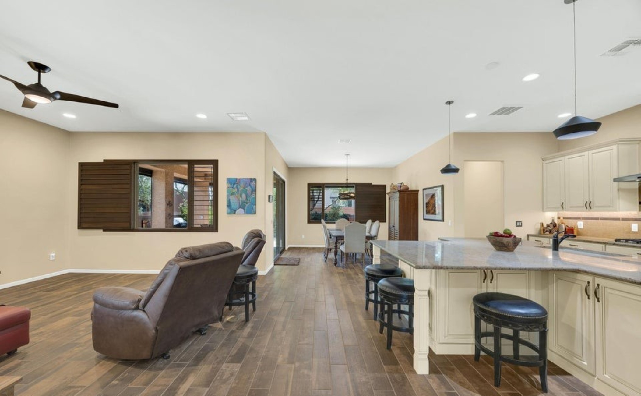 Two Bedroom, Two Bathroom townhome positioned within Ridgeview gated community on an interior lot, this home offers a sense of space and light not often found. With only one adjoining neighbor it has a more open, airy feel. A wraparound front porch invites slow mornings--sunrise, mountain views, and a quiet moment to begin the day. Just across from the community pool and spa, the location balances ease with livability. Inside, the home unfolds around an expanded island, at the natural center--designed for gathering, conversation, and everyday living, and distinct within the community. KitchenAid stainless appliances include a built-in convection oven and gas 5-burner range, complemented by a 2025 LG refrigerator, Kashmir cream granite, upgraded cabinetry, and a walk-in pantry. Custom Wood Interior Shutters throughout. Ceramic tile flooring carries through the main living areas, with carpet only in the primary suite, which offers a walk-in shower with dual shower heads.Outdoor living is equally considered, with hand-laid pavers, mature various fruit trees, an extended covered patio, and custom electric sunscreens creating a flexible indoor-outdoor environment. Additional highlights include a custom wrought iron security door, spacious laundry room with sink and cabinetry, garage storage solutions, and a roof recoated in 2024. Turn-key option available.