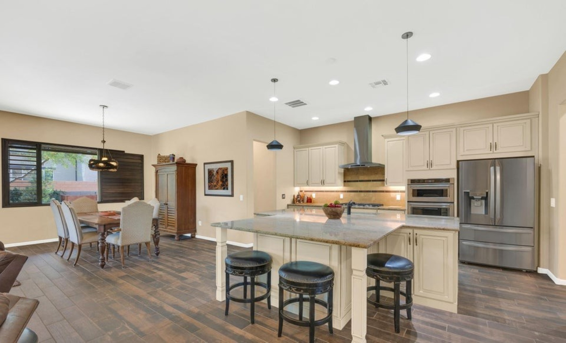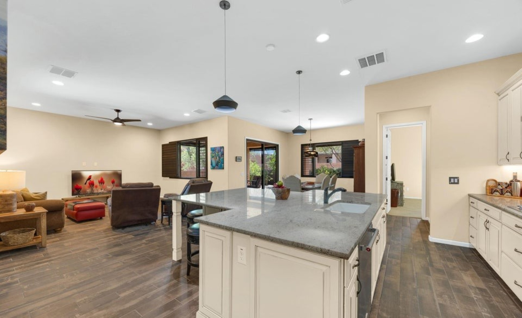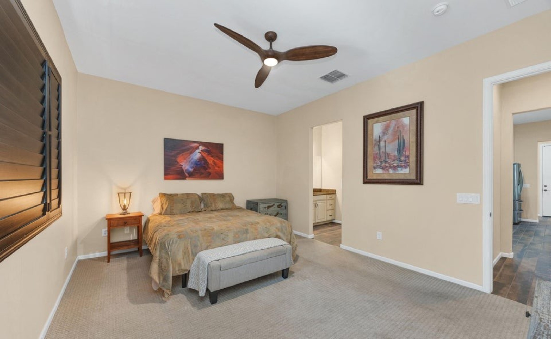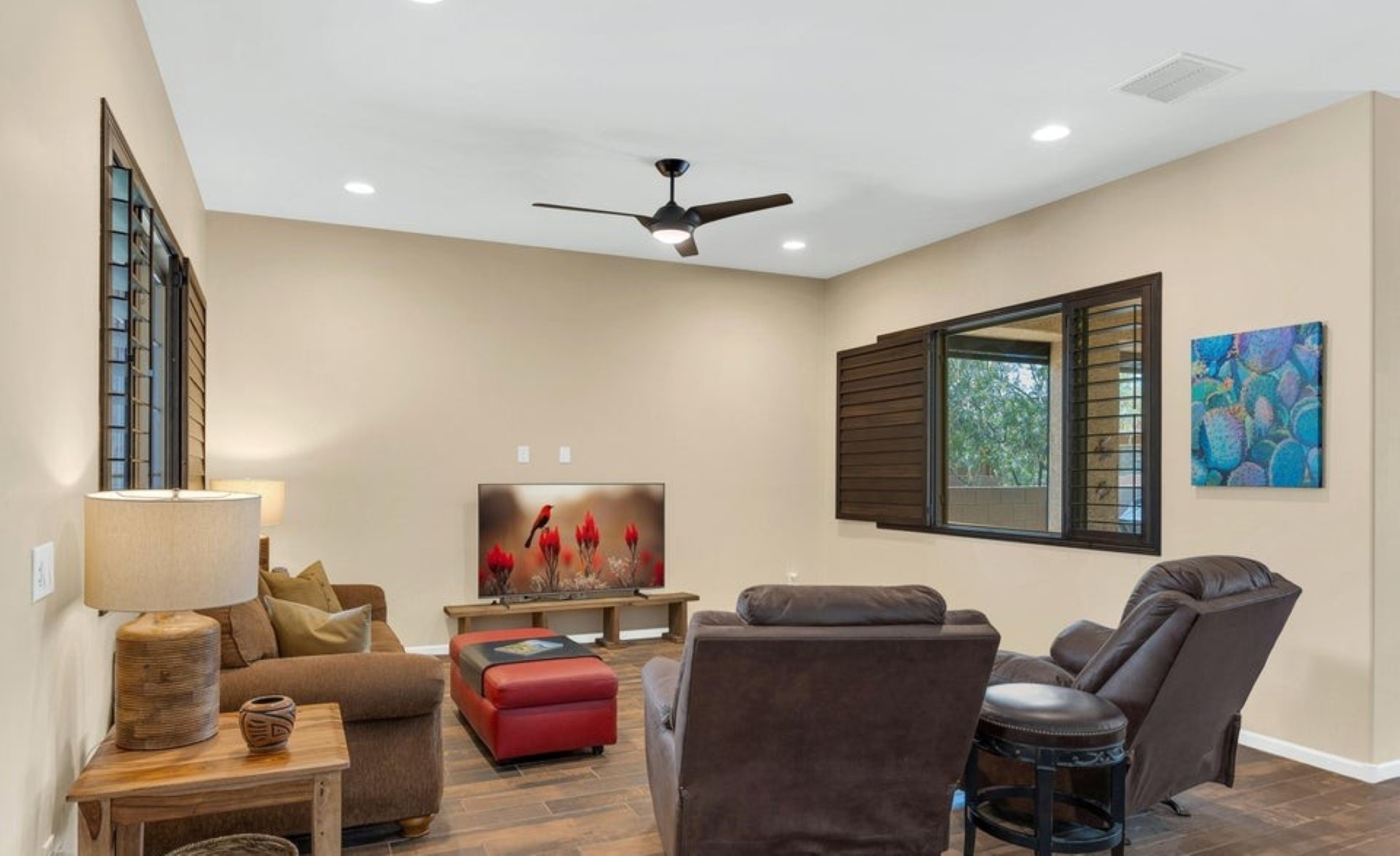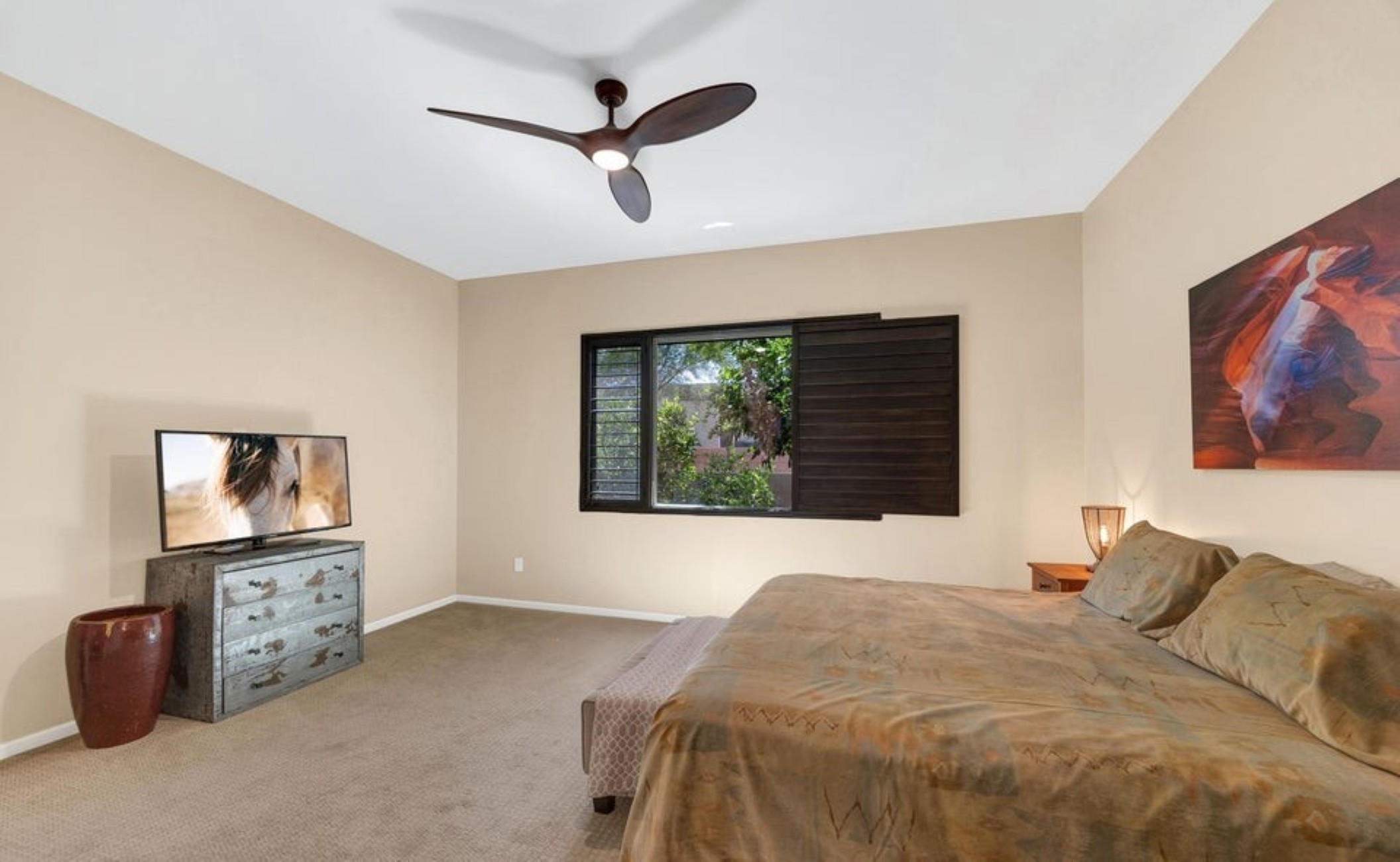 Two Bedroom, Two Bathroom townhome positioned within Ridgeview gated community on an interior lot, this home offers a sense of space and light not often found. With only one adjoining neighbor it has a more open, airy feel. A wraparound front porch invites slow mornings--sunrise, mountain views, and a quiet moment to begin the day. Just across from the community pool and spa, the location balances ease with livability. Inside, the home unfolds around an expanded island, at the natural center--designed for gathering, conversation, and everyday living, and distinct within the community. KitchenAid stainless appliances include a built-in convection oven and gas 5-burner range, complemented by a 2025 LG refrigerator, Kashmir cream granite, upgraded cabinetry, and a walk-in pantry. Custom Wood Interior Shutters throughout. Ceramic tile flooring carries through the main living areas, with carpet only in the primary suite, which offers a walk-in shower with dual shower heads.Outdoor living is equally considered, with hand-laid pavers, mature various fruit trees, an extended covered patio, and custom electric sunscreens creating a flexible indoor-outdoor environment. Additional highlights include a custom wrought iron security door, spacious laundry room with sink and cabinetry, garage storage solutions, and a roof recoated in 2024. Turn-key option available.