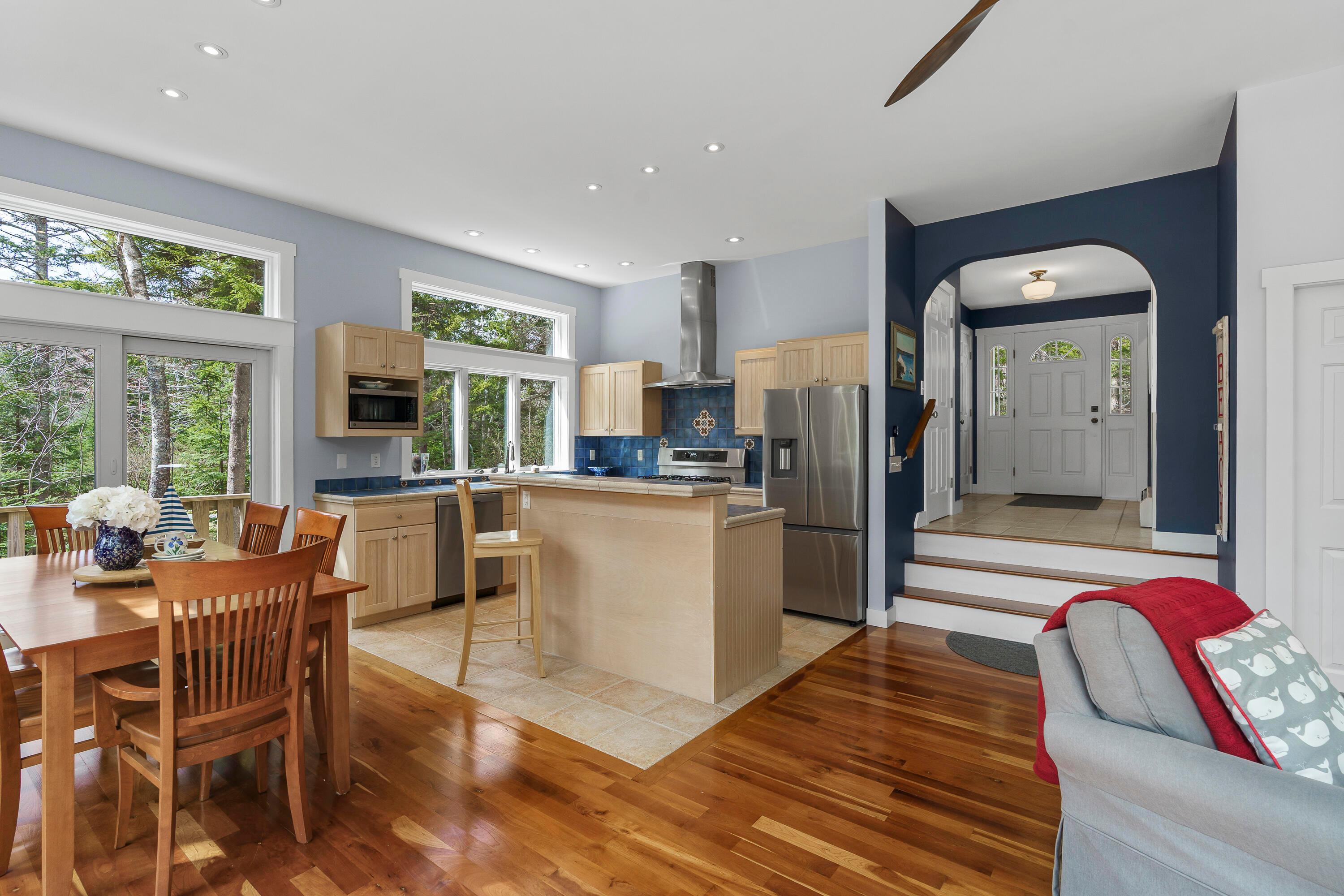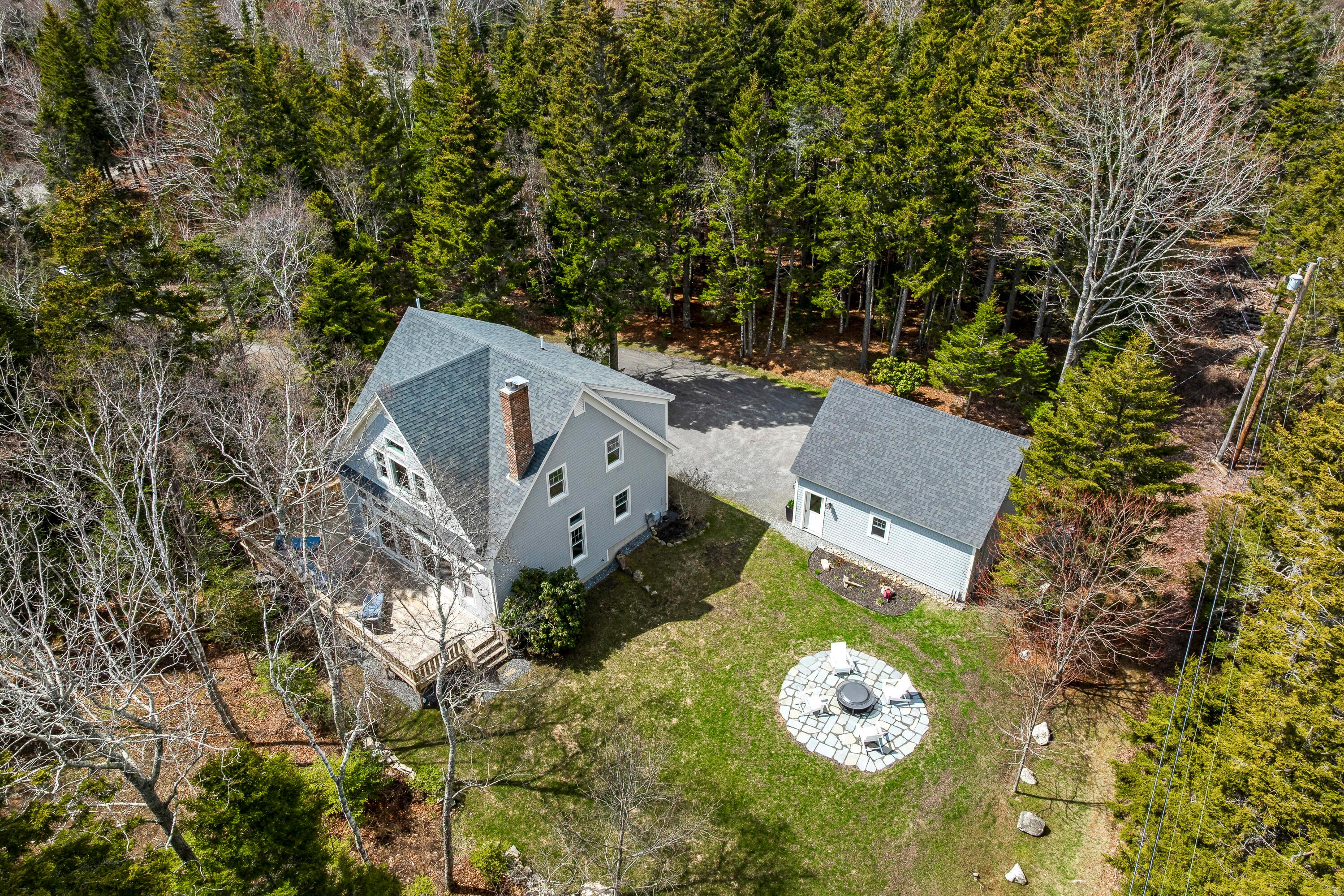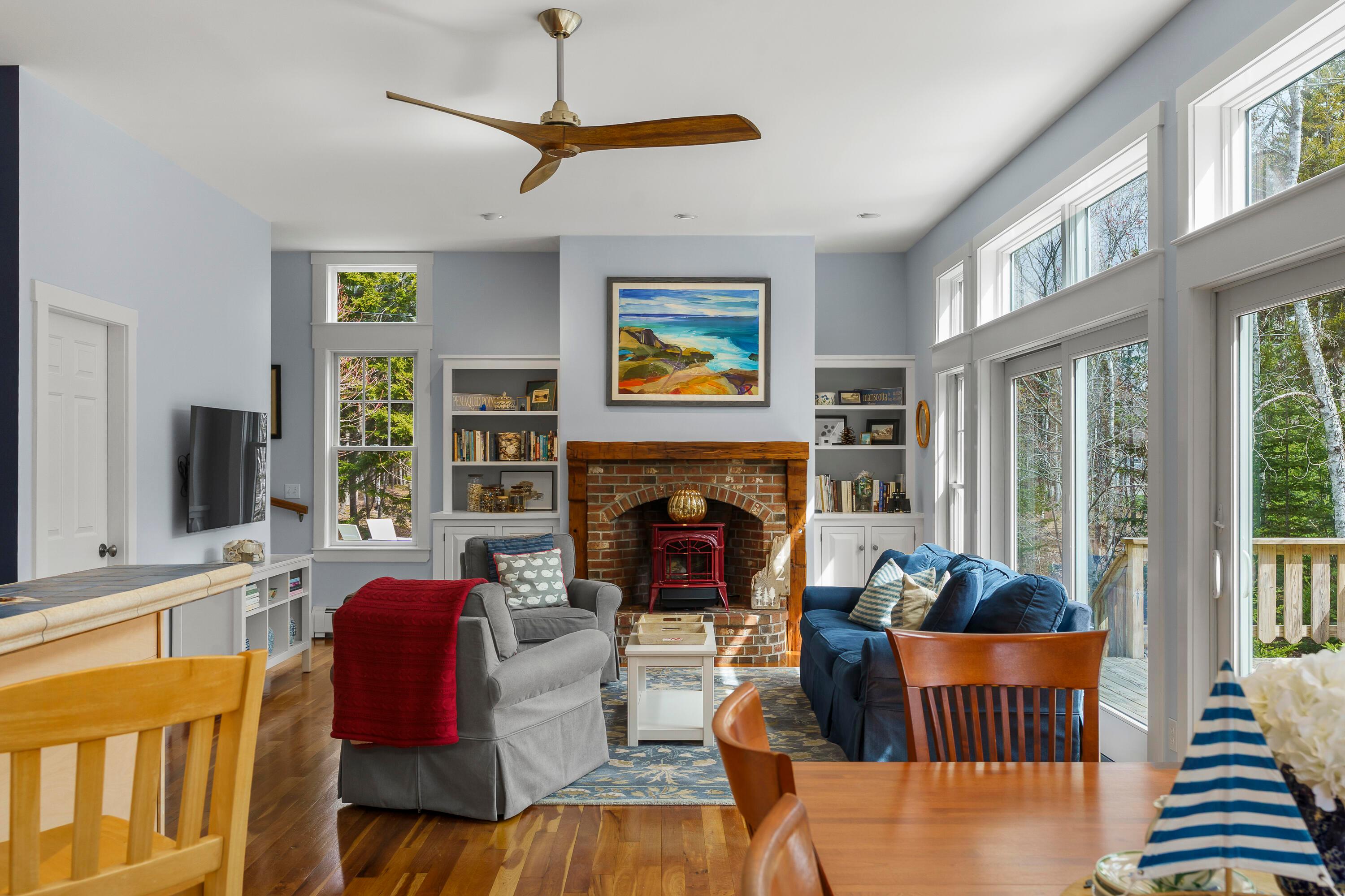 A rare opportunity to own a home in the highly sought-after Pumpkin Cove neighborhood in Bristol, this charming residence offers a deeded right-of-way to the picturesque shores of Pumpkin Cove. Built in 2003, the home is thoughtfully designed with an open floor plan, soaring ceilings, and dramatic floor-to-ceiling windows that fill the interiors with natural light, creating an airy and inviting atmosphere. Rich cherry flooring, a Vermont Castings gas fireplace, and a sunlit kitchen with new appliances create a warm yet refined setting ideal for both everyday living and entertaining. An expansive deck extends the living space outdoors, overlooking a private, semi-wooded landscape. The recently expanded lawn and stone patio with fire pit area provide a perfect gathering place, where the scent of ocean air and the sound of waves enhance the coastal experience. The second-floor primary suite offers a serene retreat, featuring a luxurious full bath with a custom designed oversized shower finished with artisan tile and a spacious walk-in closet by Tailored Closets. Flexible layout with 1st floor Bedroom and 2nd floor Bedroom/Office. The home has been meticulously maintained and thoughtfully updated, including fresh interior paint, new luxury carpeting in all bedrooms, and the addition of a whole-house Cummins generator. A recently constructed two-car garage with generous attic space above offers exceptional storage or potential for studio use. Equally suited as a year-round residence, vacation getaway, or investment property, the home has a strong history as a successful summer rental. Set within a small neighborhood of similarly well-kept homes, it offers an easy walk to this quiet dead end road with shared beach perfect for kayaking, picnics, or enjoying sweeping views toward Monhegan Island and sea birds. Just minutes to Pemaquid Lighthouse Park, Pemaquid Beach, a local grocer, art galleries, and restaurants. This home is truly turn-key.