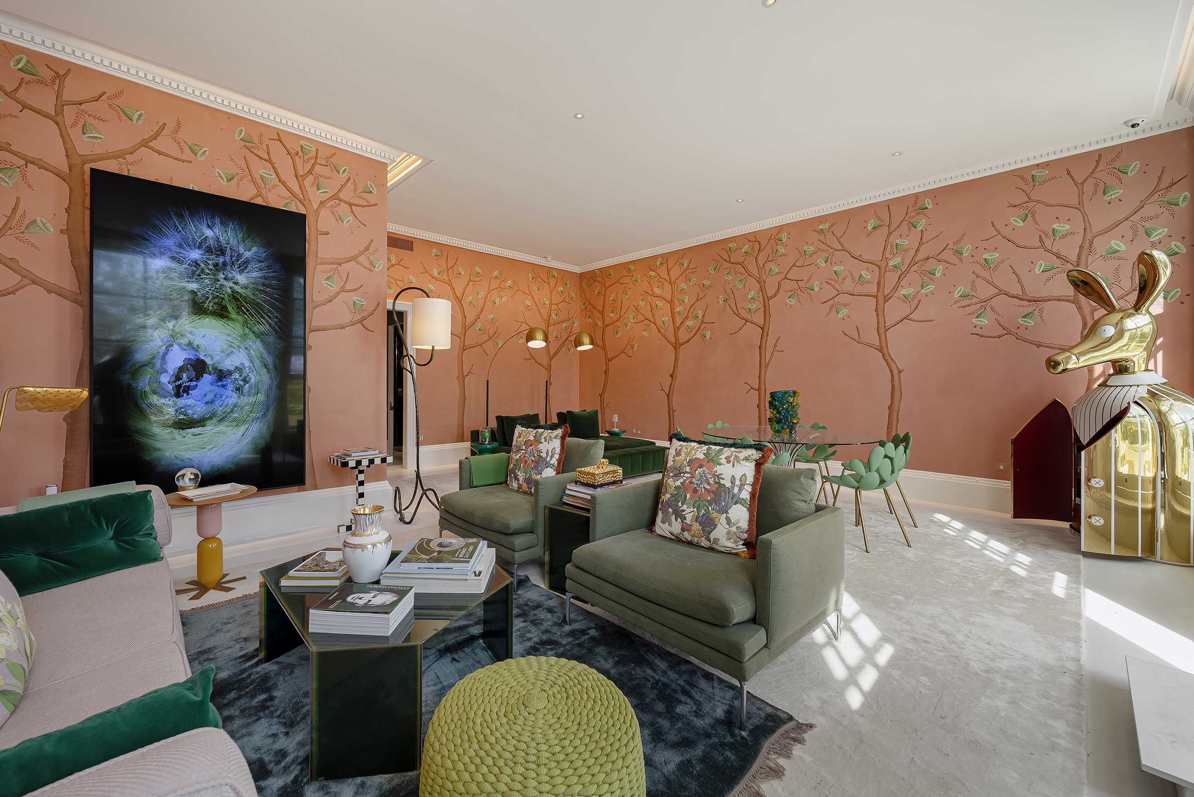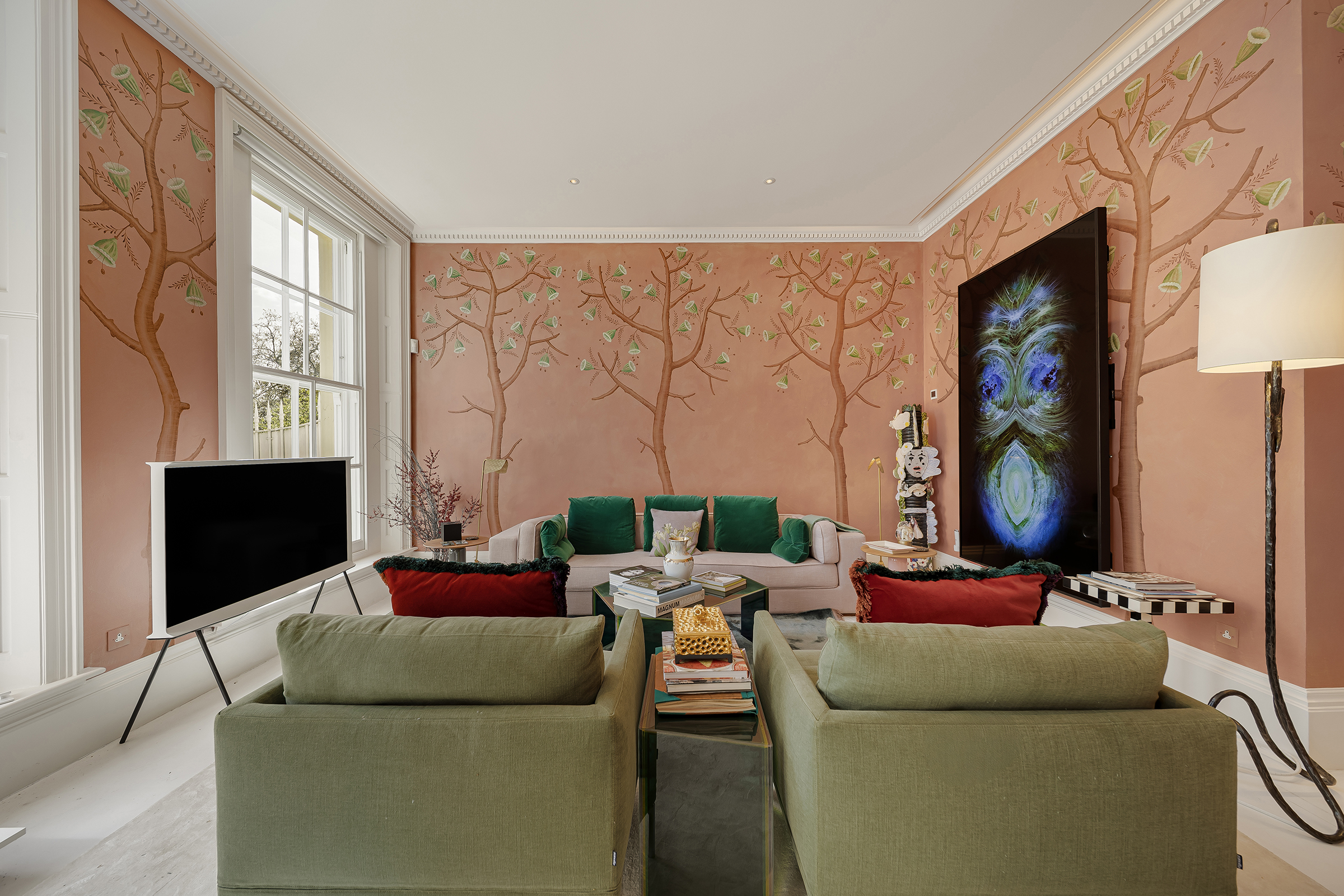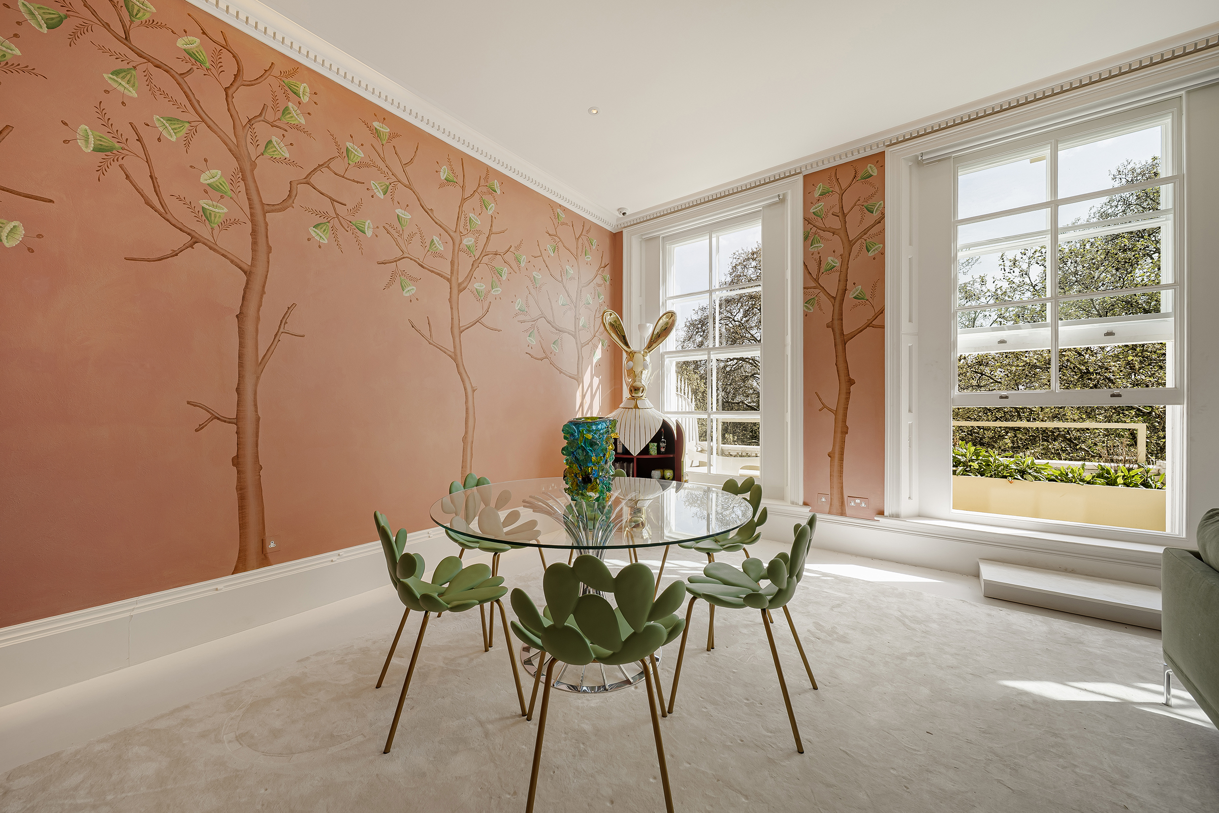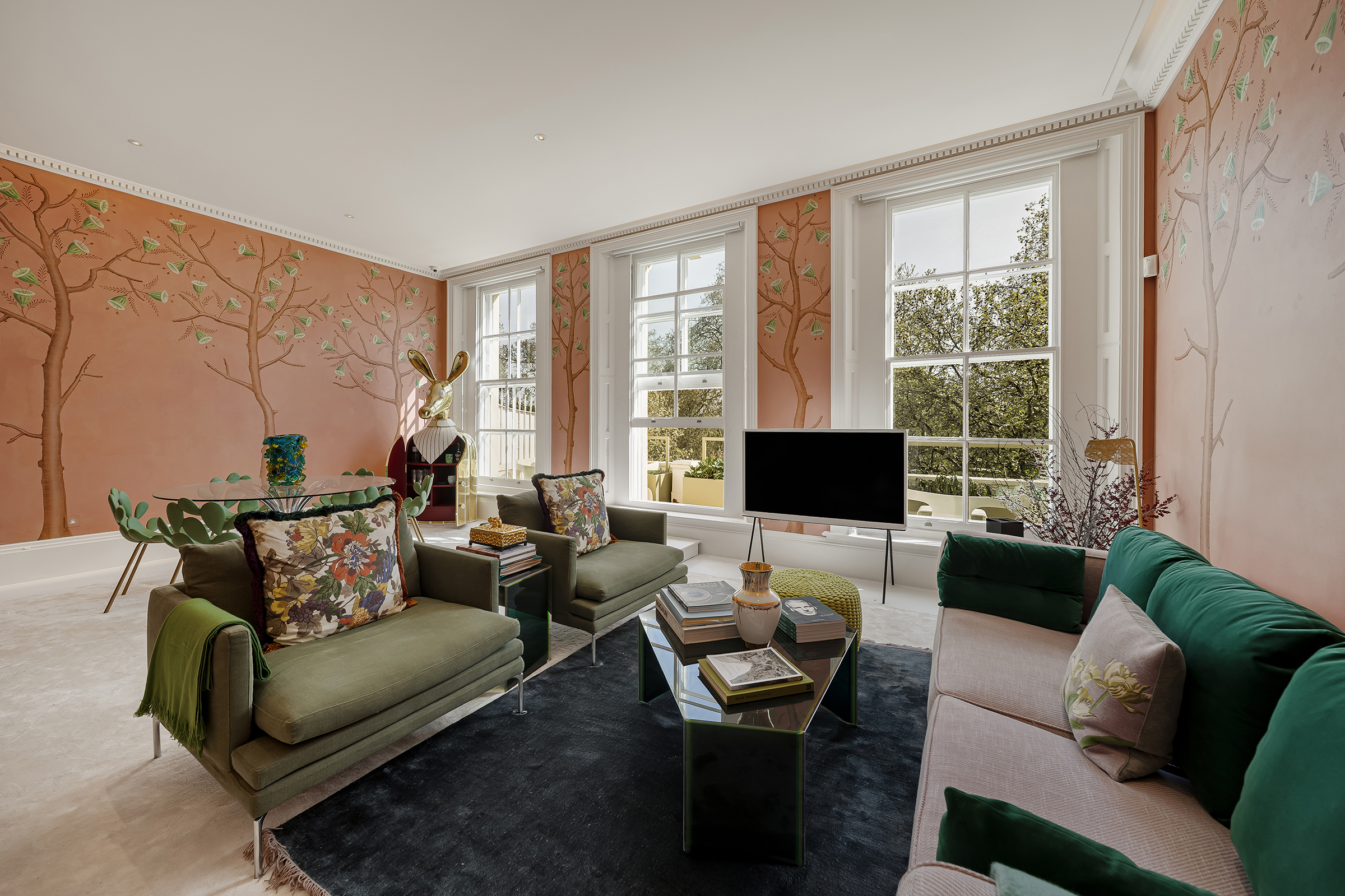 Extending to approximately 1,748 sq ft, the apartment is reached by lift and unfolds across a lateral layout that is both elegant and easy to live in. At its heart is an impressive reception room of remarkable volume, with ceiling heights of over 10ft, tall sash windows and direct access to a private terrace overlooking the park. The proportions are classic, but the interiors feel spirited and individual, with decorative finishes and bold colour lending the space a sense of personality that sets it apart from more conventional lateral apartments in this part of Bayswater.