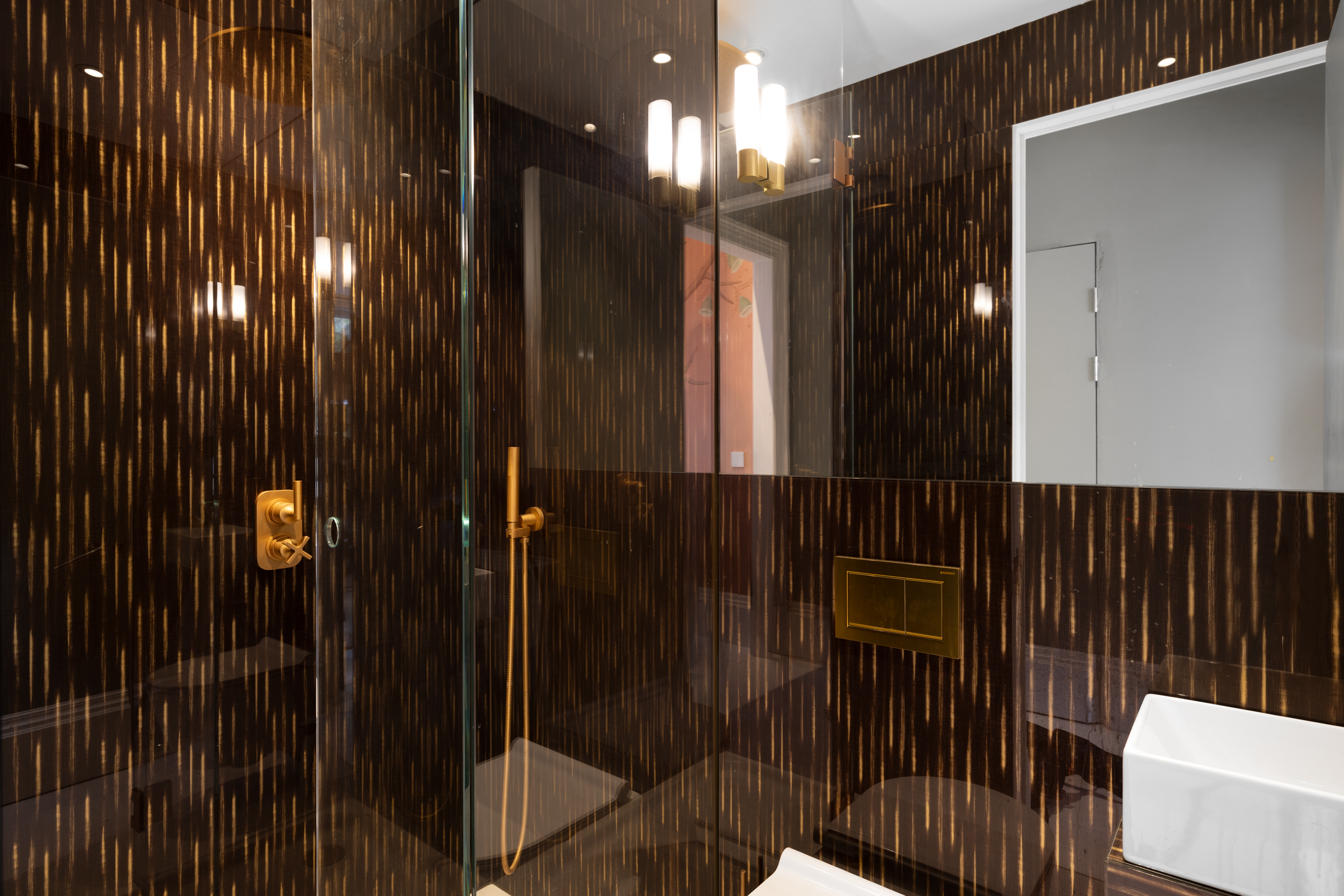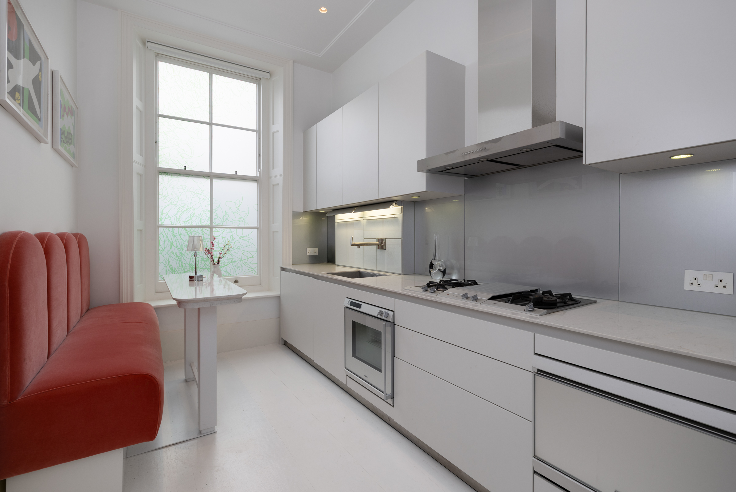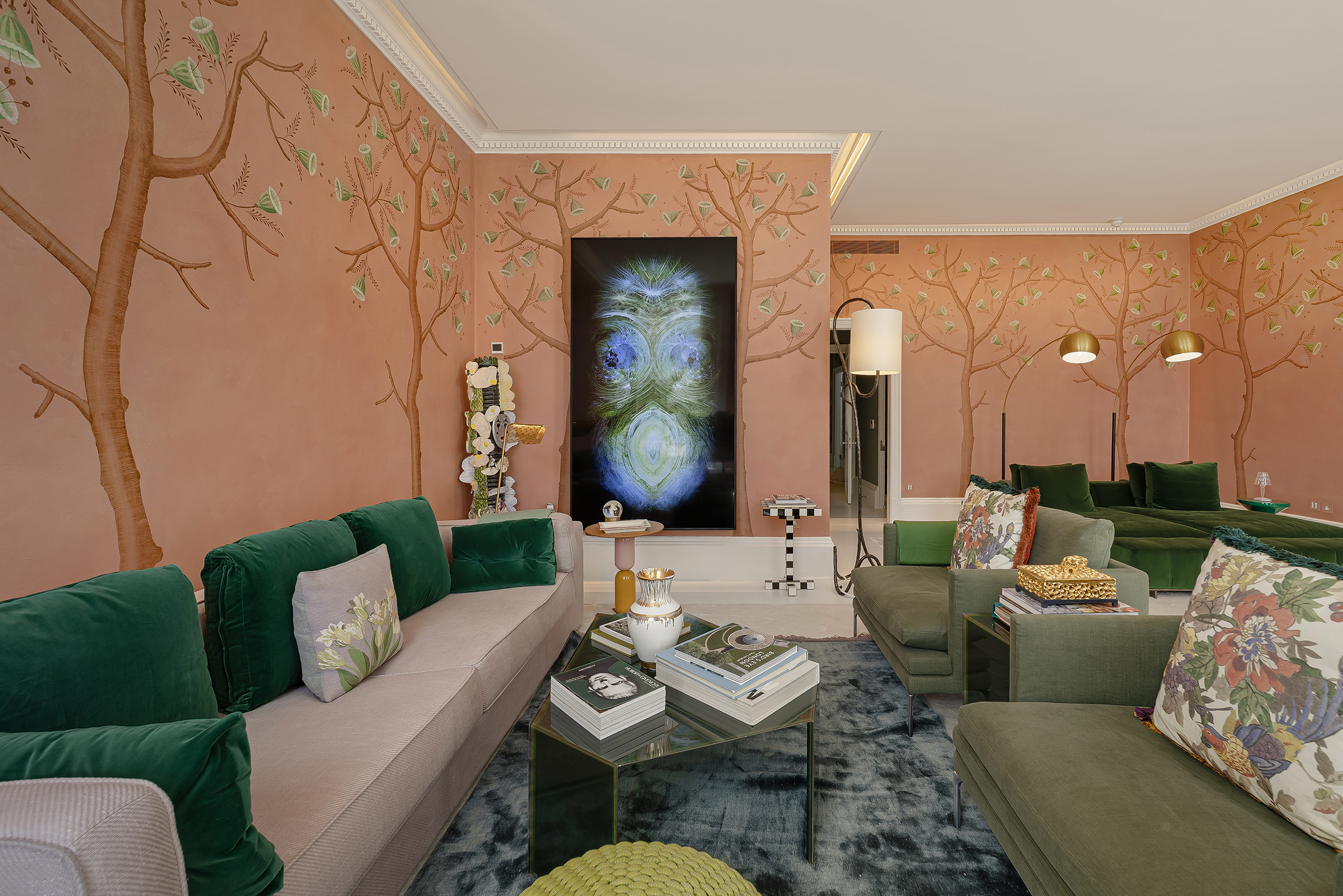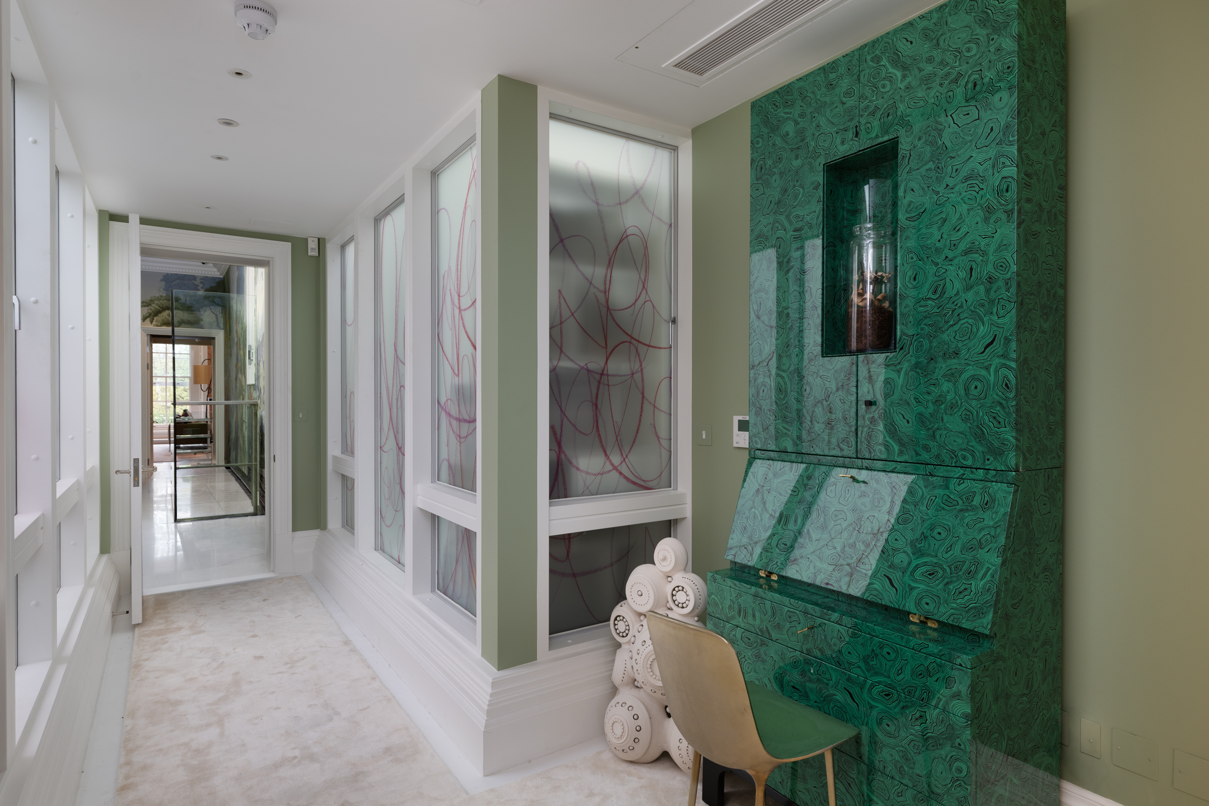 Extending to approximately 1,748 sq ft, the apartment is reached by lift and unfolds across a lateral layout that is both elegant and easy to live in. At its heart is an impressive reception room of remarkable volume, with ceiling heights of over 10ft, tall sash windows and direct access to a private terrace overlooking the park. The proportions are classic, but the interiors feel spirited and individual, with decorative finishes and bold colour lending the space a sense of personality that sets it apart from more conventional lateral apartments in this part of Bayswater.