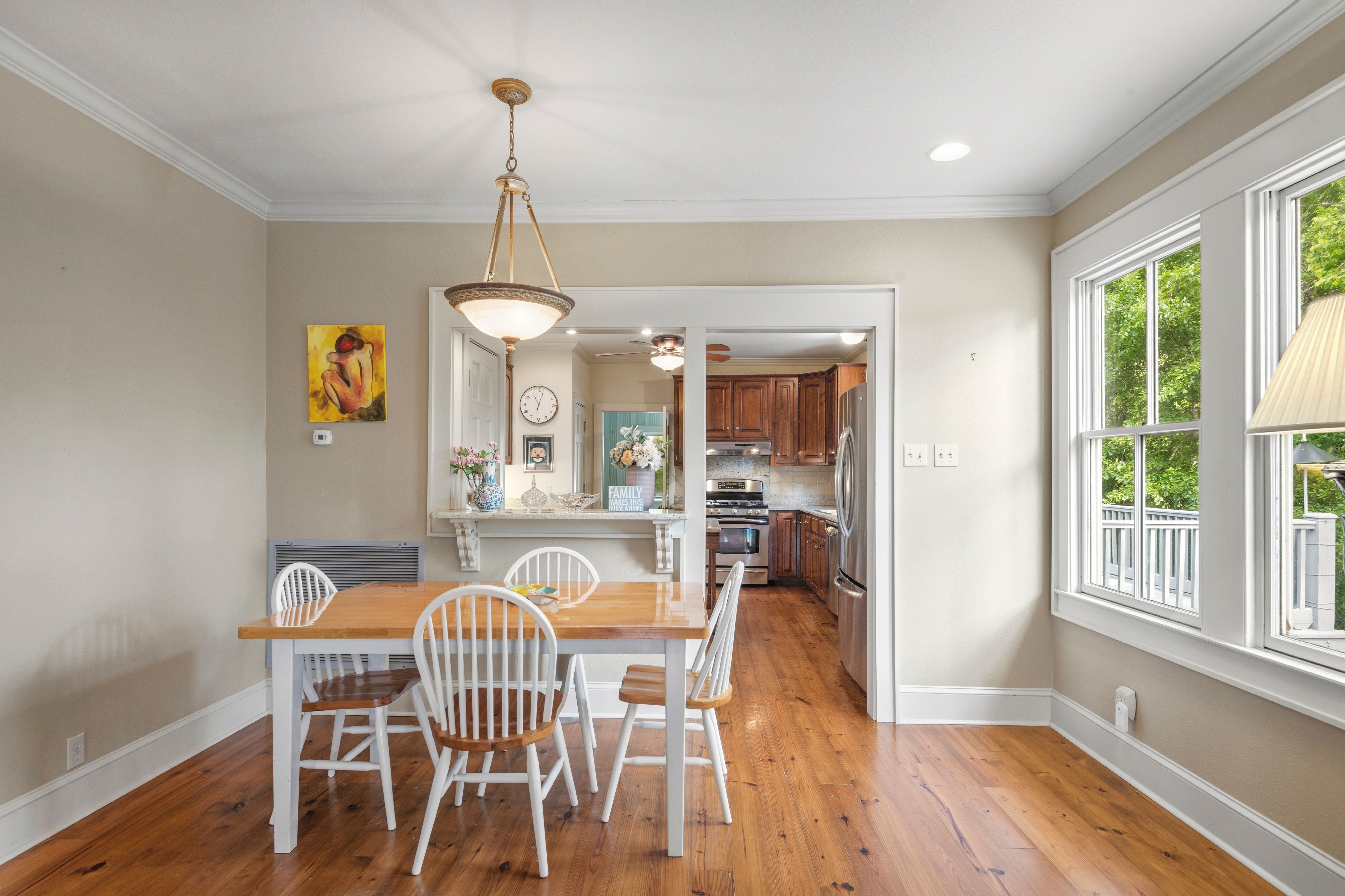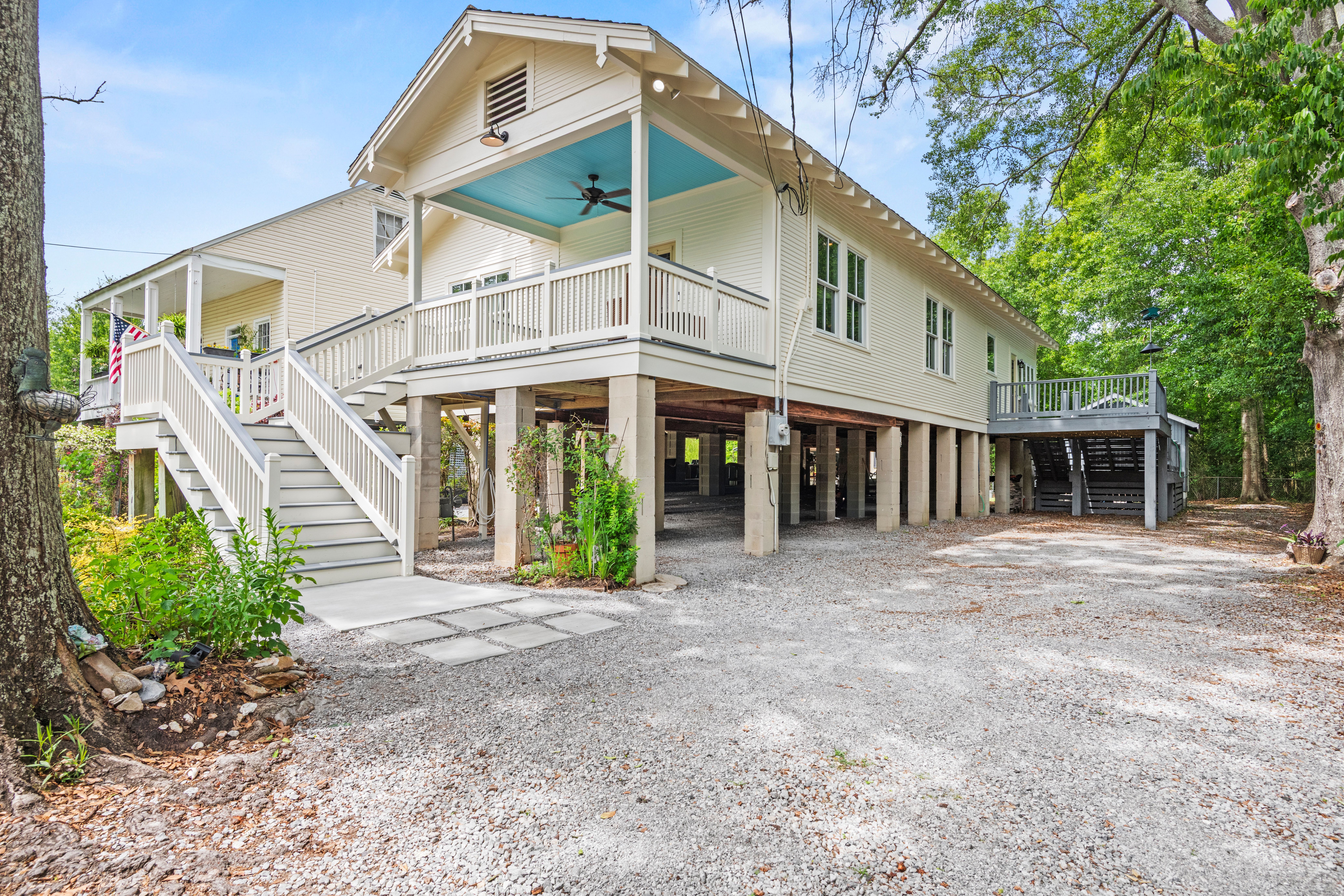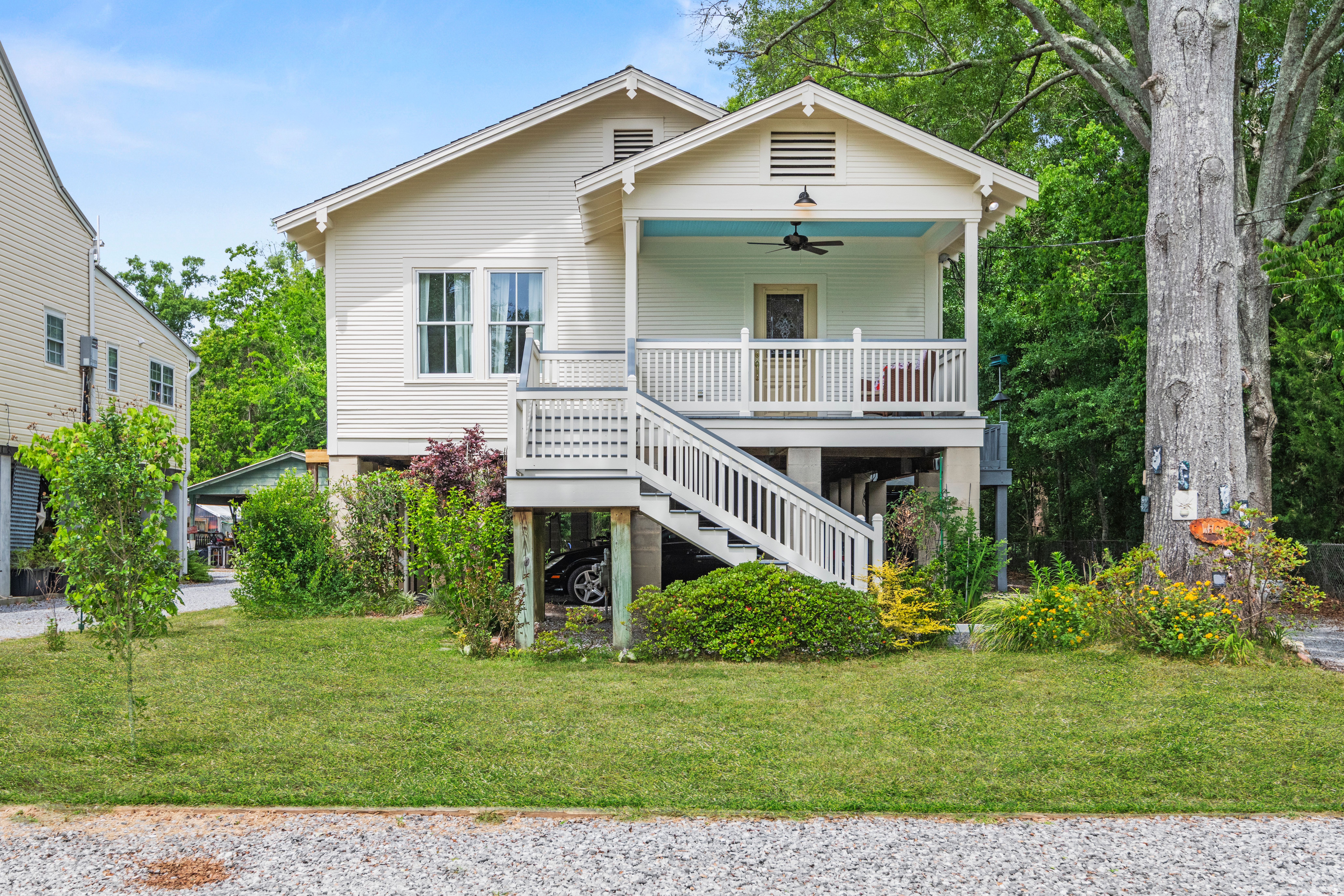 This charming 3-bedroom, 2-bath raised cottage is perfectly situated in the heart of historic downtown Mandeville, just two blocks from the lakefront. Blending classic character with everyday comfort, the home welcomes you with warm hardwood floors and a seamless, easy flow from the entryway through the living, dining, kitchen, and sunroom spaces. The spacious kitchen is a standout, offering abundant storage, generous countertop space, and stainless steel appliances—ideal for both everyday living and entertaining. Natural light fills the interiors, enhancing the inviting atmosphere and making each room feel connected yet distinct. The layout is perfectly suited for relaxed living or hosting guests. Outdoor spaces are just as appealing, with a delightful front porch that captures the charm of the neighborhood and an expansive back deck designed for entertaining, dining, or simply enjoying quiet evenings. This home offers the perfect balance of location, character, and livability.