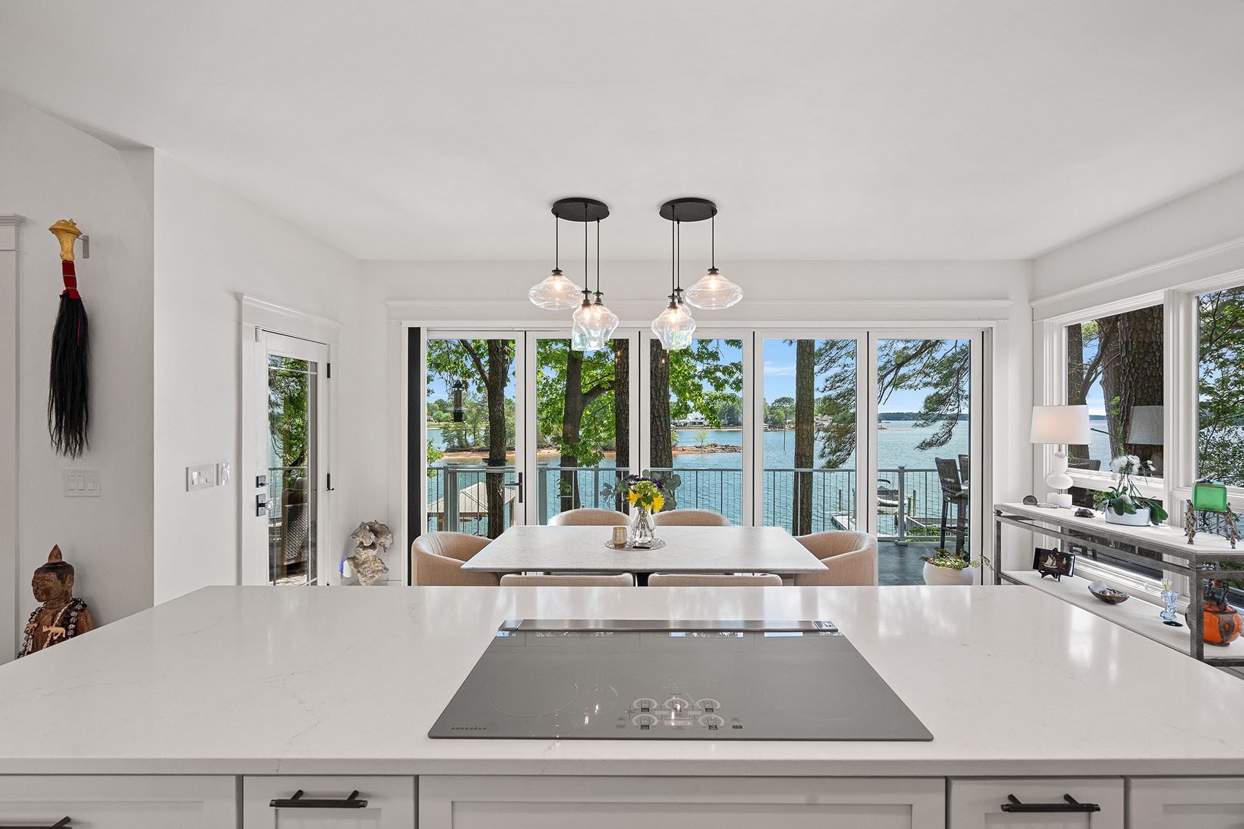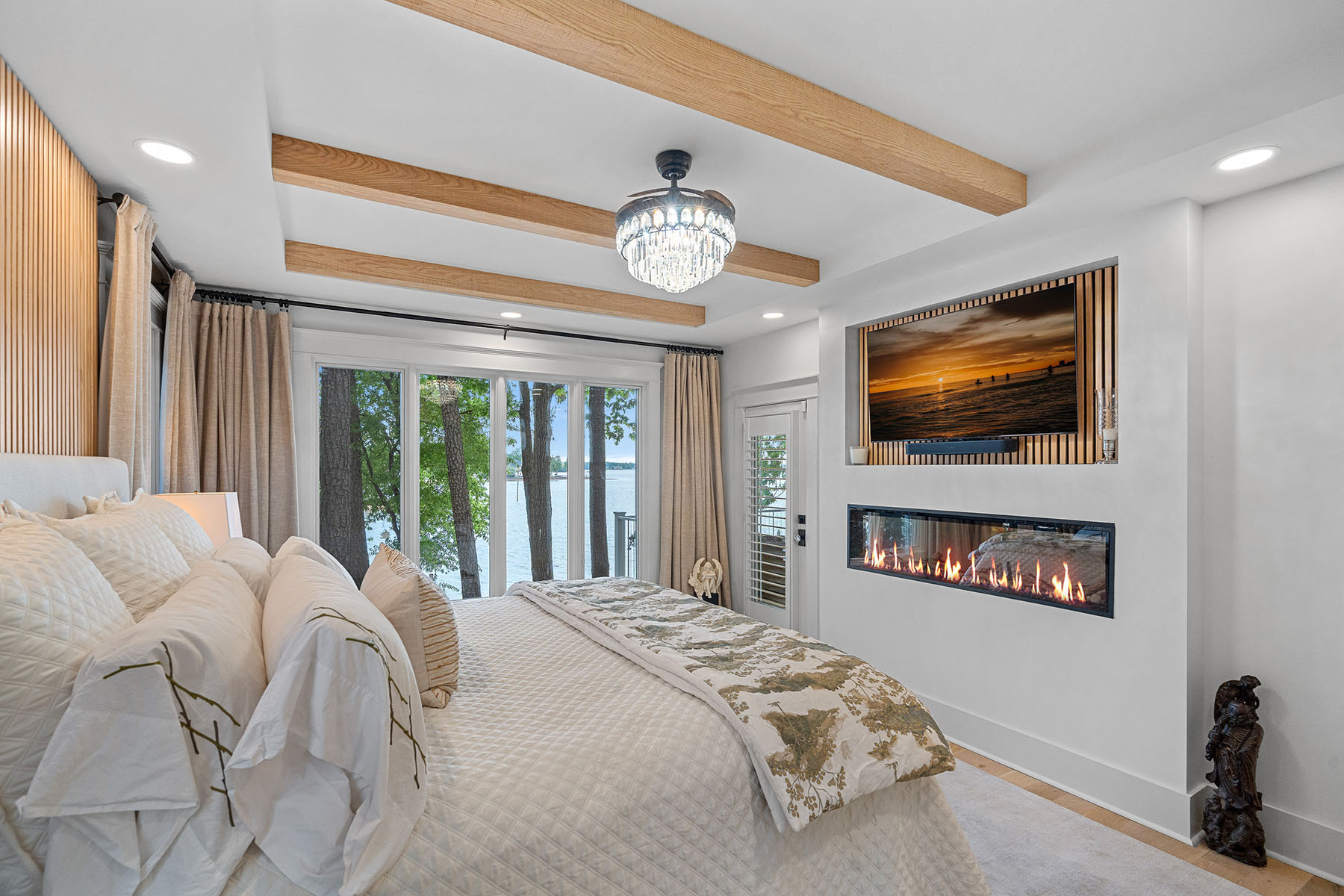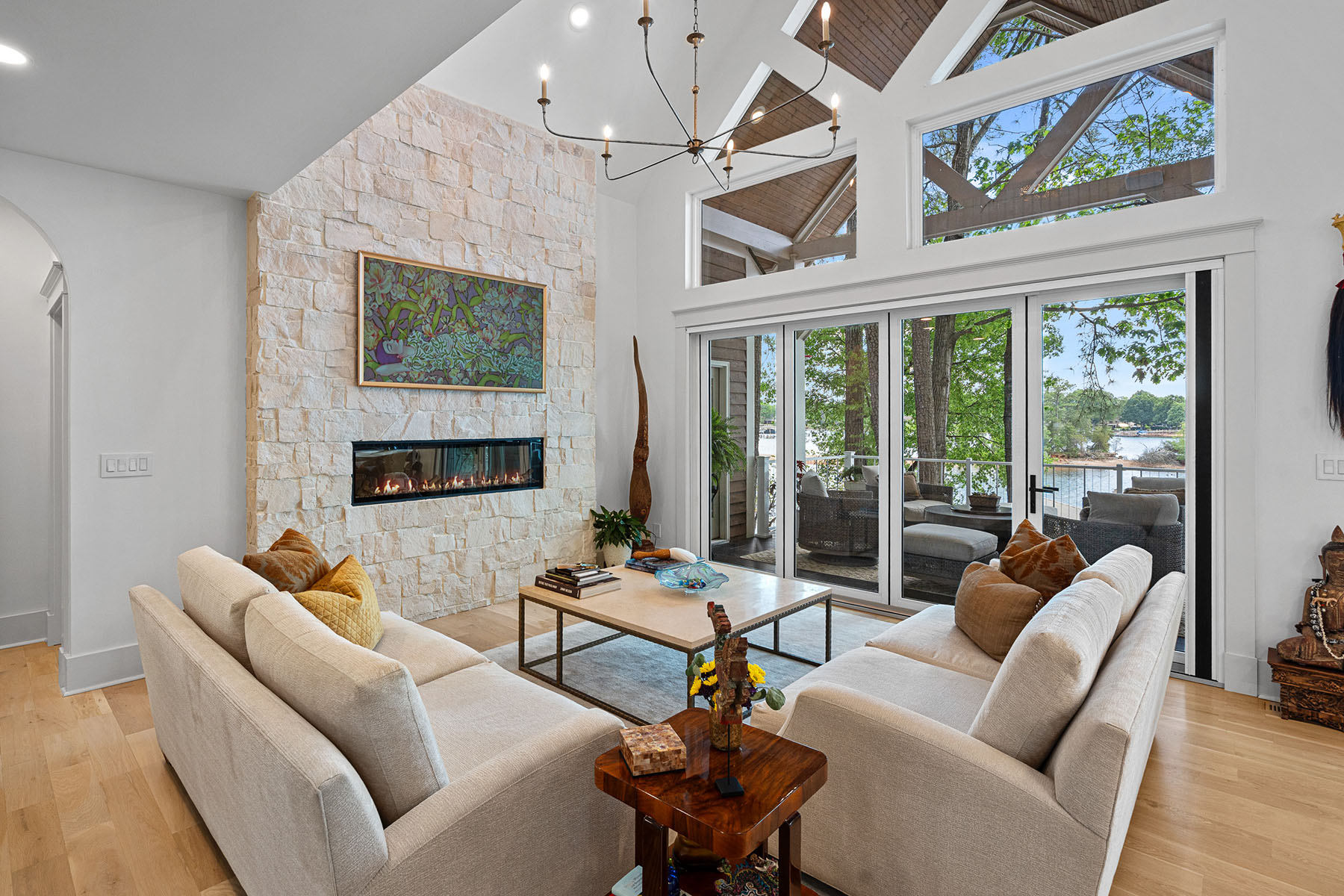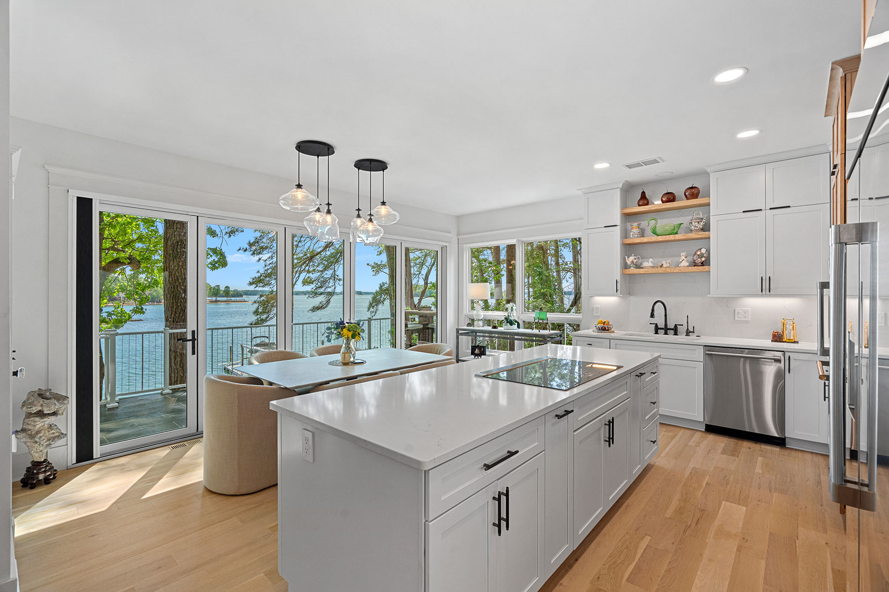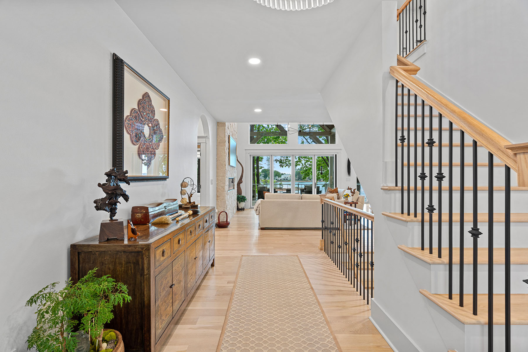 This masterfully reimagined Lake Norman estate is a masterclass in "Classical Craftsman" elegance, blending timeless architectural detail with cutting-edge smart technology. From the moment you approach the Smart Door—which toggles between privacy and clear glass—it is evident that no detail has been overlooked. The home's open-concept design is anchored by stunning white oak flooring and elevated by custom arches, built-ins, and solid-core shaker doors adorned with crystal knobs. At the heart of the residence, the chef's kitchen serves as a culinary showpiece featuring specialty cabinetry, WiFi-enabled appliances, and a butler's pantry with a convenient drawer microwave, while California Closets and full-house plantation shutters throughout provide both beauty and organizational bliss. The private sanctuaries within the home include a primary suite that acts as a true retreat, complete with a private fireplace and a spa-like bath equipped with a steam shower and an oversized soaking tub. The upper level is ideal for family or guests, offering three bedroom suites, a versatile loft, and an additional full bath. For hosting, the walkout lower level serves as the ultimate entertainment hub, boasting a second kitchen, a great room with a rugged stone fireplace, and a dedicated craft and laundry room, as well as a bedroom suite. This space flows seamlessly outdoors through panoramic glass sliding doors with integrated screens, leading to a multi-level paradise finished with bluestone patios, outdoor kitchen, and an expanded rear deck featuring recessed lighting. The property is a boater's dream, featuring a private dock with a 10,000 lb boat lift, a brand-new floating jet ski dock, and access to the Island Forest private community boat ramp. The outdoor oasis is rounded out by a custom fire pit area and full property landscape and balcony lighting. Beyond its aesthetic appeal, the home is equipped with modern essentials and security, including a full-home sound system, HVAC air purification, a tankless water heater, and a comprehensive security system. Even the garage has been upgraded with epoxy flooring and a new smart opener, ensuring every inch of the estate is as functional as it is beautiful.
