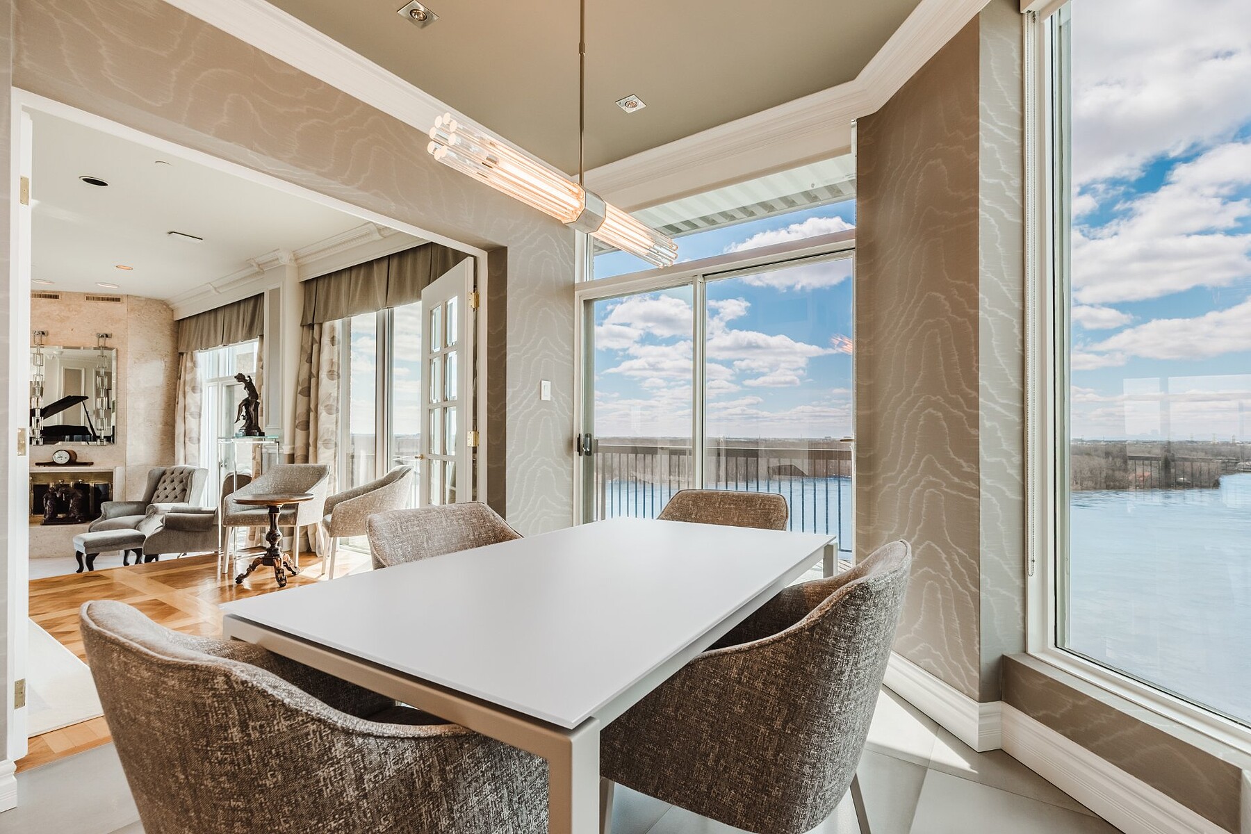 Discover this sumptuous waterfront condo spanning over 4,000 sq. ft. across two levels, located in a highly sought-after area of Laval. Combining elegance, space, and high-end features, it captivates with its chic design, impressive volumes, and impeccable finishes. Expansive, light-filled living areas open onto a breathtaking 270-degree view of the water and the city of Montreal. Designed for absolute comfort, it offers generous spaces ideal for entertaining, along with four garages--a rare and valuable asset.