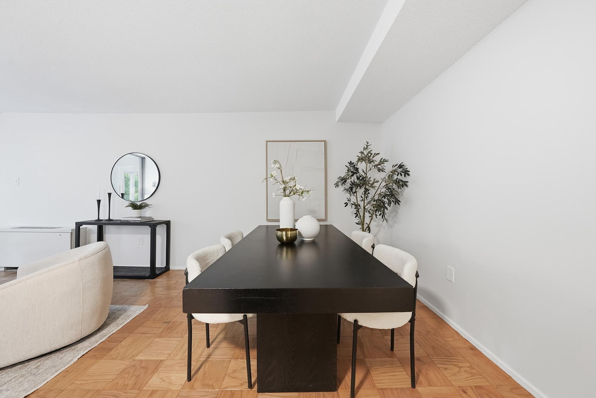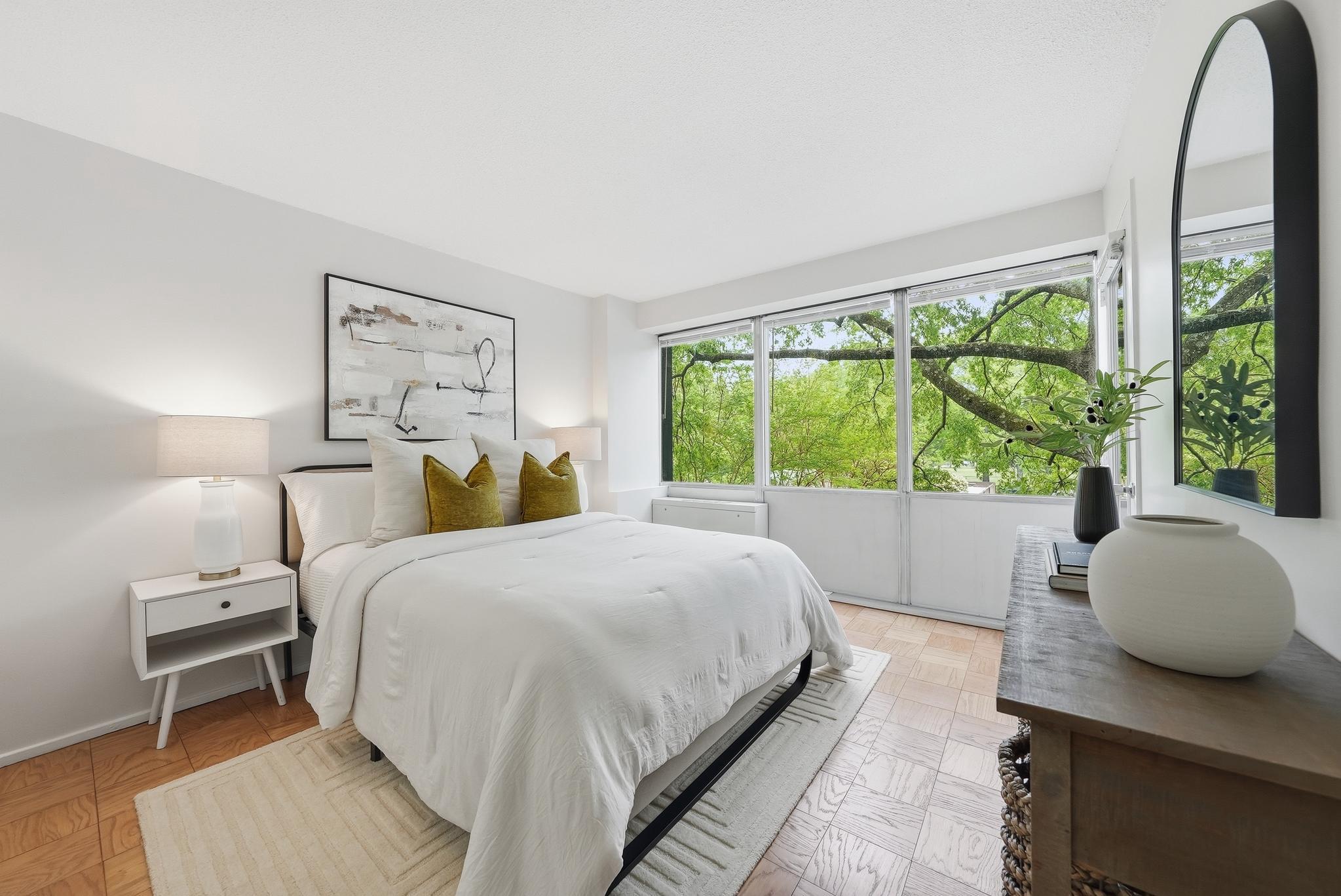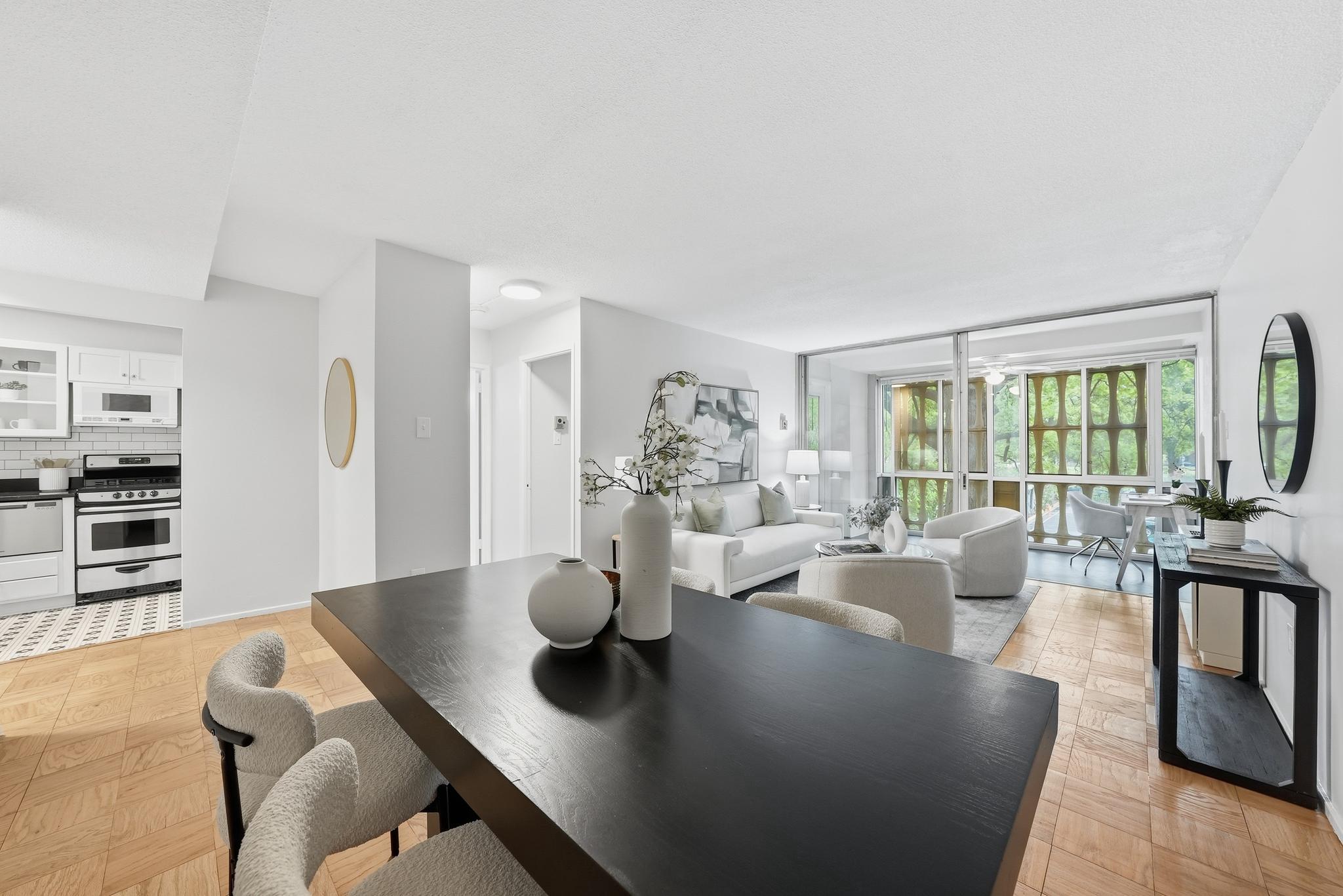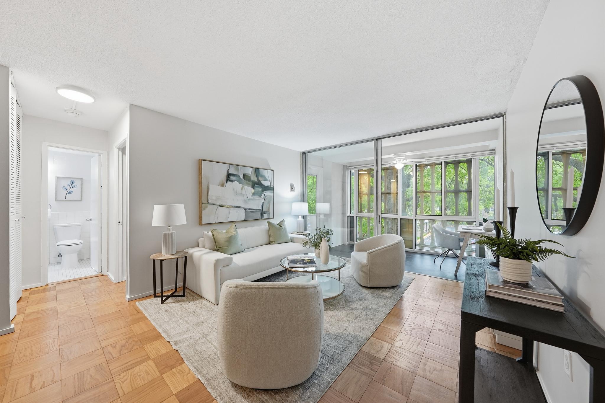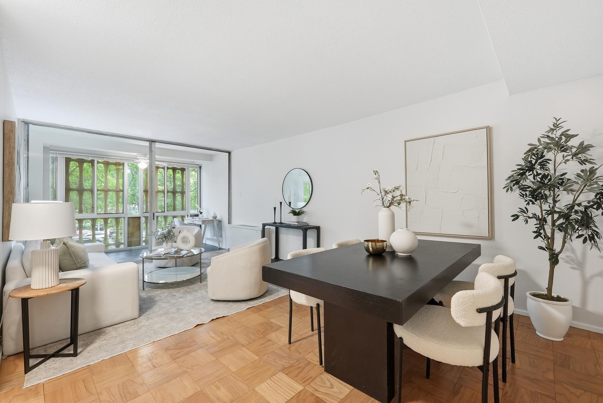 Open Saturday, 4/25, from 12-2pm. Welcome to Unit N110 at River Park - an updated mid-century residence offering timeless design and modern comfort in one of Southwest DC’s most iconic communities.Inside, the beautifully restored wood parquet floors have been professionally sanded and refinished to honor the home’s original character. A wall of continuous windows floods the living space with natural light, creating a bright and inviting atmosphere throughout. The entire residence has been freshly painted, offering a clean, cohesive backdrop.The recently refreshed kitchen blends classic style with thoughtful updates, featuring a new retro-style refrigerator, subway-tile backsplash, and new tile flooring. Updated cabinetry and fixtures complement the space, delivering both function and aesthetic appeal.The spacious bedroom offers a comfortable retreat, complete with a generous closet for ample storage. The bathroom has been recently refreshed with a recently-installed walk-in shower, new toilet, and new lighting - all set within a freshly-painted, crisp interior.An enclosed balcony - accessible by both the main living area and the bedroom - offerings a versatile setting for a home office, reading nook, or lounge area. The balcony floor has been refinished and painted in a sleek black, complementing the contemporary midcentury aesthetic. River Park Mutual Homes, designed by renowned architect Charles M. Goodman, is set across an expansive 11-acre campus with thoughtfully-landscaped grounds, mature trees, and open green space. Residents enjoy access to a large outdoor pool, grilling areas, and a fitness center. Pool membership, fitness center access, and parking are available for separate fees and are not included in the regular monthly fee.Ideally located in the heart of Southwest, this home offers easy access to the waterfront, The Wharf, and a vibrant mix of dining, shopping, and outdoor recreation. The Metro is just a couple of blocks away, providing convenient connectivity throughout the city. Also enjoy close proximity to Navy Yard, including Nationals Park and Audi Field at Buzzard Point - placing some of DC’s most dynamic destinations right at your doorstep.