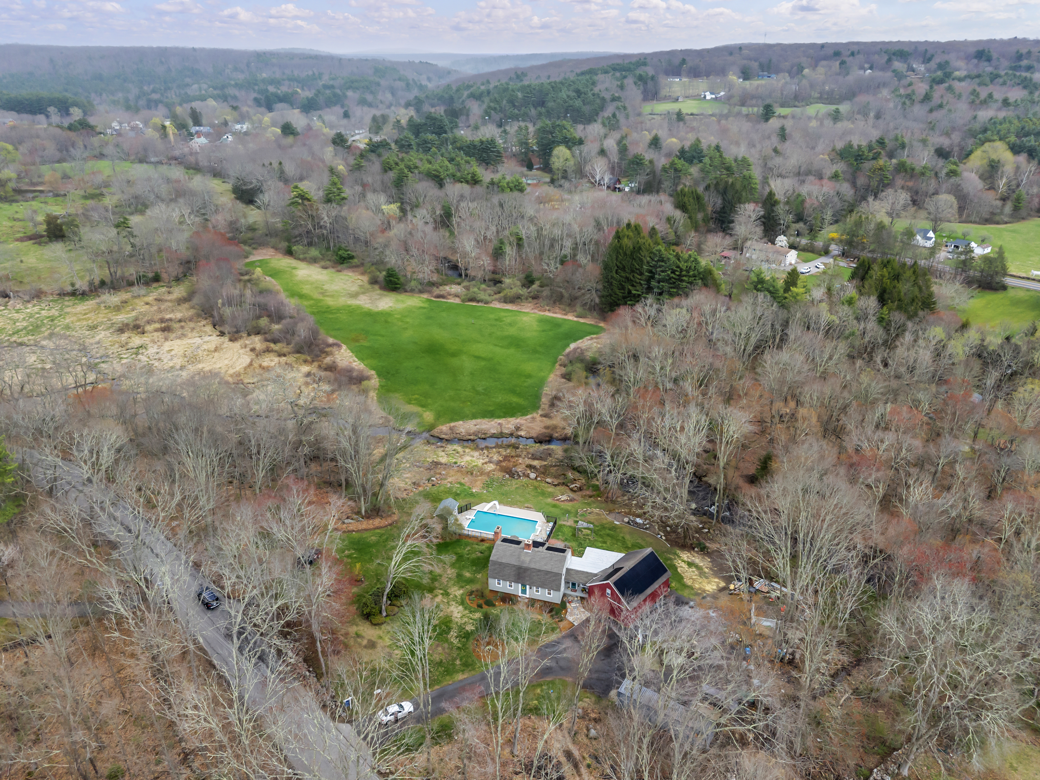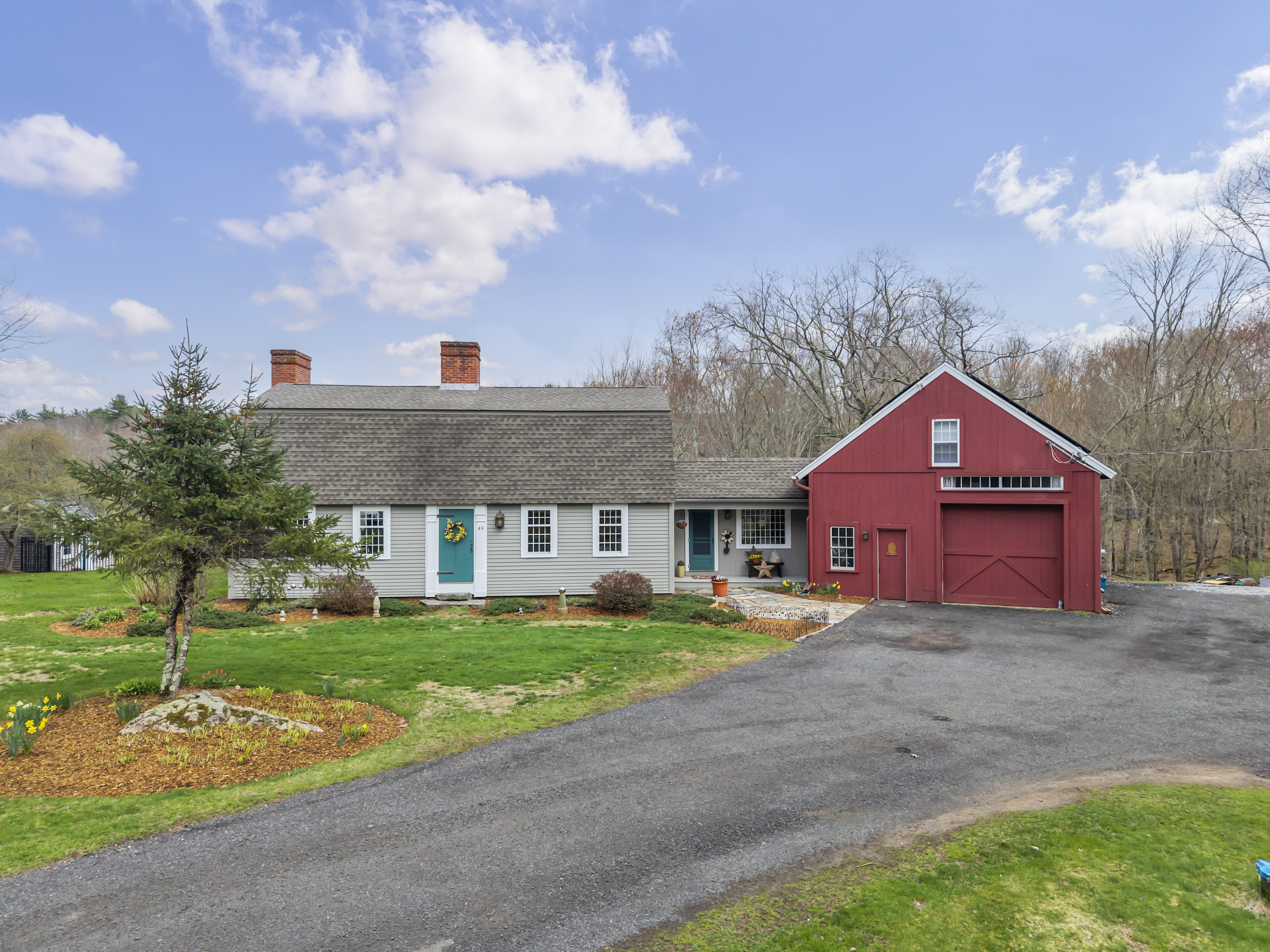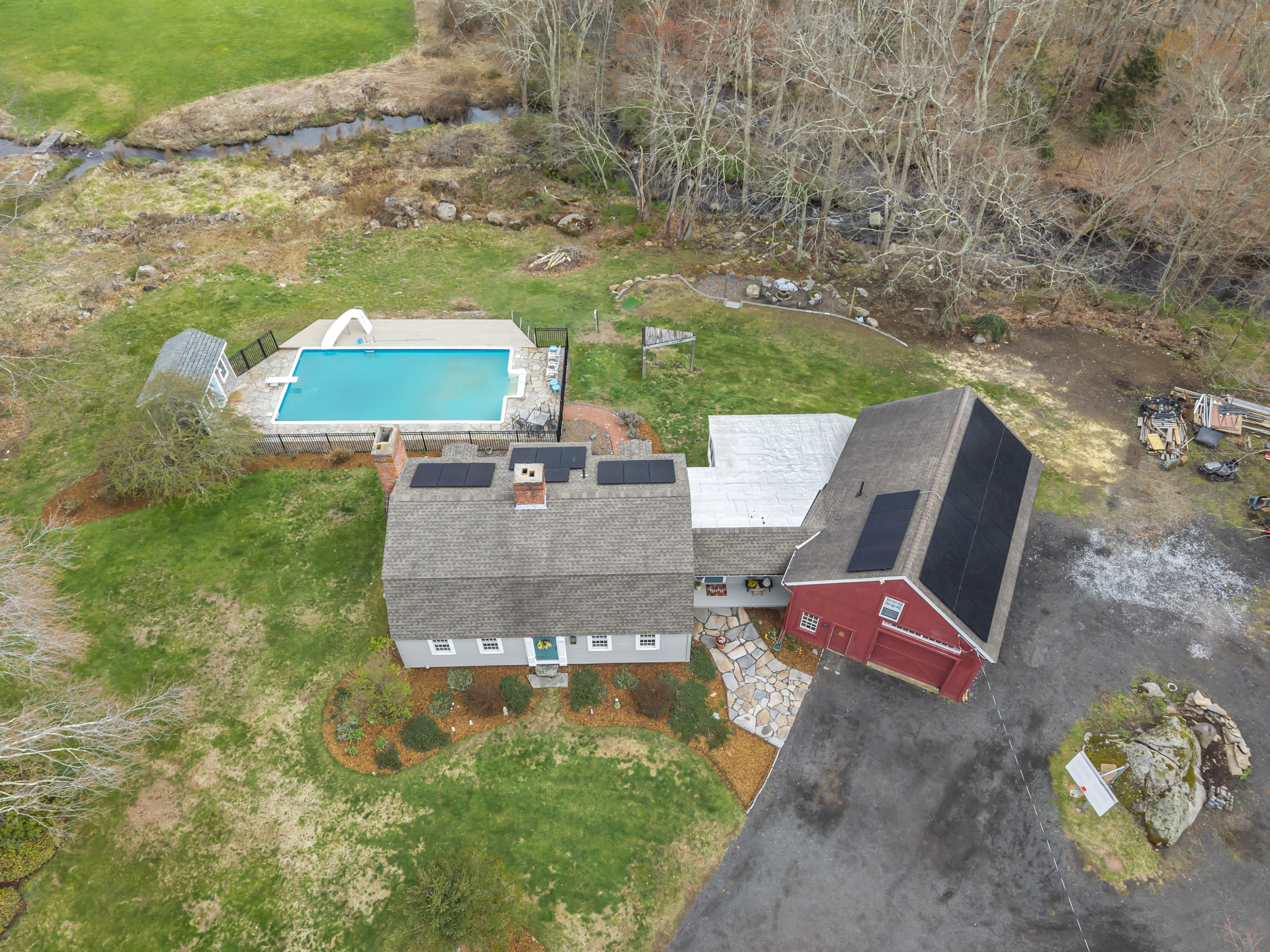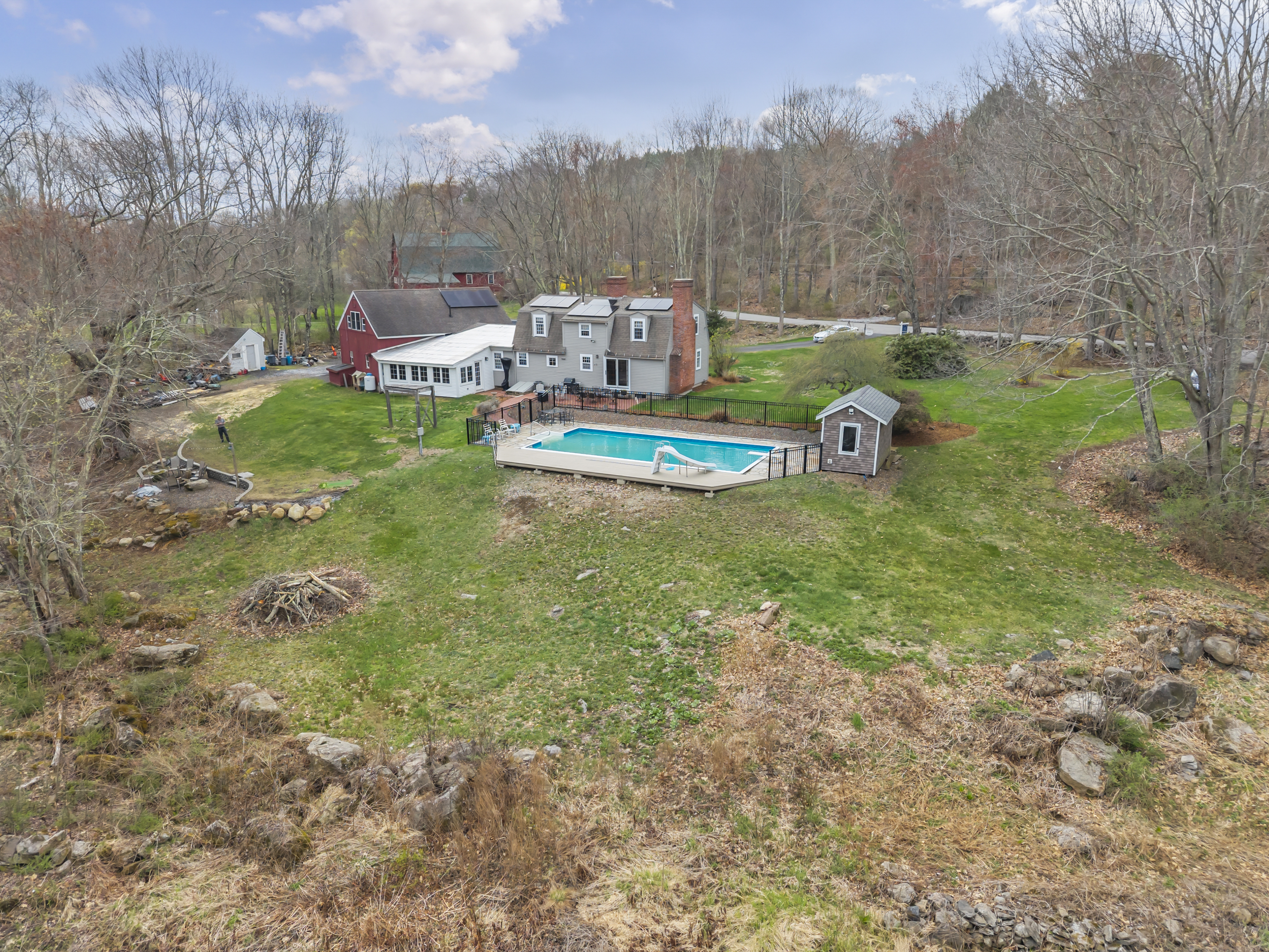 Welcome to your Quintessential New England Farm Homestead set on 10 beautiful acres! The property is so special with its babbling brook running through and firepit overlooking the stream. The built-in swimming pool also embraces the view of your land along with a new deck, slide, and pool house! There is a sweet patio, shed, and circular driveway. Built in 1974 in reproduction style of a Gambrel Colonial you will not find another Homestead as special! Step inside to exposed beams and wood ceilings and and a warm welcoming family room! The family room leads you to the heated sunroom that overlooks the view of the stream and has stone floors plus a huge hot tub! The country kitchen has custom-built cabinets with new stainless appliances and a gorgeous hearth fireplace and antique stove for warmth + charm. There is a sliding glass door to the outside patio and yard. The dining is right off the kitchen area and has its own fireplace, corner cupboard, and real gas light fixture. The living room is a true tavern room with a custom old-world bar. Upstairs of the main house you will find three bedrooms, one a primary with stone fireplace and sitting area, walk-in closet and on-suite. Over the barn garage the is additional 2 rooms, one now an office with that incredible view, and the other a bedroom suite! The barn garage fits at least 3 cars and is the perfect heated workshop! There are wide board floors throughout, custom trim, wainscoting and so much detail! Truly a DREAM HOME!