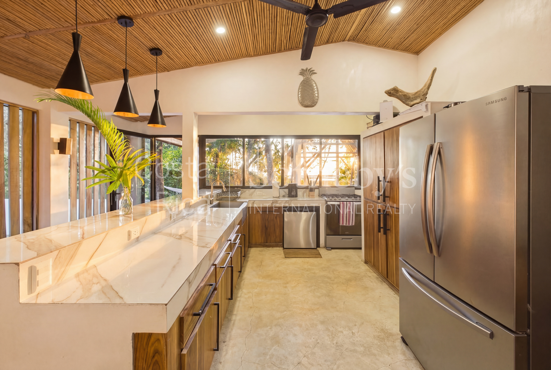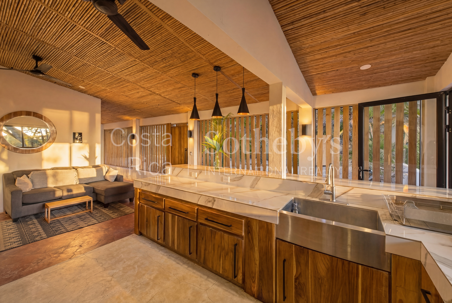 The property features seven beautifully designed guest suites , each crafted in the style of a jungle chic beachfront hotel and complete with ensuite bathrooms, elegant finishes, and curated furnishings. At the heart of the home is a spacious chef’s kitchen, perfect for passionate cooks or visiting private chefs, alongside generous dining and lounge areas designed for gathering, entertaining, and unwinding.