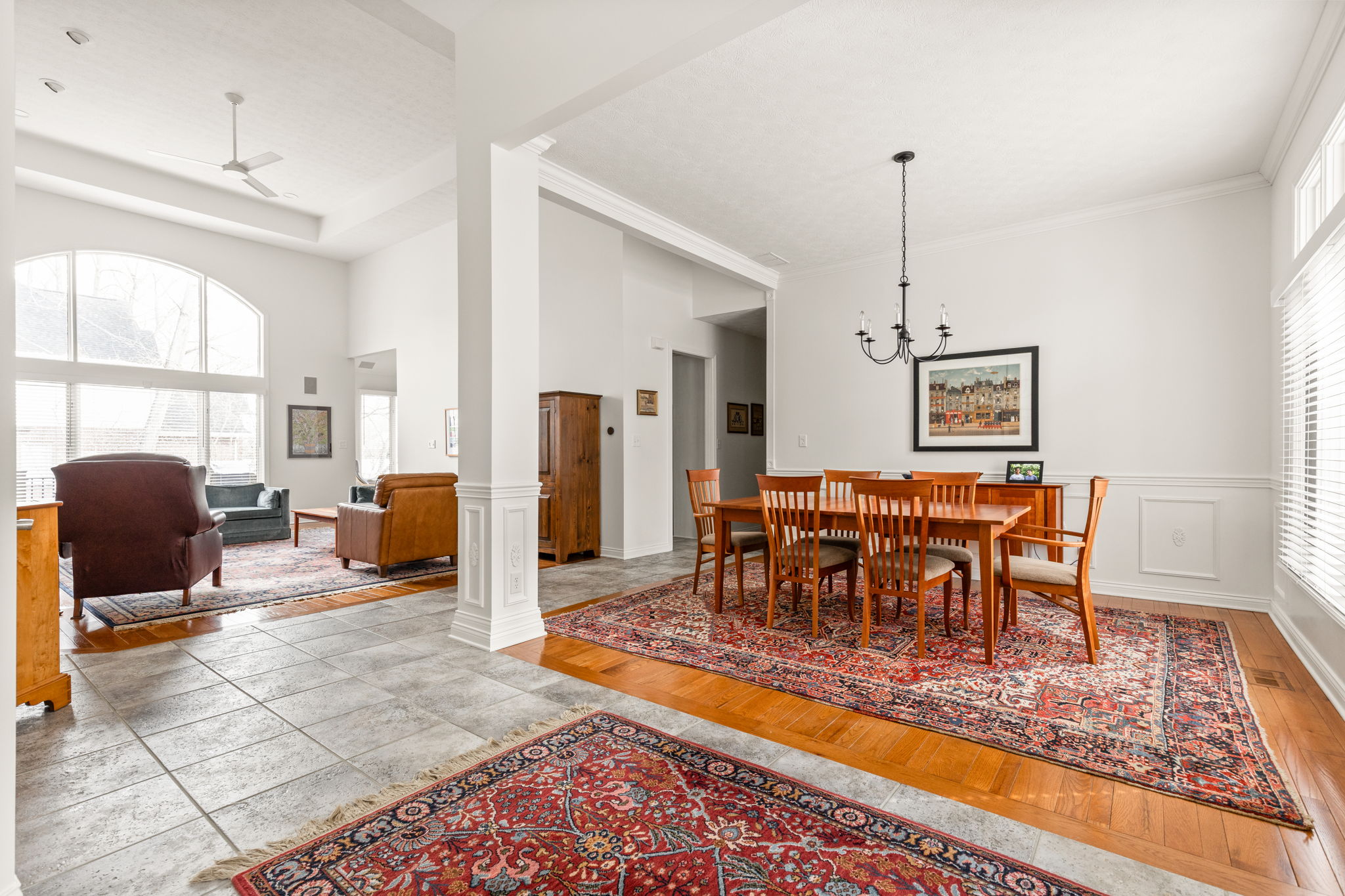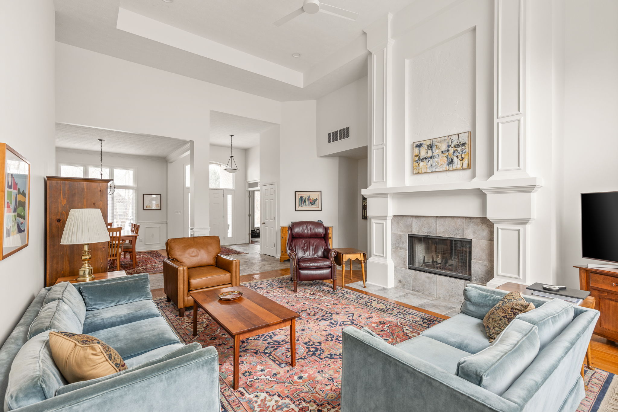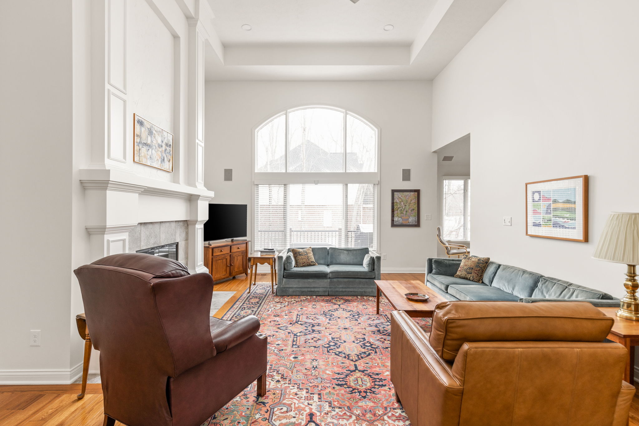 Tucked into the wooded beauty of Austin Oaks, this meticulously maintained 4-bedroom, 4.5-bath home offers over 5,300 square feet of thoughtfully designed living space with the ease of a primarily main-level lifestyle. With a layout that lives like a ranch, the main floor features a spacious primary suite alongside a second bedroom with its own full bath. At the heart of the home, the great room makes a striking impression with soaring 14-foot ceilings and a dramatic wall of windows that flood the space with natural light while framing peaceful, tree-lined views. The open, flowing floor plan creates an effortless connection between living spaces, complemented by a main-level den perfect for a home office or quiet retreat. Upstairs, a private bedroom and full bath offer additional flexibility, while the walkout lower level is designed for both entertaining and relaxation. Complete with a family room, fireplace, wet bar, and generous recreation space, it easily accommodates everything from game nights to workouts. An additional bedroom and full bath, along with approximately 1,000 square feet of unfinished space, provide exceptional storage or the opportunity to expand. Outdoor living is equally inviting, with a large TREX deck overlooking the private, wooded setting-perfect for morning coffee or evening gatherings. Beyond the home itself, Austin Oaks offers a truly unique lifestyle amenity rarely found in Zionsville: a neighborhood clubhouse featuring an indoor tennis court that also converts to indoor pickleball courts, allowing for year-round play. Additionally, there is an indoor and outdoor basketball court, an indoor/outdoor playground, and a pool. Spacious, versatile, and set in one of Zionsville's most desirable communities, this home offers a rare combination of comfort, function, and lifestyle.
