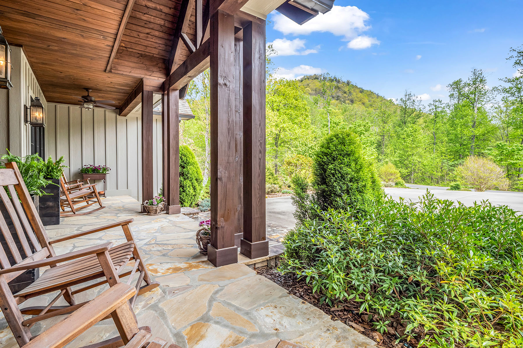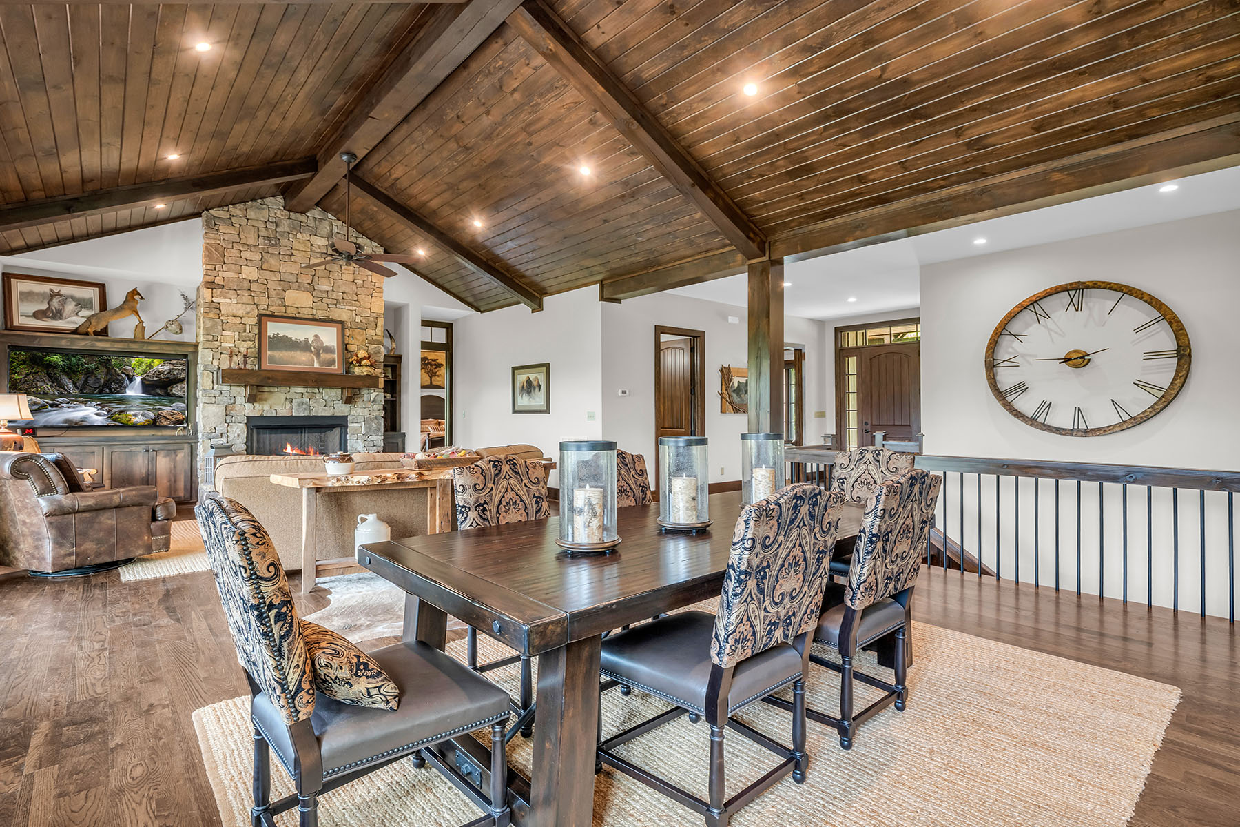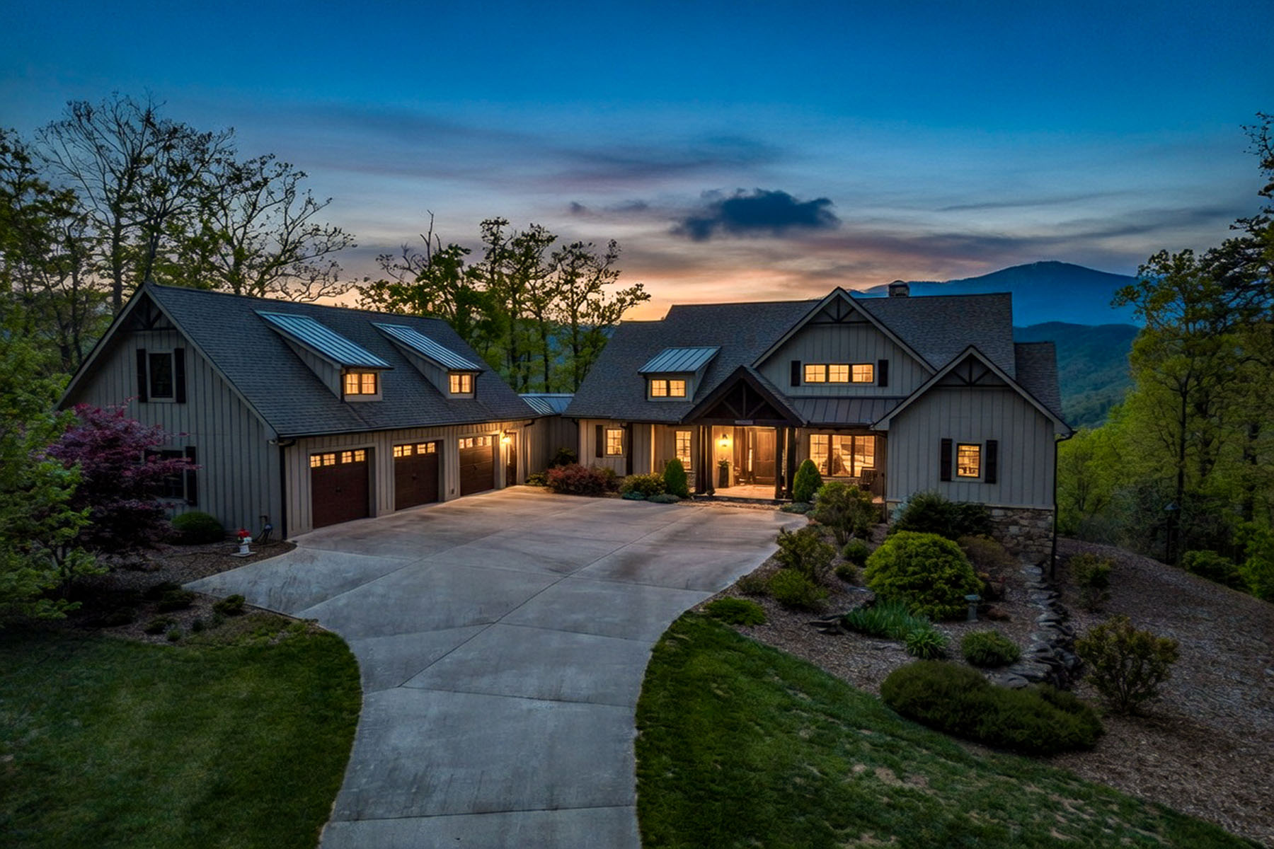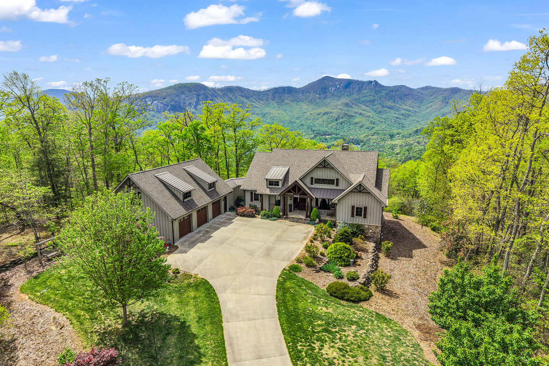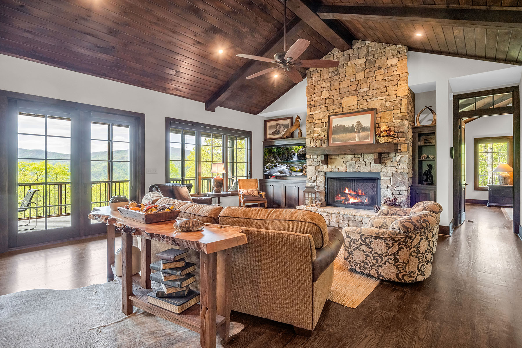Offered fully furnished. Perched against the breathtaking silhouette of the Blue Ridge Mountains, this exceptional 4.11-acre estate offers a rare blend of refined luxury and natural beauty. Designed for those who value privacy and prestige, the home serves as a peaceful retreat where thoughtful architecture complements its rugged surroundings. A striking exterior of natural stone and classic board-and-batten siding is framed by professional landscaping that blends seamlessly into the surrounding forest, creating an immediate sense of arrival. Inside, the home embraces its setting with organic textures and expansive windows that frame stunning seasonal views. The great room is the centerpiece, featuring soaring vaulted tongue-and-groove ceilings supported by heavy timber beams and a dramatic floor-to-ceiling stacked-stone fireplace. This inviting space flows effortlessly into a well-appointed kitchen, where rustic character meets modern convenience. Custom dark-wood cabinetry, premium stainless steel appliances, and a large granite island with an induction cooktop create a setting for everyday living and entertaining. A full covered and screened deck extends the living space outdoors. The primary suite offers a private retreat, complete with its vaulted timber ceiling and direct access to the screened deck. The en-suite bath is designed for relaxation, featuring a freestanding soaking tub, a glass-enclosed shower with detailed tilework and custom wood accents that reflect the surrounding landscape. The main level also includes an additional bedroom and full bath, a private office, a walk-in pantry and a separate laundry room. The lower level, accessible by elevator and stairs, provides an ideal space for recreation and guests. Polished concrete floors, a second stone fireplace and a distinctive Coca-Cola-themed bar give the space a unique character, while two guest en-suite bedrooms offer comfort and privacy. Ample storage is available throughout. Go out onto the lower patio to enjoy the gas fire pit or hot tub while taking in the mountain views. Outside, the property continues to impress with expansive decking, a three-car attached garage and over 600 unfinished square feet above the garage ready for customization, ideal for a guest suite, studio or additional living space. This is more than a home, it's a mountain retreat designed for comfort, style and lasting connection to nature.